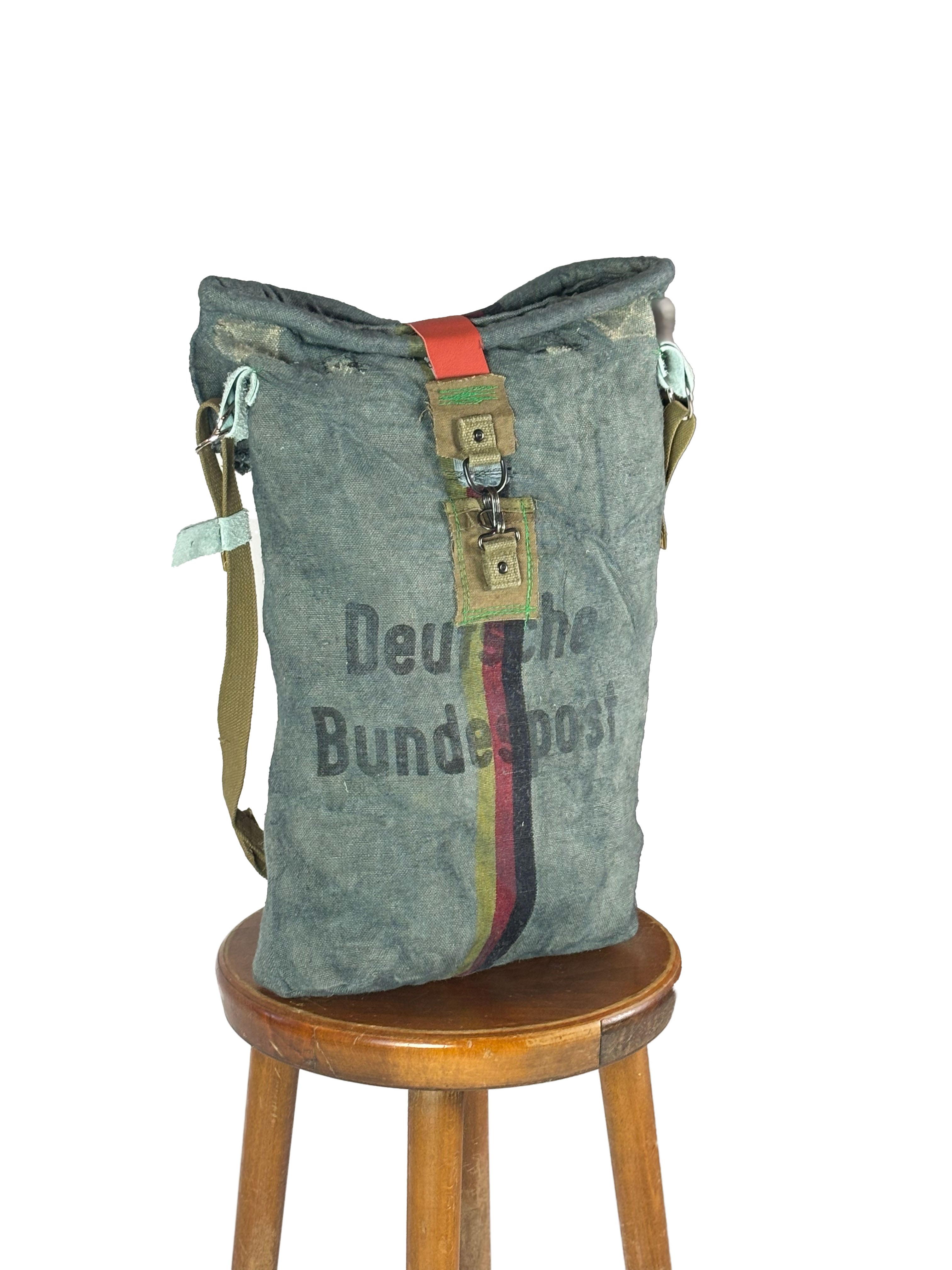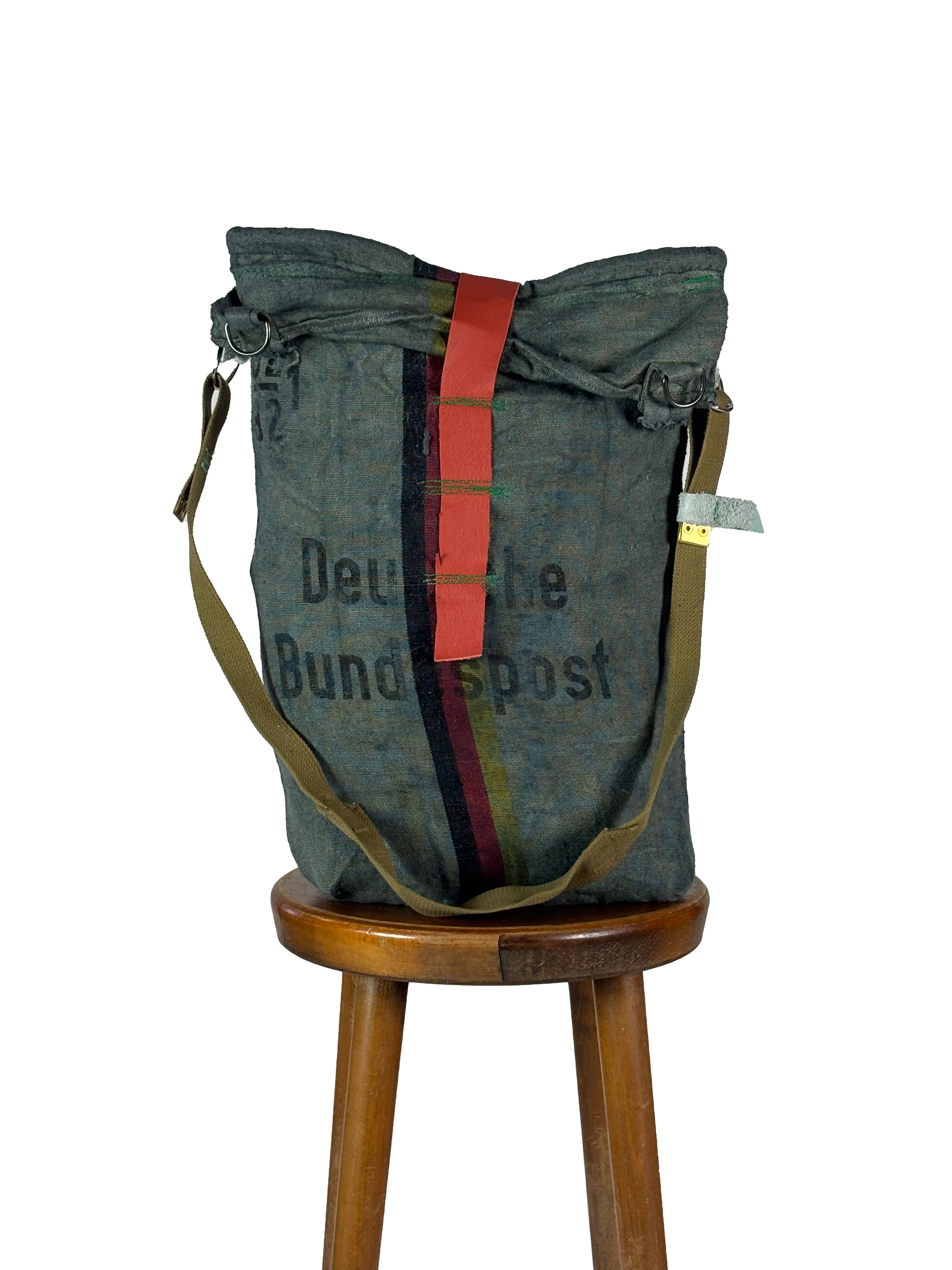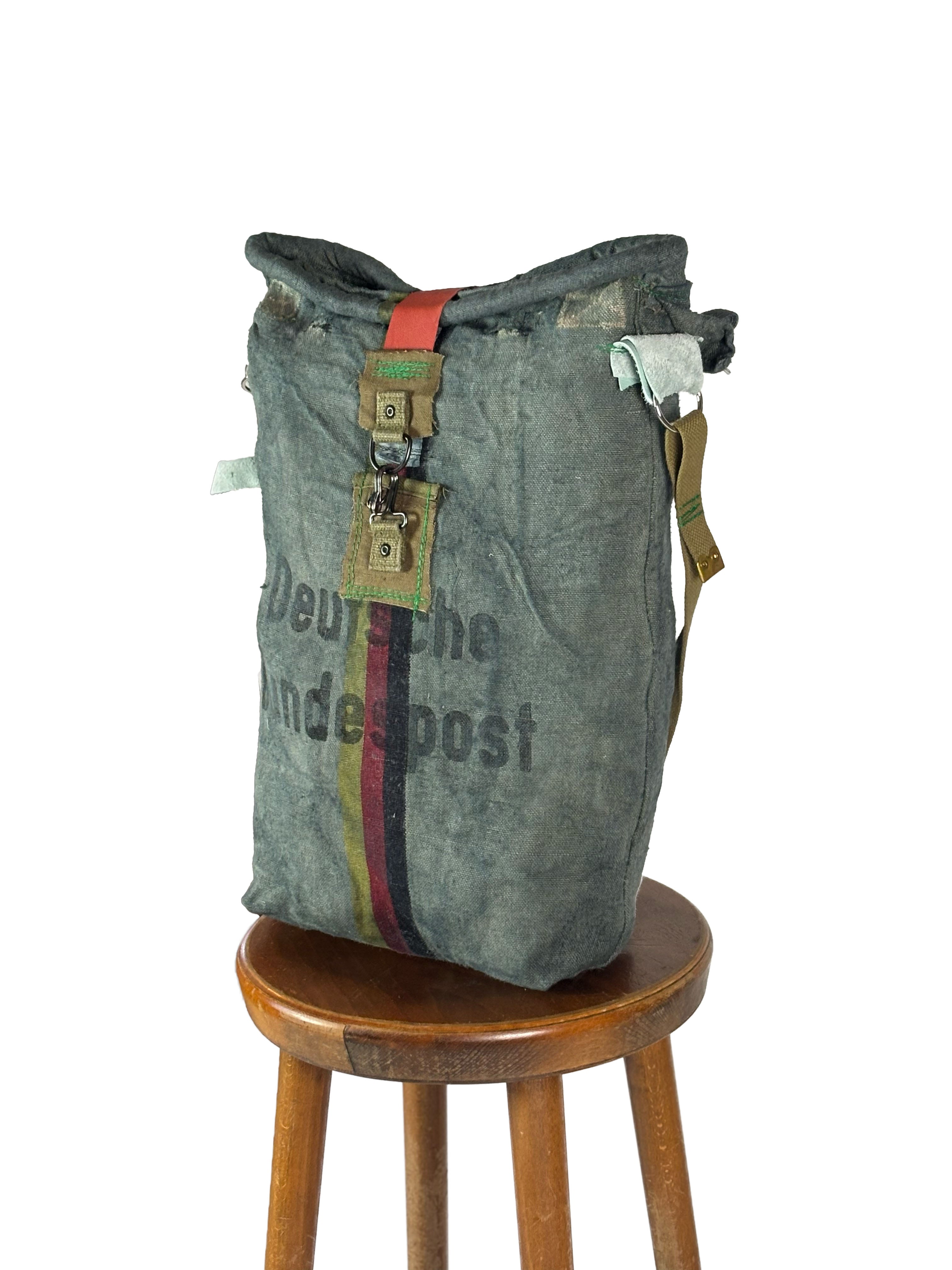 This bag is a one-of-a-kind piece shaped by history and material transformation. The main body is crafted from original German postal sacks dating back to before the fall of the Berlin Wall. The fabric carries visible traces of use, faded markings, and a distinct patina that cannot be replicated, making each bag a genuine historical artifact.