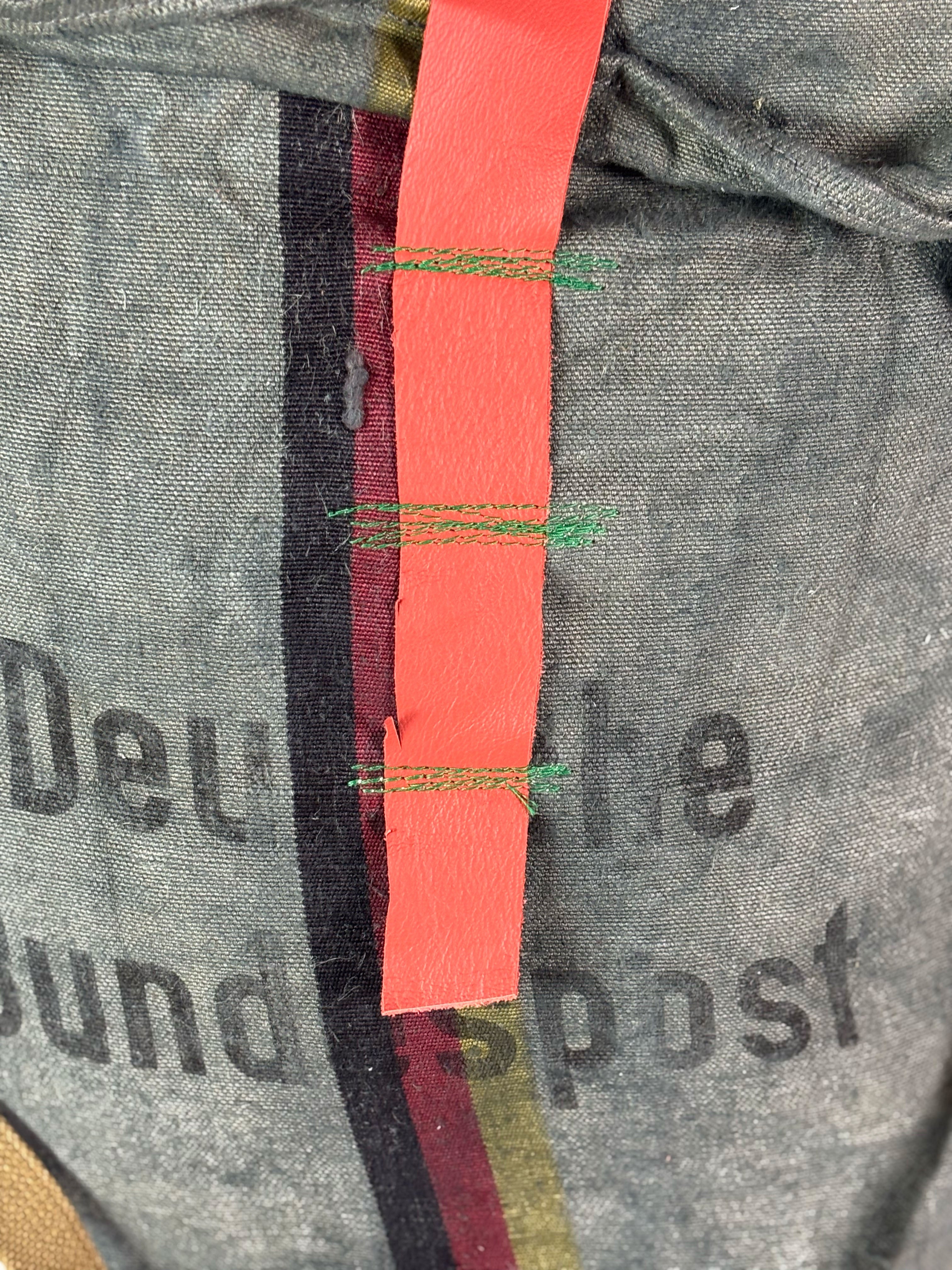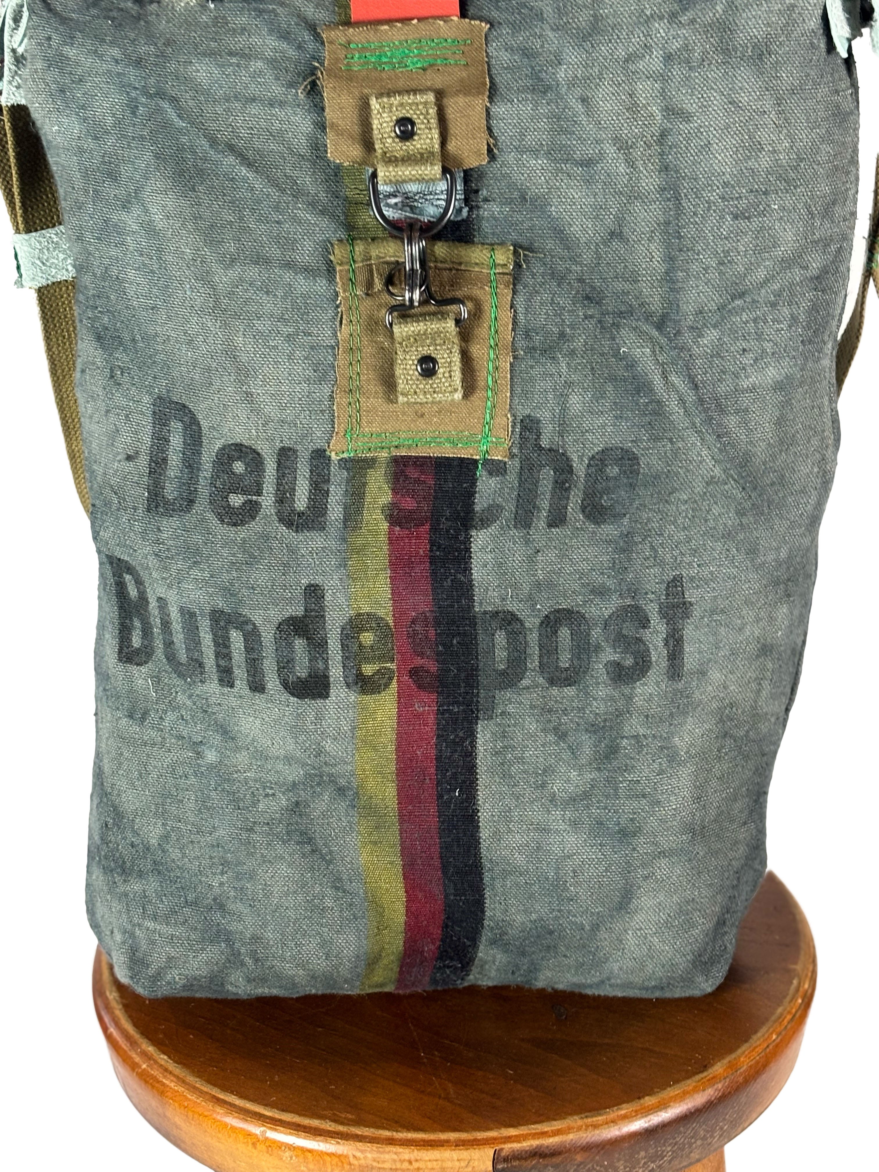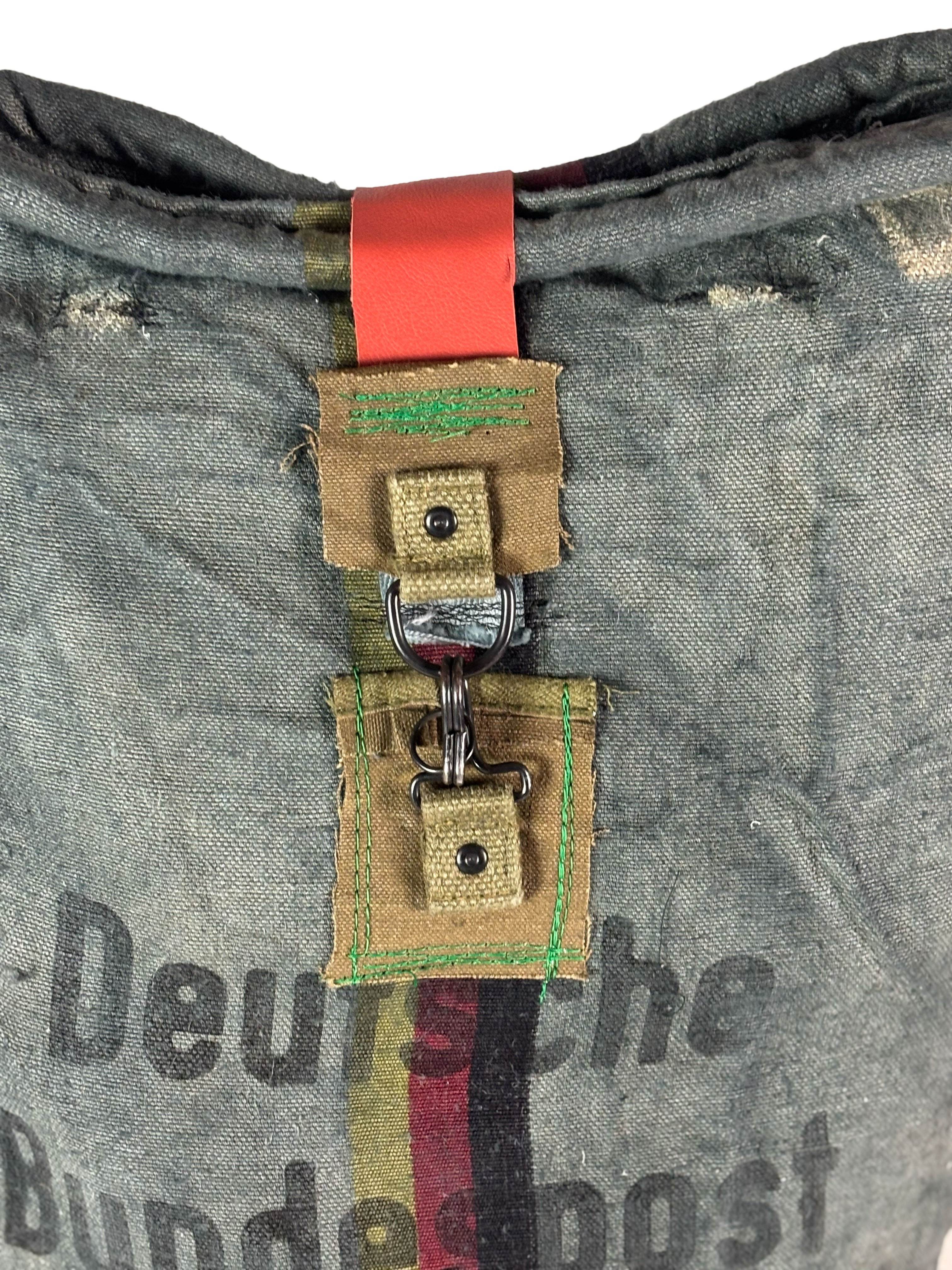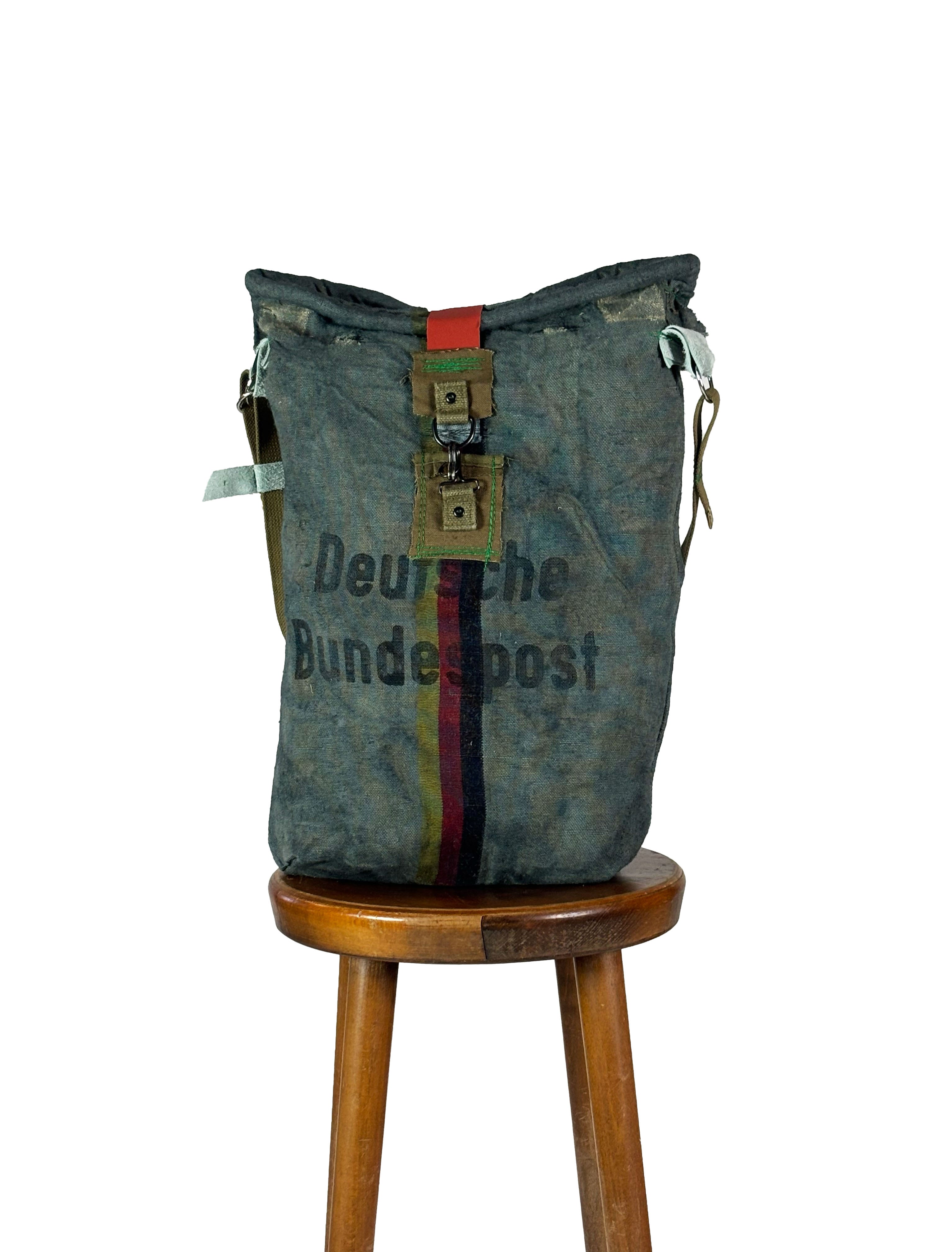 This bag is a one-of-a-kind piece shaped by history and material transformation. The main body is crafted from original German postal sacks dating back to before the fall of the Berlin Wall. The fabric carries visible traces of use, faded markings, and a distinct patina that cannot be replicated, making each bag a genuine historical artifact.