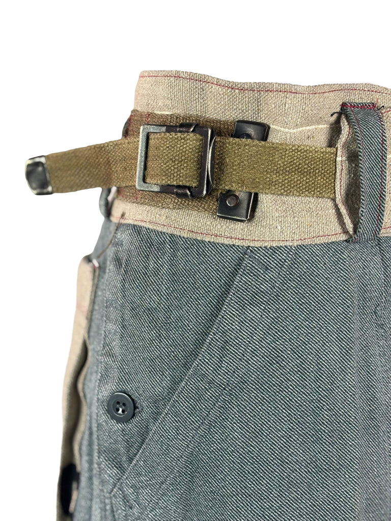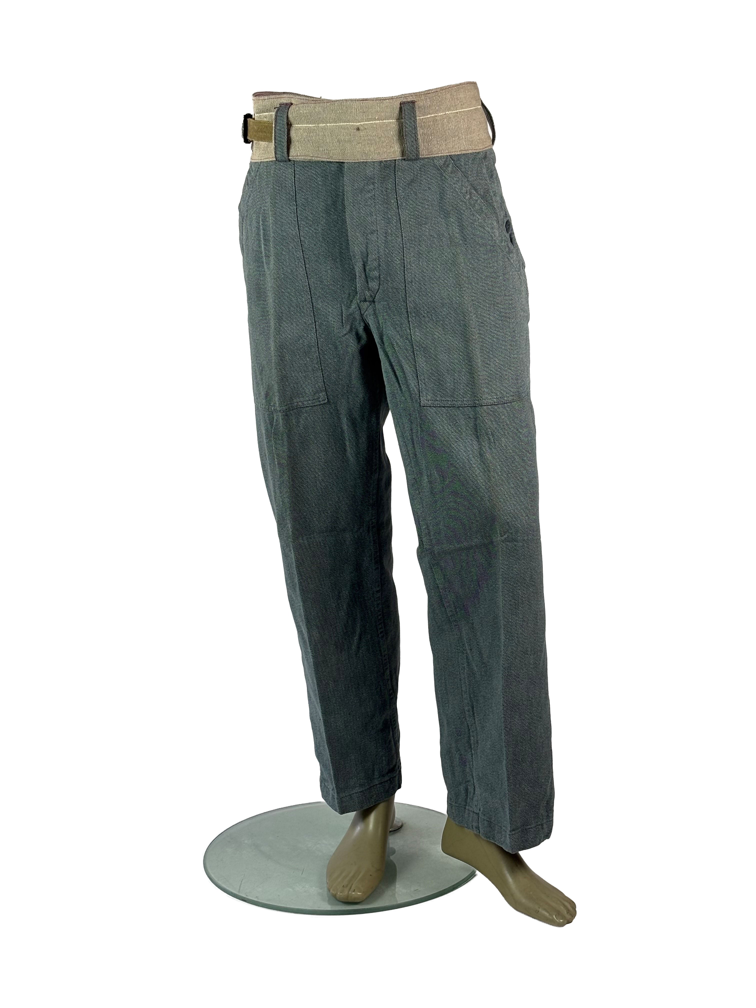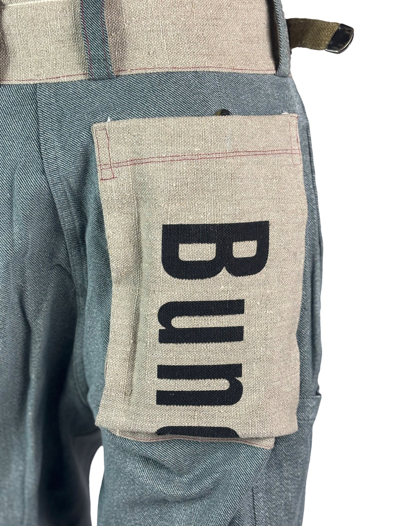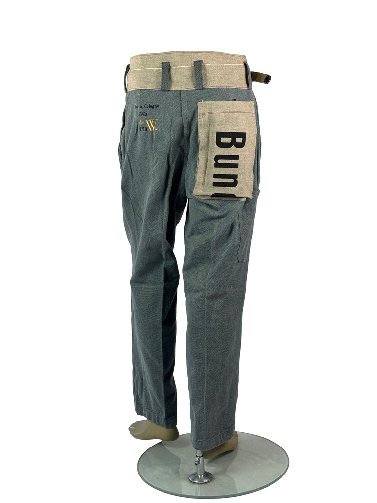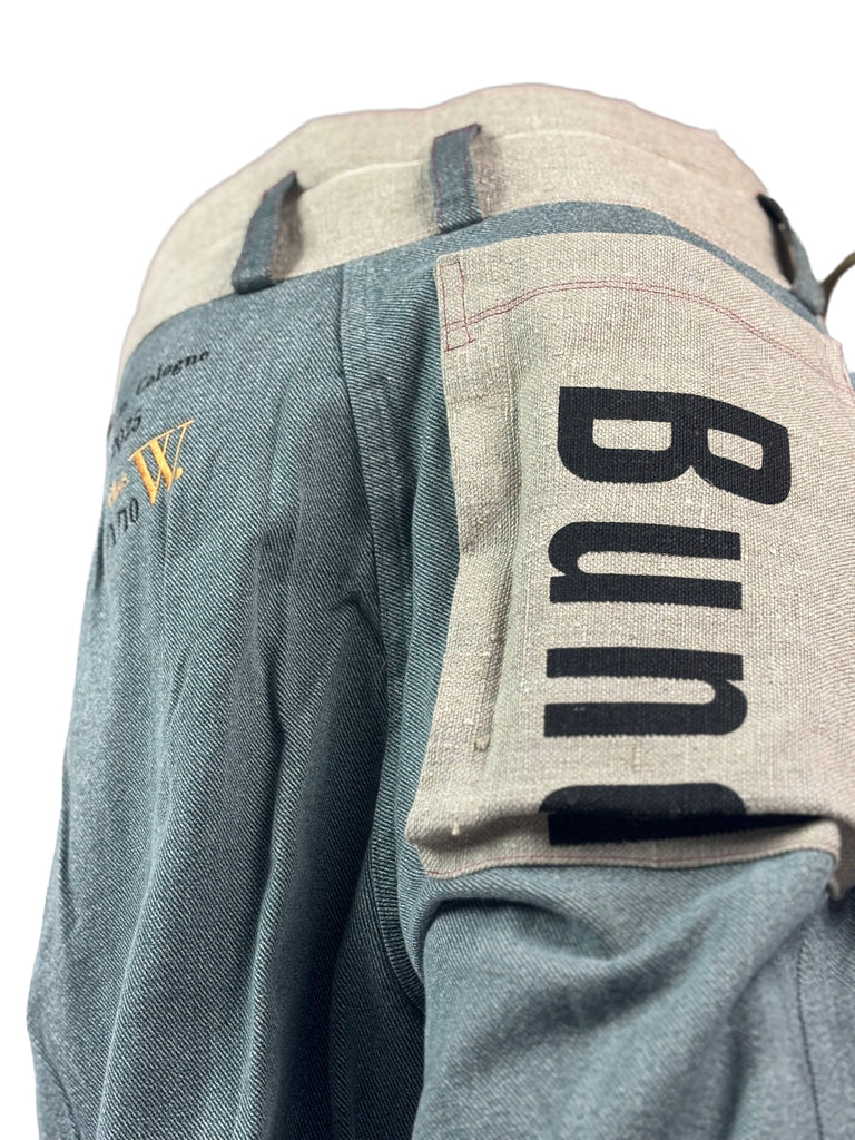 Crafted from deadstock 1970s German denim, these trousers fuse vintage utility with contemporary minimalism. The waistband and detailing are made from original pre-1989 German postal sacks — each fragment carrying a quiet echo of divided histories.