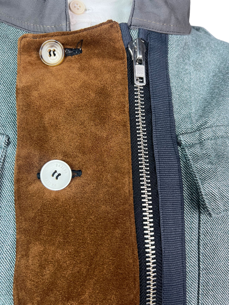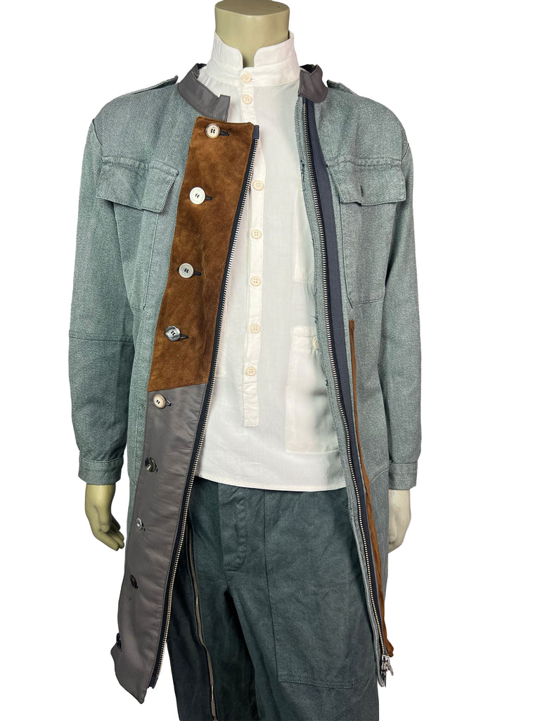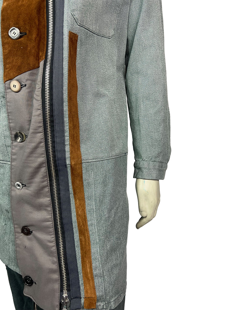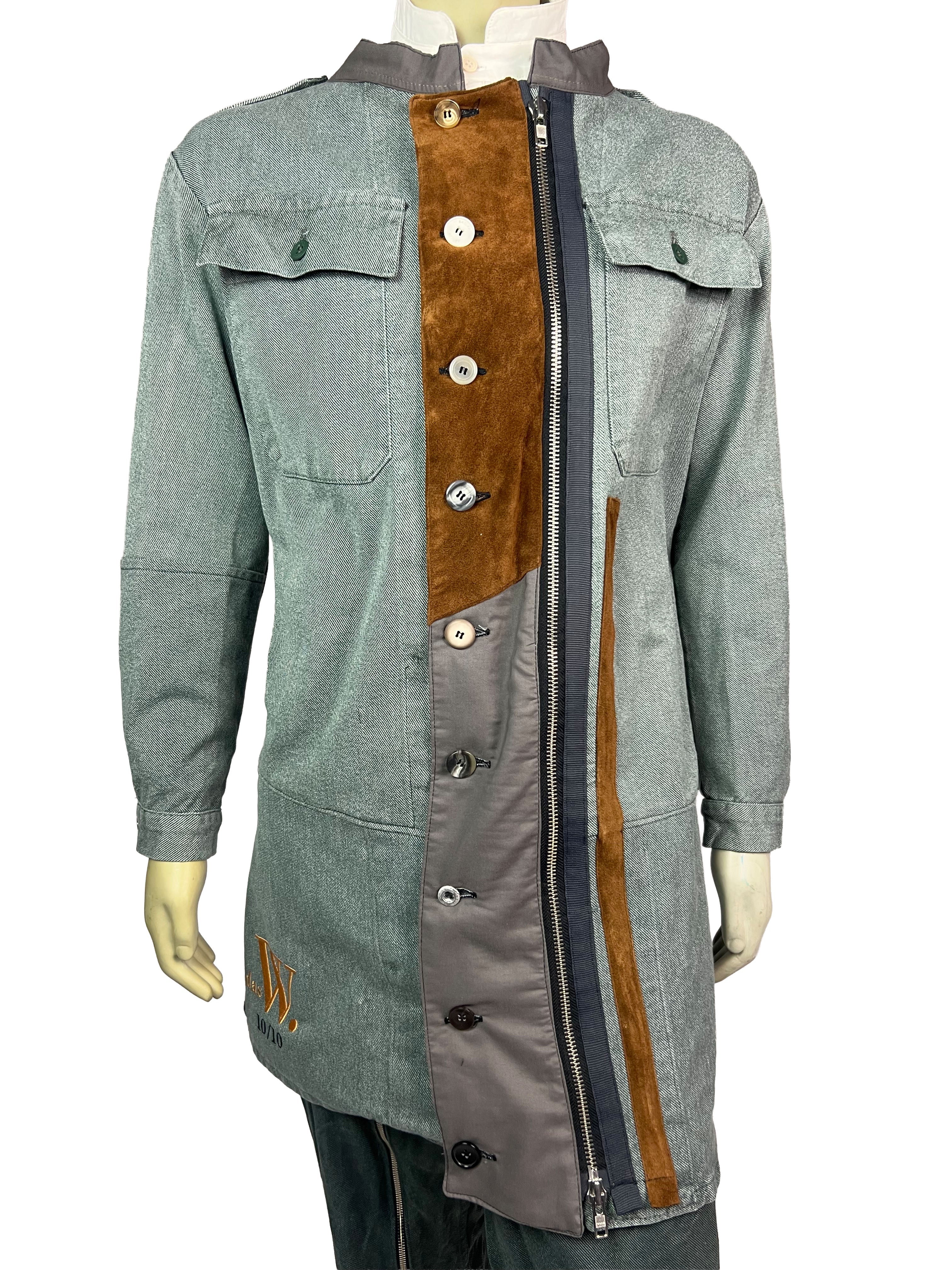 The Meridian Coat 10/10 combines vintage 1970s denim with refined suede leather elements, creating a bold contrast of texture and tone. The asymmetrical button placket and dual-direction zipper add a functional edge, while the earthy suede panels bring depth and warmth to the structured silhouette.