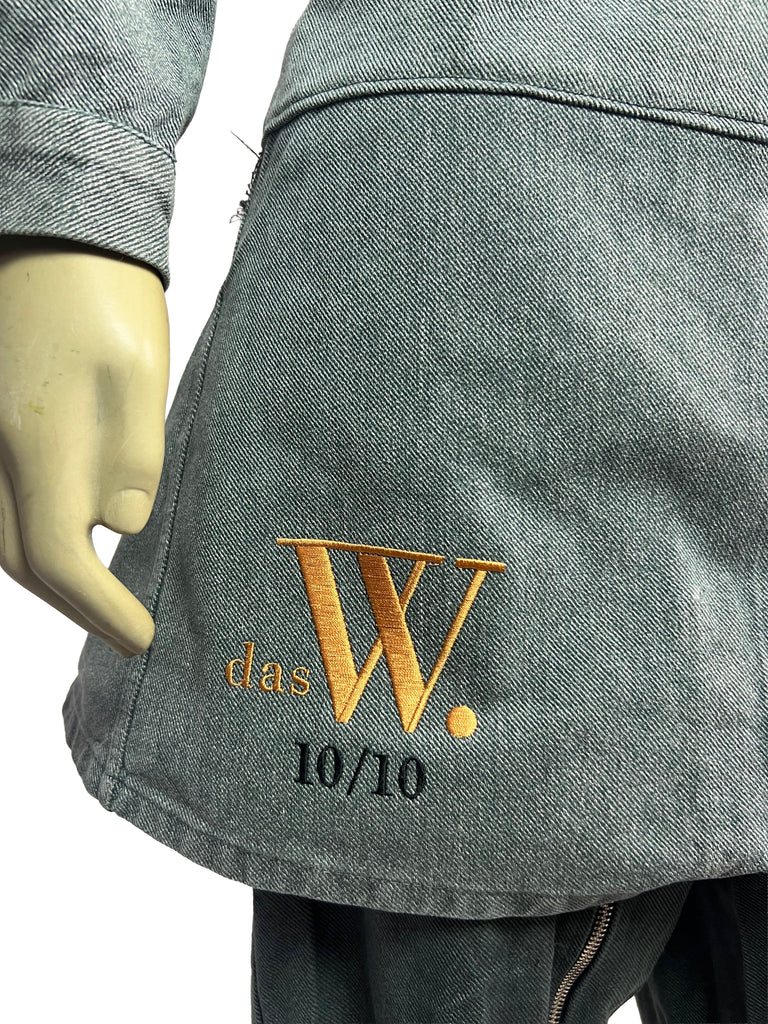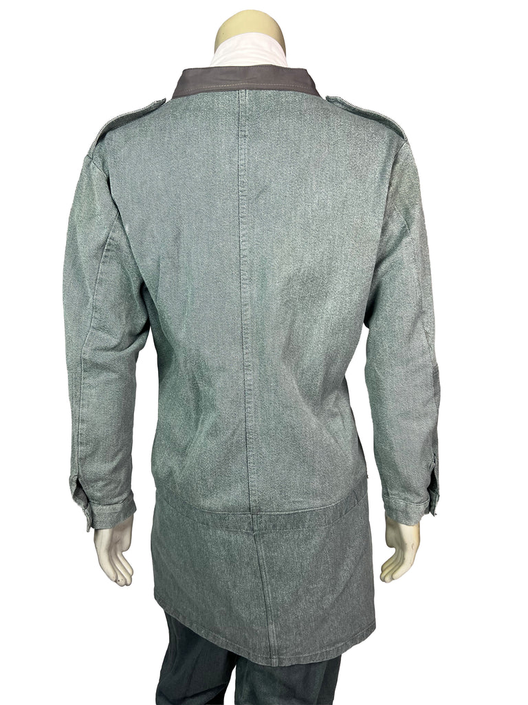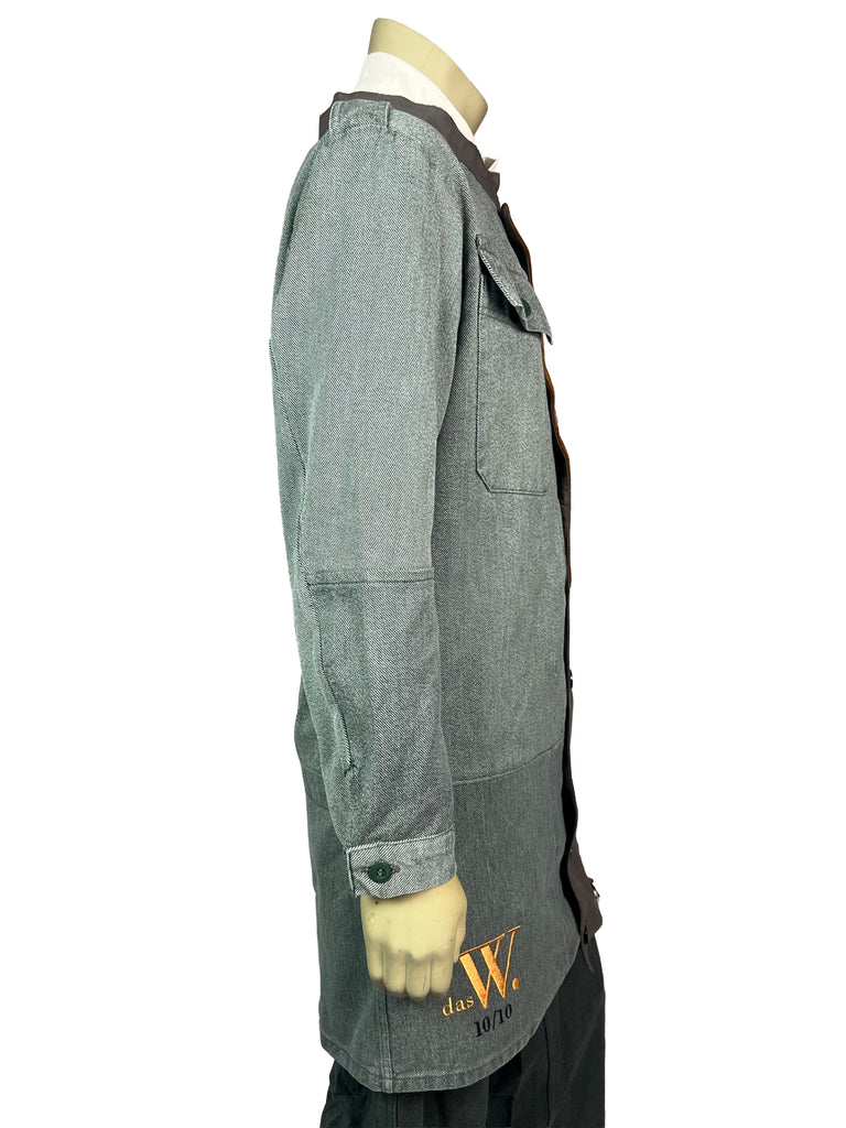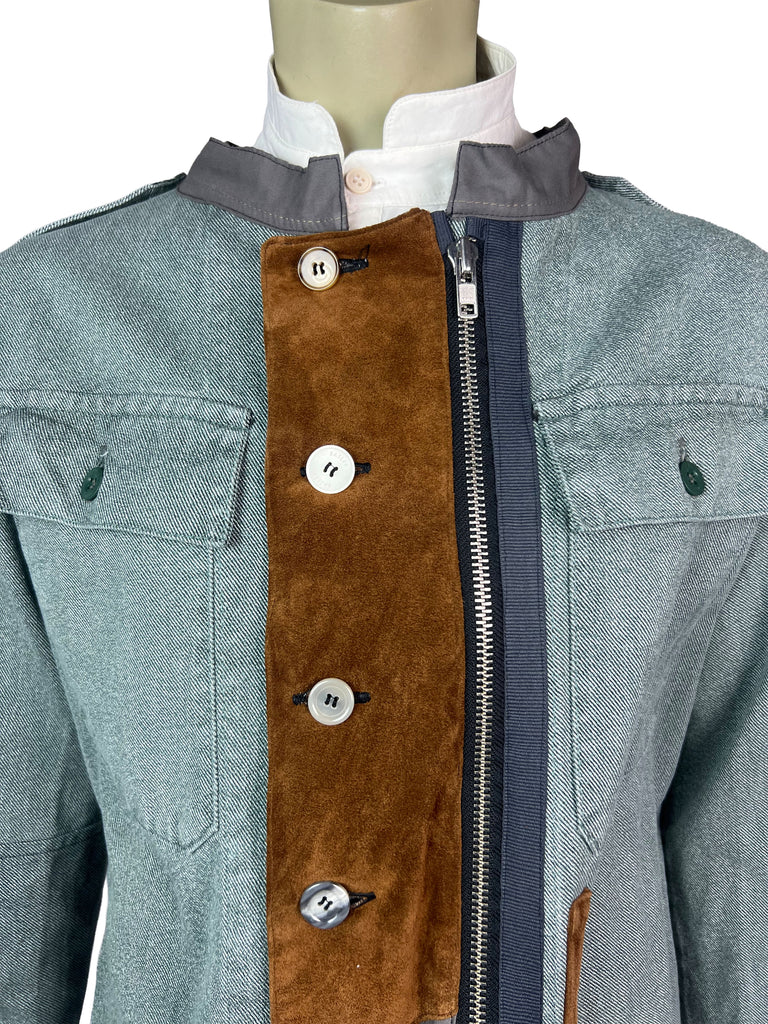 The Meridian Coat 10/10 combines vintage 1970s denim with refined suede leather elements, creating a bold contrast of texture and tone. The asymmetrical button placket and dual-direction zipper add a functional edge, while the earthy suede panels bring depth and warmth to the structured silhouette.