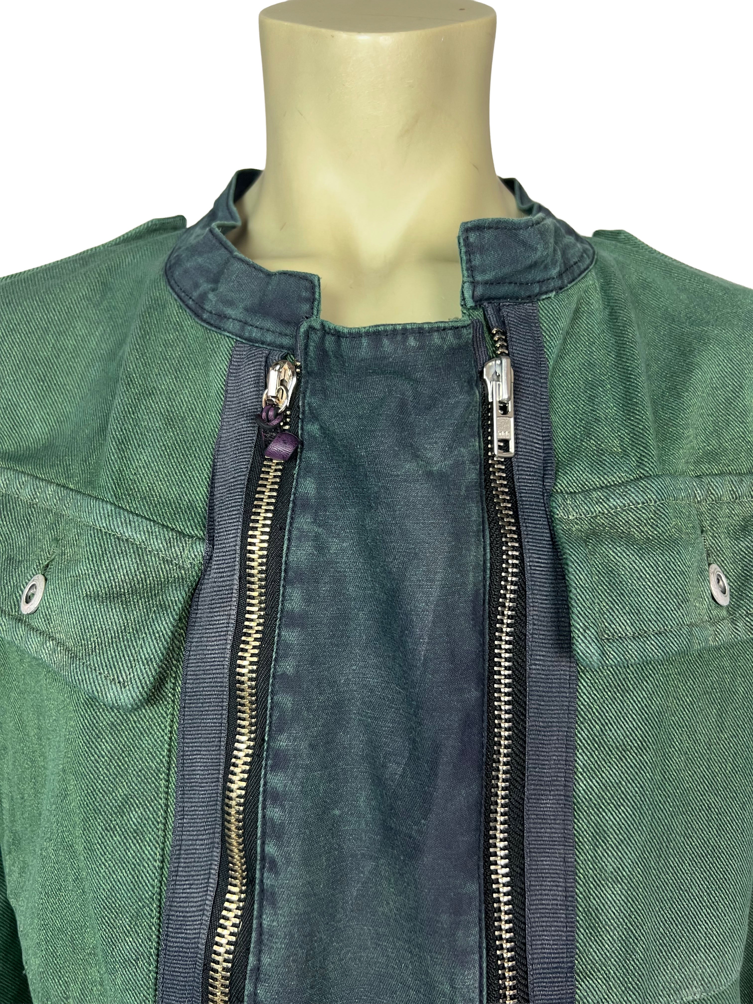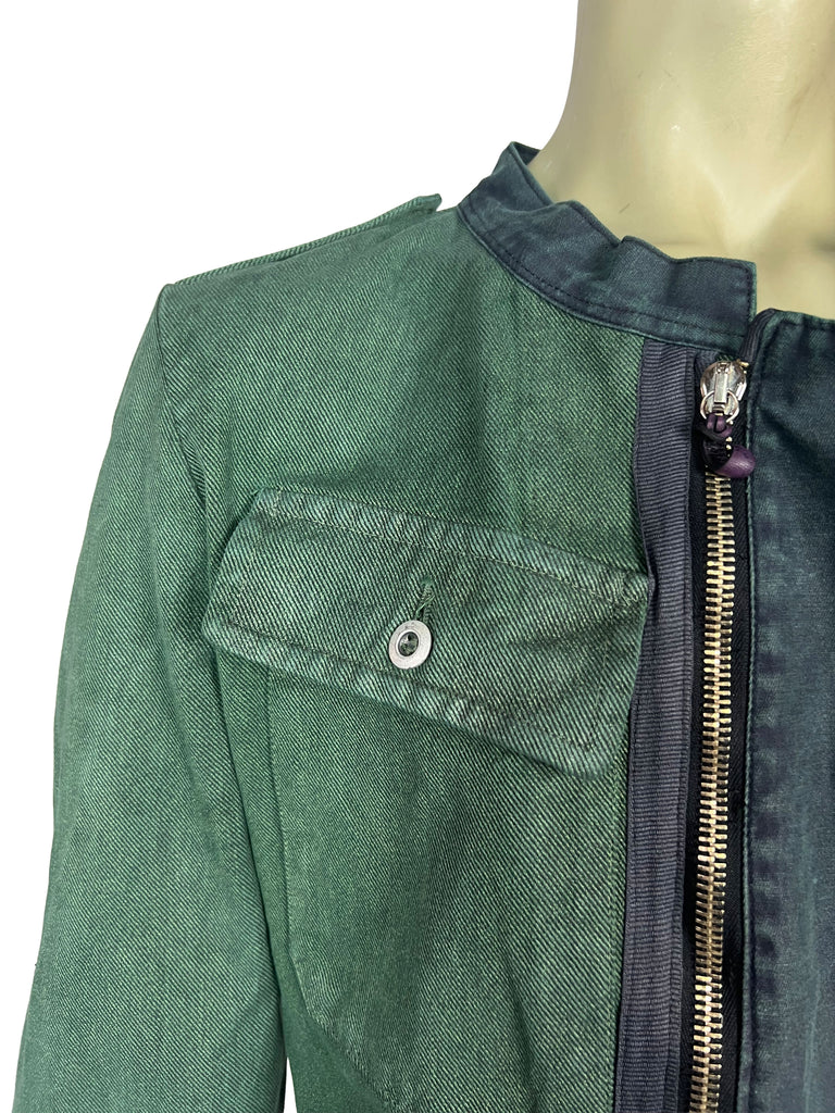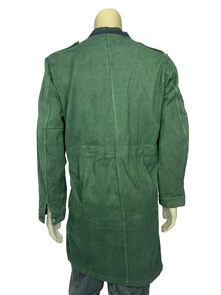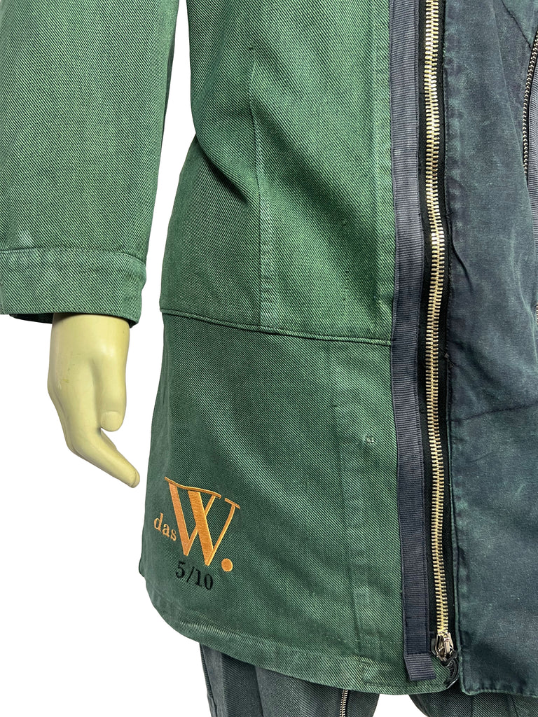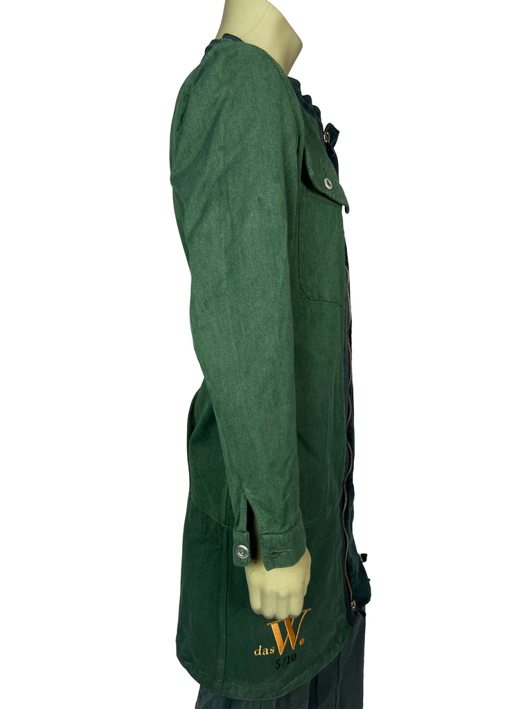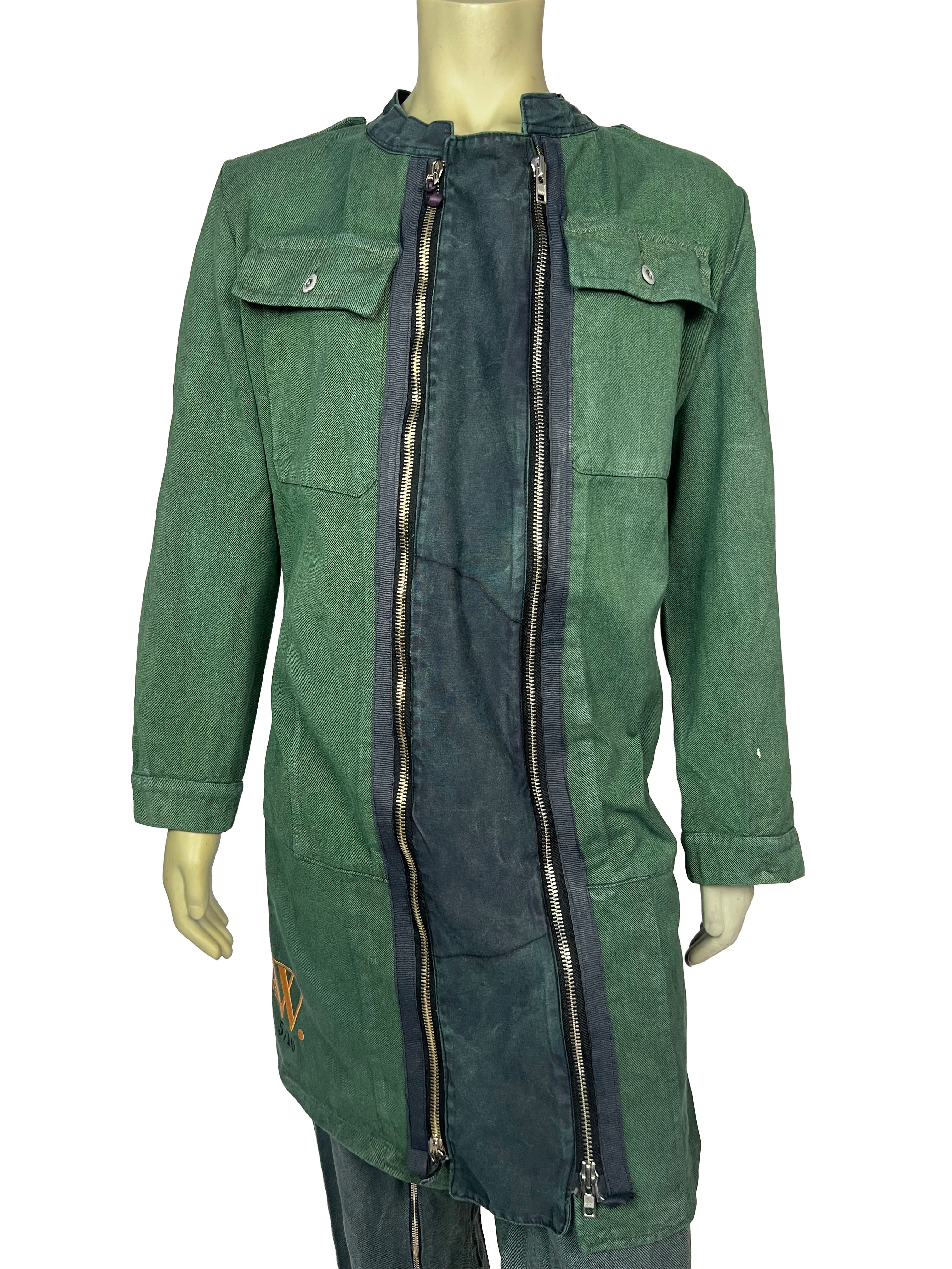 Cut from original 1970s military denim, Meridian Coat 5/10 pairs a long, clean silhouette with a utilitarian front construction. A washed cotton center panel runs the length of the coat and is framed by two independent two-way zippers for variable styling and ventilation. Flap chest pockets, a minimal stand collar, and subtle patina complete the piece’s refined, workwear-inspired character.