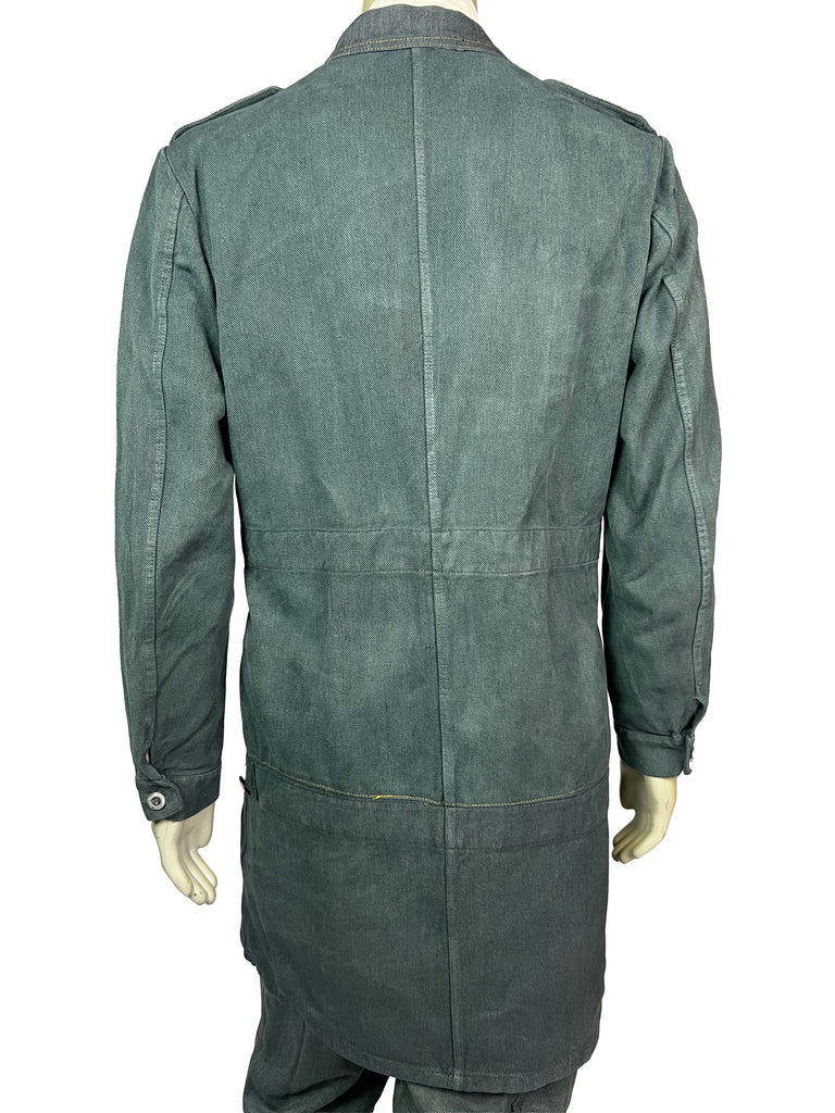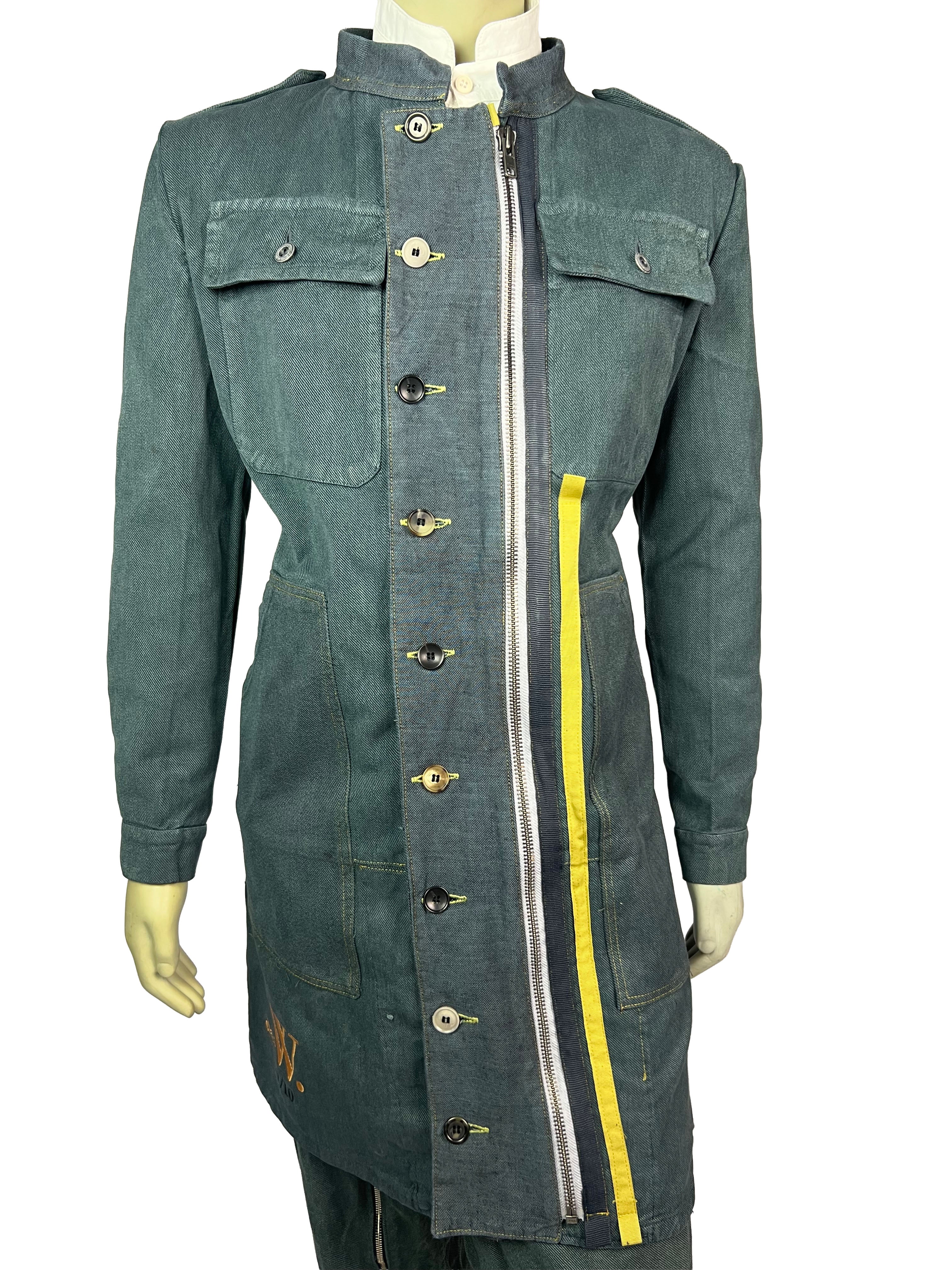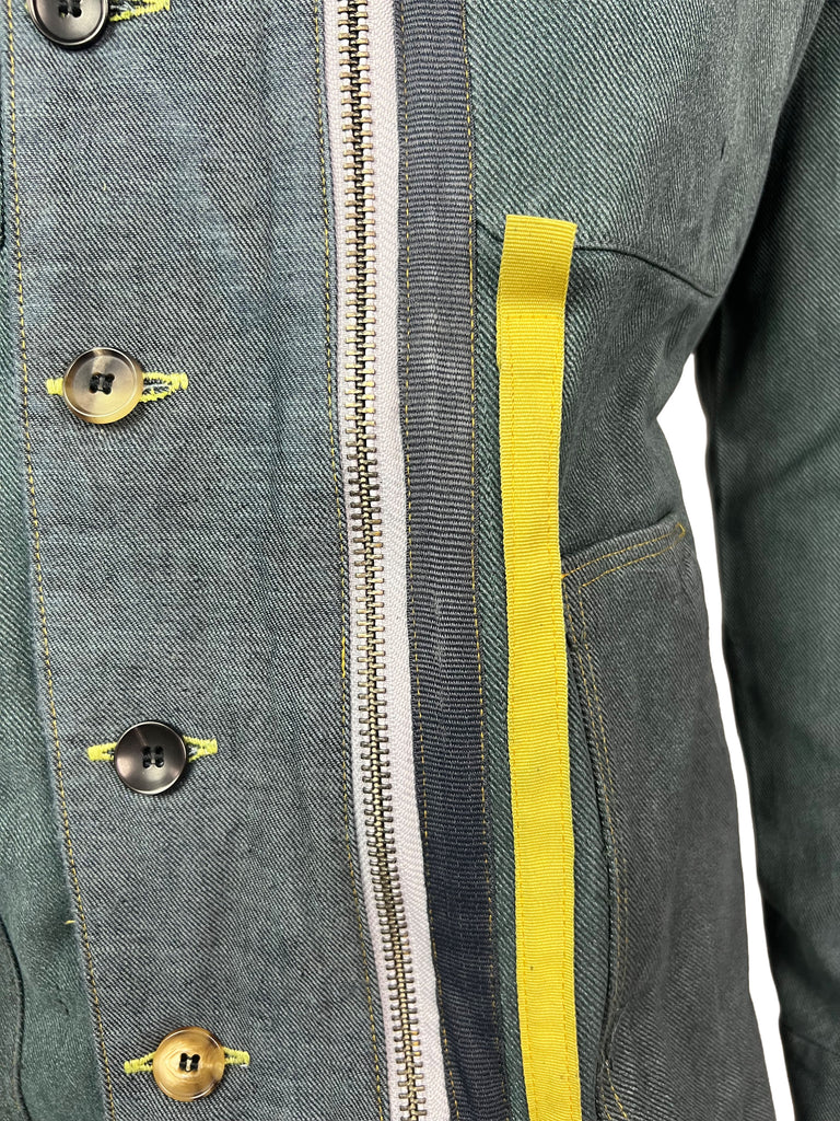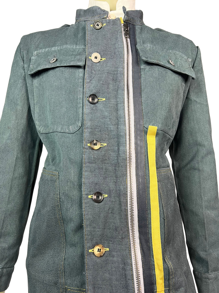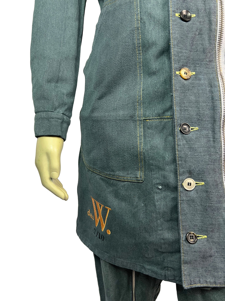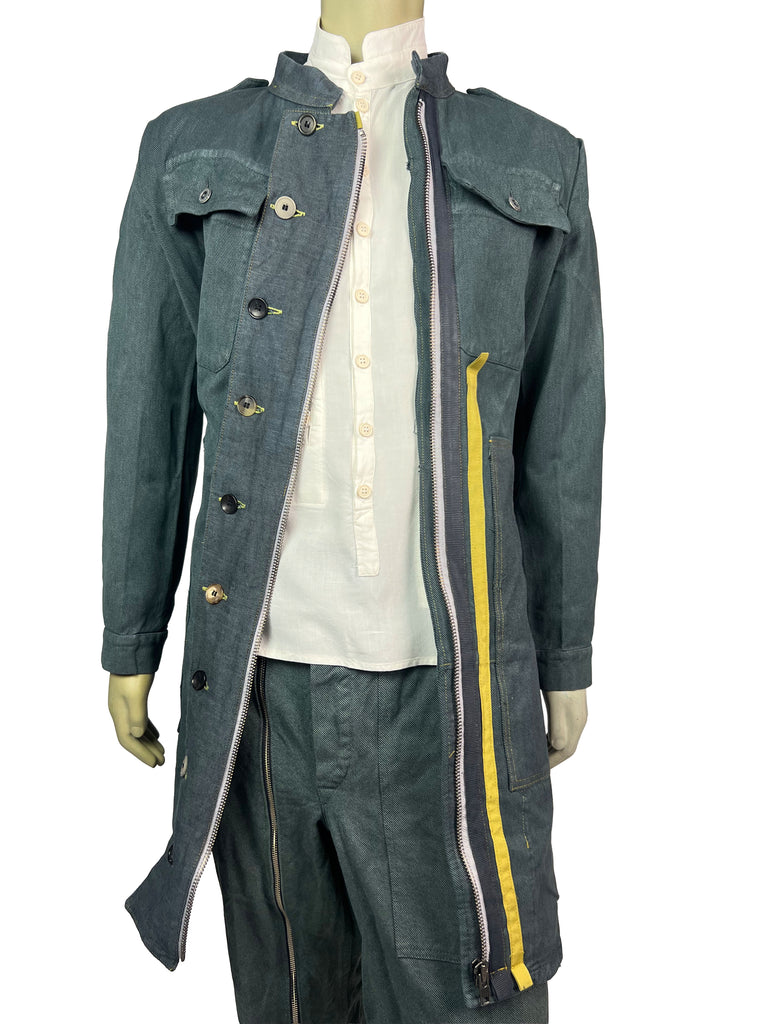 The Meridian Coat No. 7 is fully crafted from sturdy, vintage-washed denim. Its elongated silhouette is accentuated by a bold two-way zipper, contrasting yellow trim, and asymmetrically placed buttons that highlight the coat’s utilitarian spirit. Shoulder flaps, flap chest pockets, and clean seam lines give it a structured, yet versatile look.