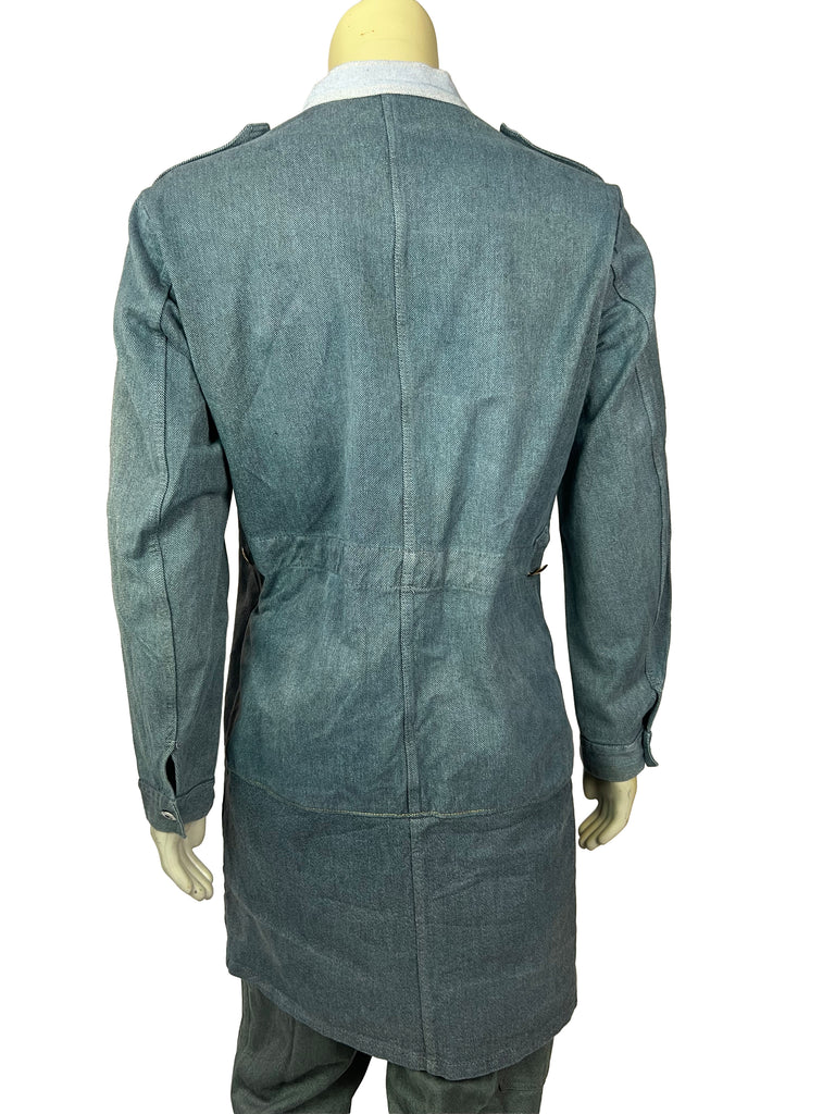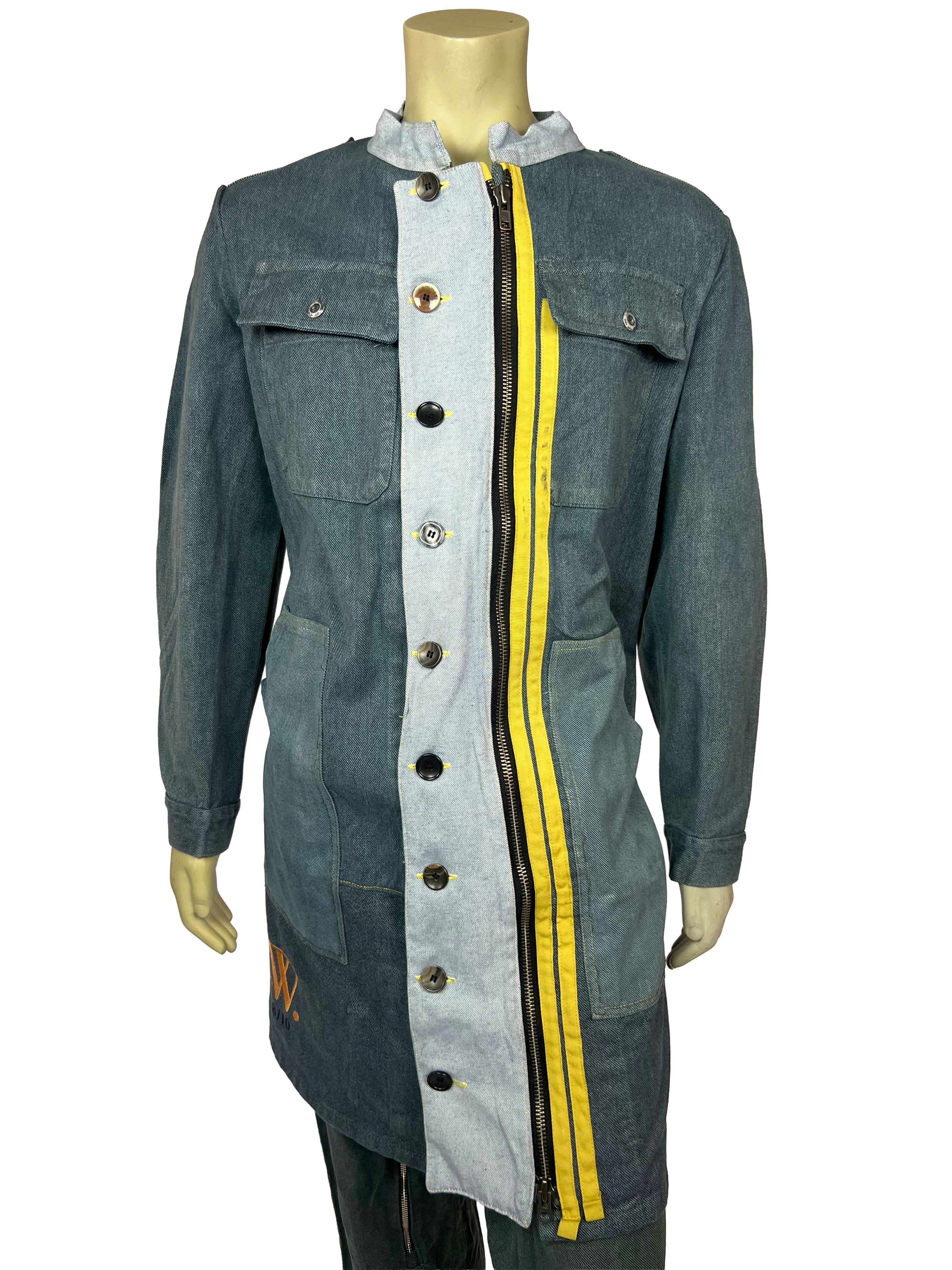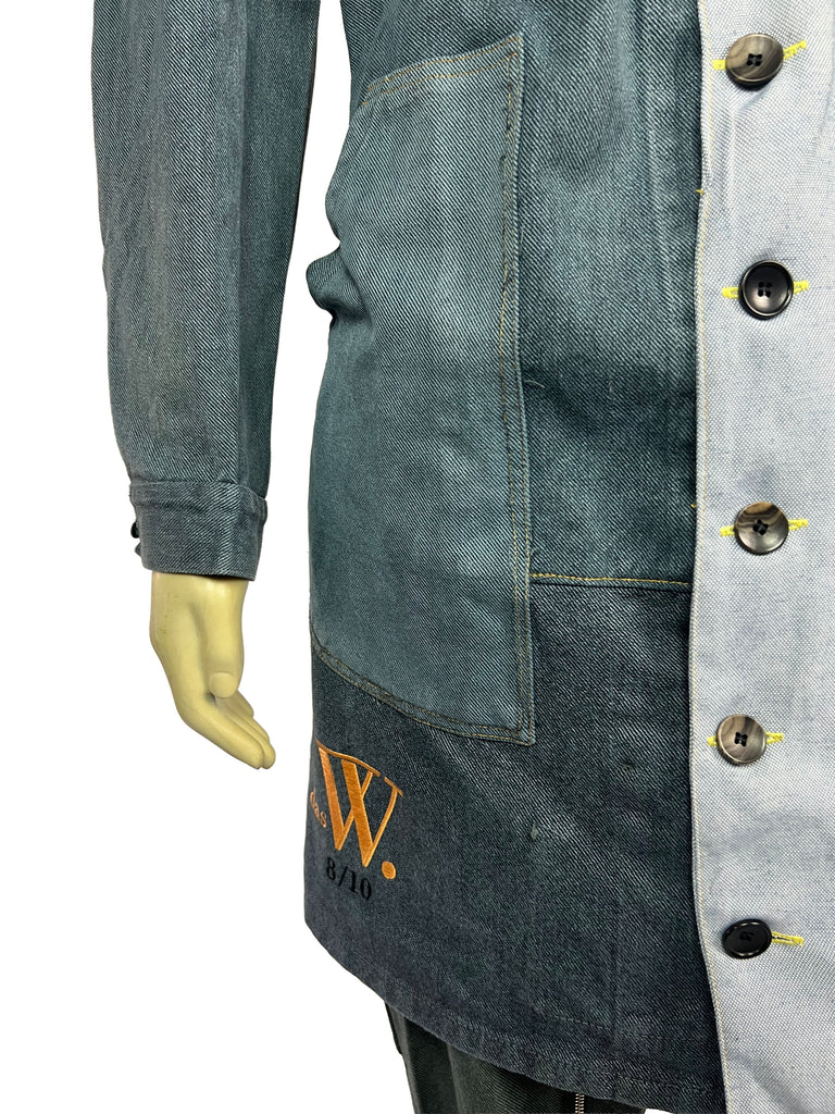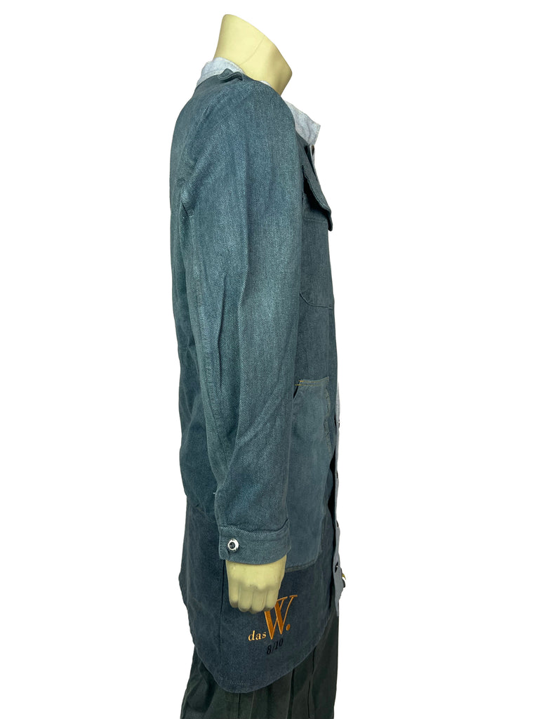 The Transit Coat No. 8 combines the sturdiness of deep blue-green denim with a striking central panel in lighter fabric. This contrast introduces a layered effect, highlighting the coat’s asymmetry and structure. The stand collar is cut from the same light fabric, adding subtle variation while framing the neckline.