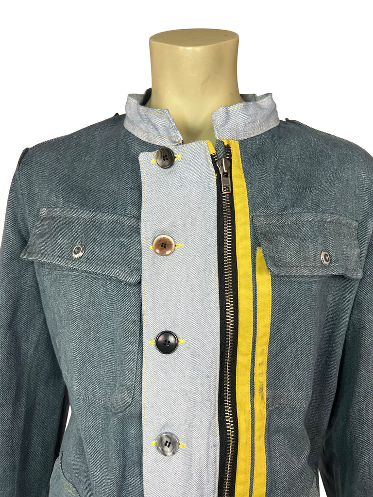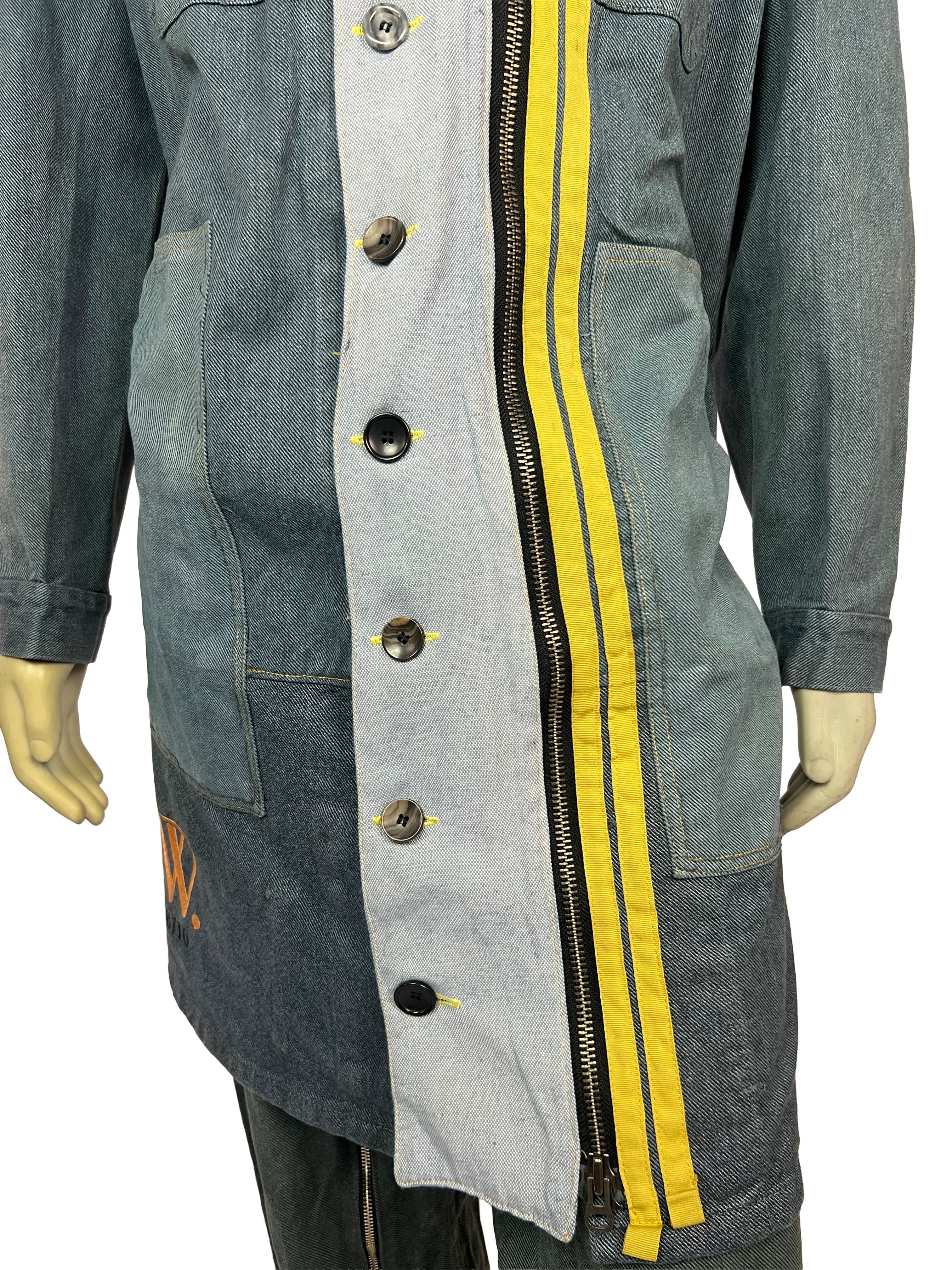 Details like the mismatched button line, yellow-highlighted stitching, and the bold exposed yellow zip tape lend the coat a graphic edge. These accents balance the utilitarian construction with individuality and contemporary flair.