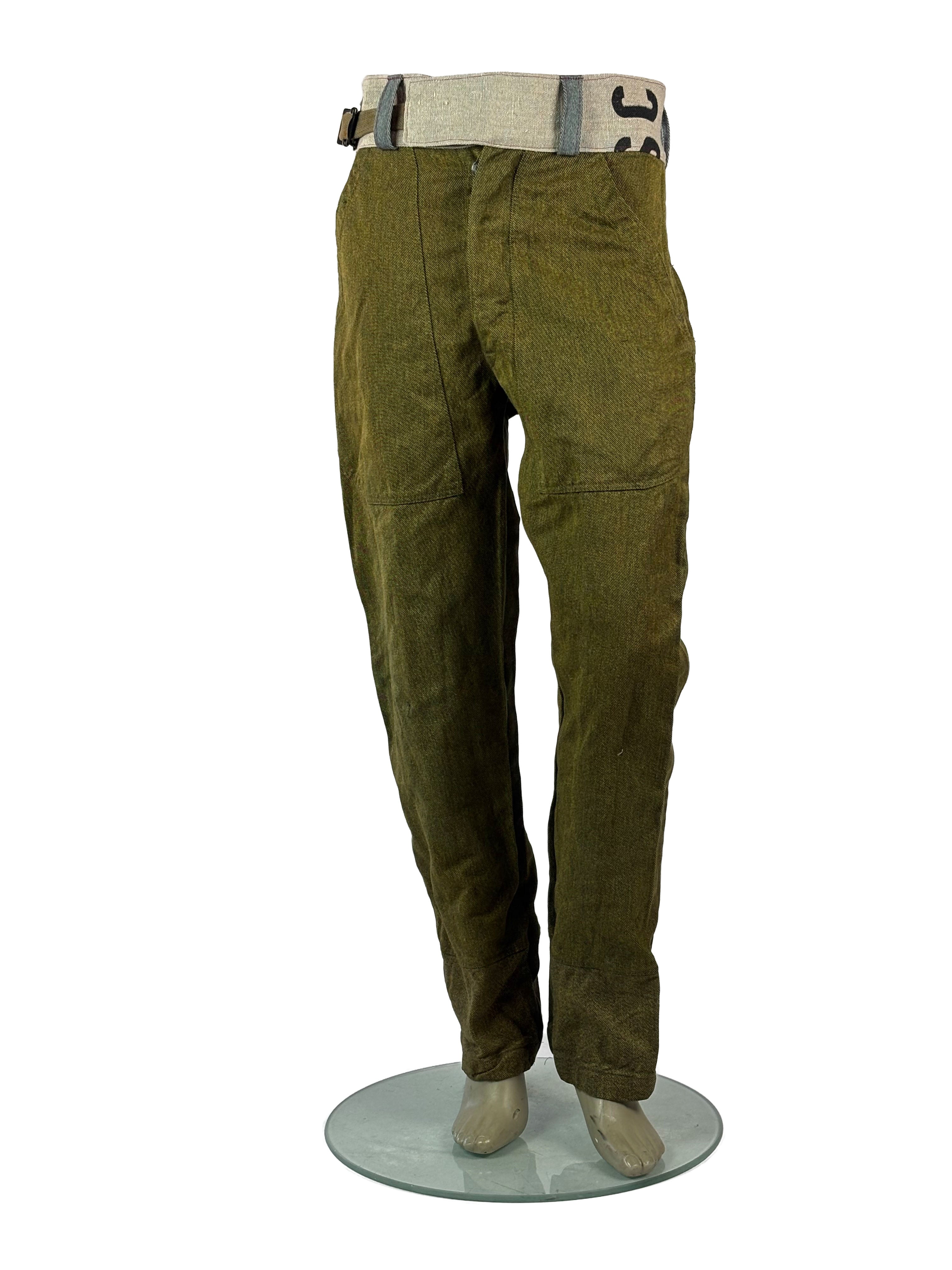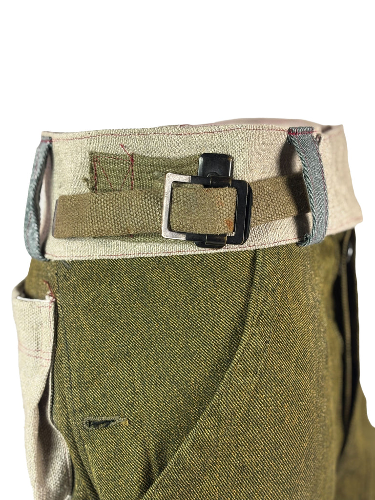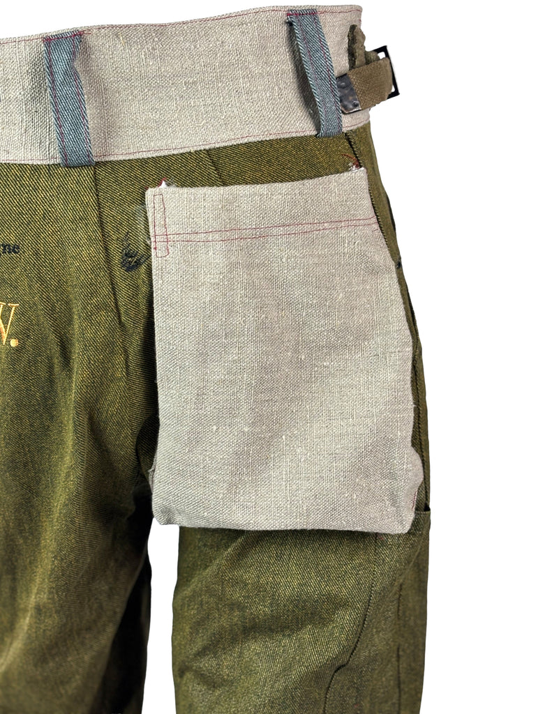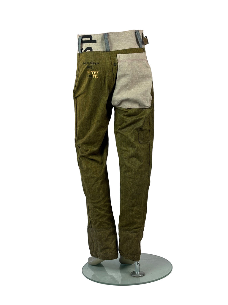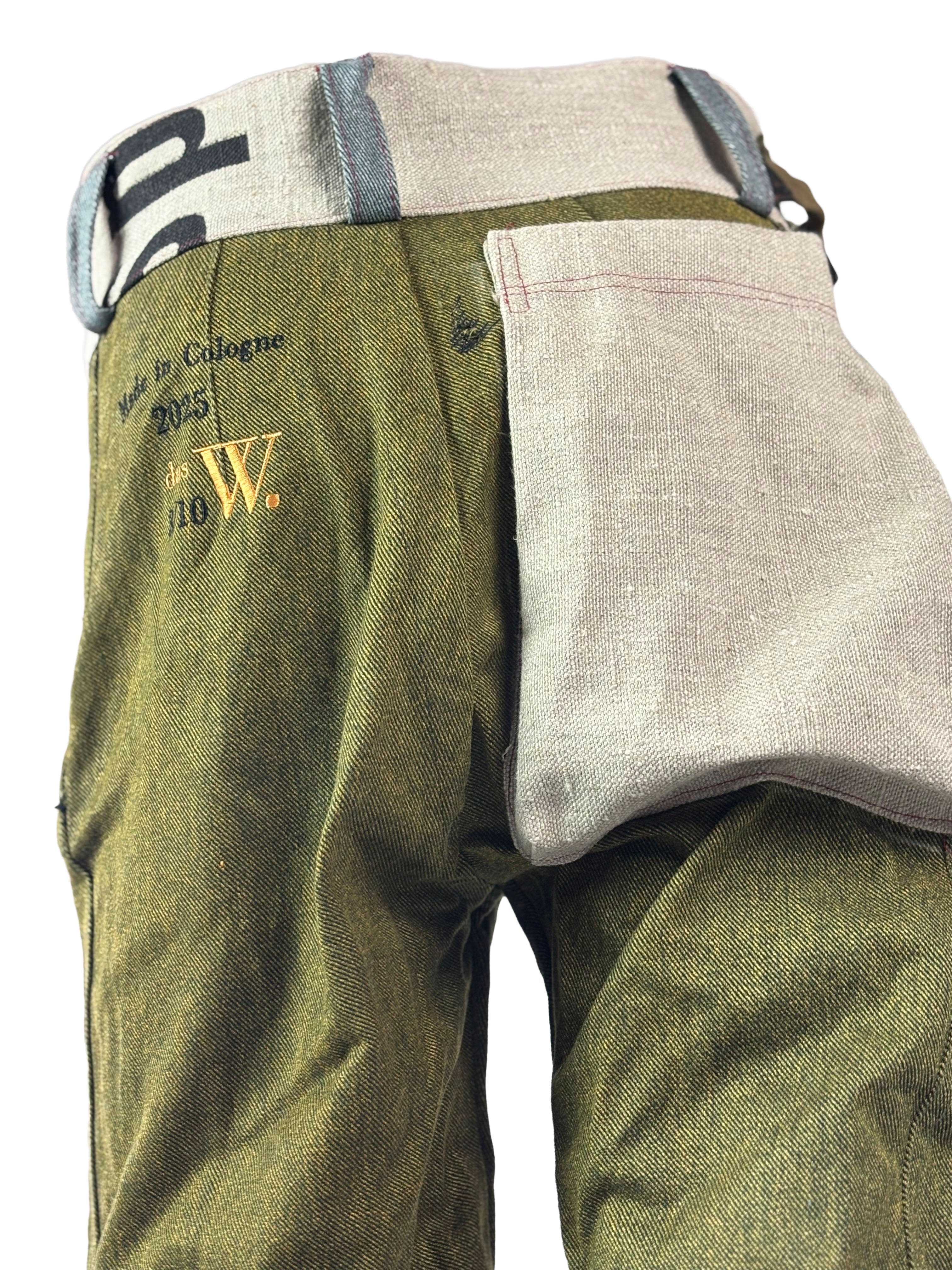 Crafted from original 1970s military denim and finished with belt details and pockets made from pre‑1989 German postal sacks, they carry both durability and history.