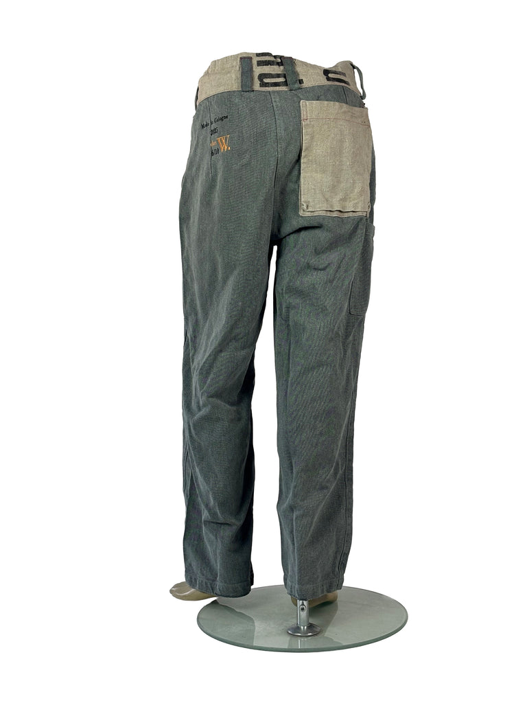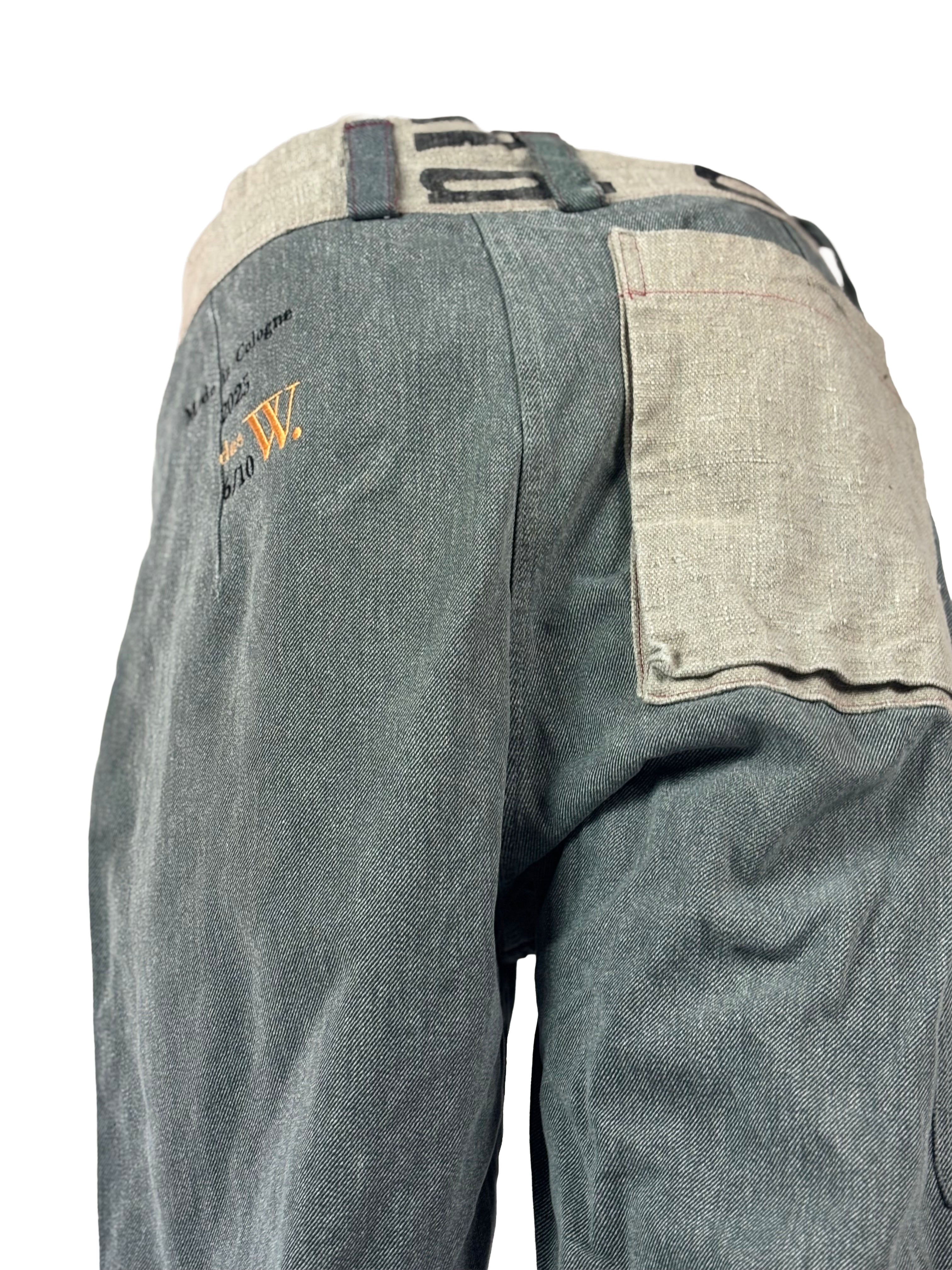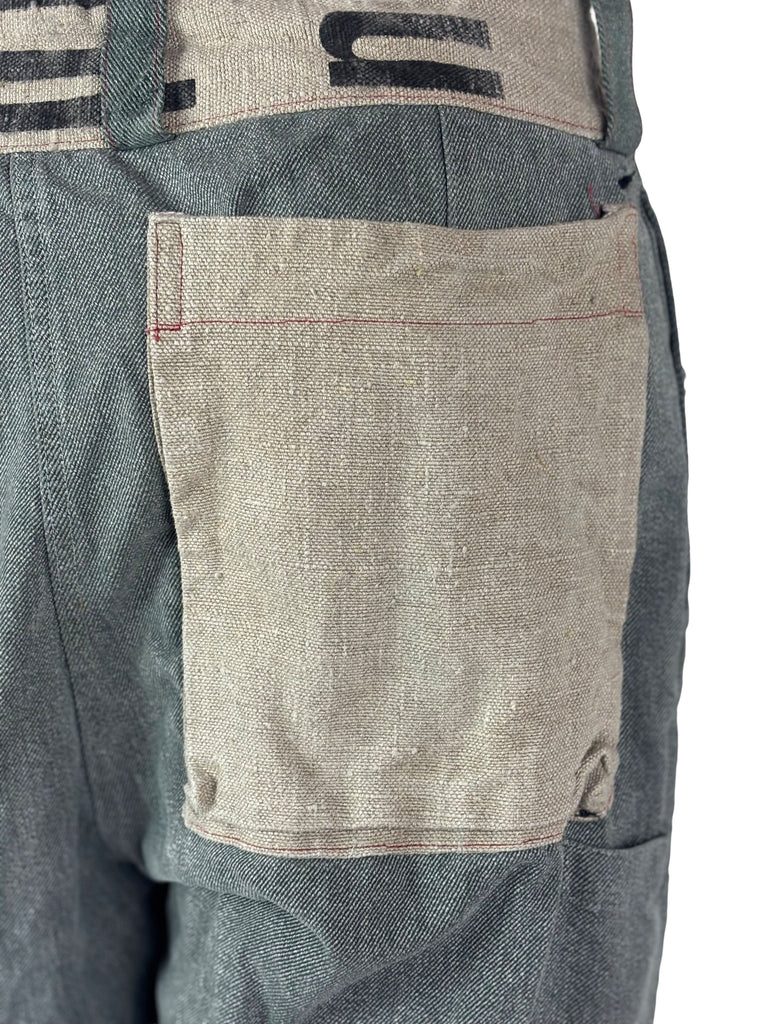 Crafted from original 1970s military denim and finished with belt details and pockets made from pre‑1989 German postal sacks, they carry both durability and history.