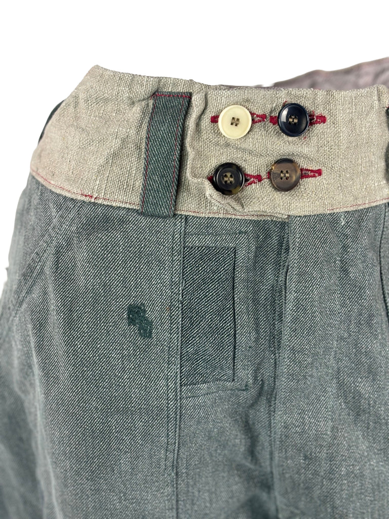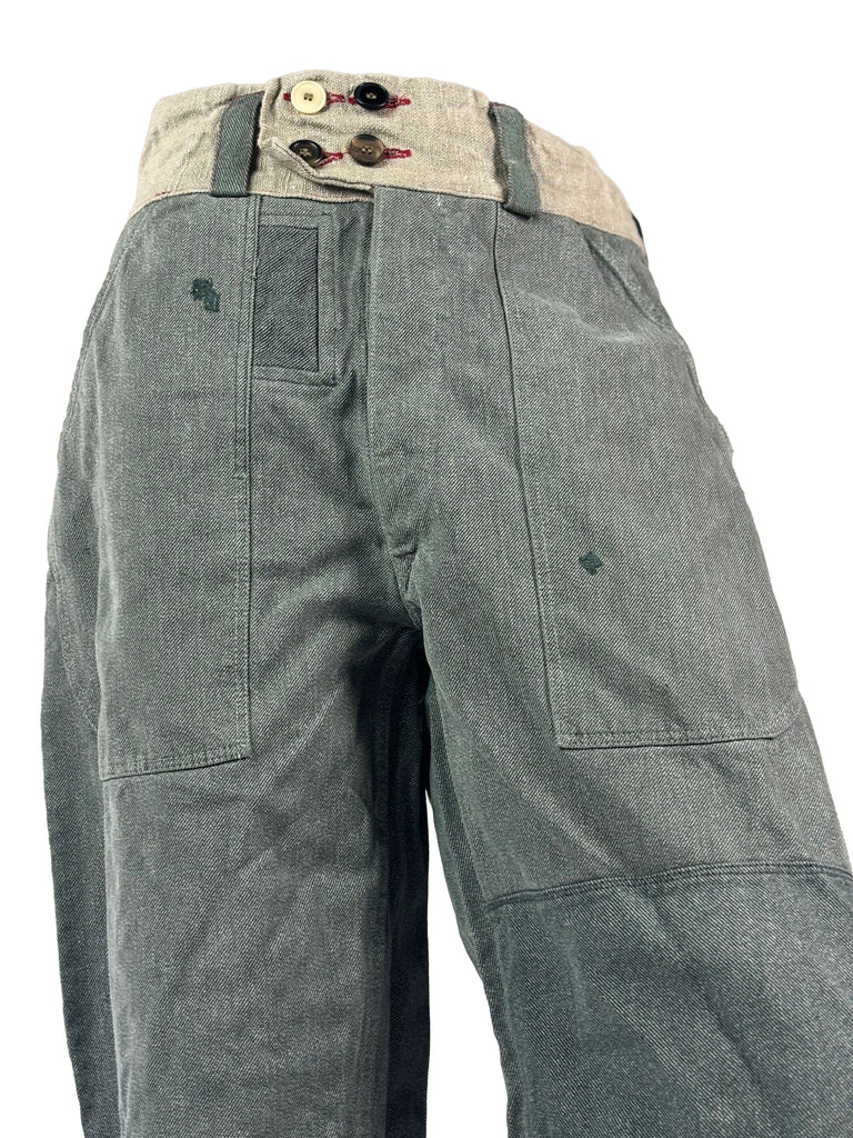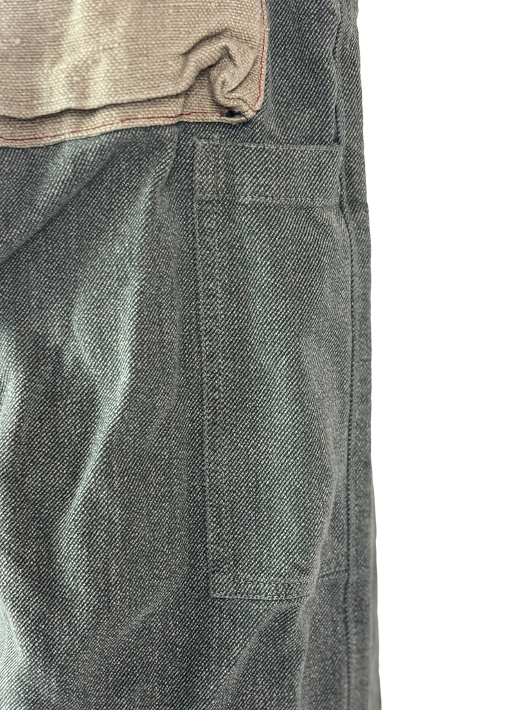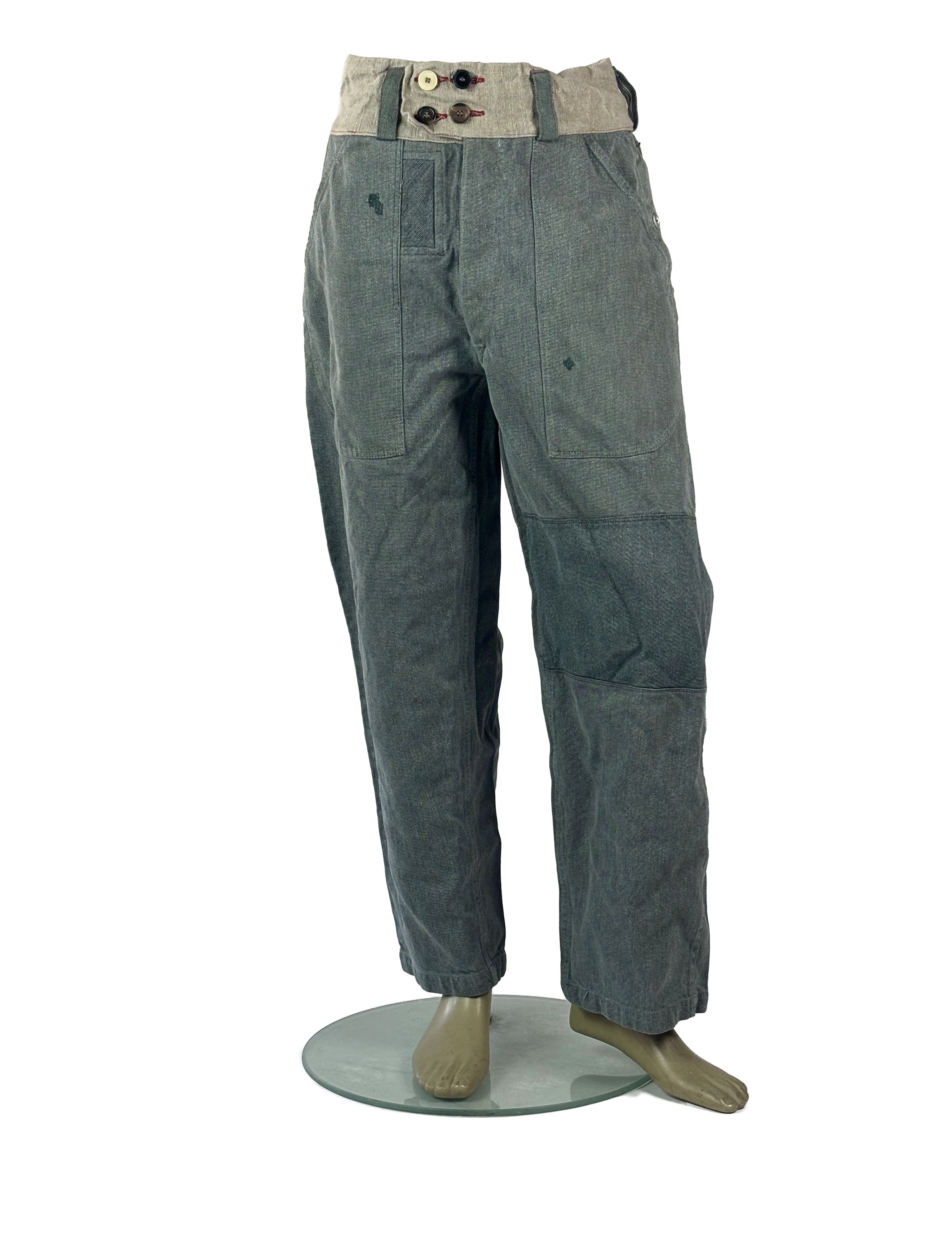 Crafted from original 1970s military denim and finished with belt details and pockets made from pre‑1989 German postal sacks, they carry both durability and history.