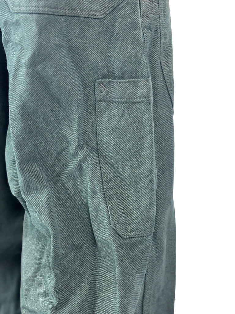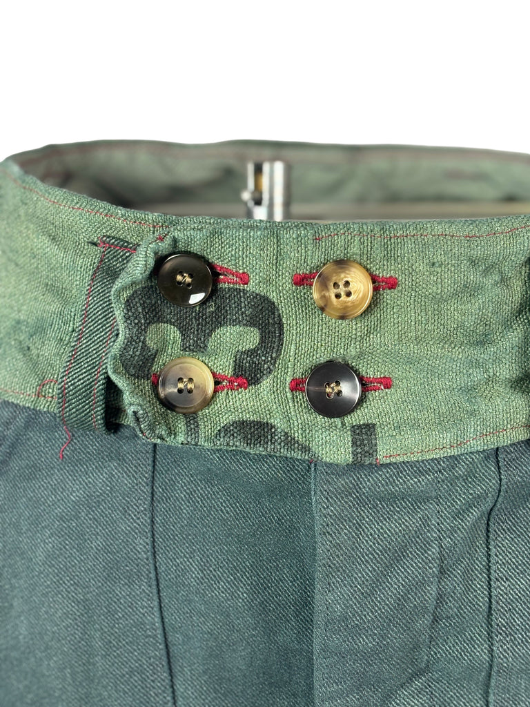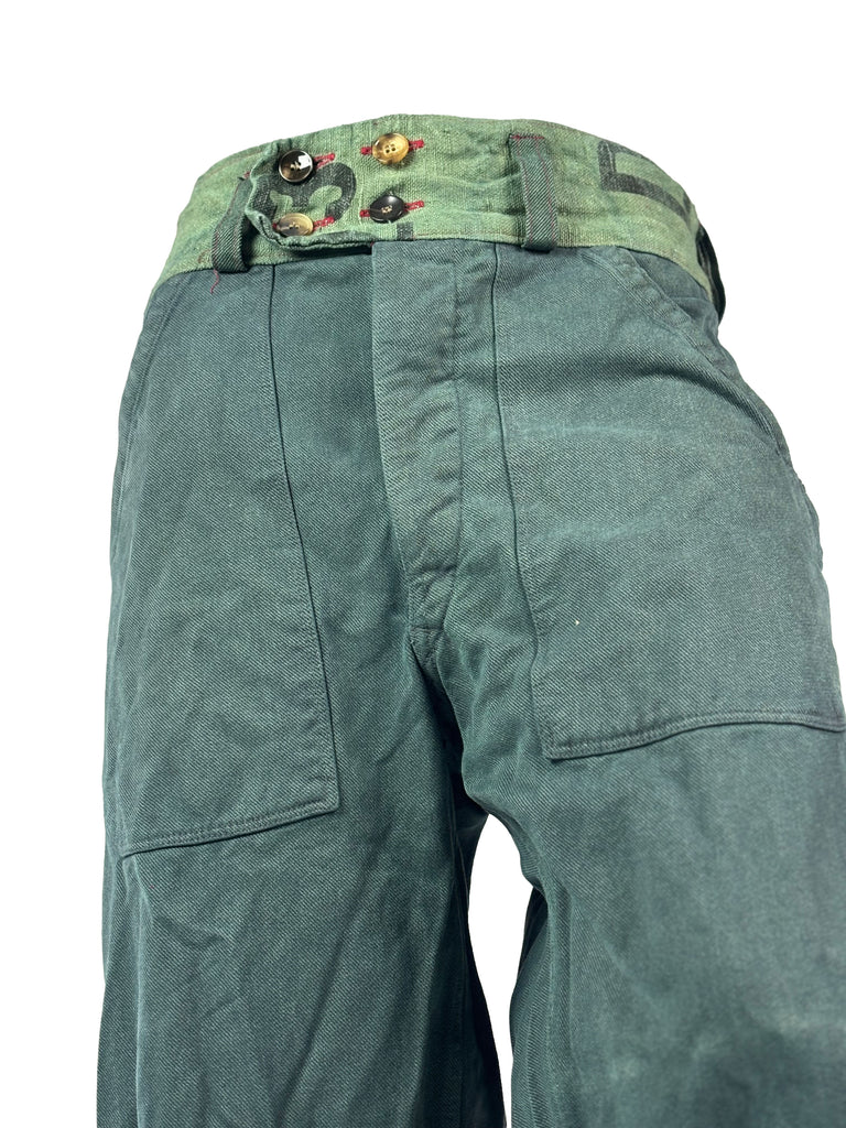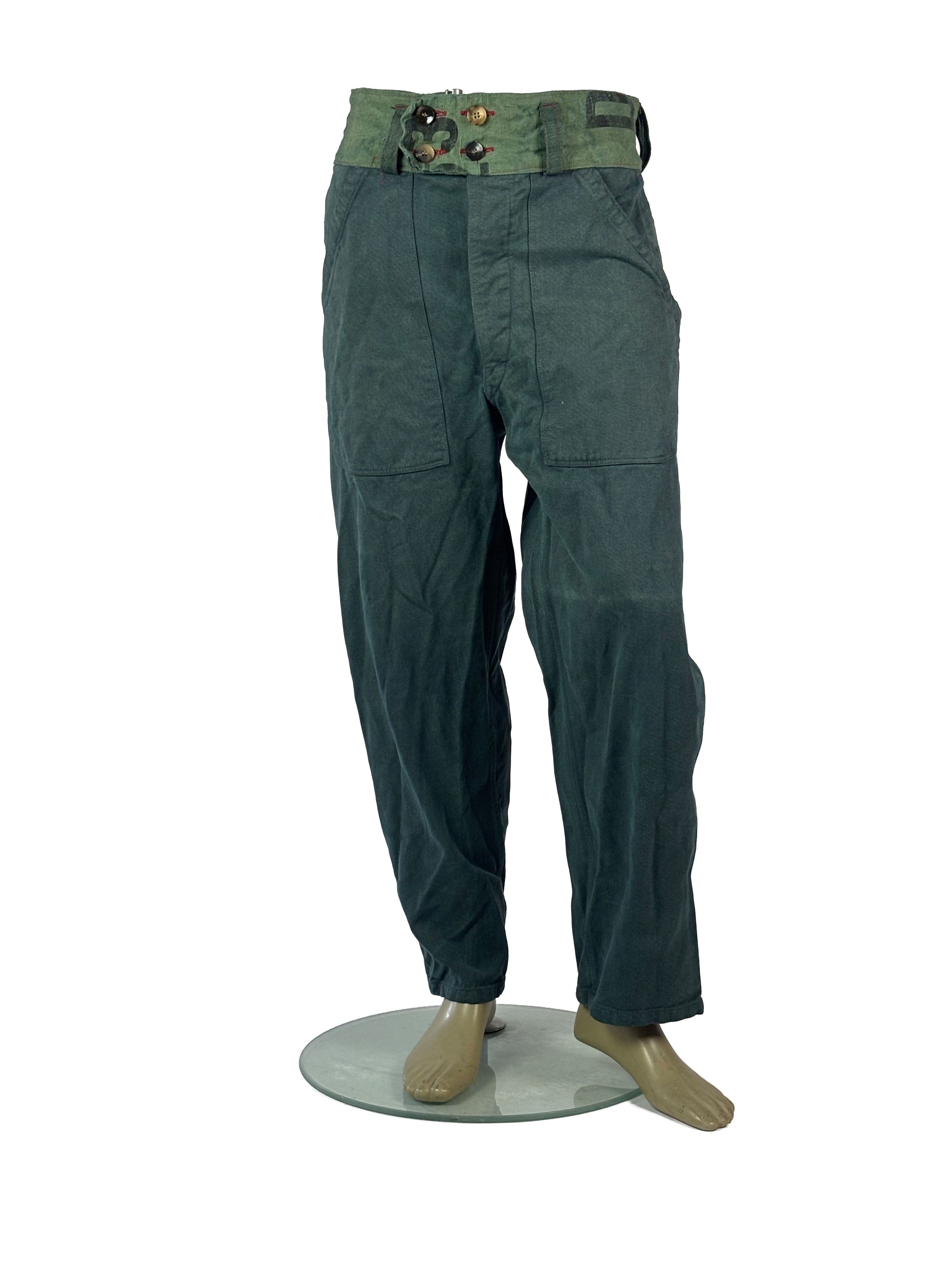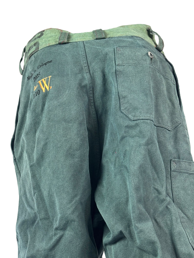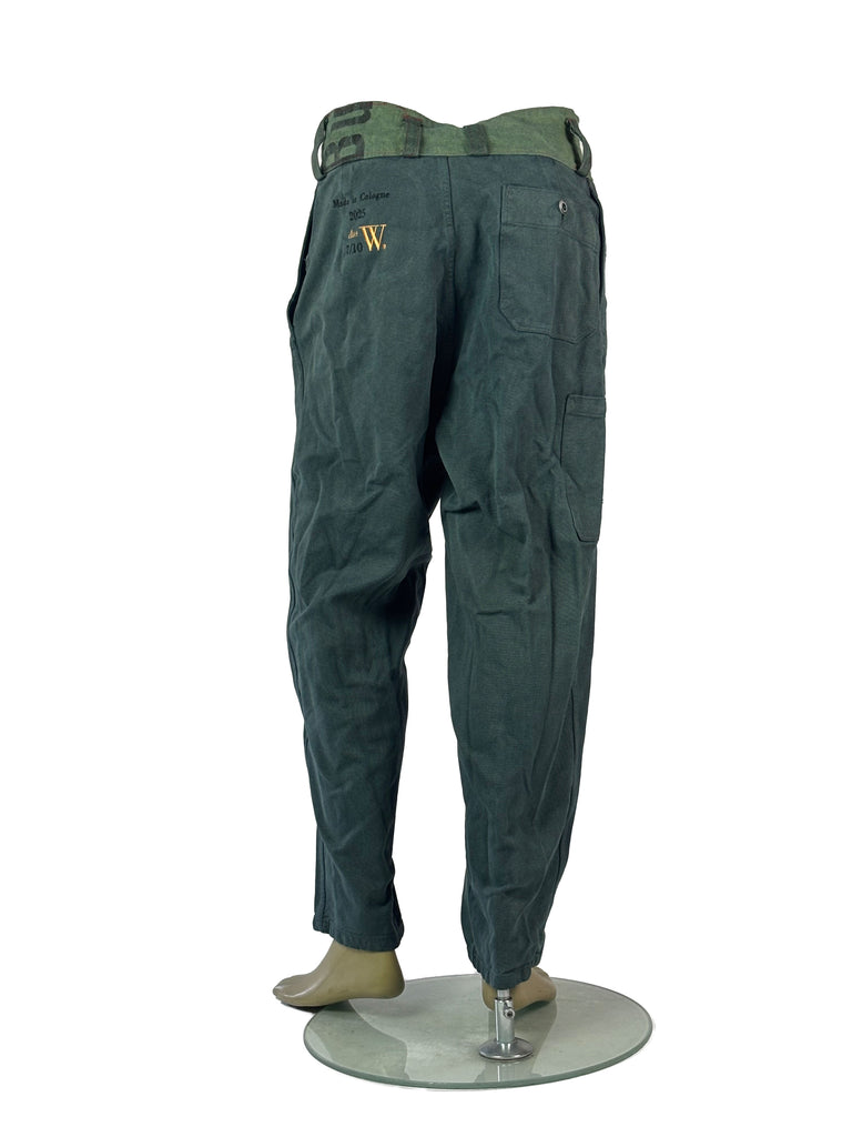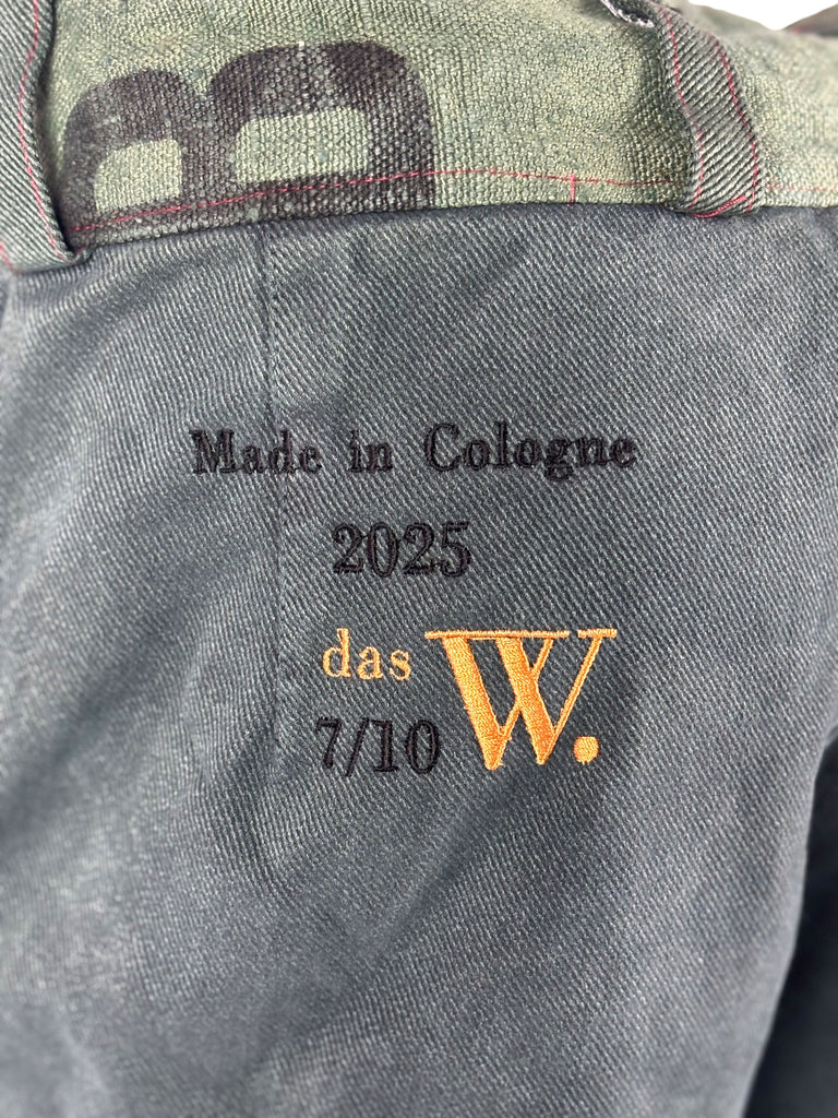 Crafted from original 1970s military denim and finished with belt details and pockets made from pre‑1989 German postal sacks, they carry both durability and history.