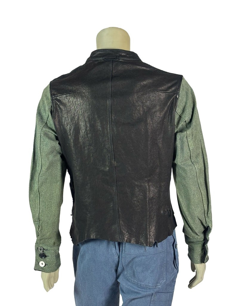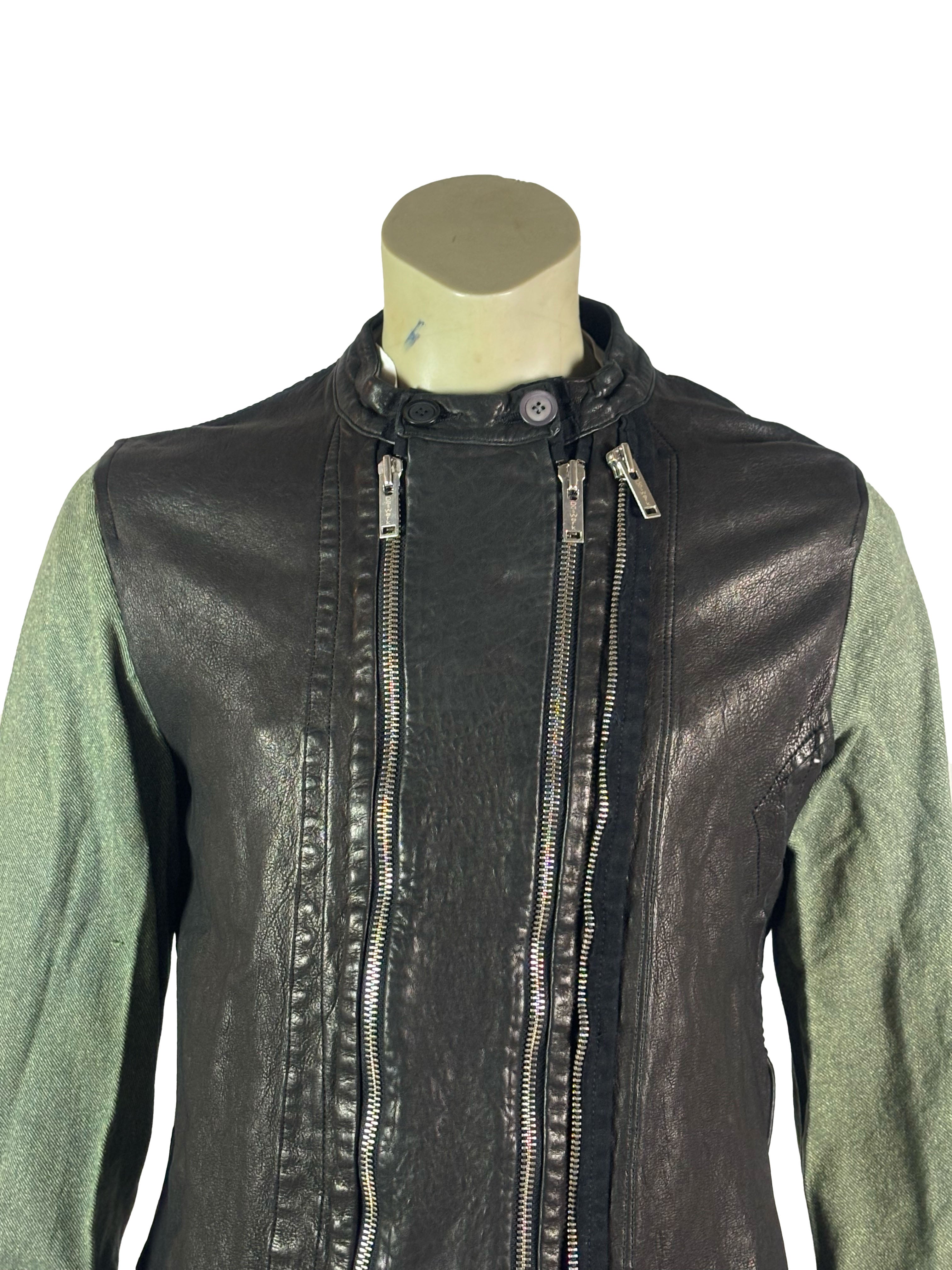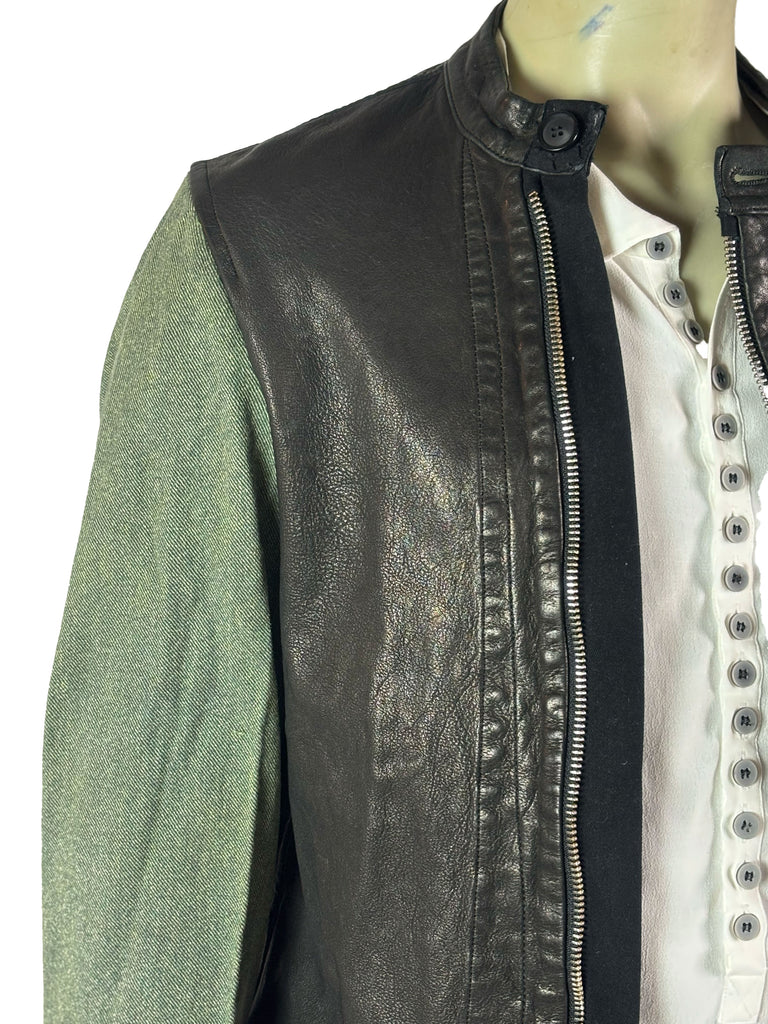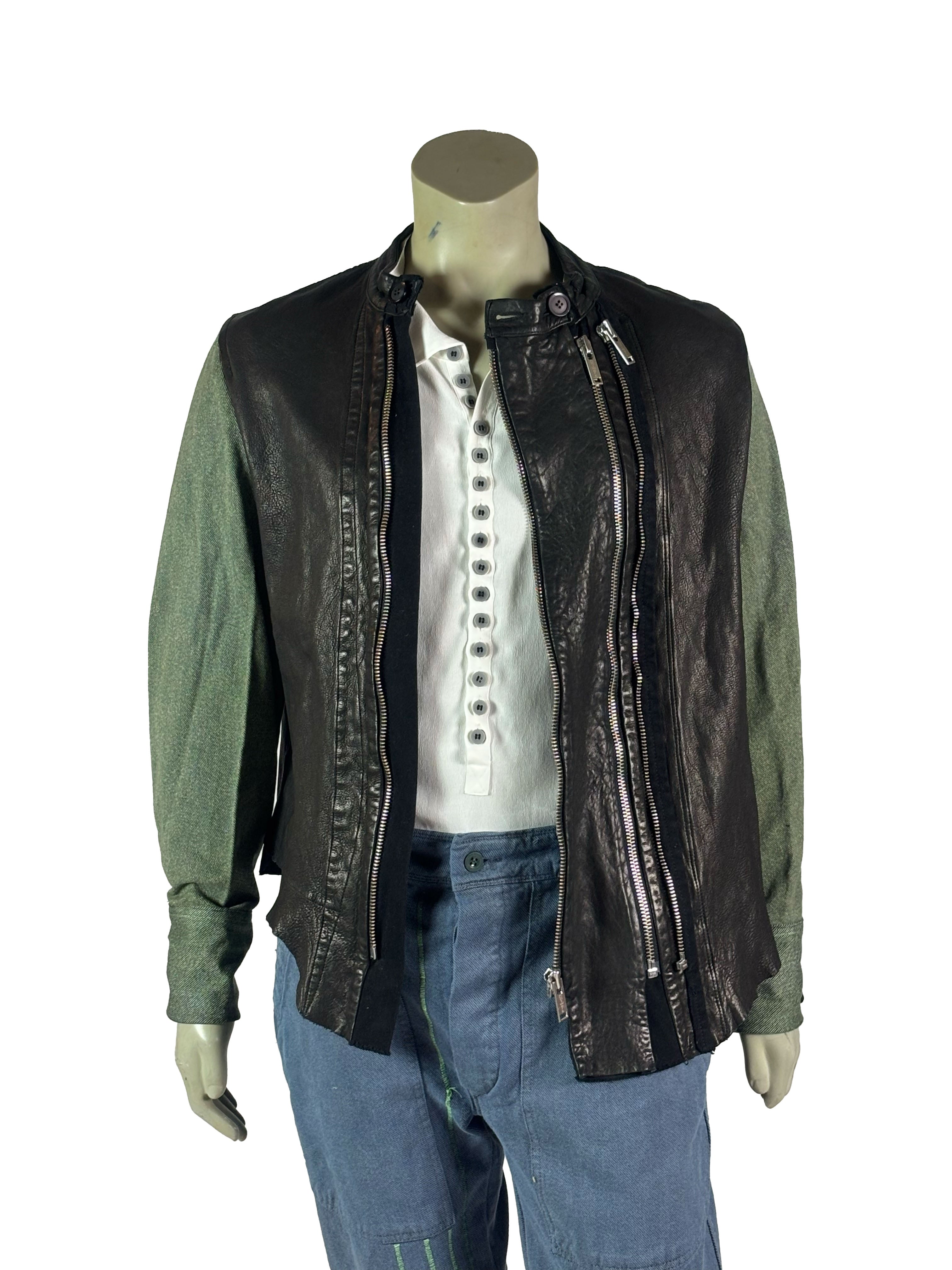 The Signal Jacket No. 4 continues the Werkhaus exploration of contrast and modular construction. The body is crafted from supple black leather, while the sleeves are cut from reclaimed sage-green denim from the 1970s, giving the piece a subtle vintage character. The streamlined silhouette is framed by a narrow stand collar and twin metal zips running down the front, creating a strong vertical outline.