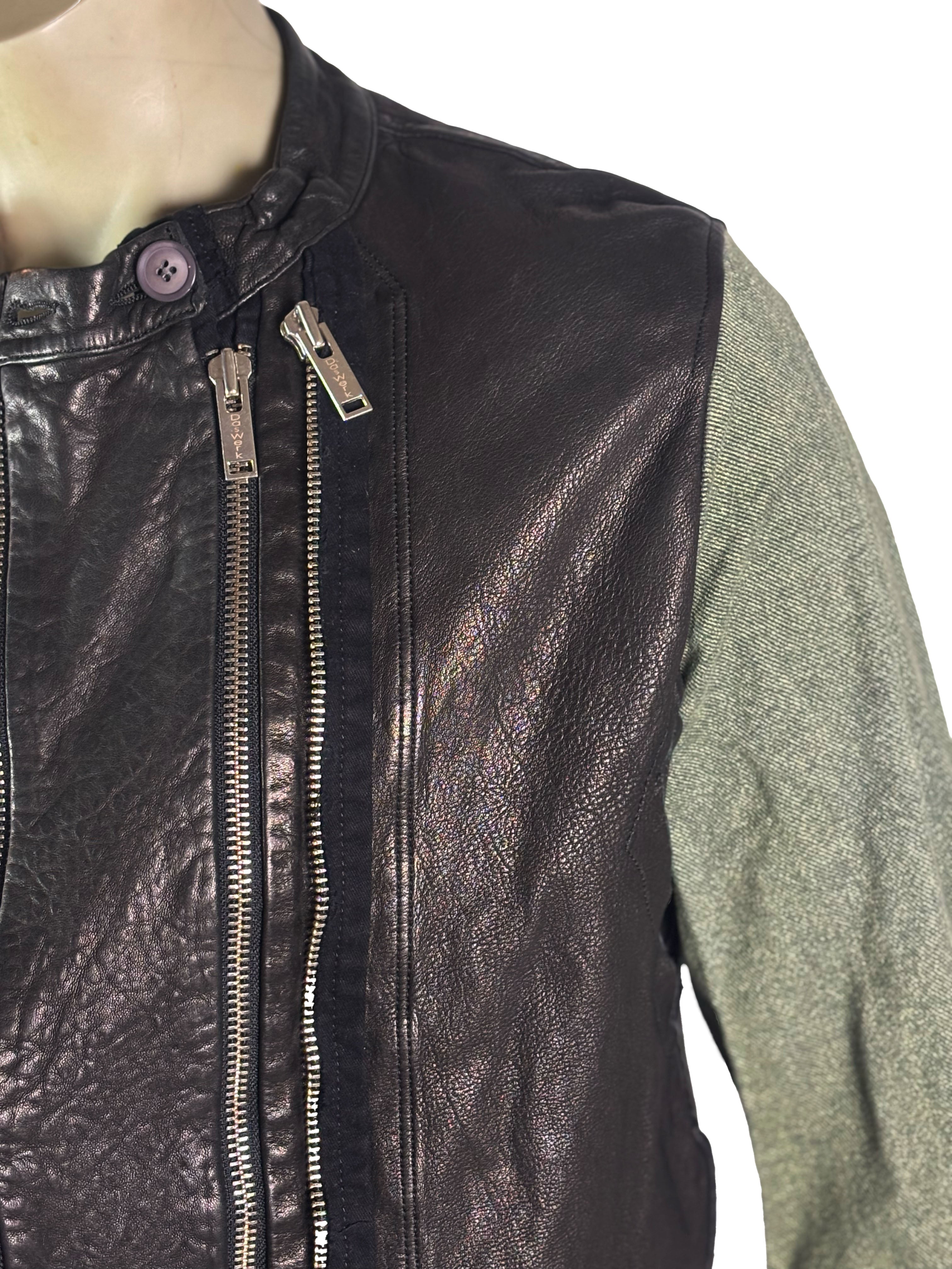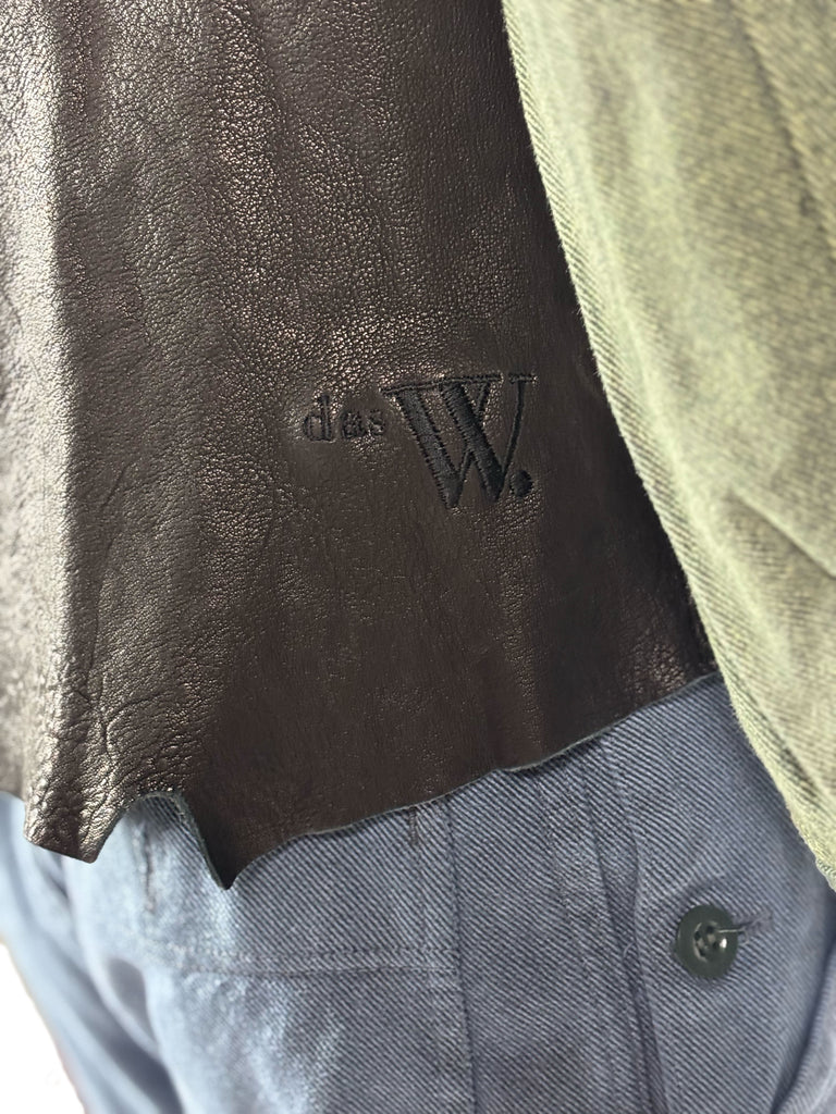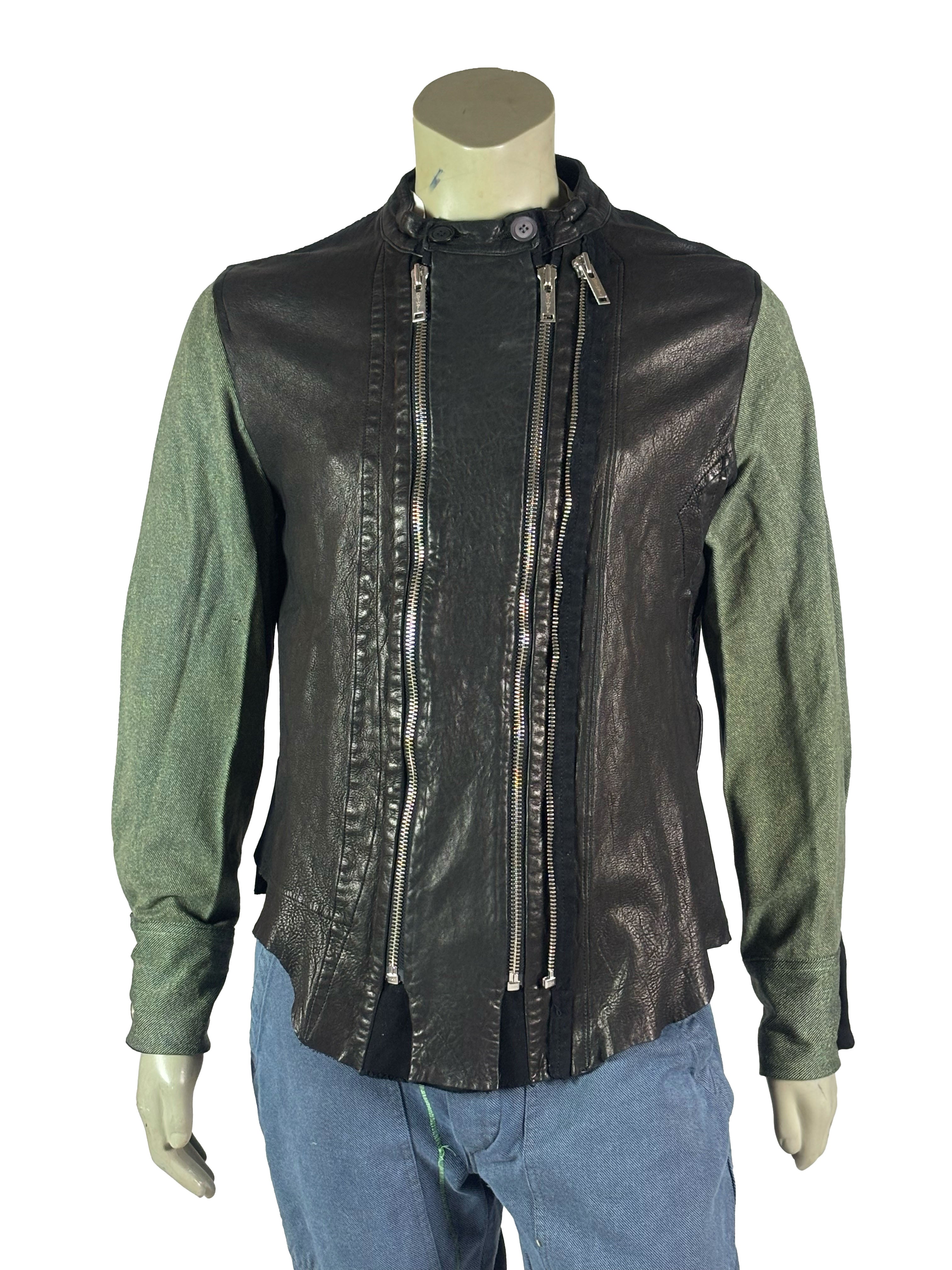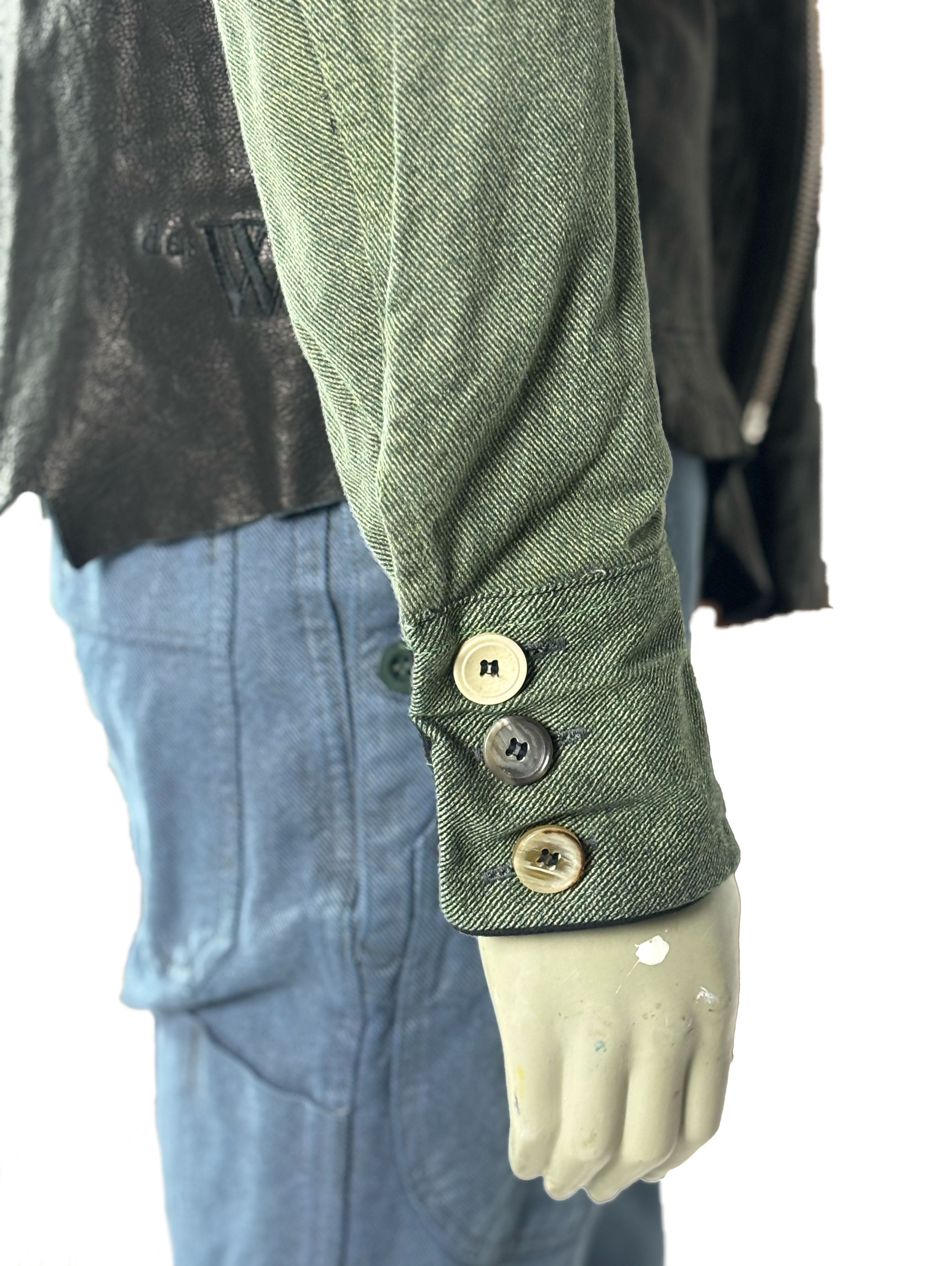 The Signal Jacket No. 4 continues the Werkhaus exploration of contrast and modular construction. The body is crafted from supple black leather, while the sleeves are cut from reclaimed sage-green denim from the 1970s, giving the piece a subtle vintage character. The streamlined silhouette is framed by a narrow stand collar and twin metal zips running down the front, creating a strong vertical outline.