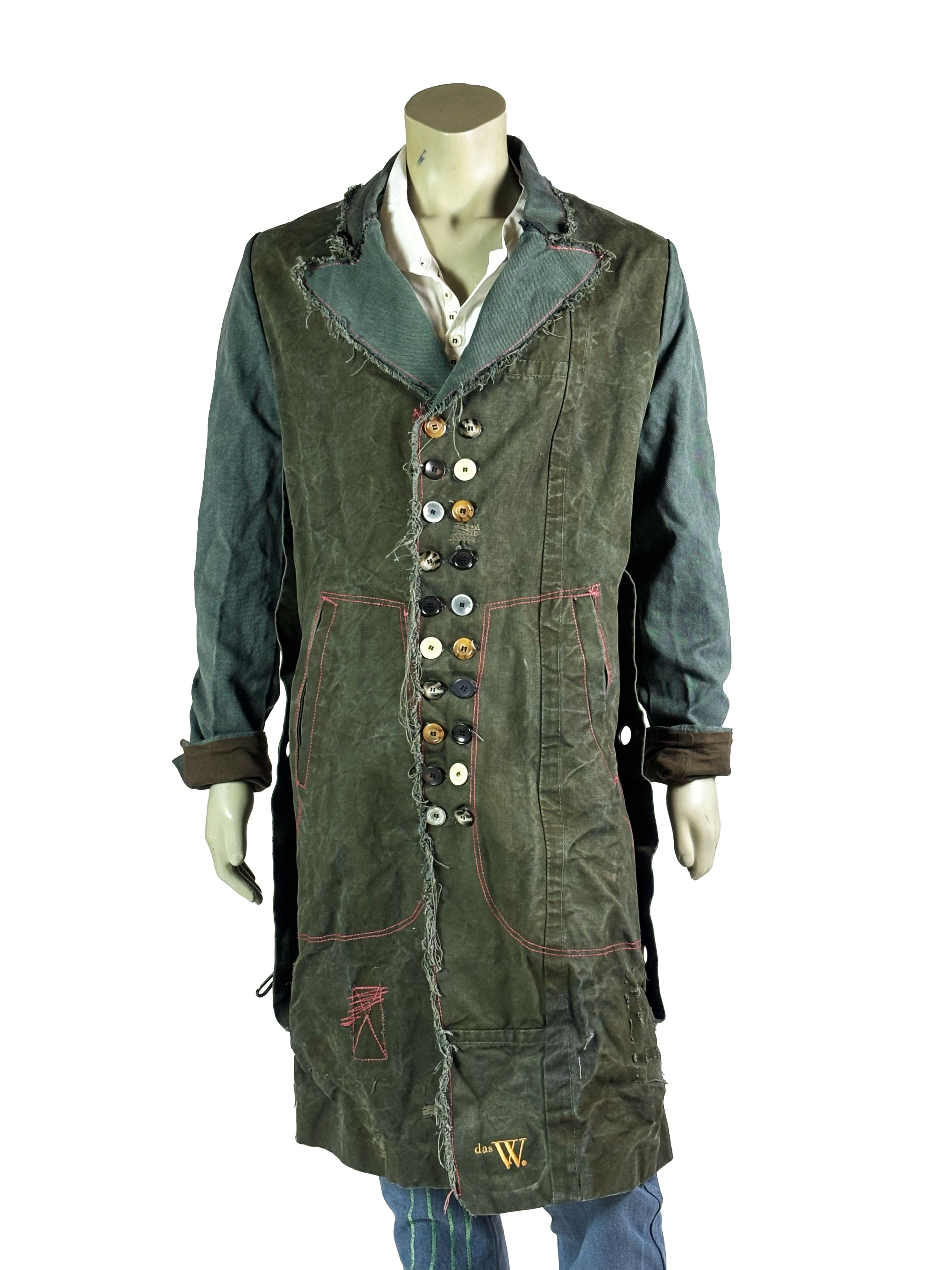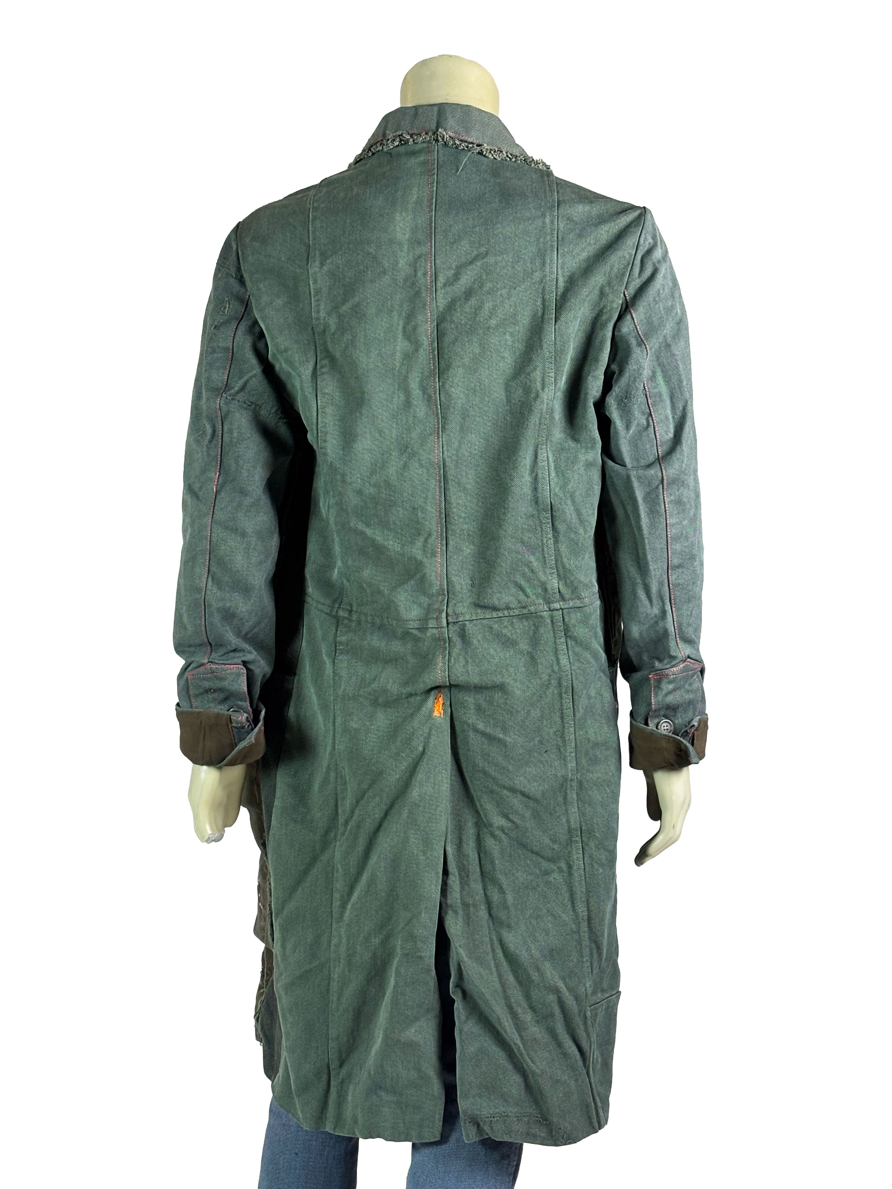 Natural irregularities, raw edges, visible seams and repaired details are intentionally preserved and define the visual identity of the piece. The coat follows a straightforward, functional construction with an elongated silhouette, allowing the materials to fall naturally and shape the garment through wear. Without adjustable elements, the fit remains honest and true to its original cut.