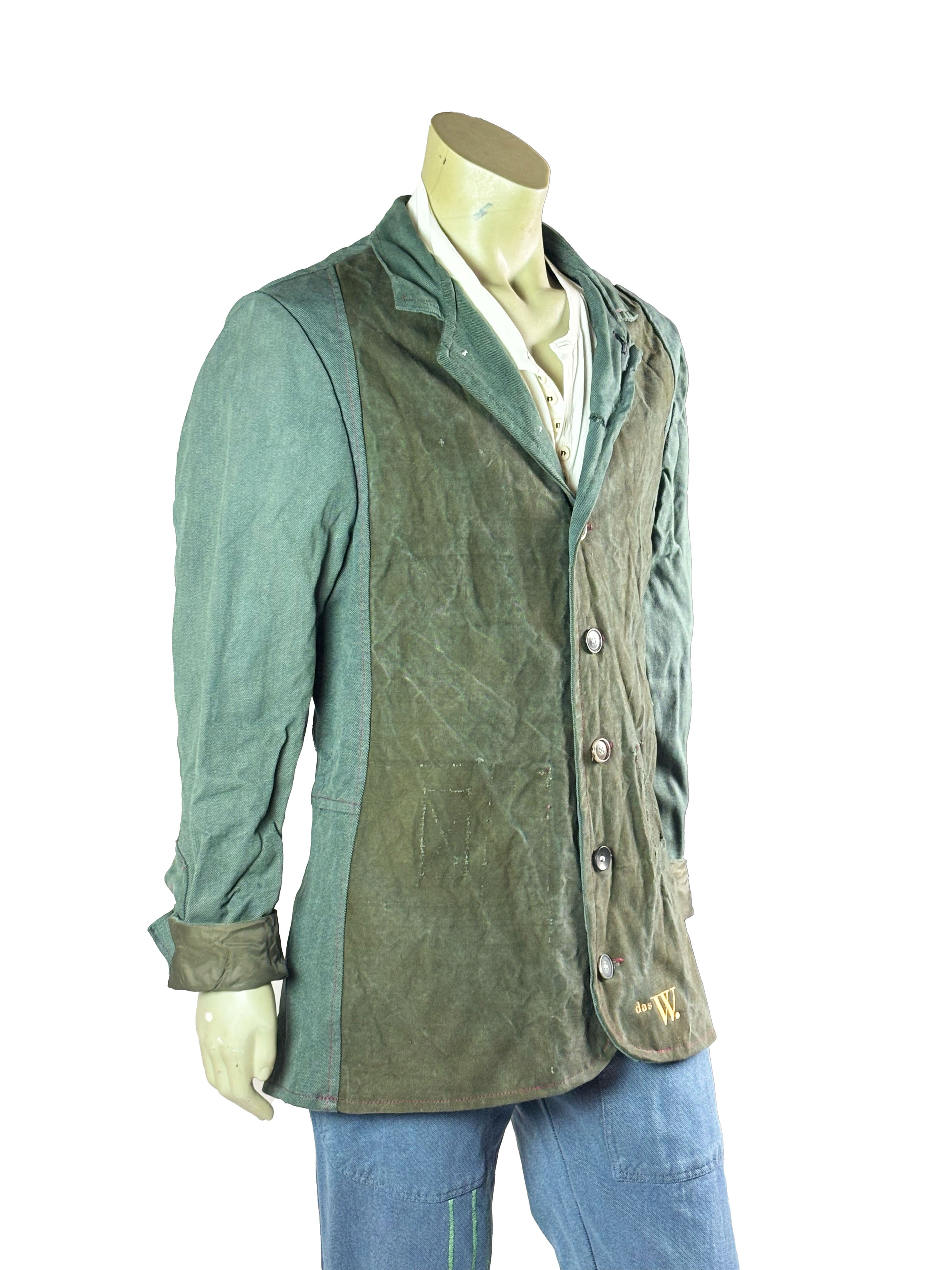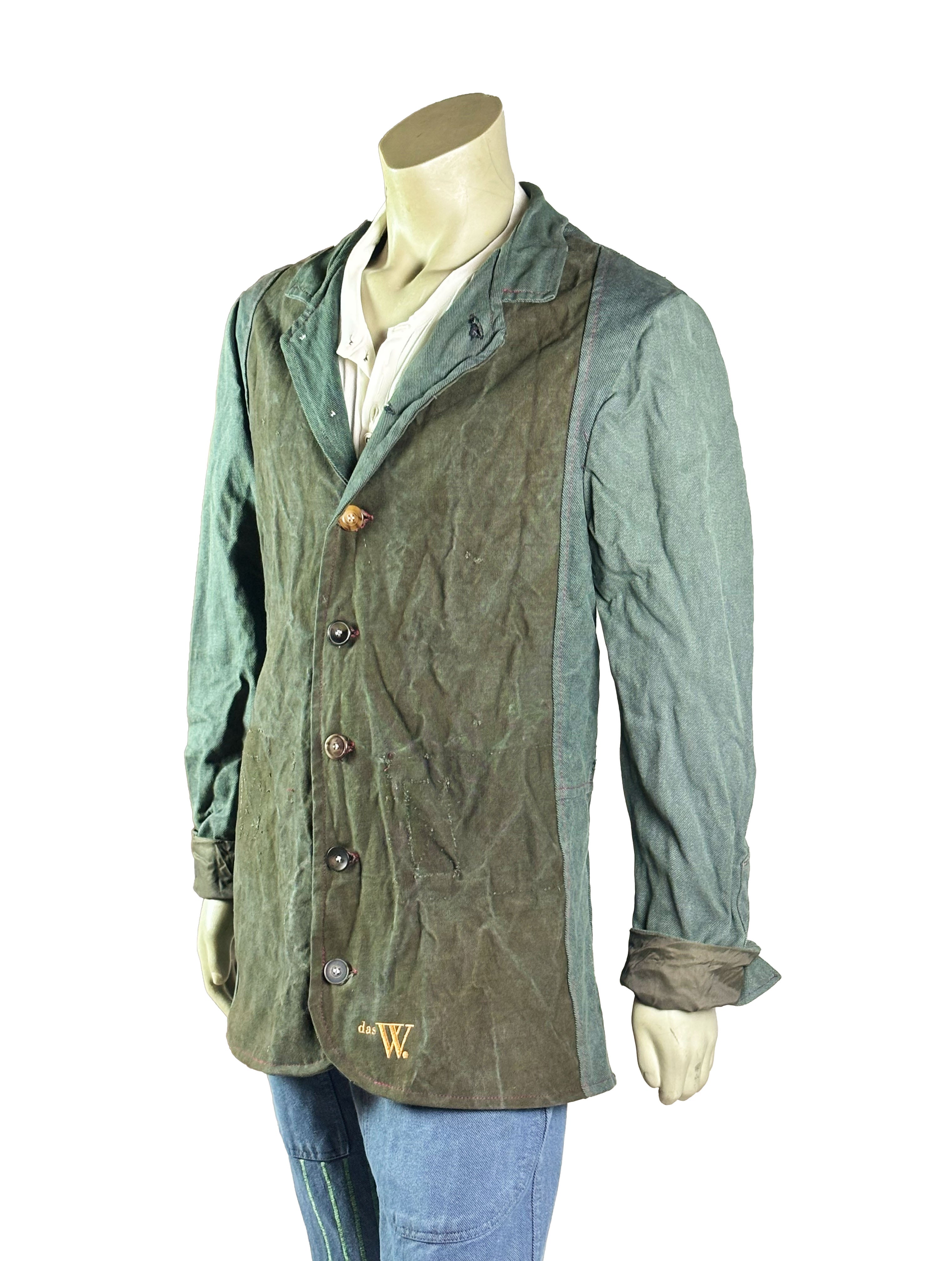 This one-of-a-kind jacket is constructed from a combination of vintage army fabric and original 1970s denim, carefully assembled by hand. The front panels are cut from durable military textiles, bearing visible traces of previous use, while the sleeves are made from aged denim with a distinct structure and patina. Each material retains its original character, creating a balanced contrast between robustness and softness.
