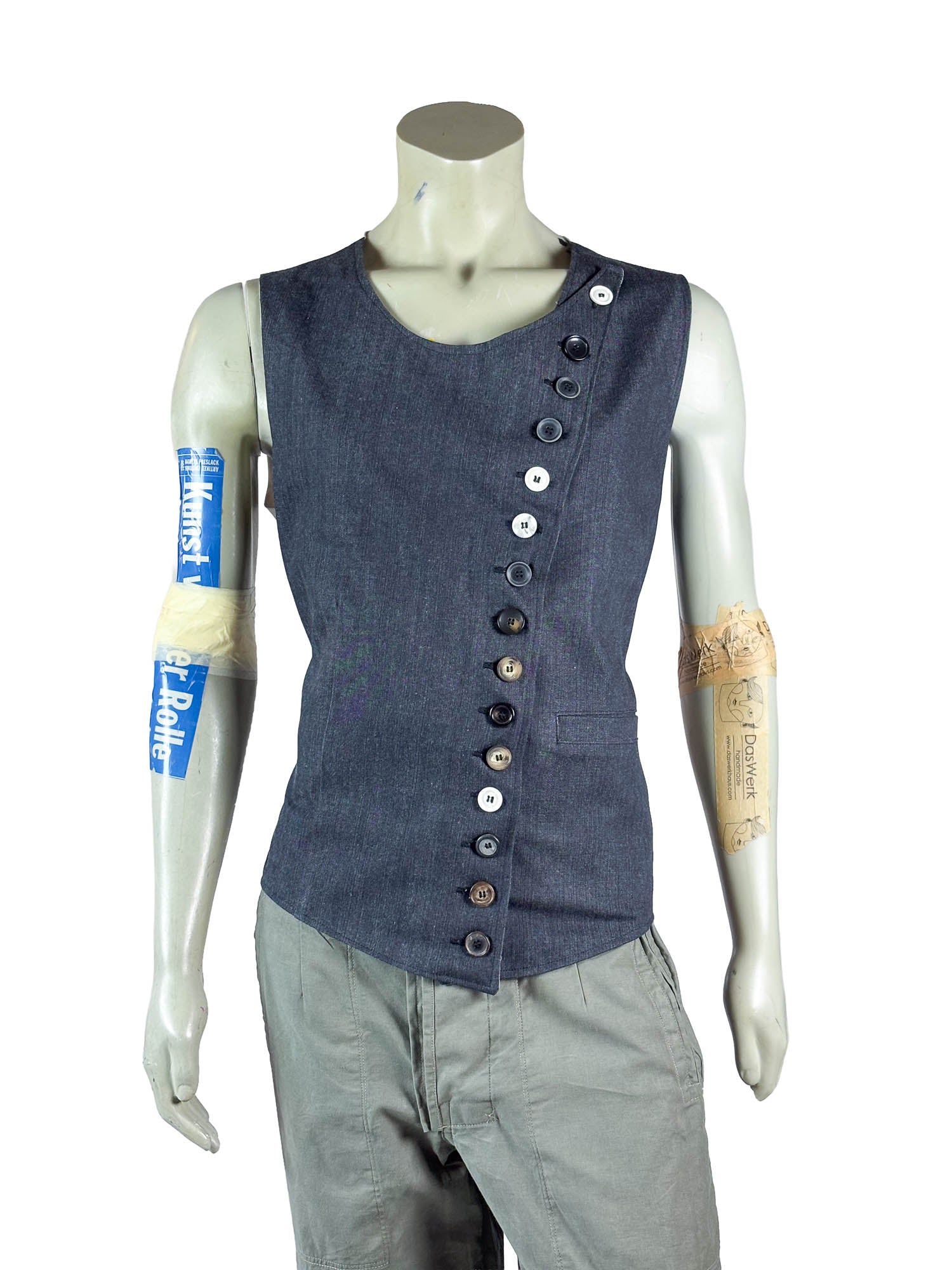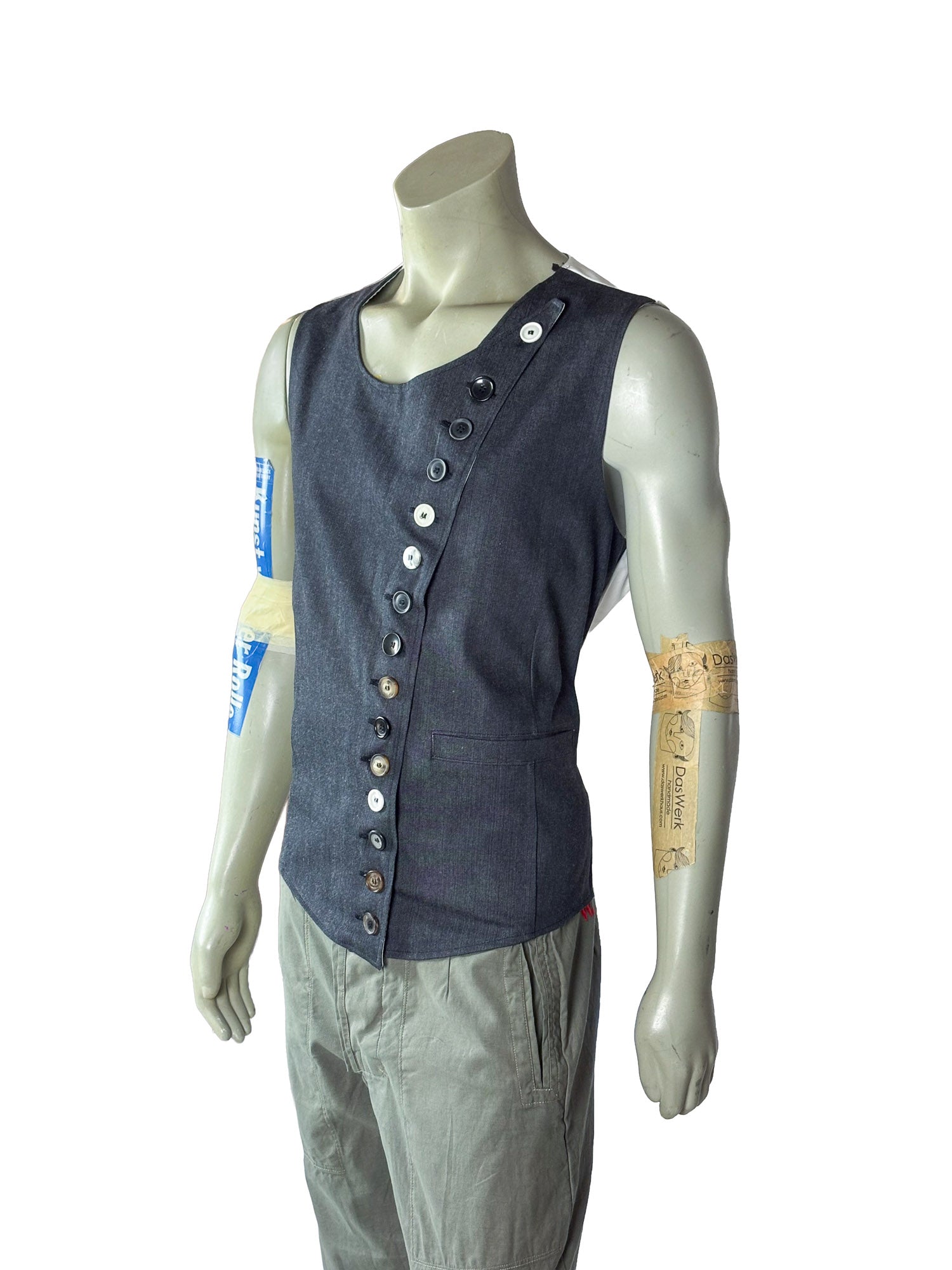 A diagonal button closure runs across the front and forms the central architectural feature of the design. The row of mixed buttons introduces subtle variation and reinforces the handcrafted character of the piece.