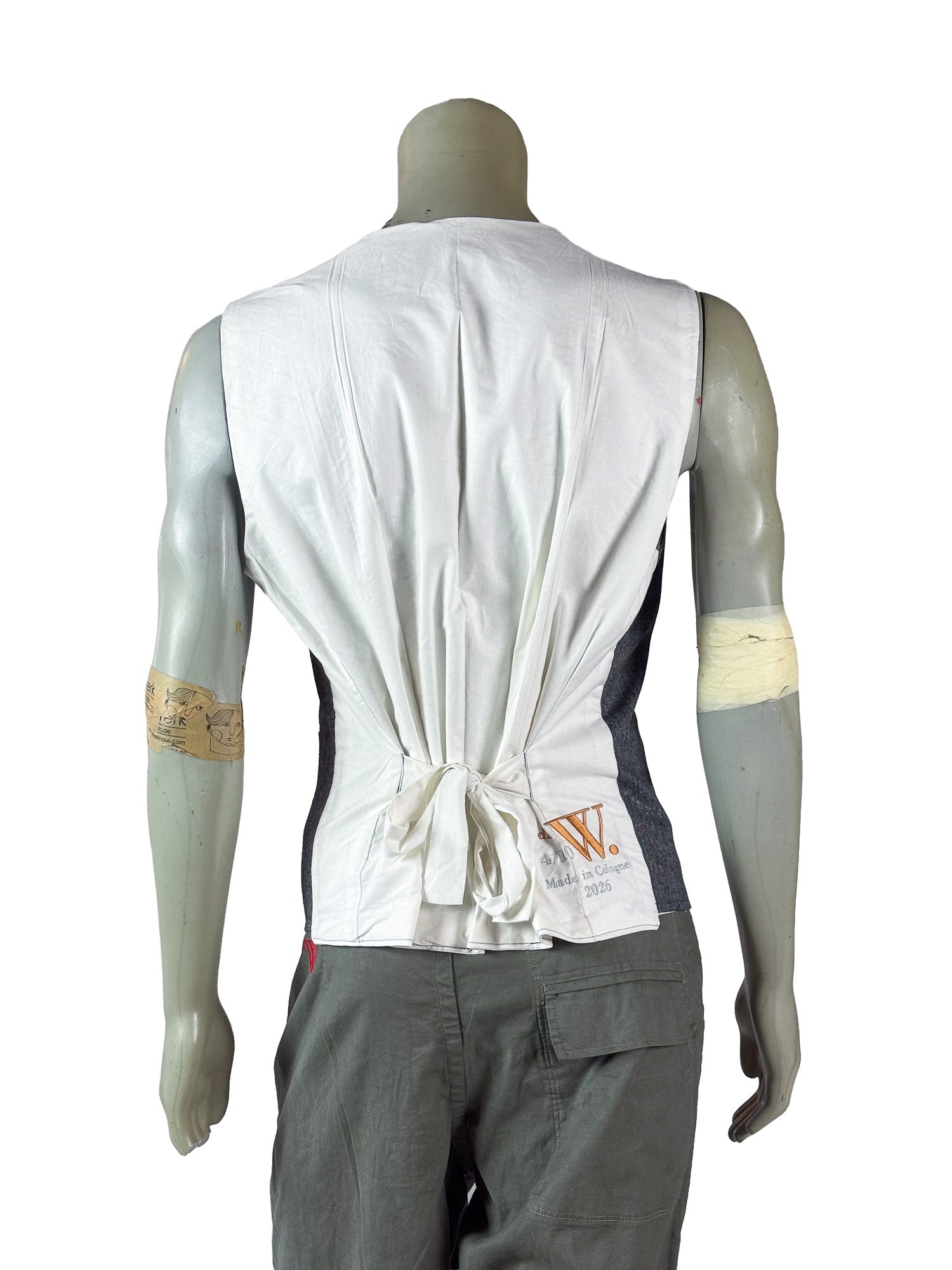 A cleanly integrated front pocket on the left side adds functionality while maintaining the minimal visual language of the piece. The back is constructed in white fabric and features an adjustable tie detail that allows the vest to be gently fitted to the body. The embroidered Das Werkhaus signature and numbering on the back identify the vest as 1 of 10 from the Core Vest Collection.