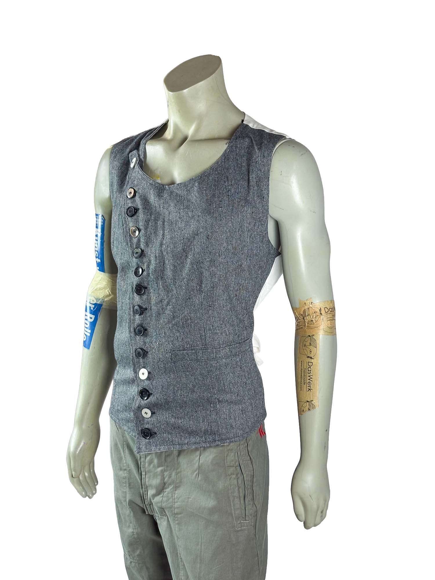 The Core Vest No. 04 continues the Core Vest series with a textured grey fabric that gives the garment a slightly more grounded and workwear-inspired character. The surface appears calm and compact, allowing the structural elements of the vest to define the visual composition. The material has a subtle depth that adds presence without becoming visually heavy.
