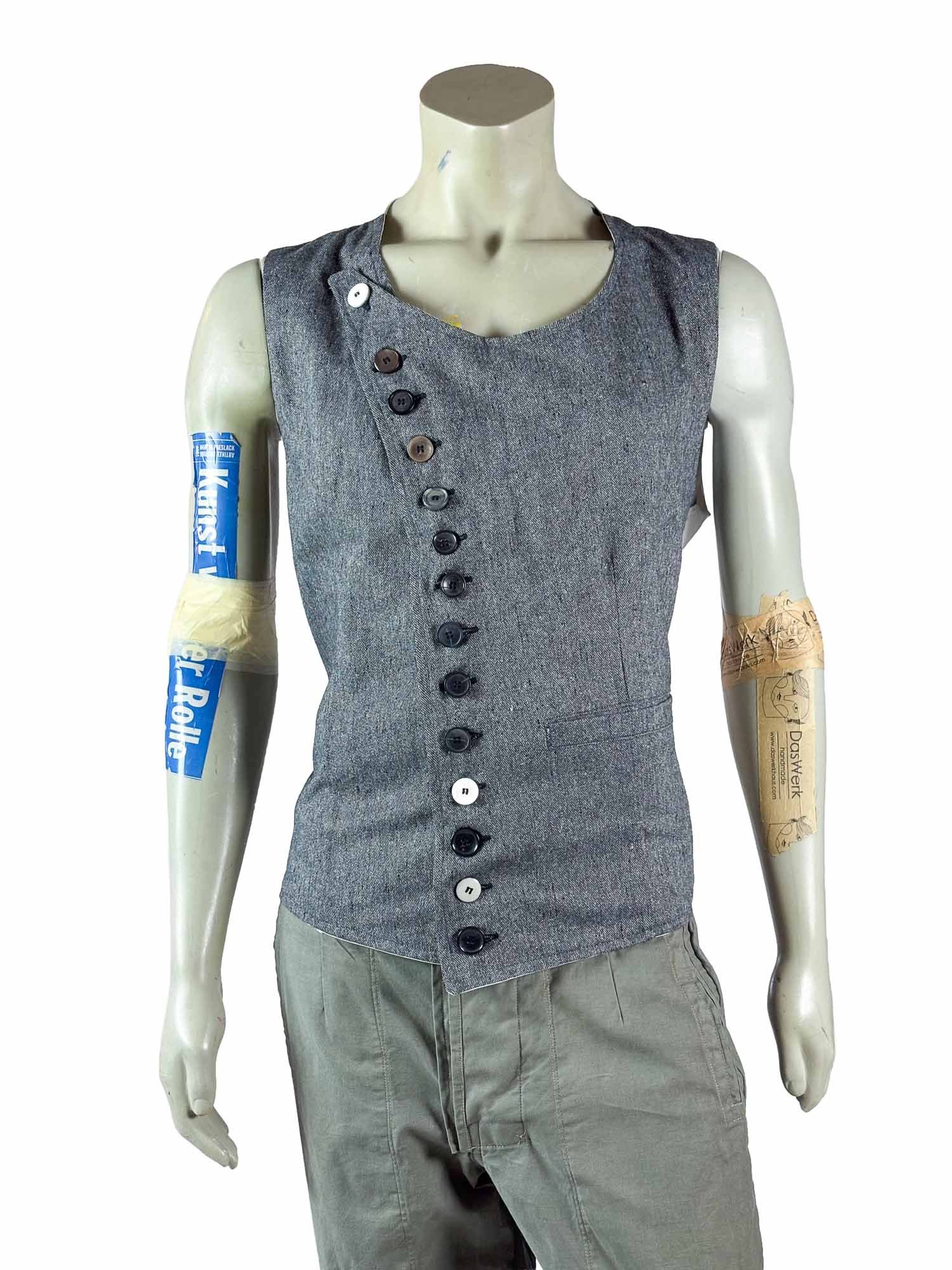 A diagonal button closure structures the front and forms the central architectural feature of the design. The row of mixed buttons introduces subtle variation in tone and texture, emphasizing the handcrafted nature of the garment.