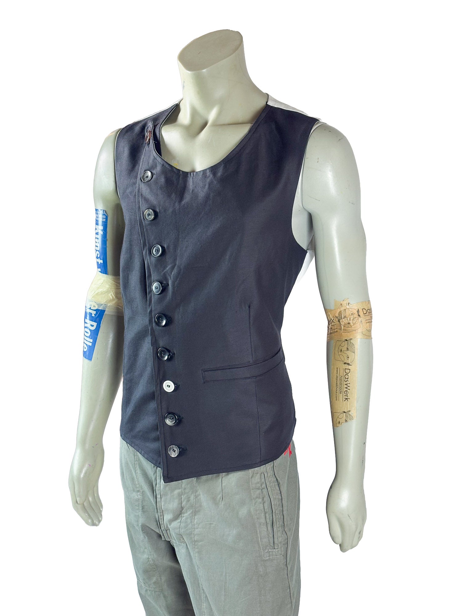 The Core Vest No. 06 continues the Core Vest series with a deep navy fabric that gives the garment a slightly stronger and more minimal visual presence. The surface is smooth and even, creating a calm foundation that allows the structural construction of the vest to stand out clearly. The darker tone adds a more composed and refined character within the collection.