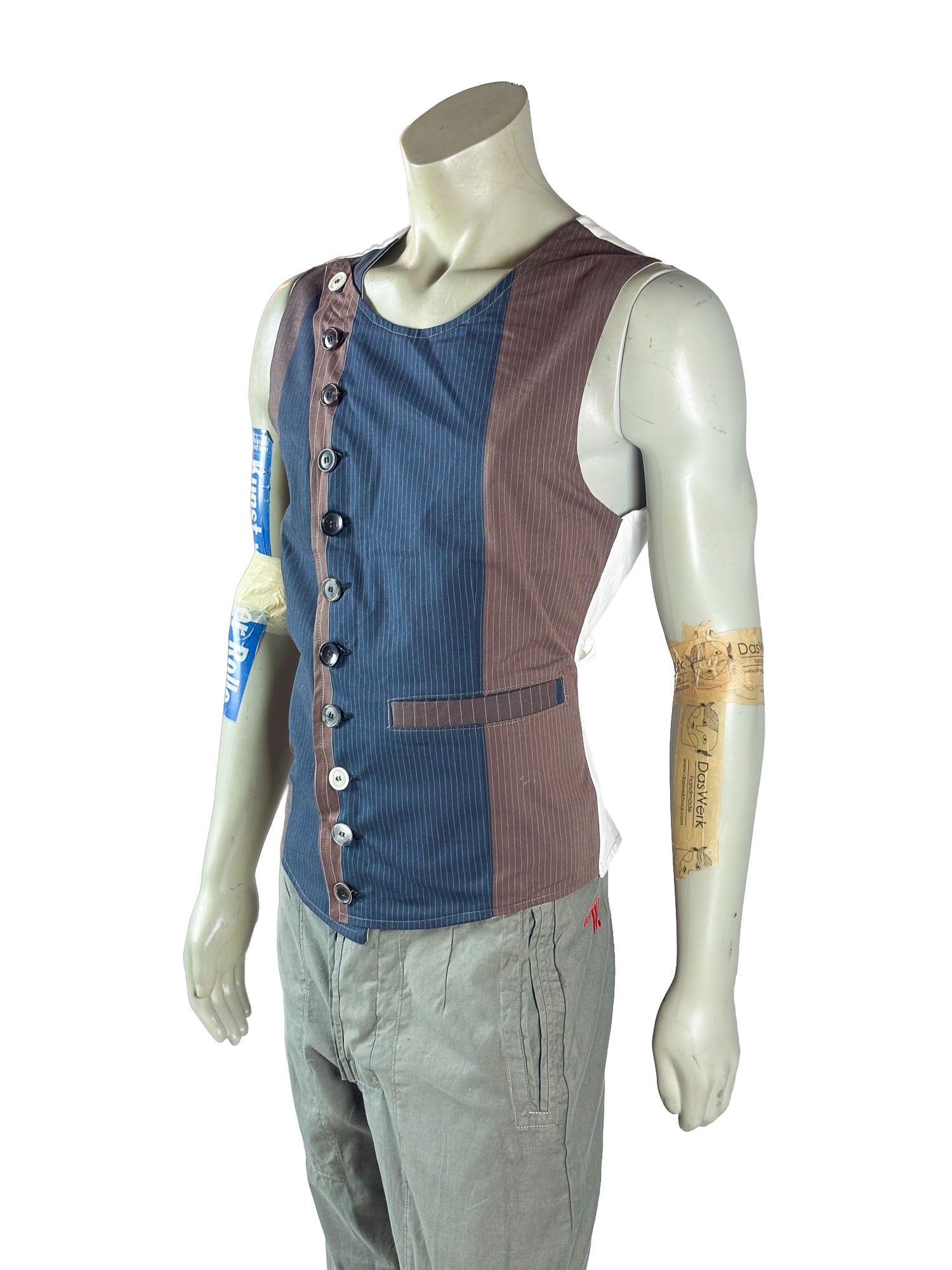 The Core Vest No. 07 continues the Core Vest series with a distinctive two-tone fabric composition that introduces a stronger visual contrast within the collection. The central blue pinstripe panel creates a structured vertical rhythm, while the contrasting brown side panels frame the silhouette and emphasize the architectural construction of the garment.