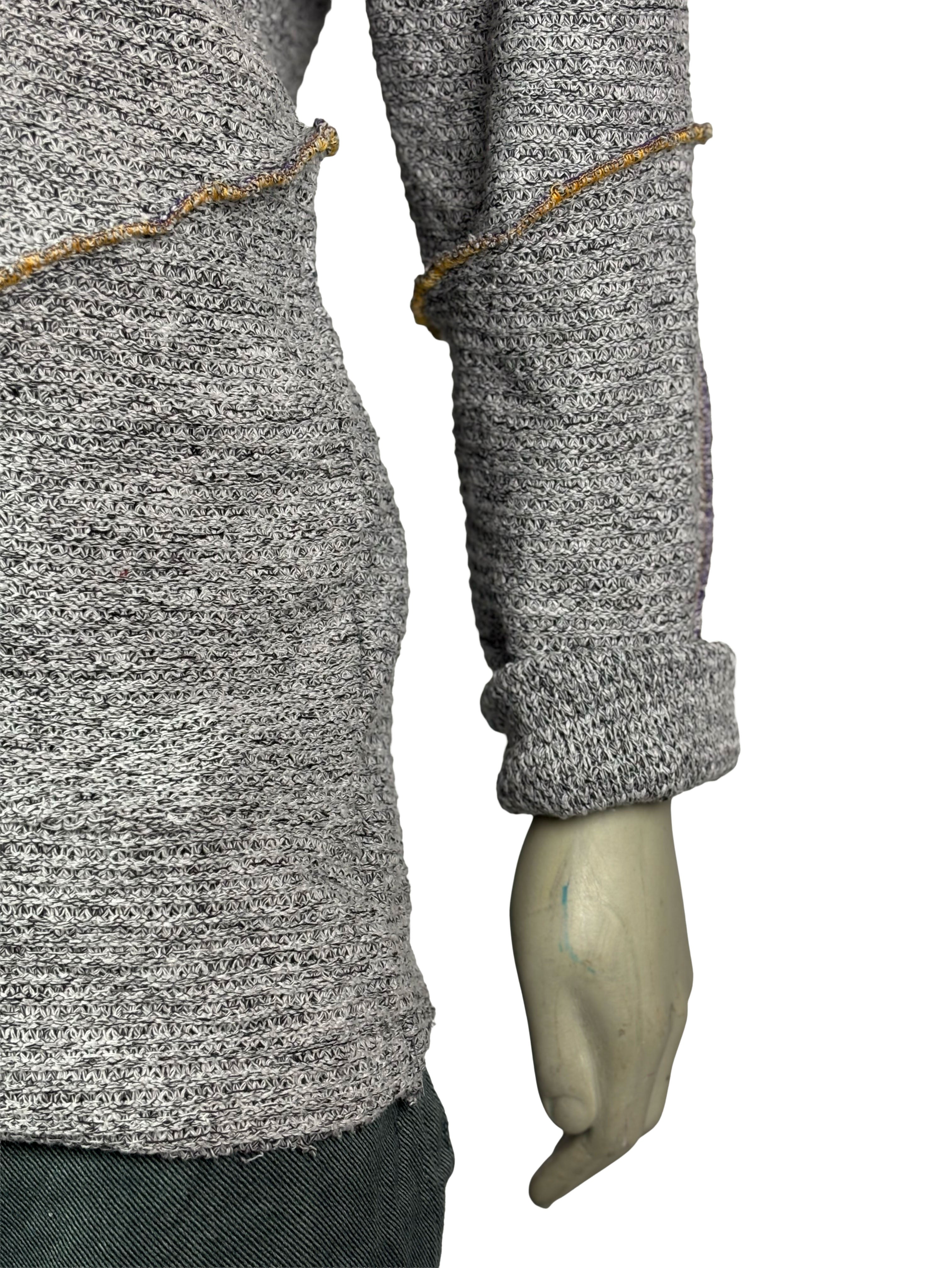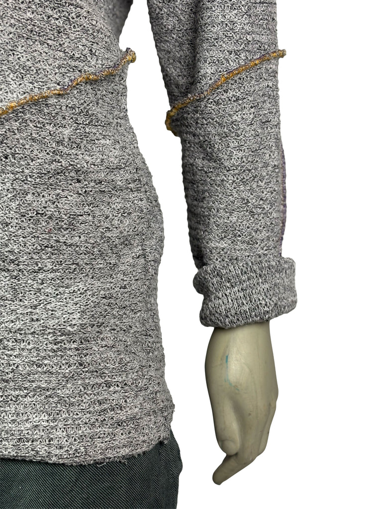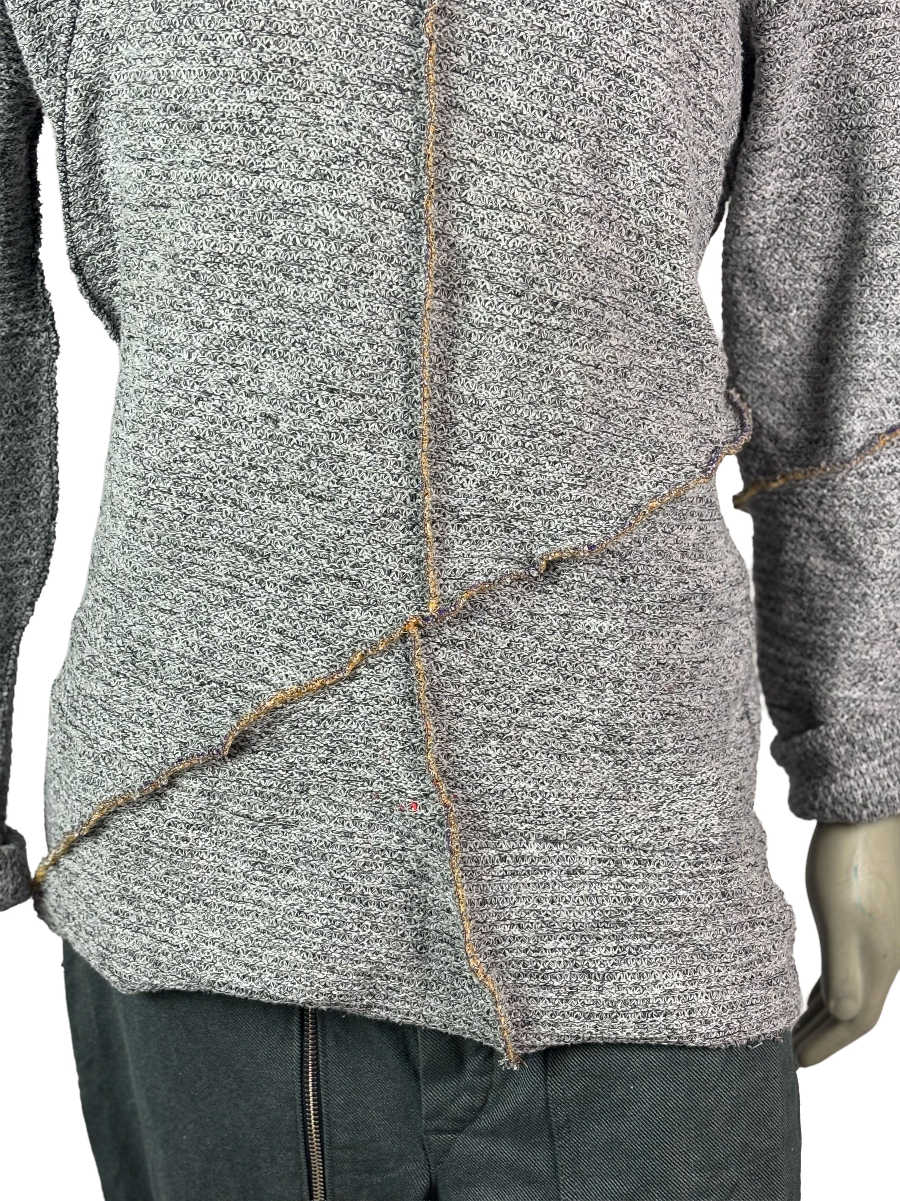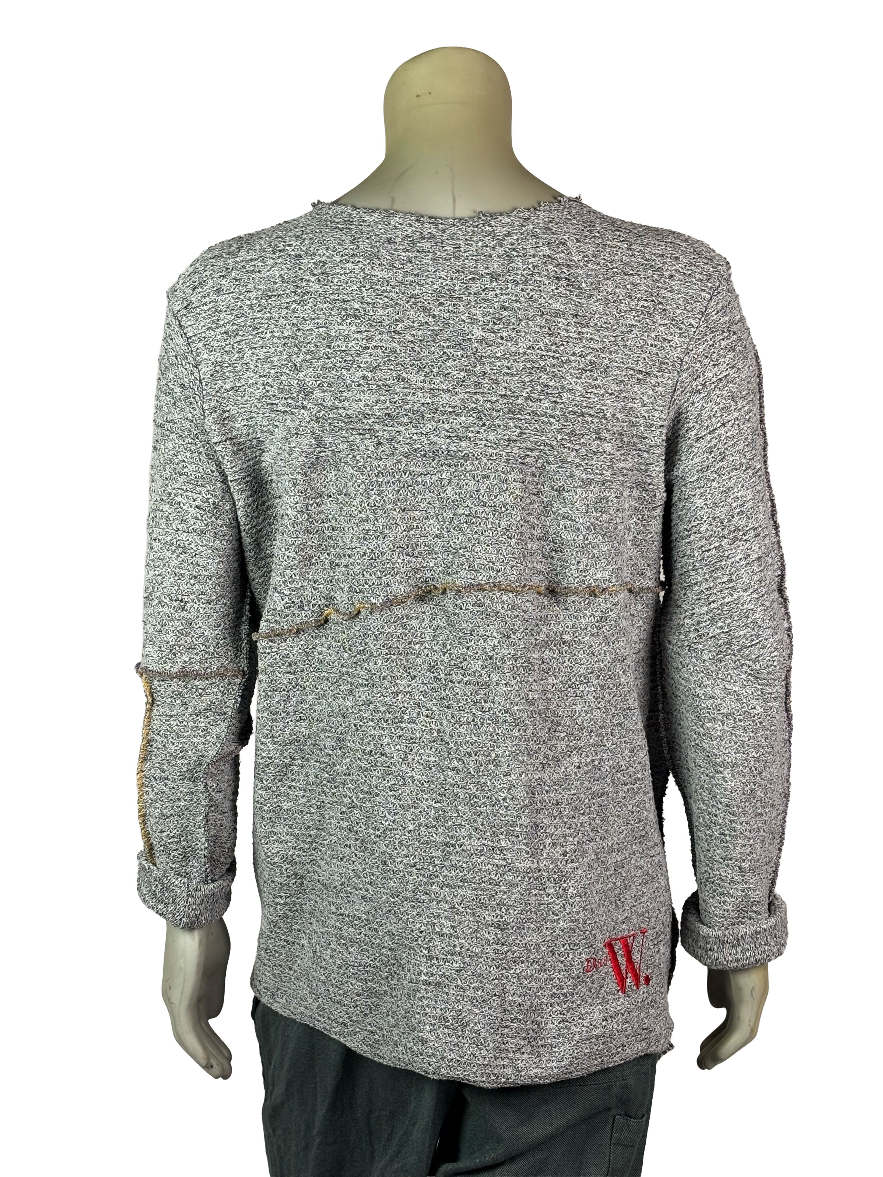 Raw edges and exposed stitching emphasize the handcrafted process, while subtle color variations add individuality within the series. With its relaxed fit and flexible material, the sweater offers both ease of movement and a contemporary, experimental look.