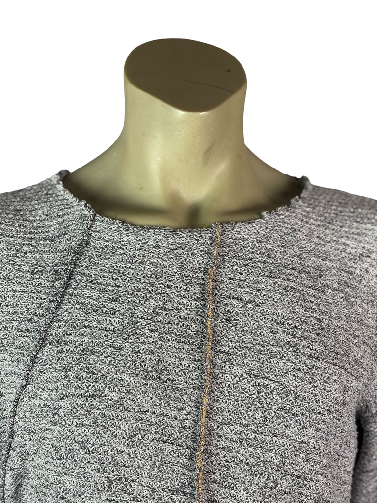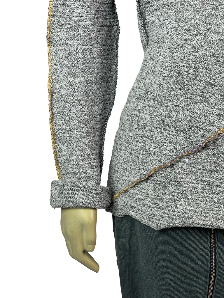 Crafted from a soft, stretchable knit fabric, this sweater combines comfort with distinctive design. The use of an overlock machine creates bold seam patterns across the surface, giving each piece its own rhythm and structure.