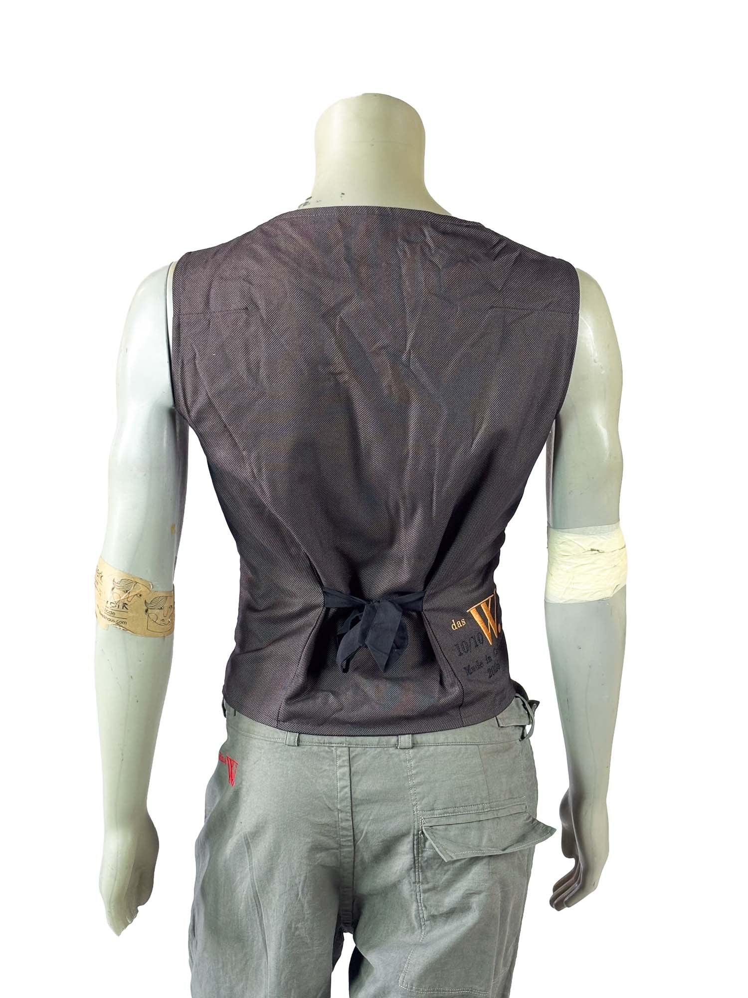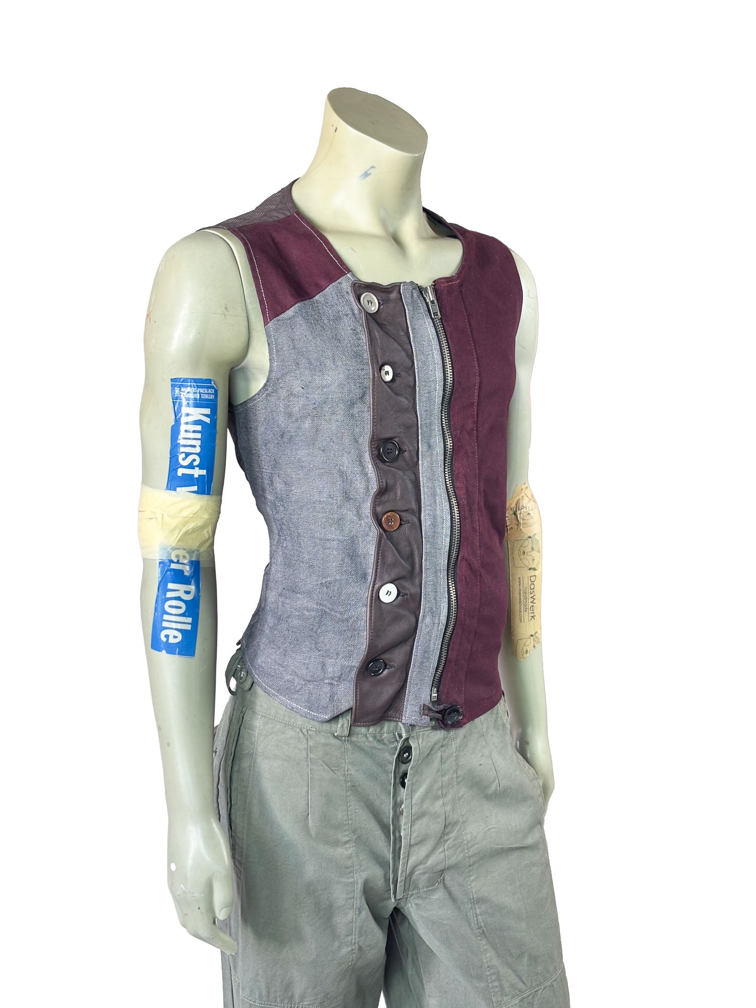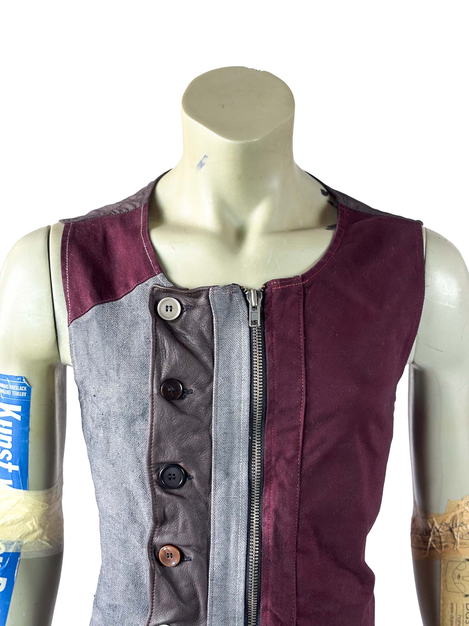 The historic textile — originally produced before the fall of the Berlin Wall — gives the vest its dense texture and subtle irregular surface. The vertical leather center panel introduces architectural contrast and tactile depth, reinforced by individually selected buttons and a concealed zipper closure.