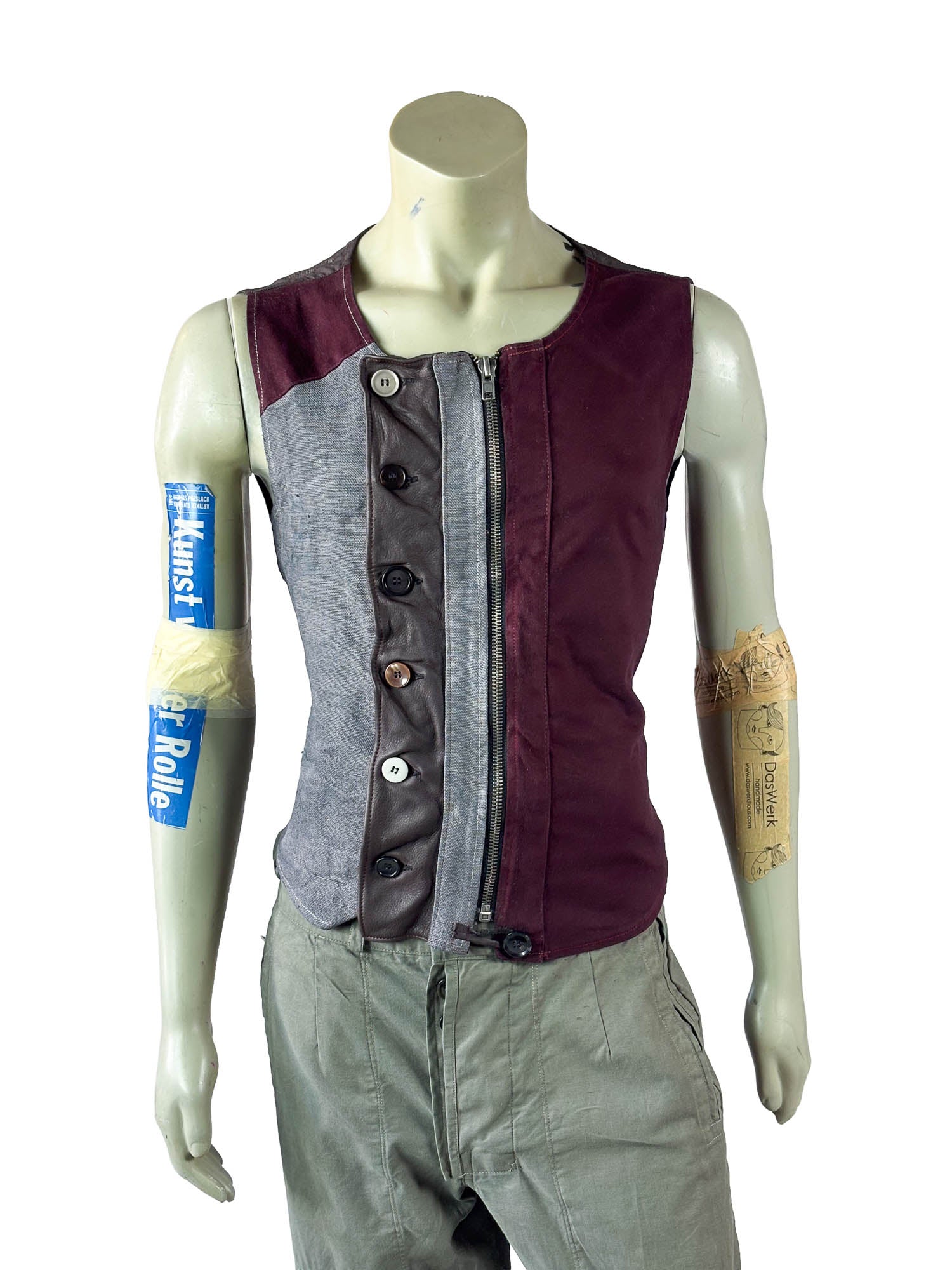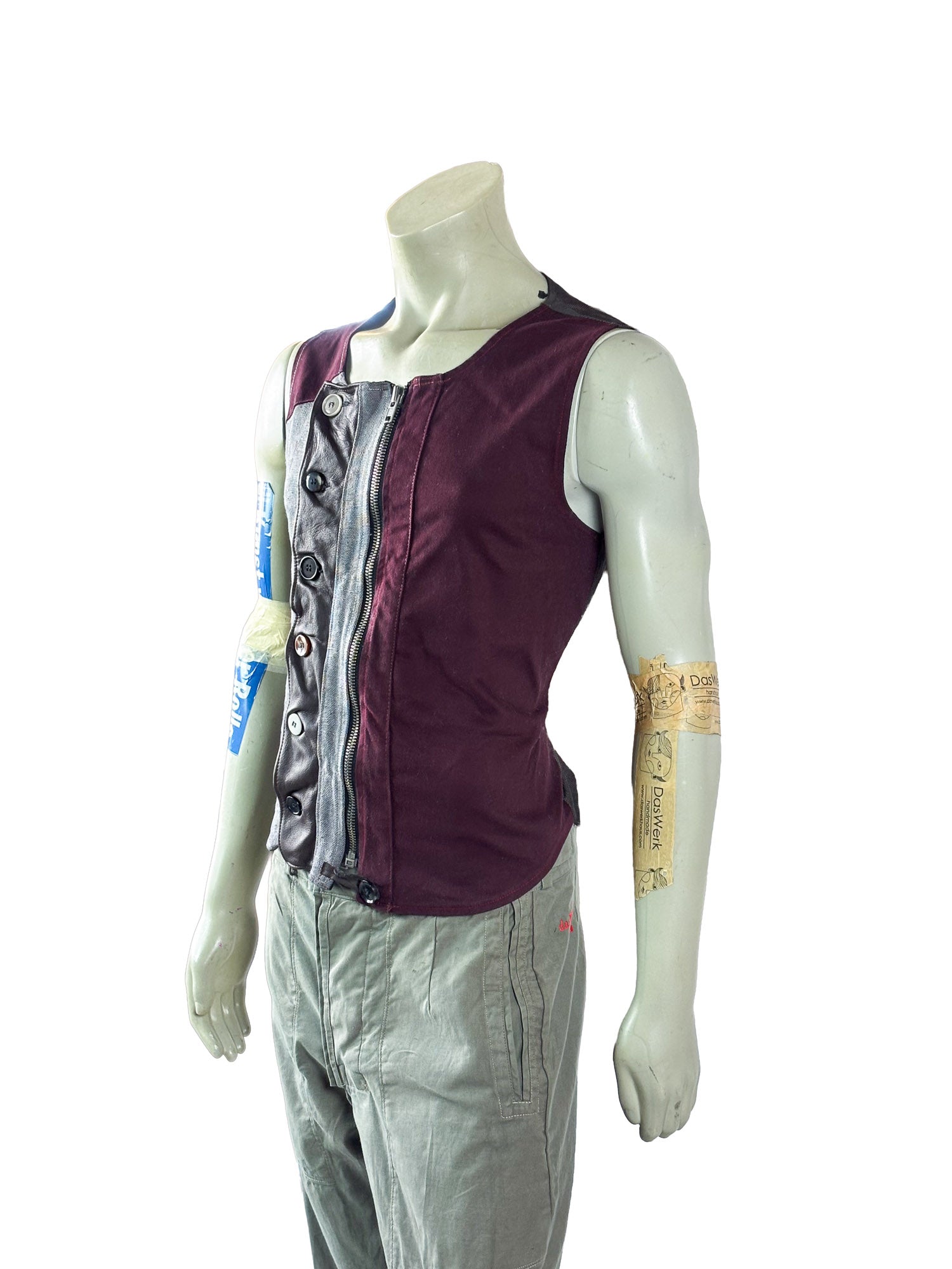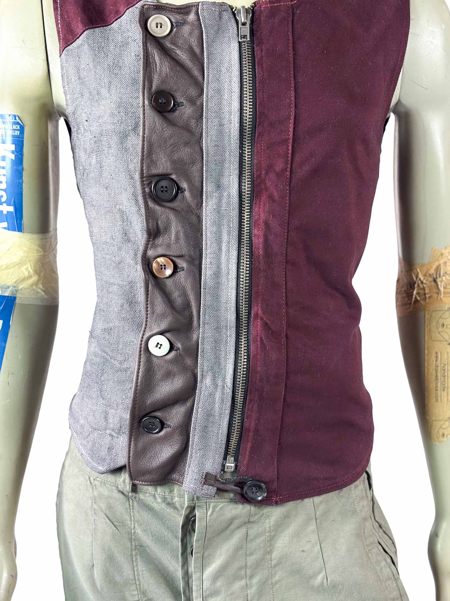 This piece features a strong color dialogue: muted grey post sack fabric on one side, deep burgundy paneling on the other. The tonal tension gives Vest No. 10 a slightly more dramatic presence compared to earlier pieces in the series.