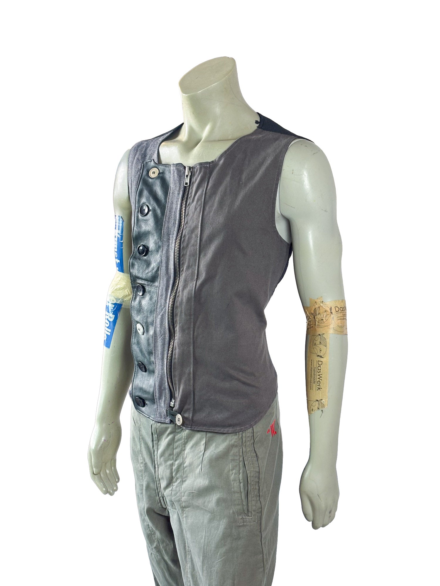 The back is constructed in a solid, dark fabric and finished with adjustable ties, allowing the silhouette to shift between a relaxed or more defined fit. The vest remains lightweight and structured, designed for layering while maintaining presence as a standalone piece.
