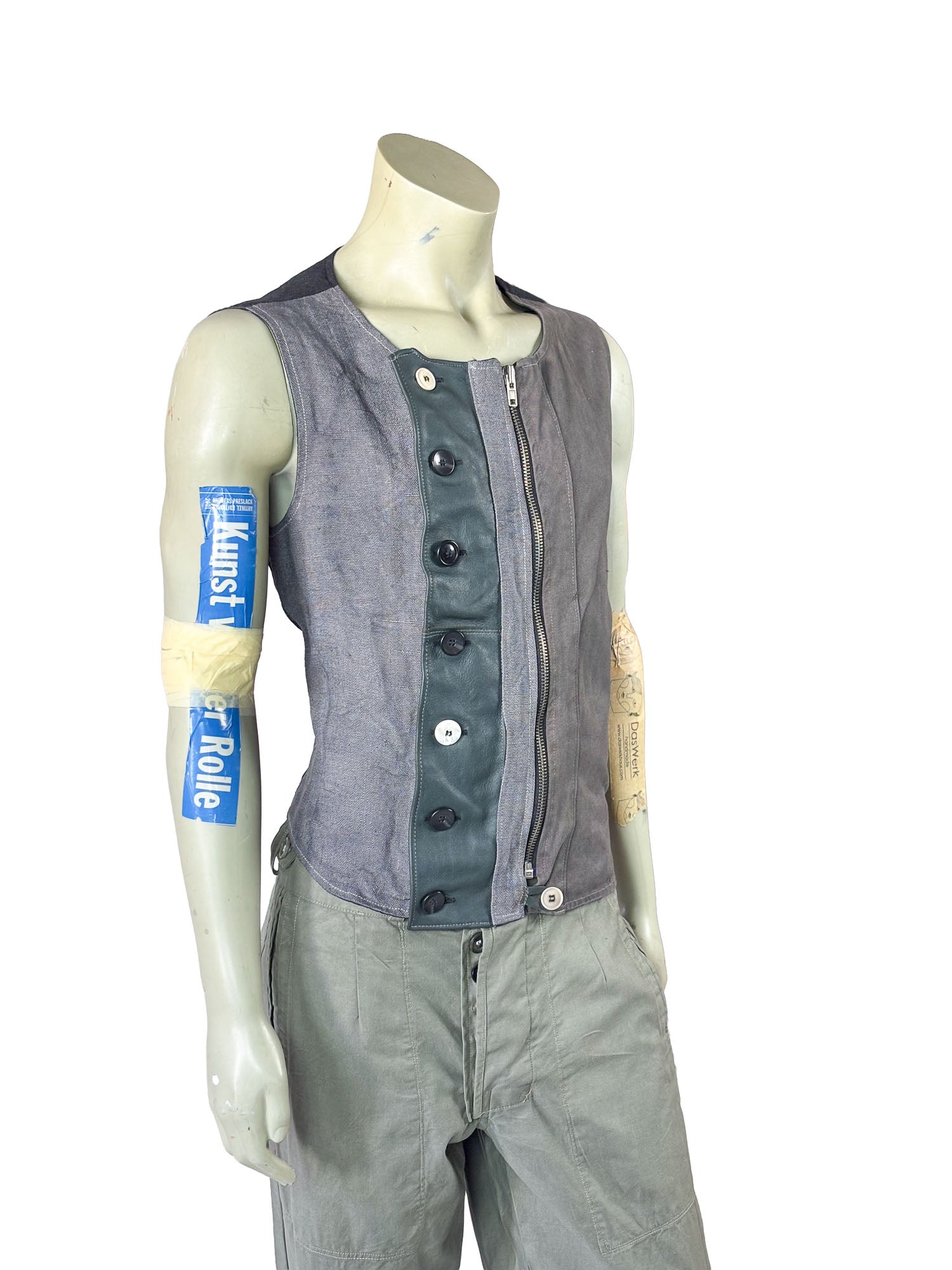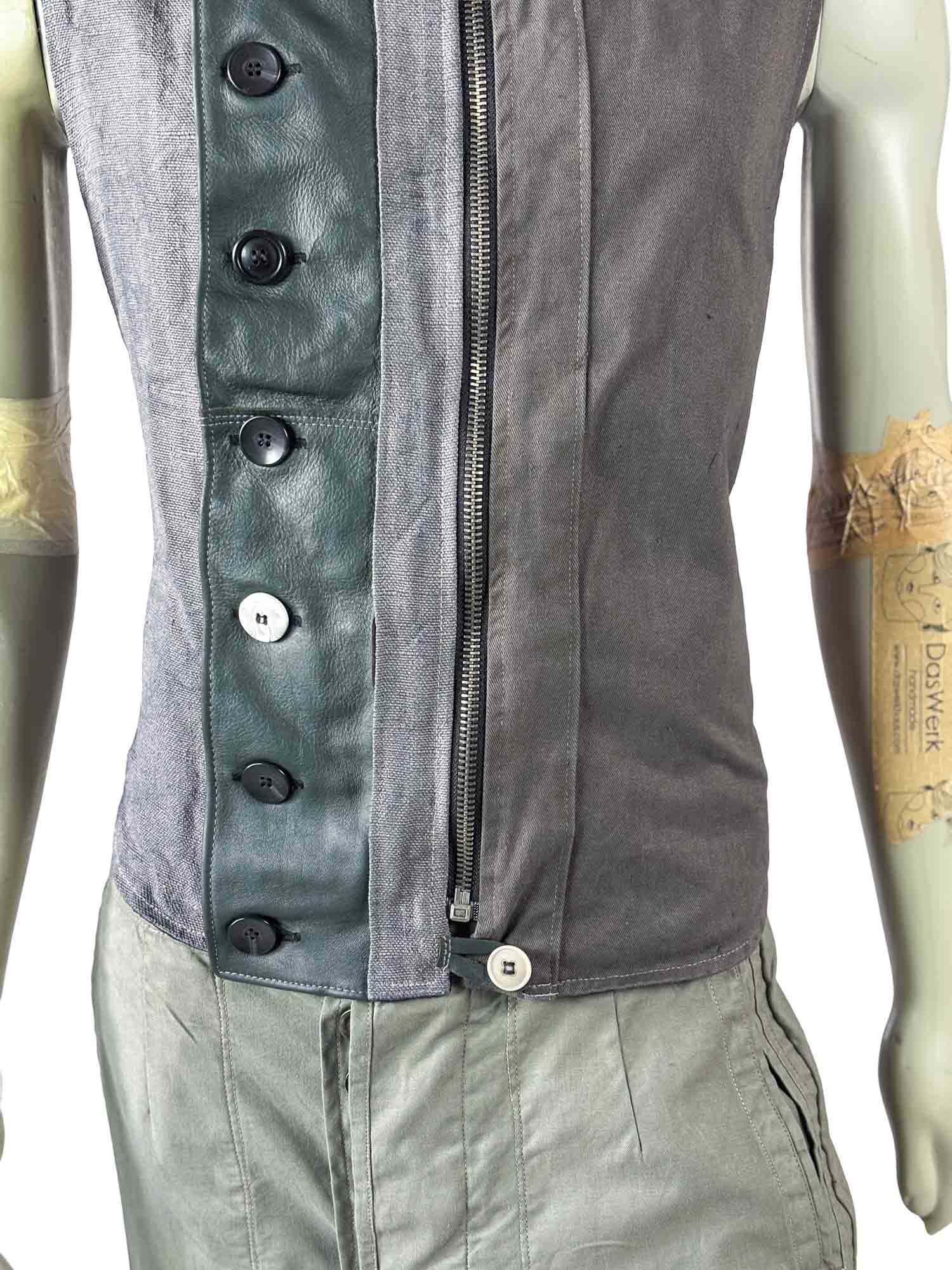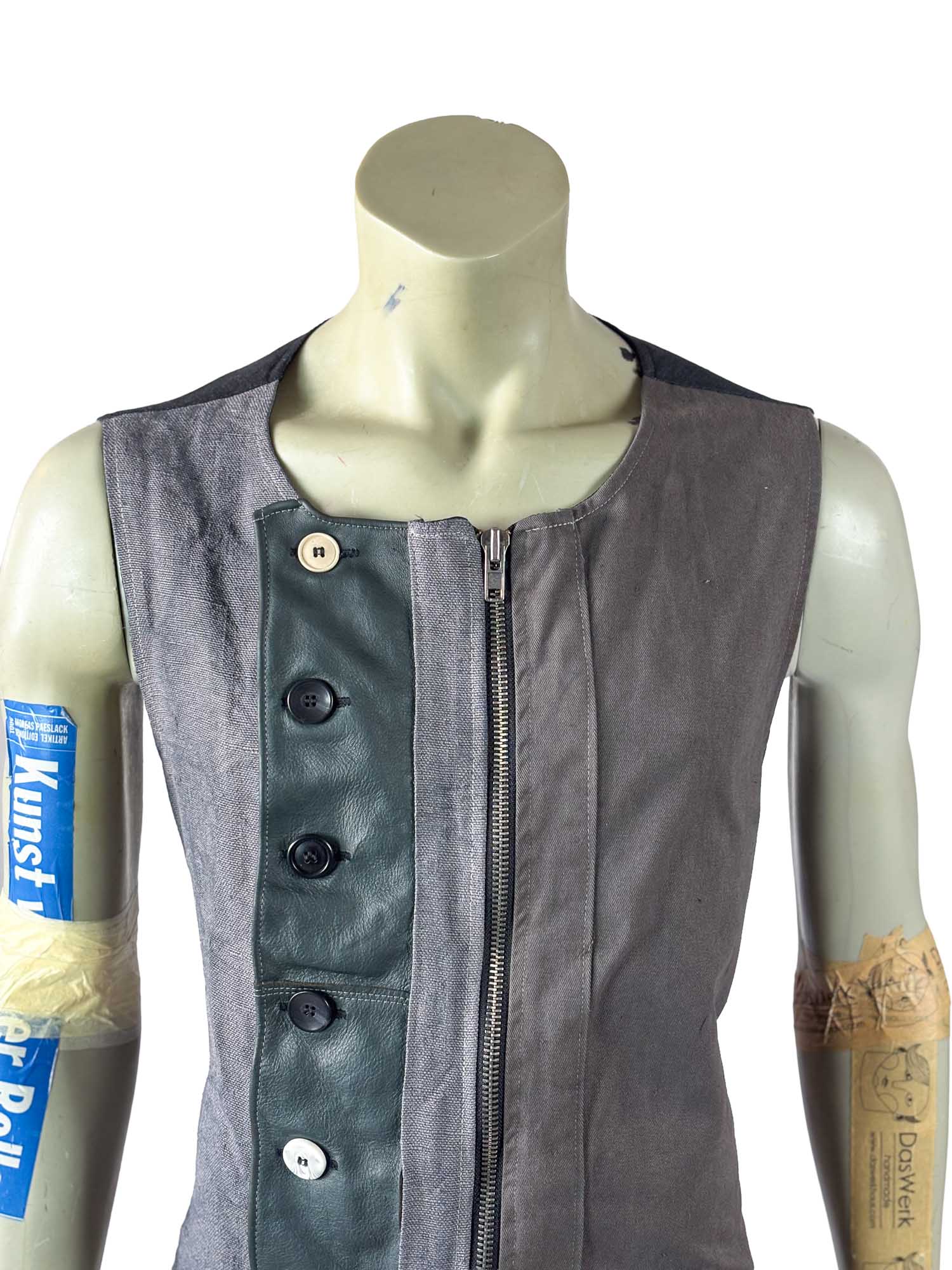 The Grainline Vest No. 03 of 10 continues the limited series of ten handcrafted pieces, combining historic post sack textile with a vertical washable leather insert. The original fabric — produced before the fall of the Berlin Wall — forms the structural base of the vest and retains its natural texture and density.