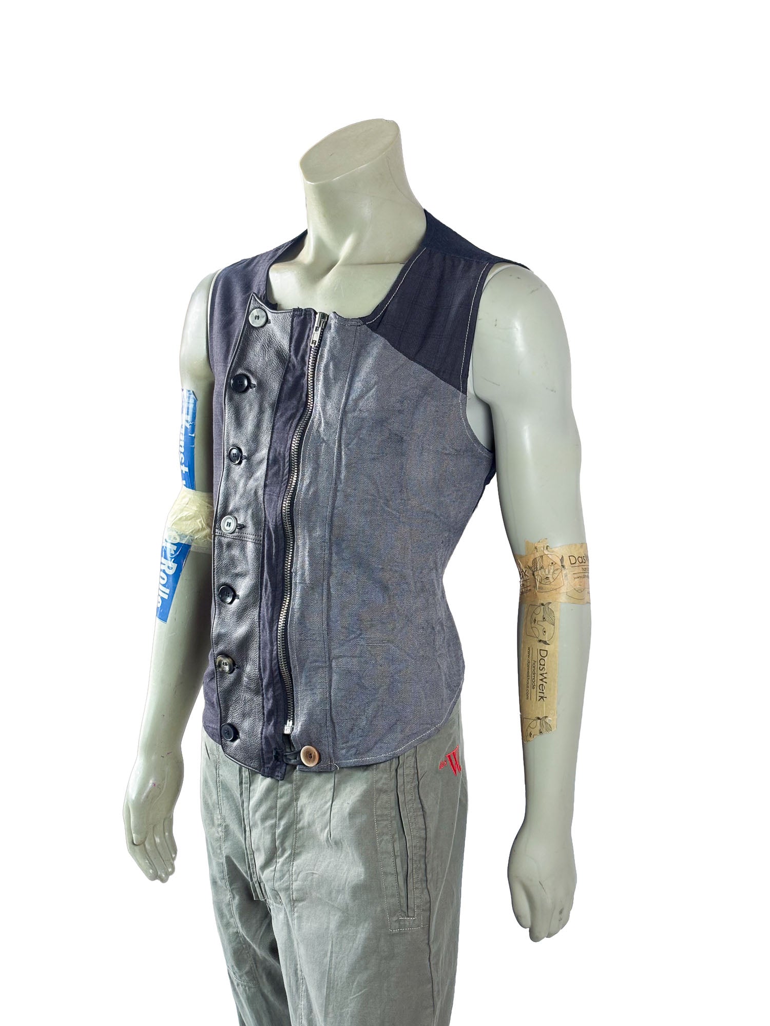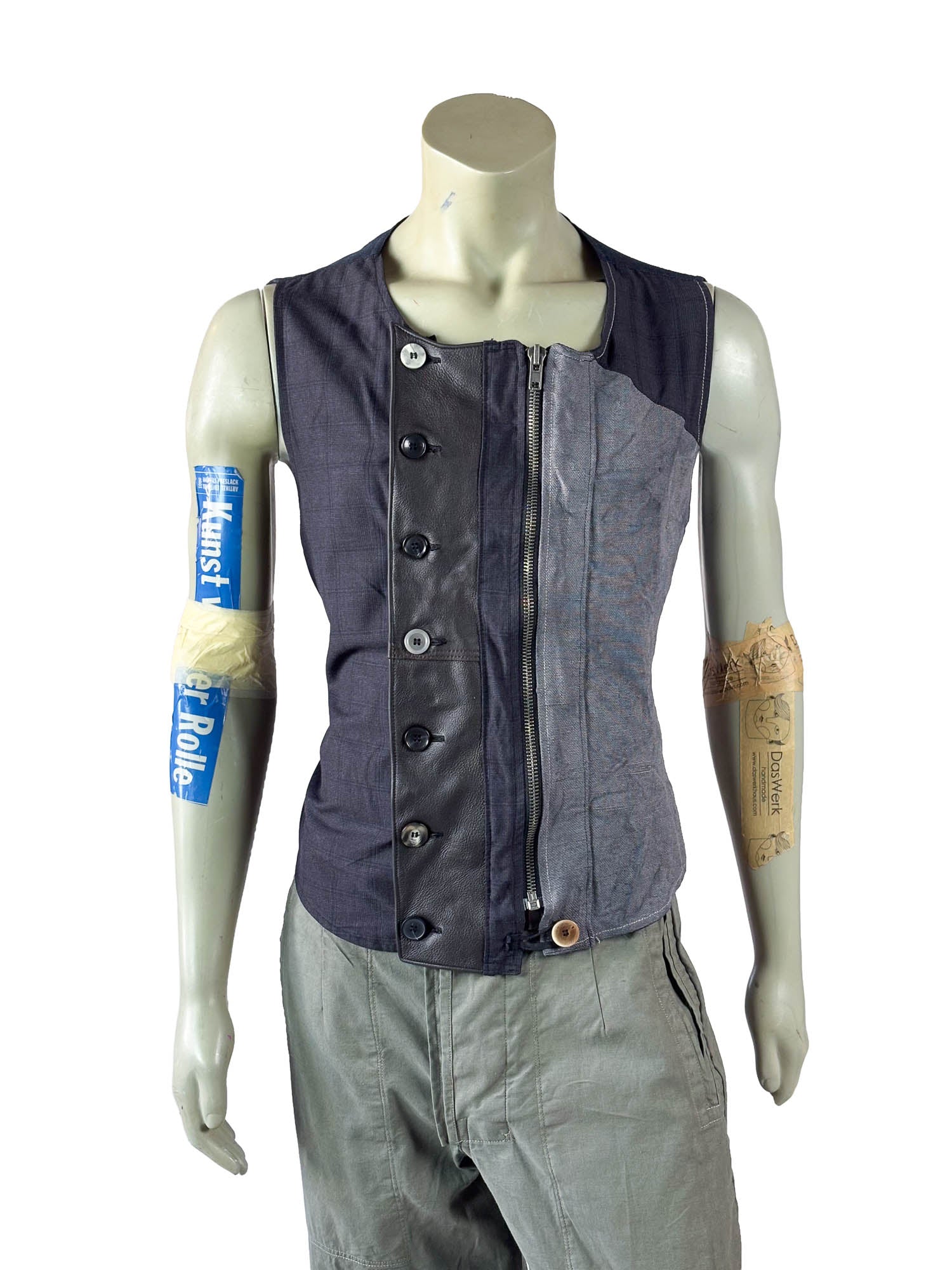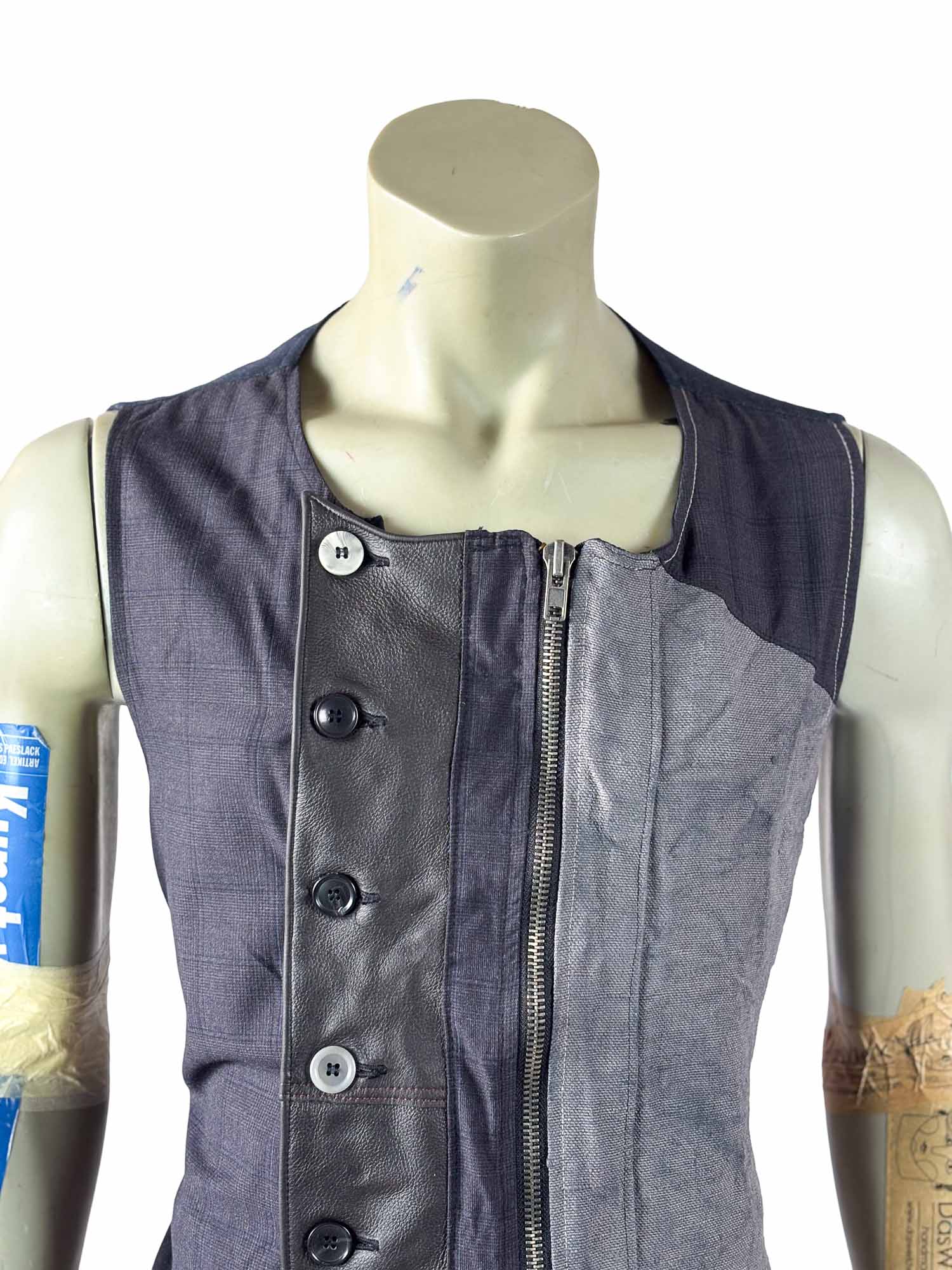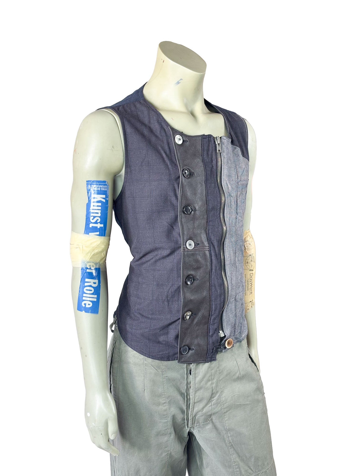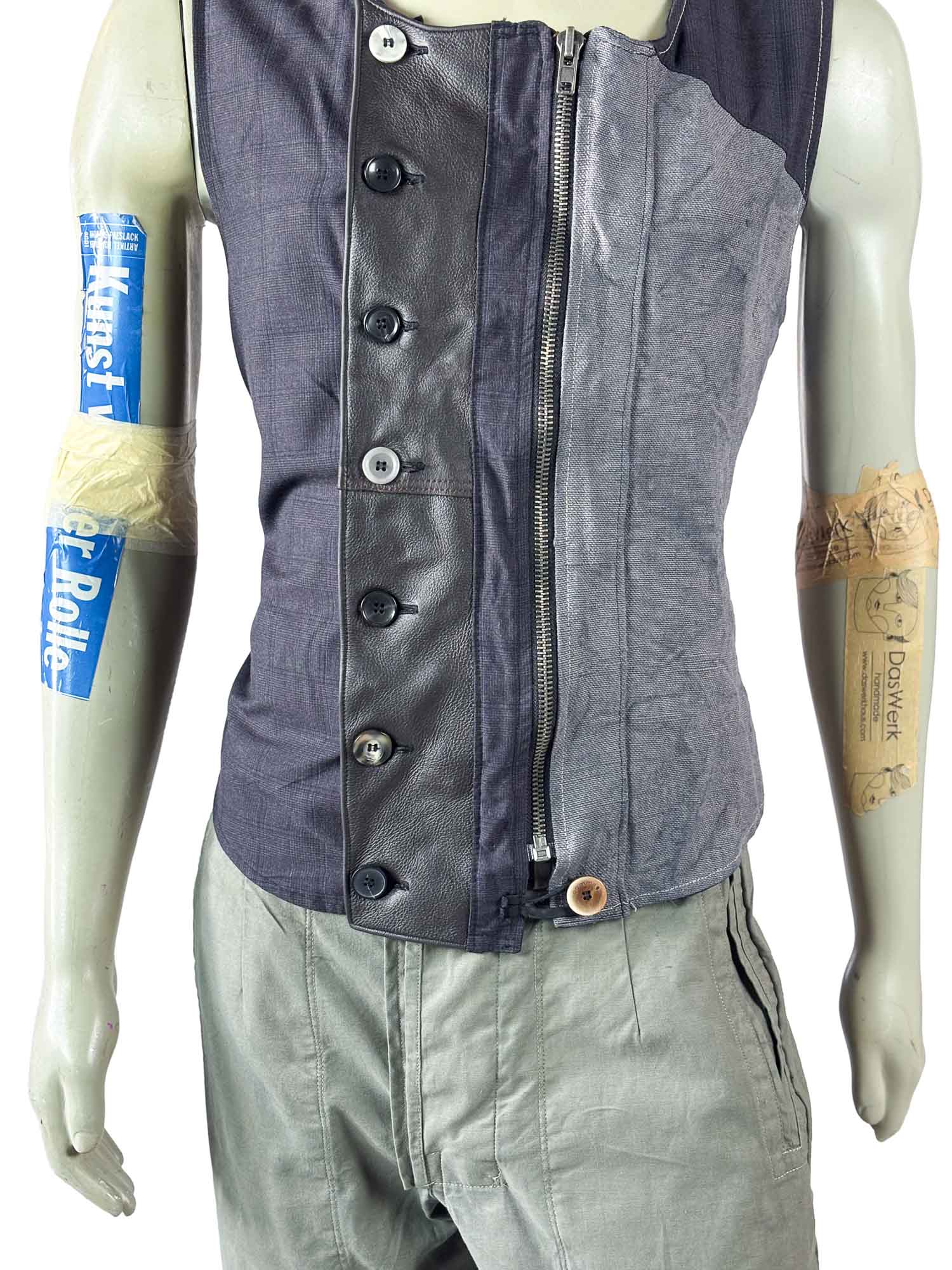 A vertical washable leather panel forms the central axis of the design, creating a strong architectural contrast against the reclaimed fabric. Individually selected buttons emphasize the artisanal construction, while a concealed zipper closure ensures practical wearability and a clean front silhouette.