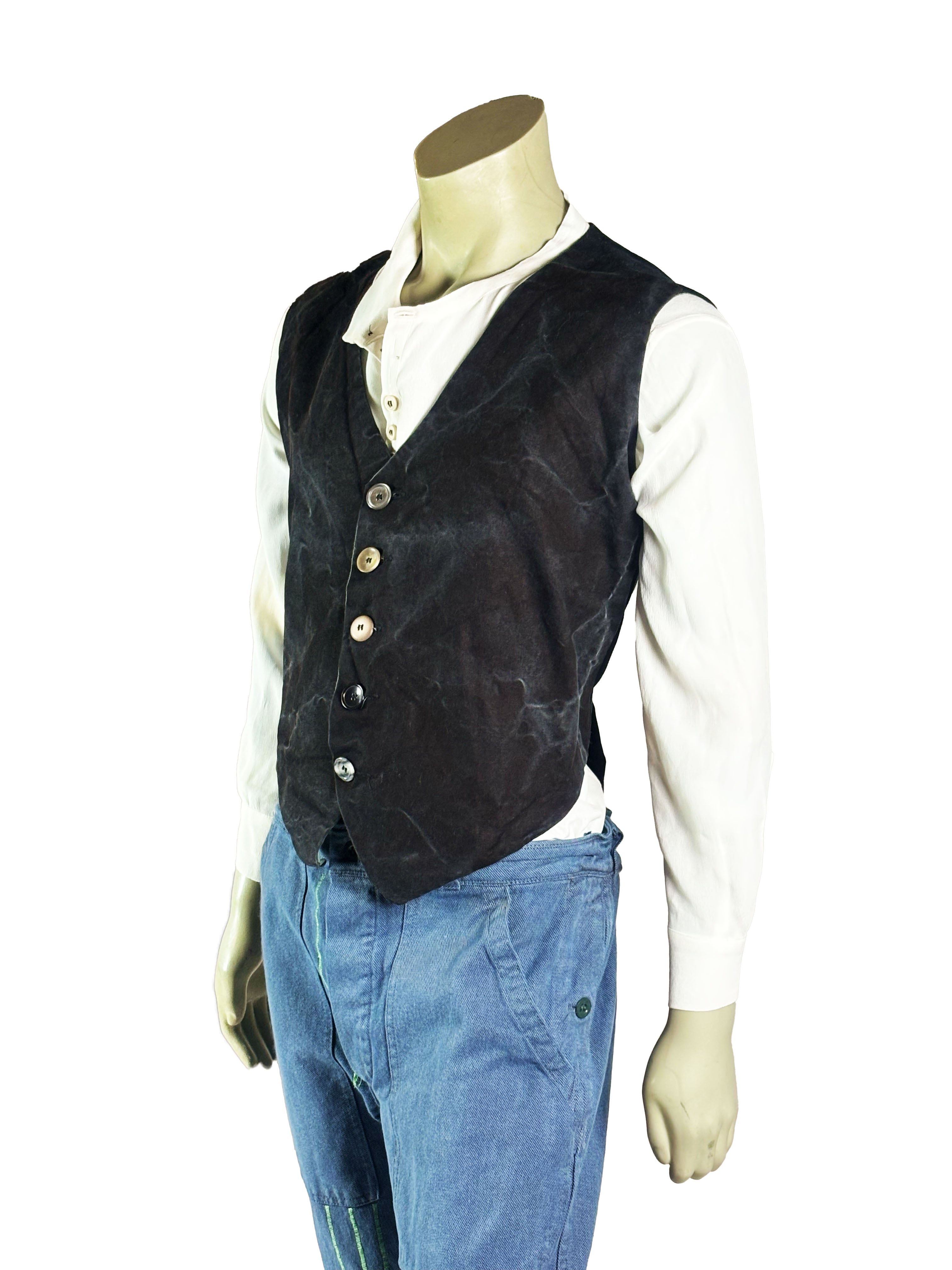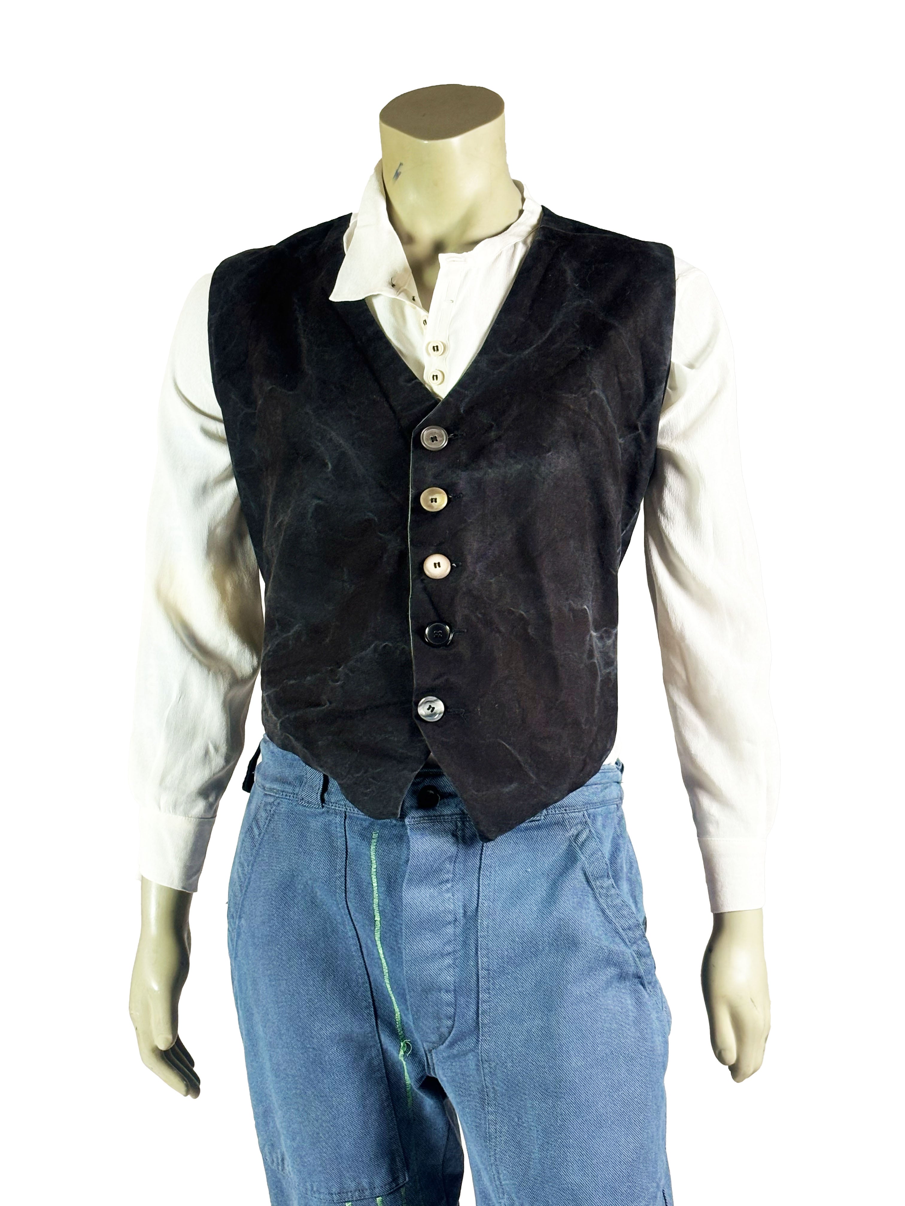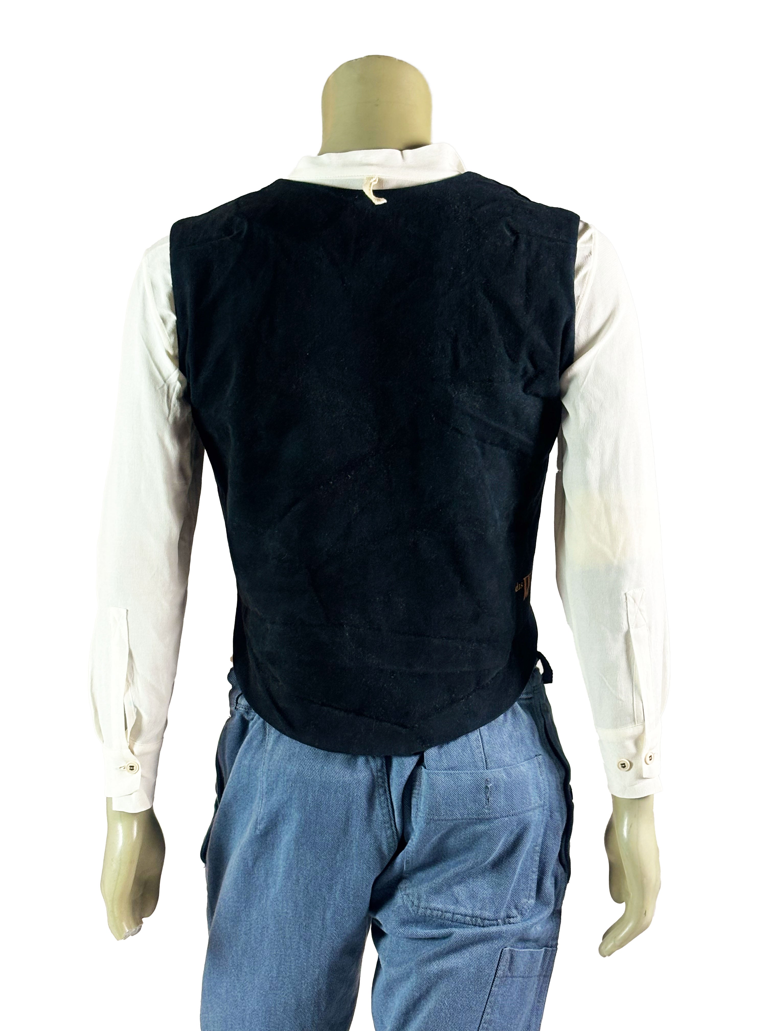 The construction varies subtly from vest to vest, featuring asymmetrical paneling, mixed materials and distinctive button arrangements. Some designs incorporate contrasting sections or historical decorative textiles, while others remain more reduced and utilitarian in appearance. Visible seams, layered edges and traces of previous use emphasize the handmade process and underline the authenticity of the garment.
