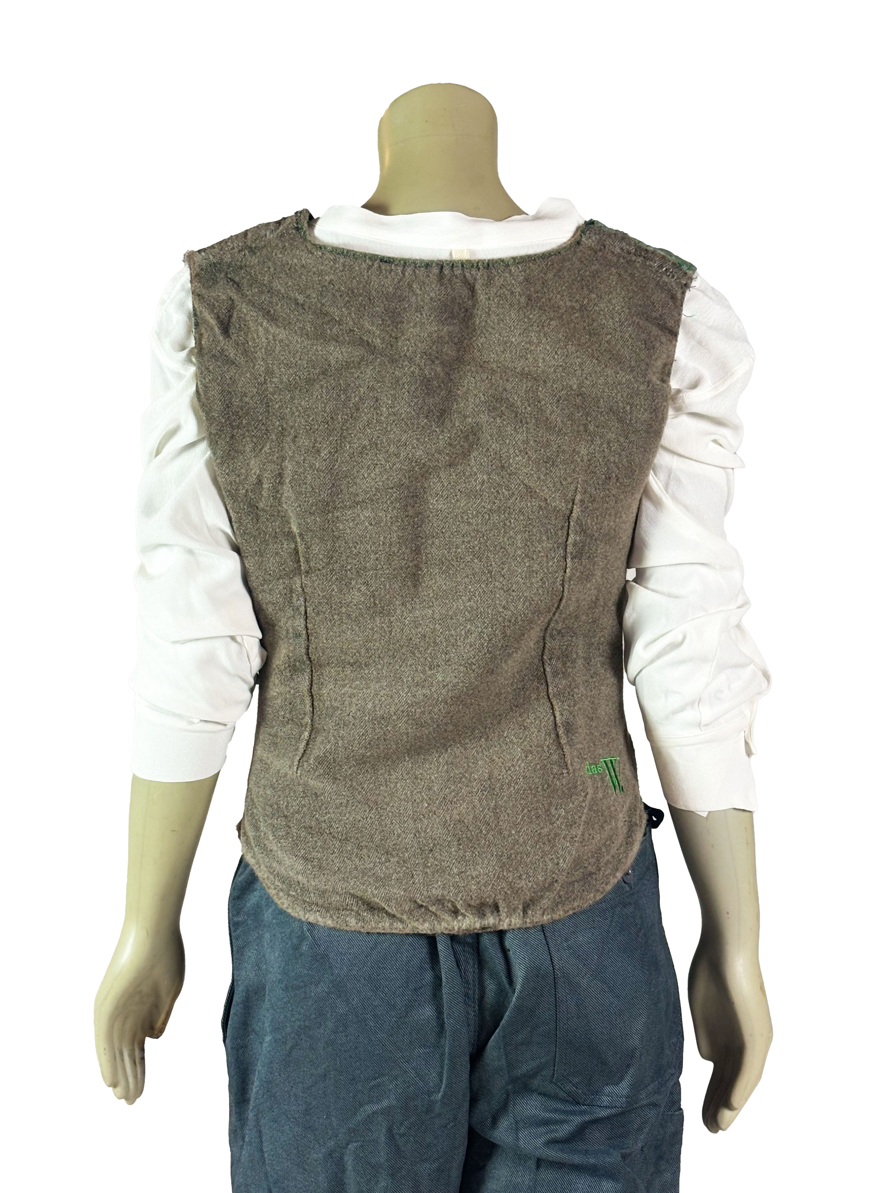 The construction varies subtly from vest to vest, featuring asymmetrical paneling, mixed materials and distinctive button arrangements. Some designs incorporate contrasting sections or historical decorative textiles, while others remain more reduced and utilitarian in appearance. Visible seams, layered edges and traces of previous use emphasize the handmade process and underline the authenticity of the garment.