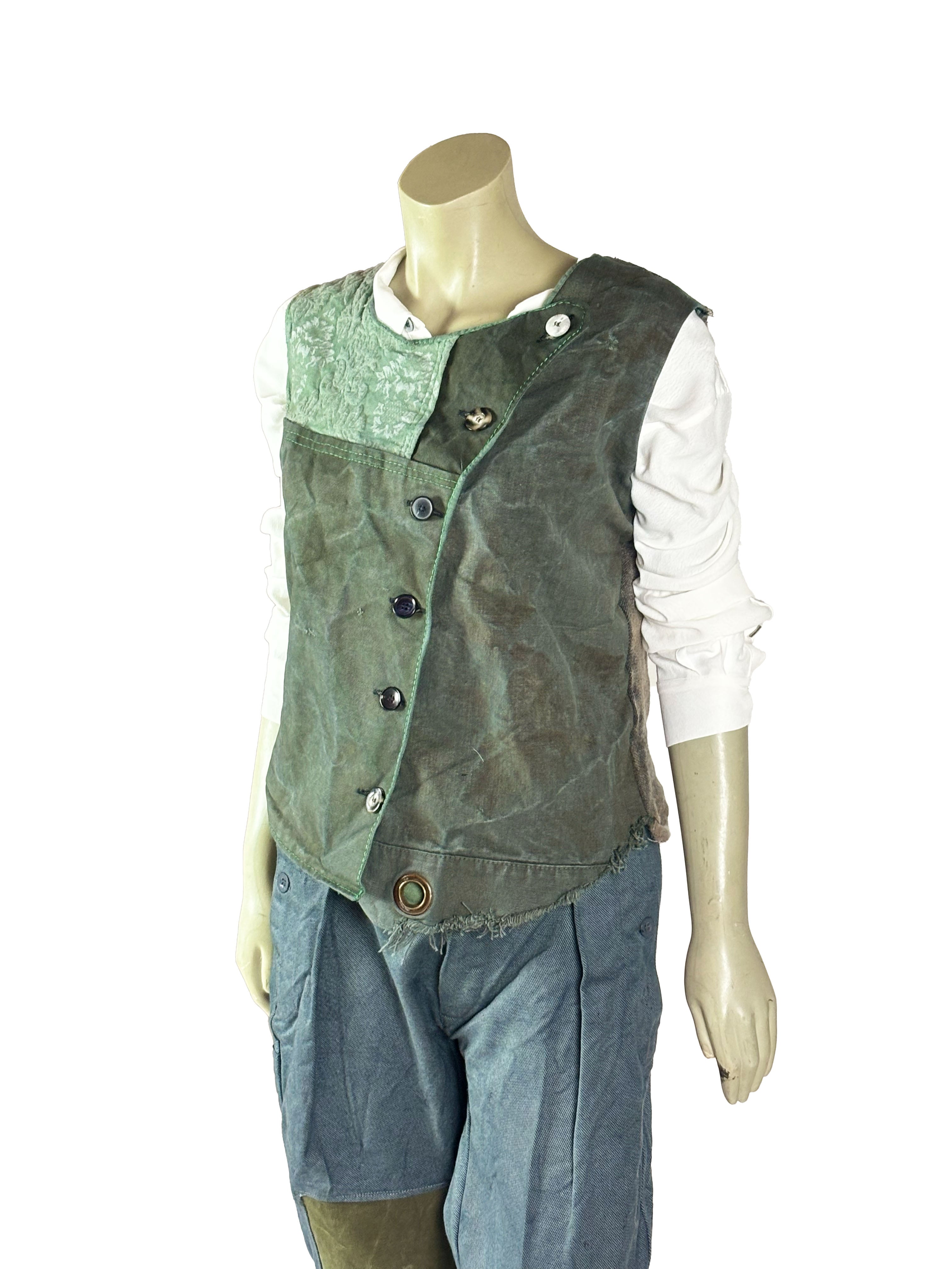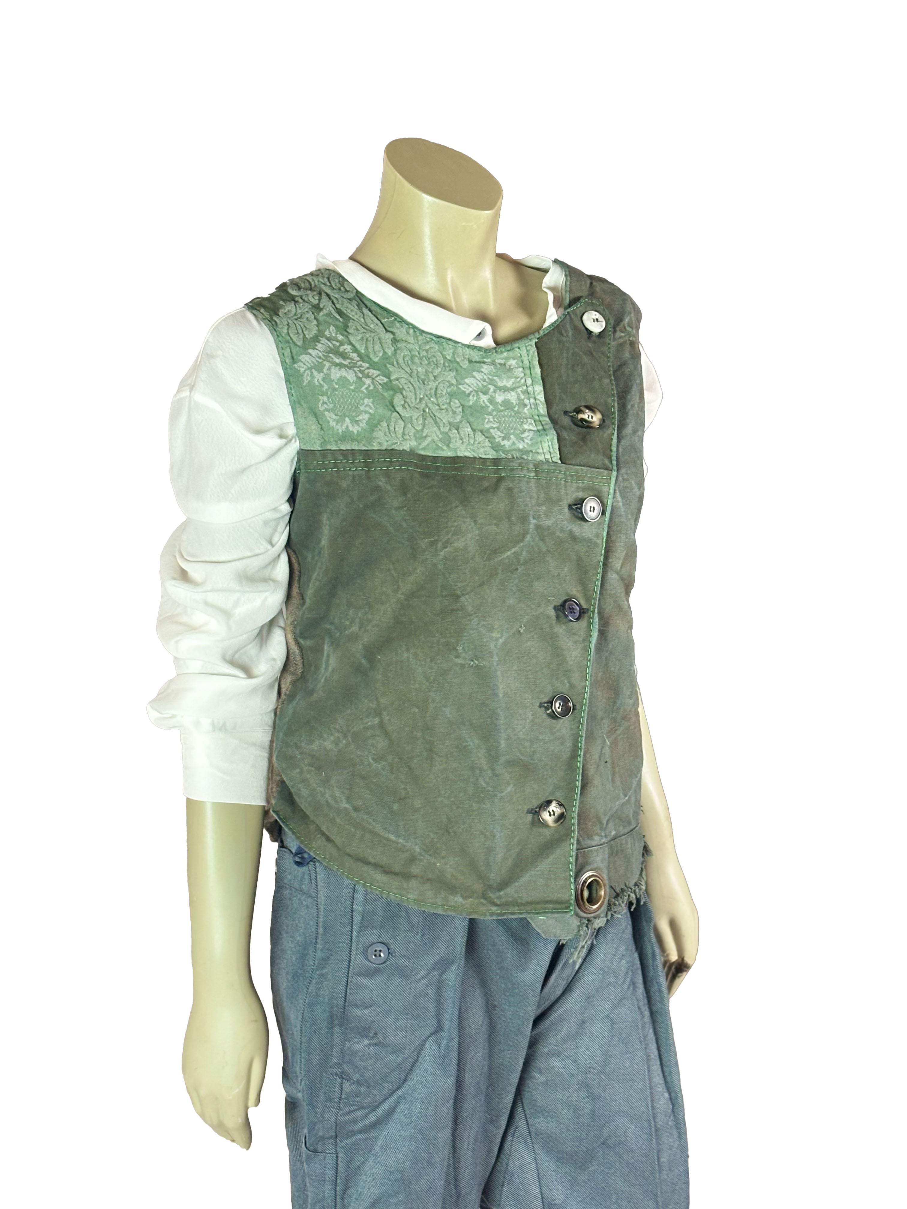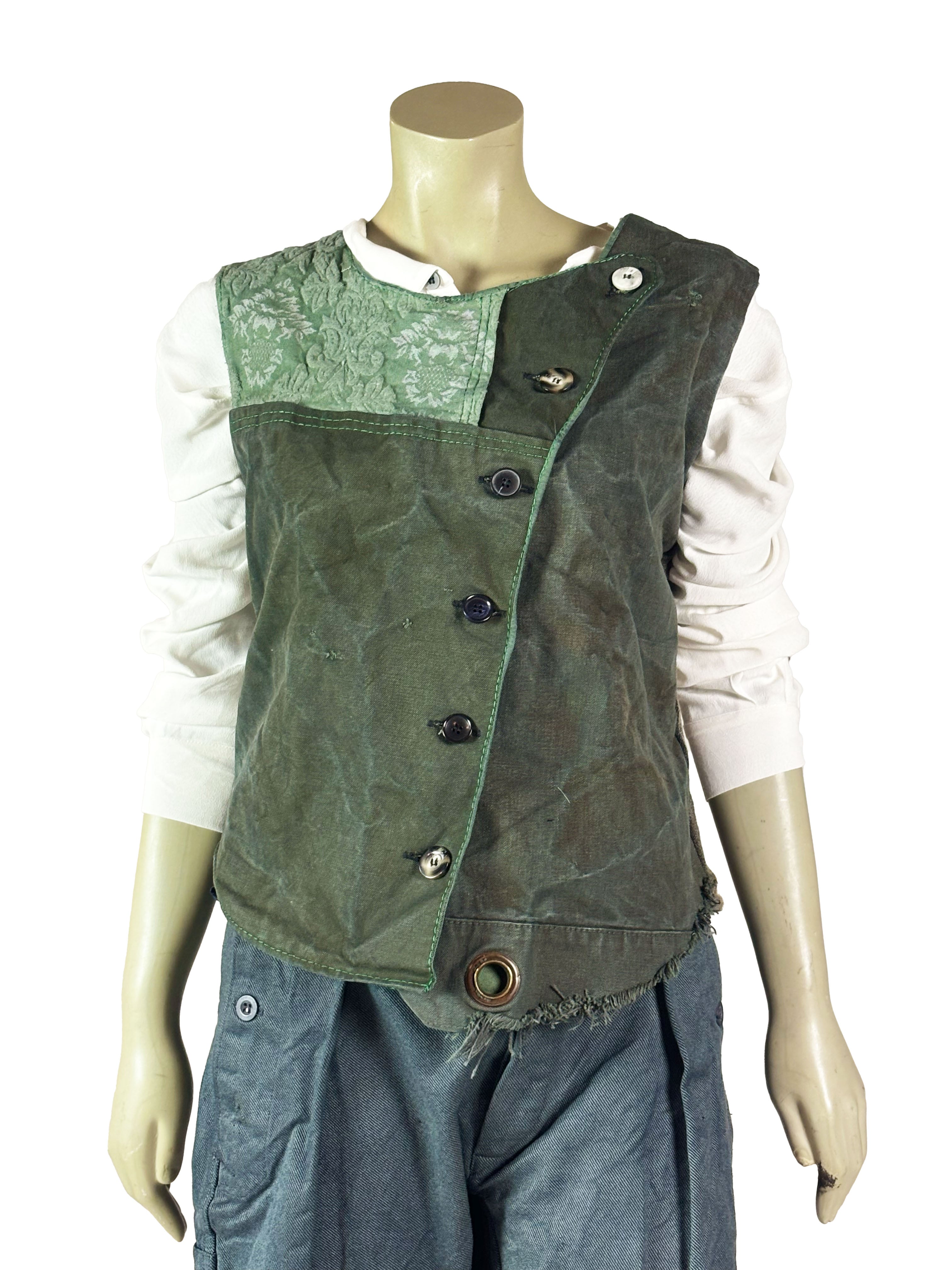 This one-of-a-kind vest is handcrafted from a curated selection of vintage and repurposed textiles, primarily sourced from original military fabrics and aged workwear materials. Each vest is individually assembled by hand, allowing the unique character of every fabric to remain visible. Differences in texture, weight, color tone and surface are not concealed but intentionally preserved, making each piece truly singular.