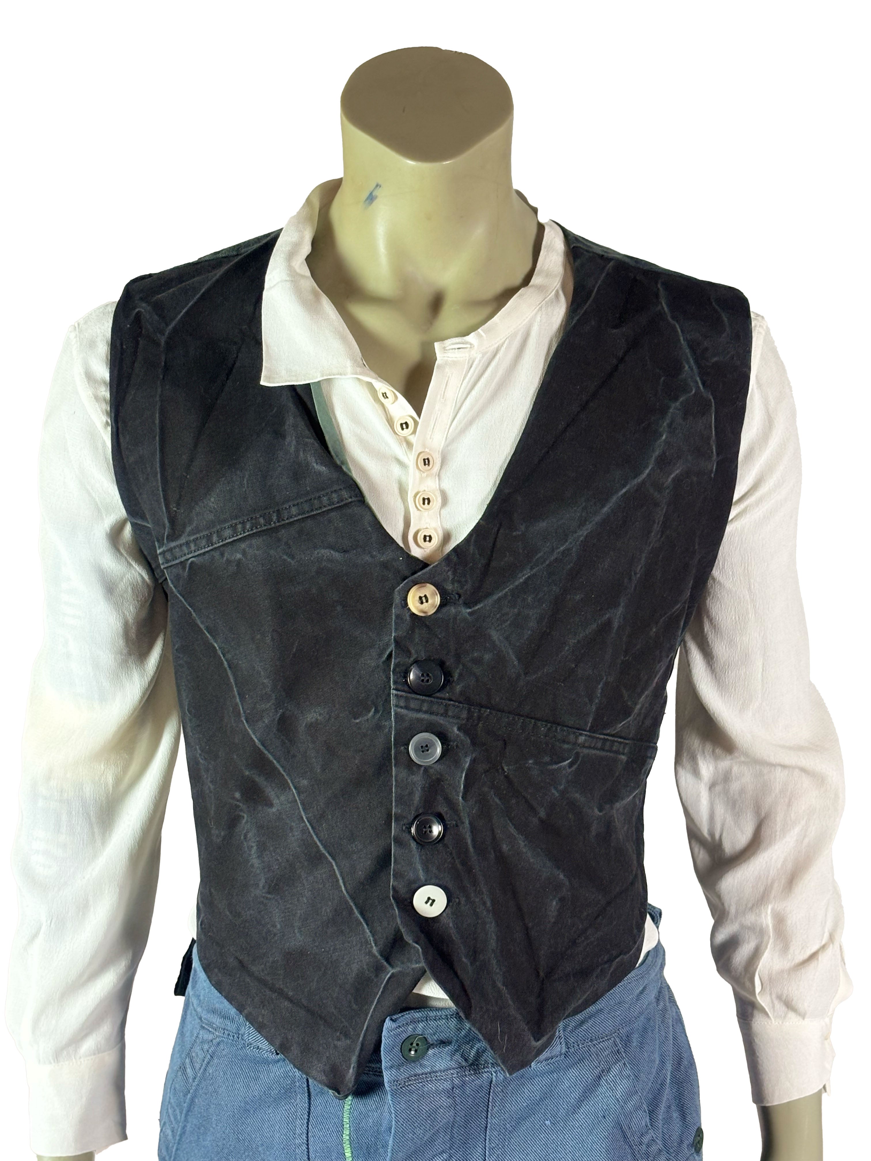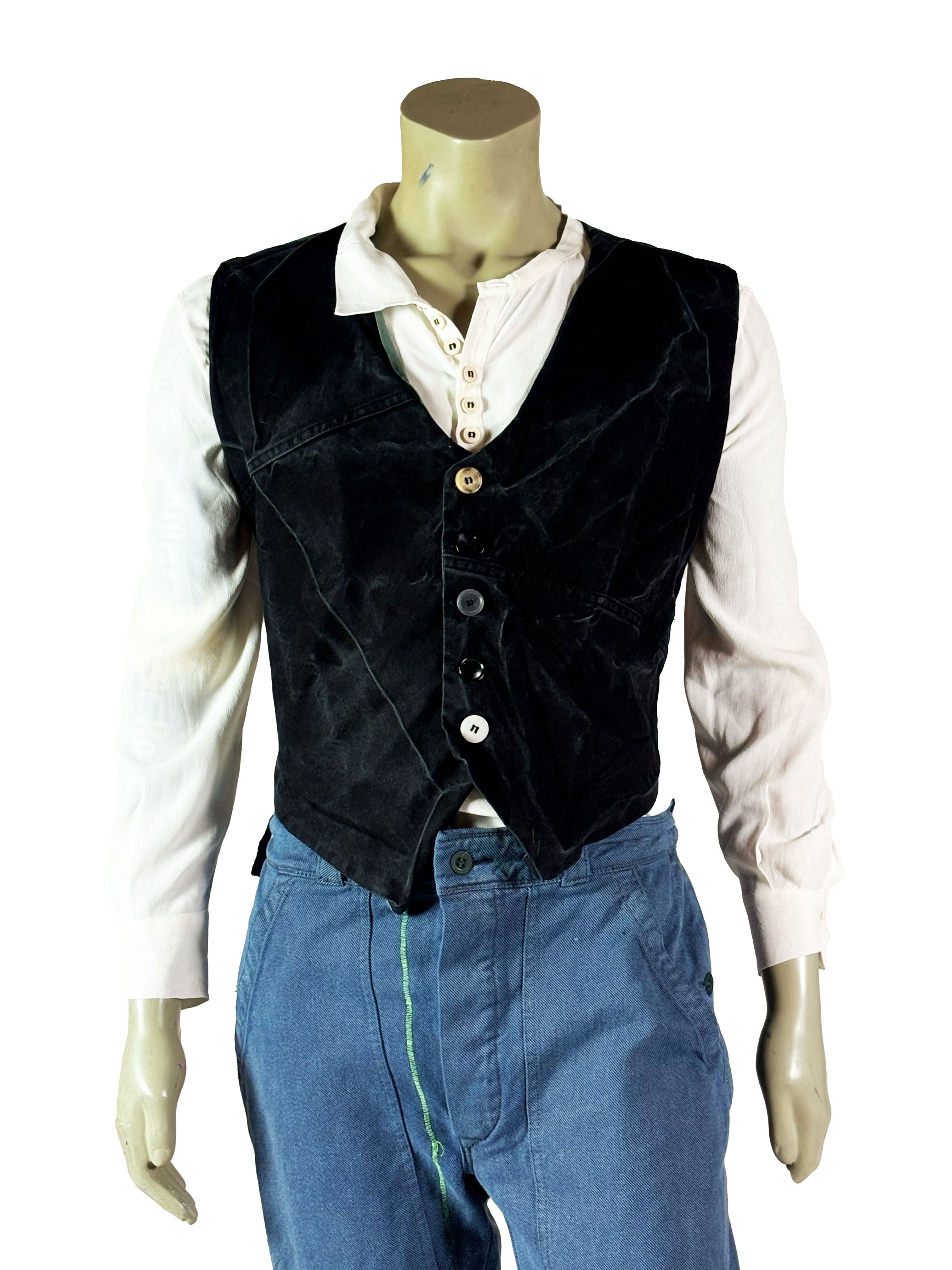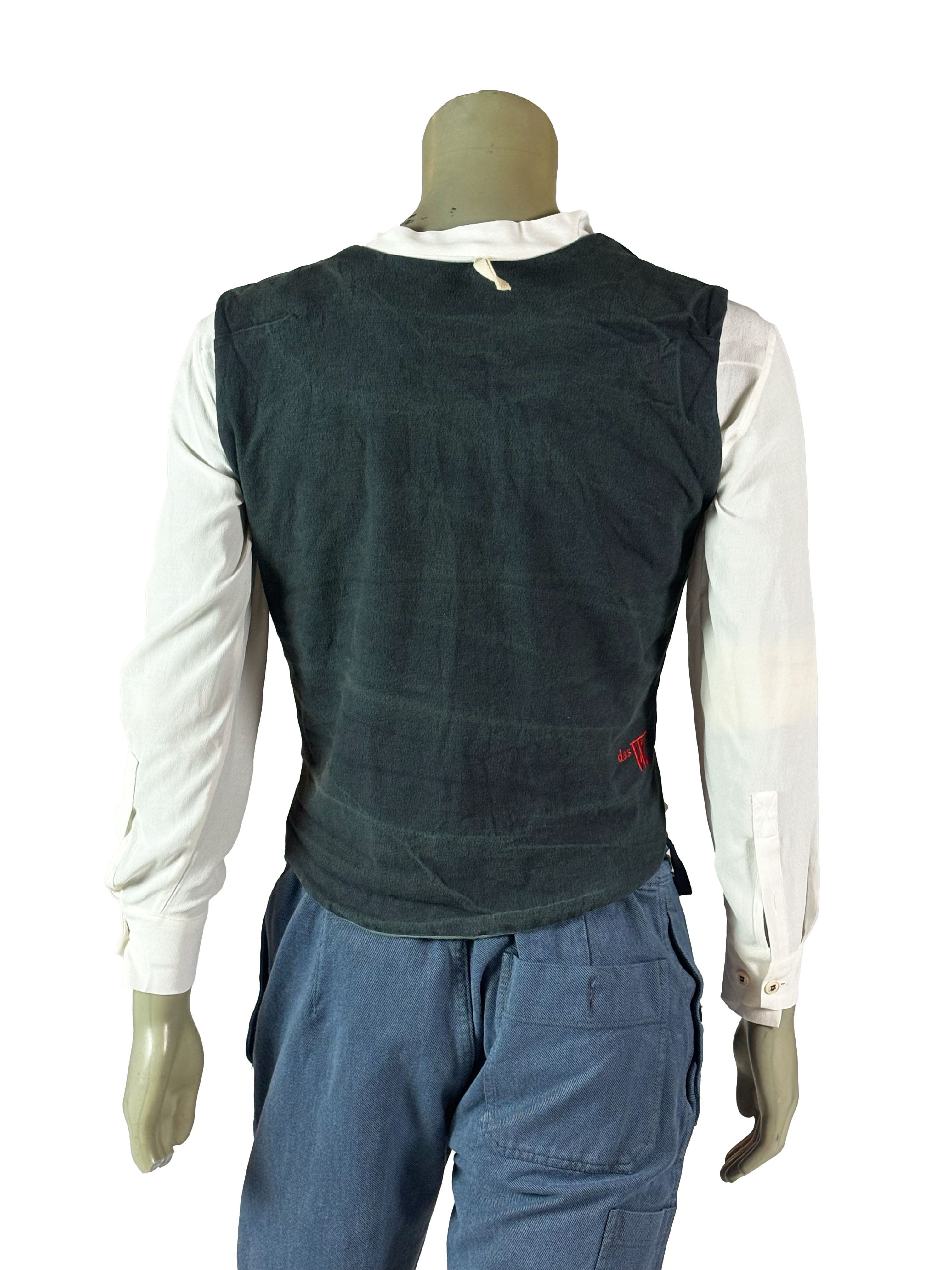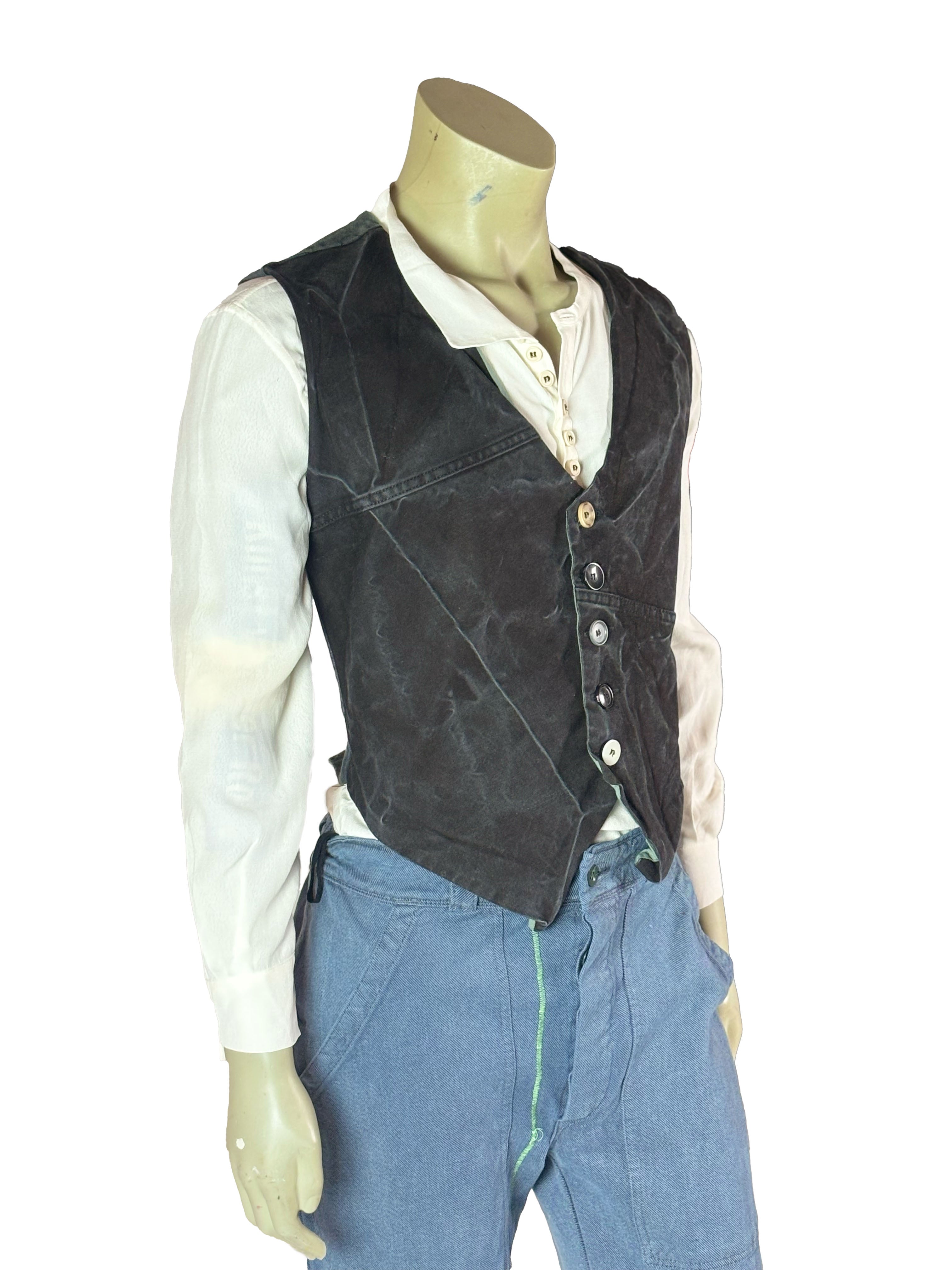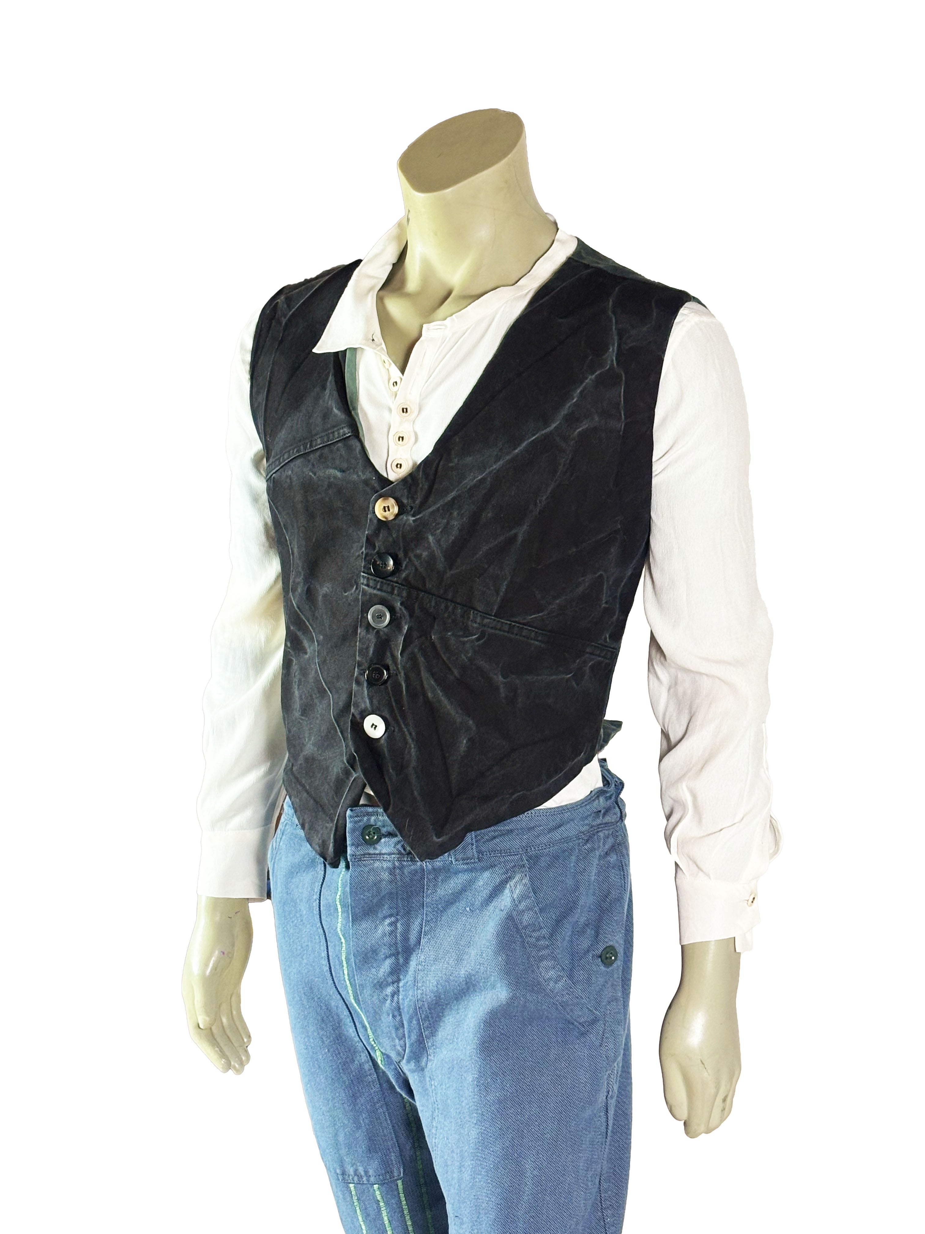 The construction varies subtly from vest to vest, featuring asymmetrical paneling, mixed materials and distinctive button arrangements. Some designs incorporate contrasting sections or historical decorative textiles, while others remain more reduced and utilitarian in appearance. Visible seams, layered edges and traces of previous use emphasize the handmade process and underline the authenticity of the garment.