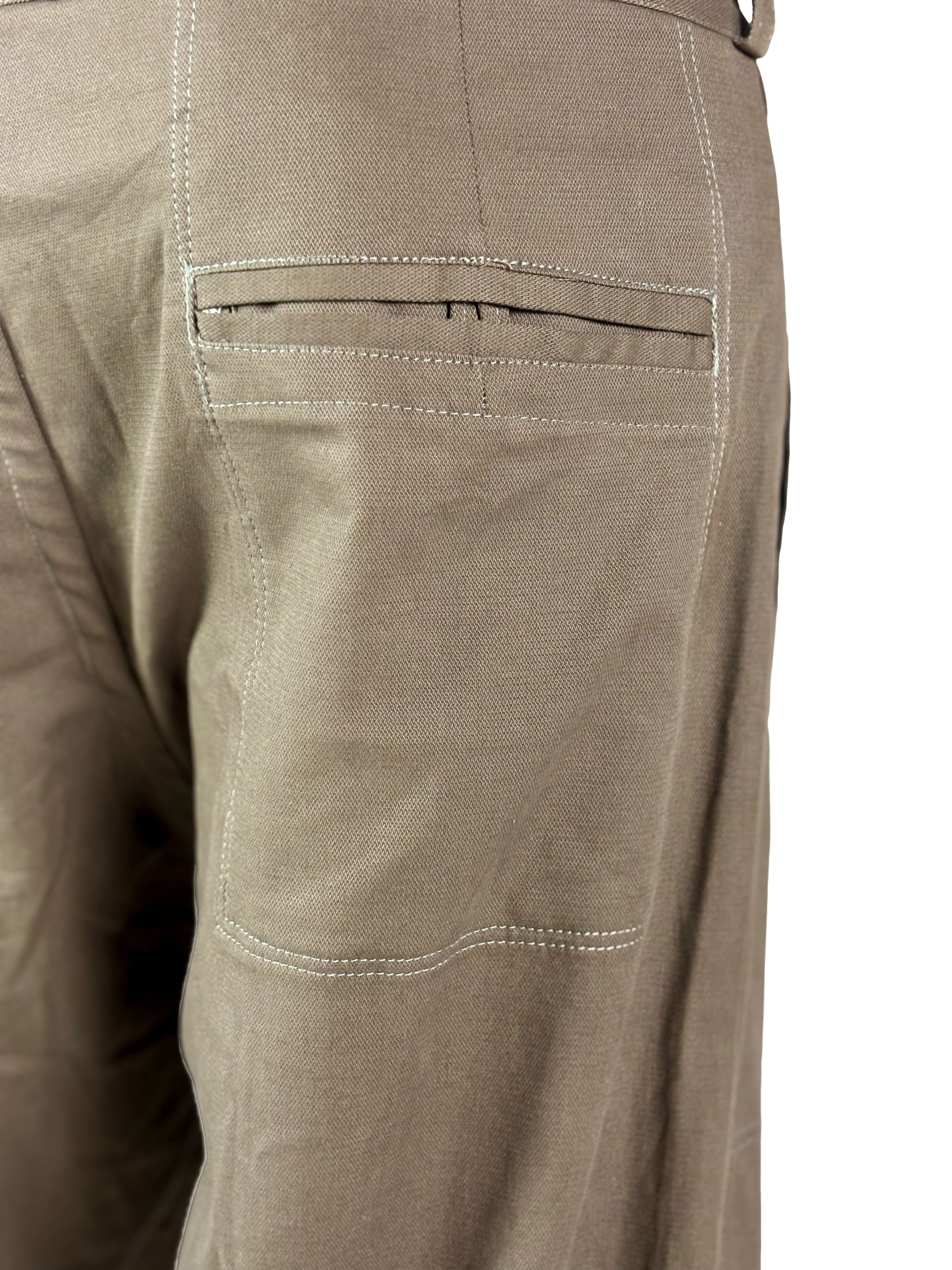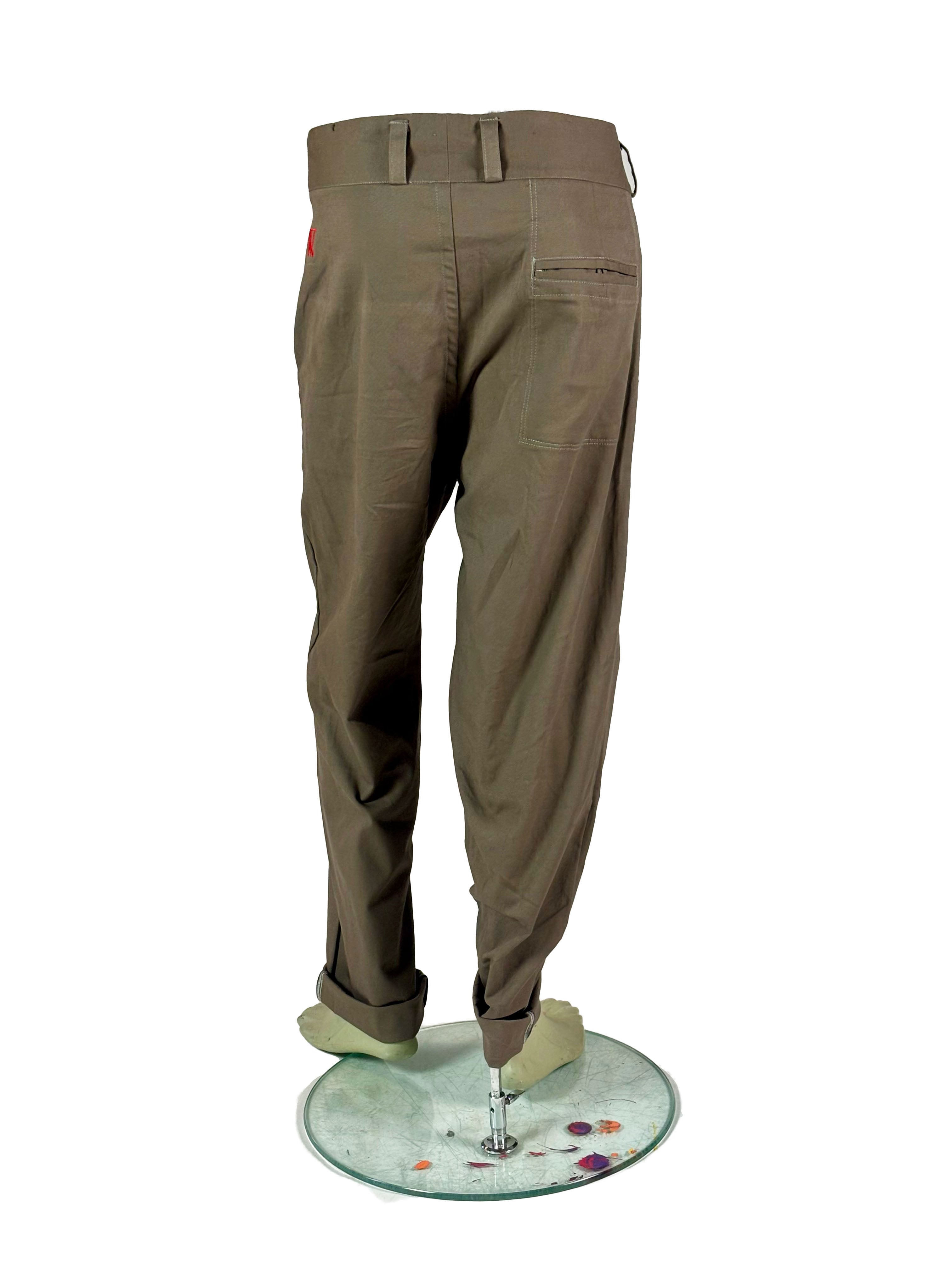 This one-of-a-kind pair of Studio Trousers is defined by a calm, earthy brown tone and a reduced, workwear-inspired construction. The fabric has a smooth, compact surface with a subtle structure, giving the trousers a balanced appearance between utility and refinement.
