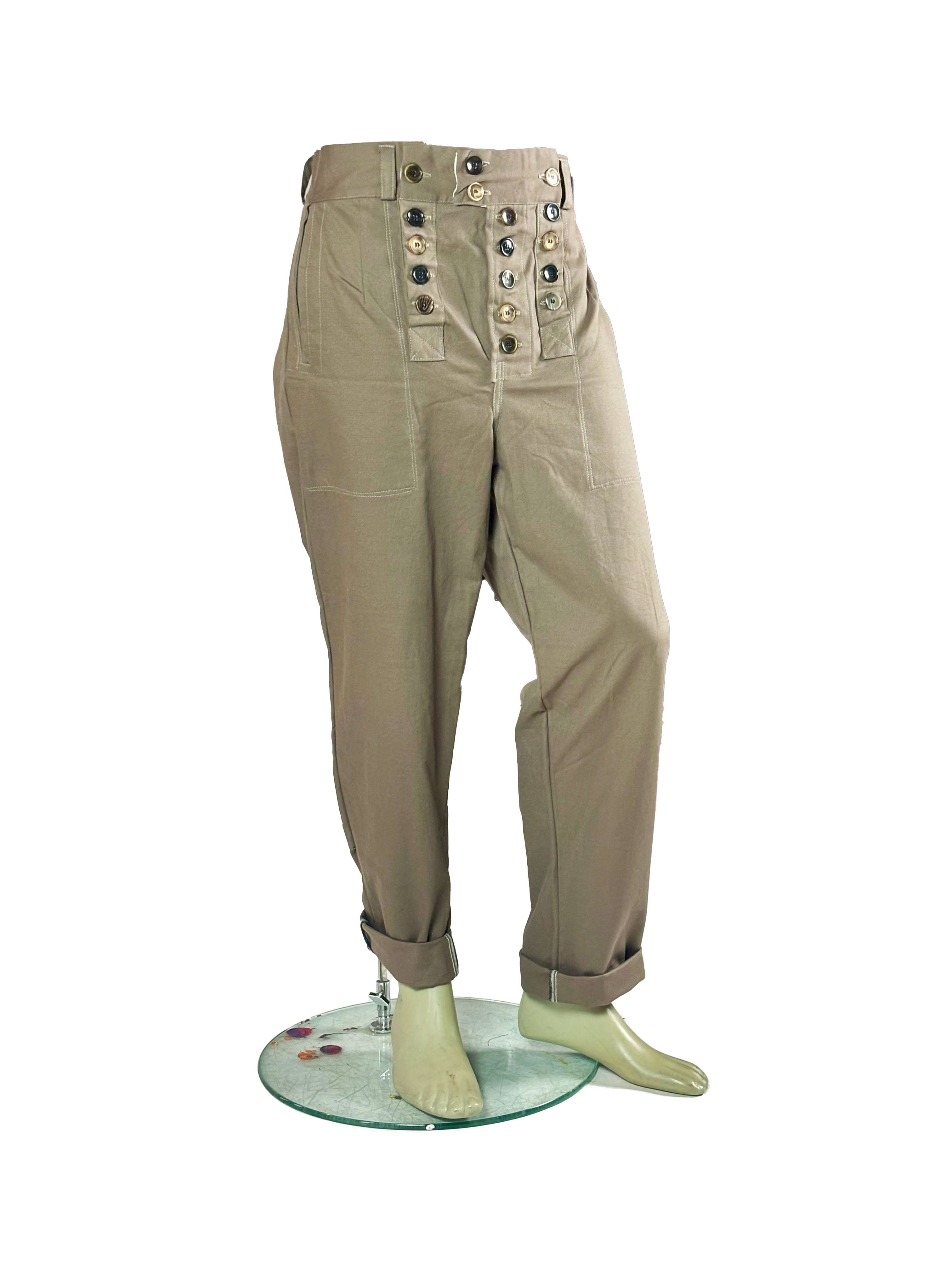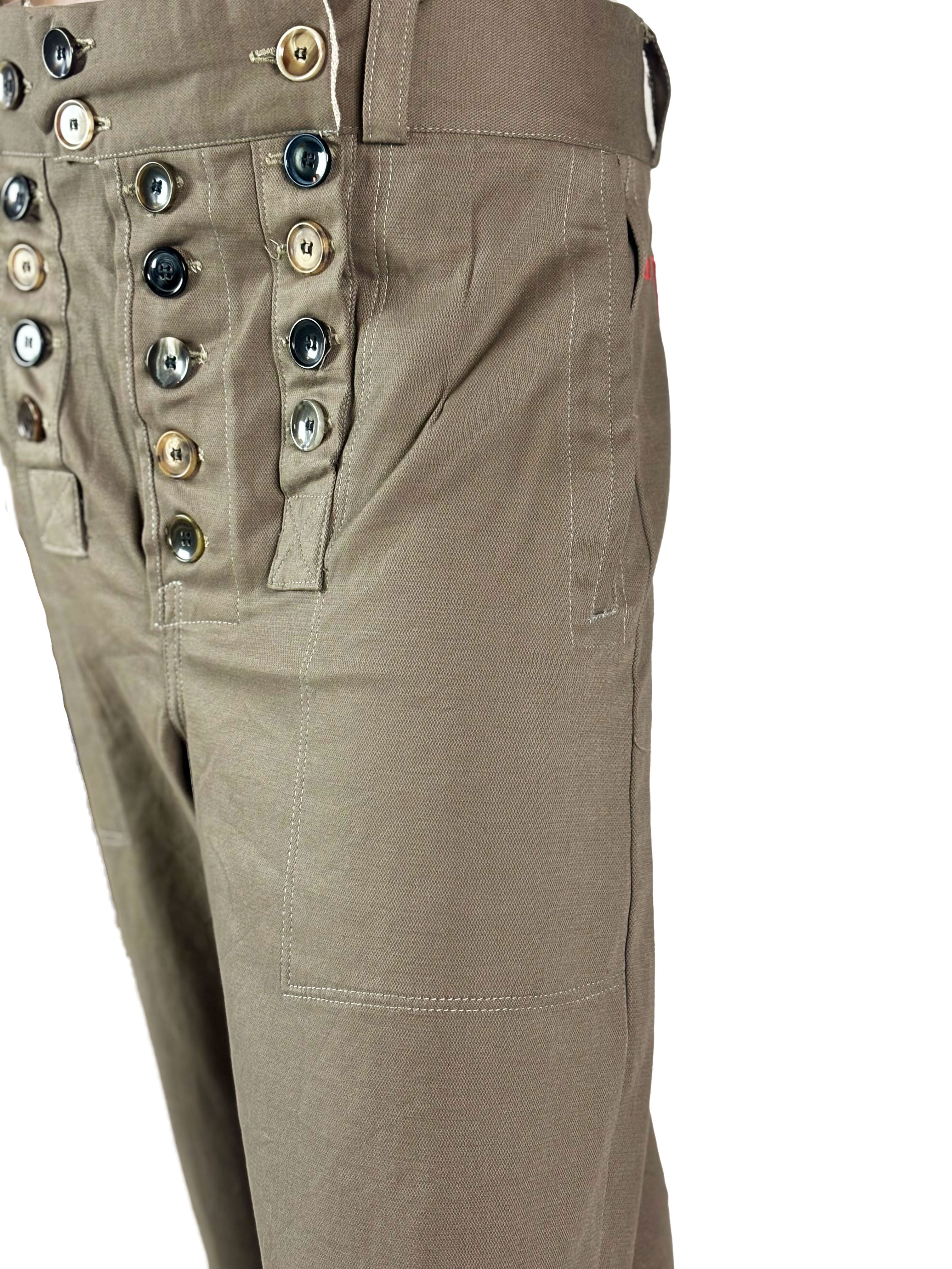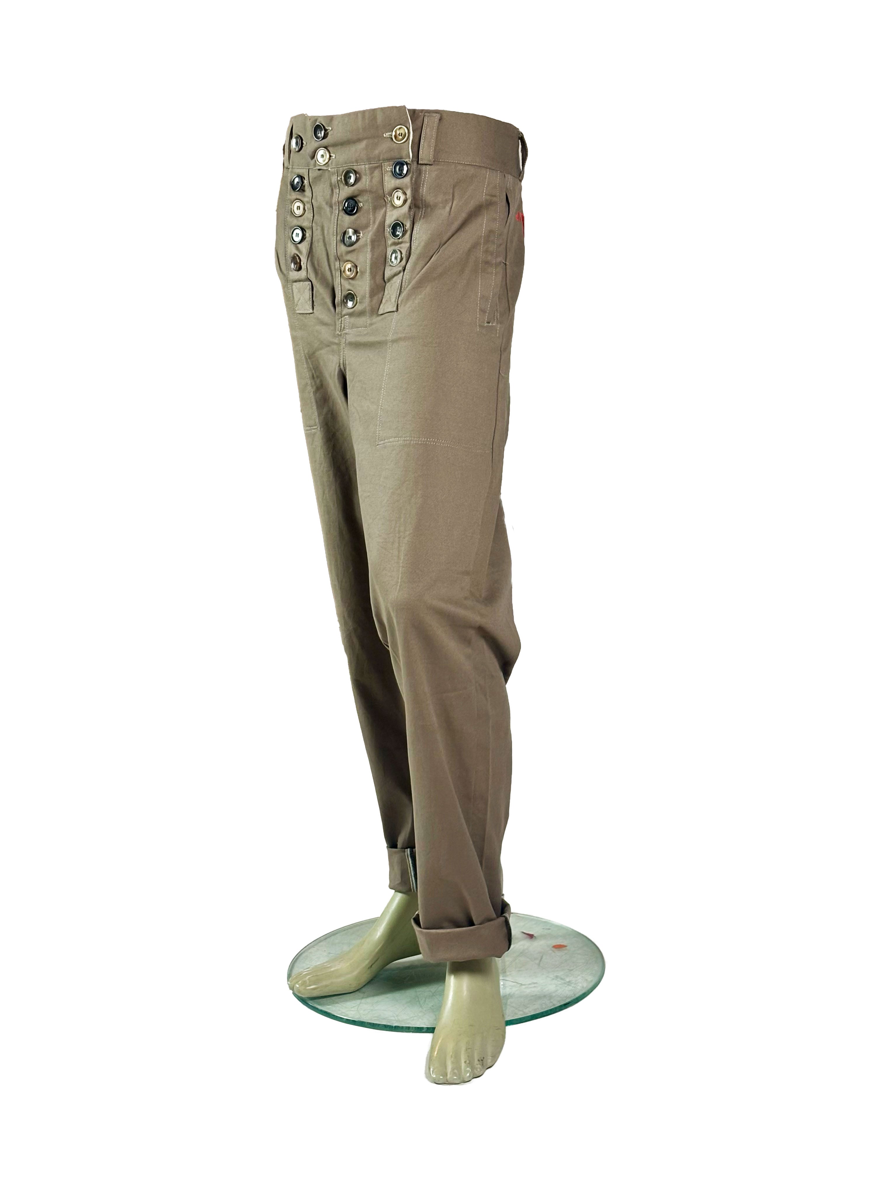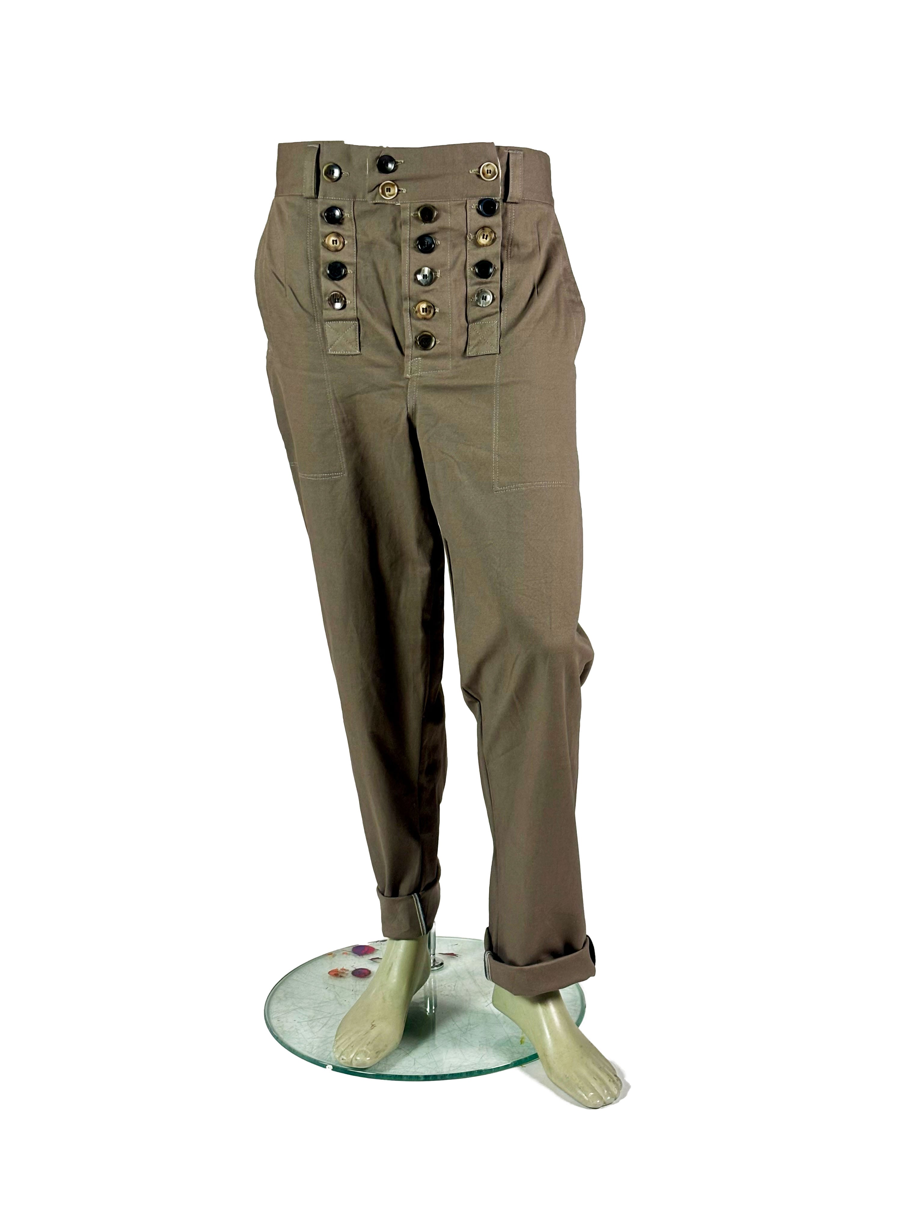 A distinctive design feature is the triple-button front construction. Three vertical rows of buttons form a strong visual element, referencing historical workwear while giving the trousers a unique, architectural character. The button arrangement is intentional and serves as a stylistic statement rather than a purely functional closure.