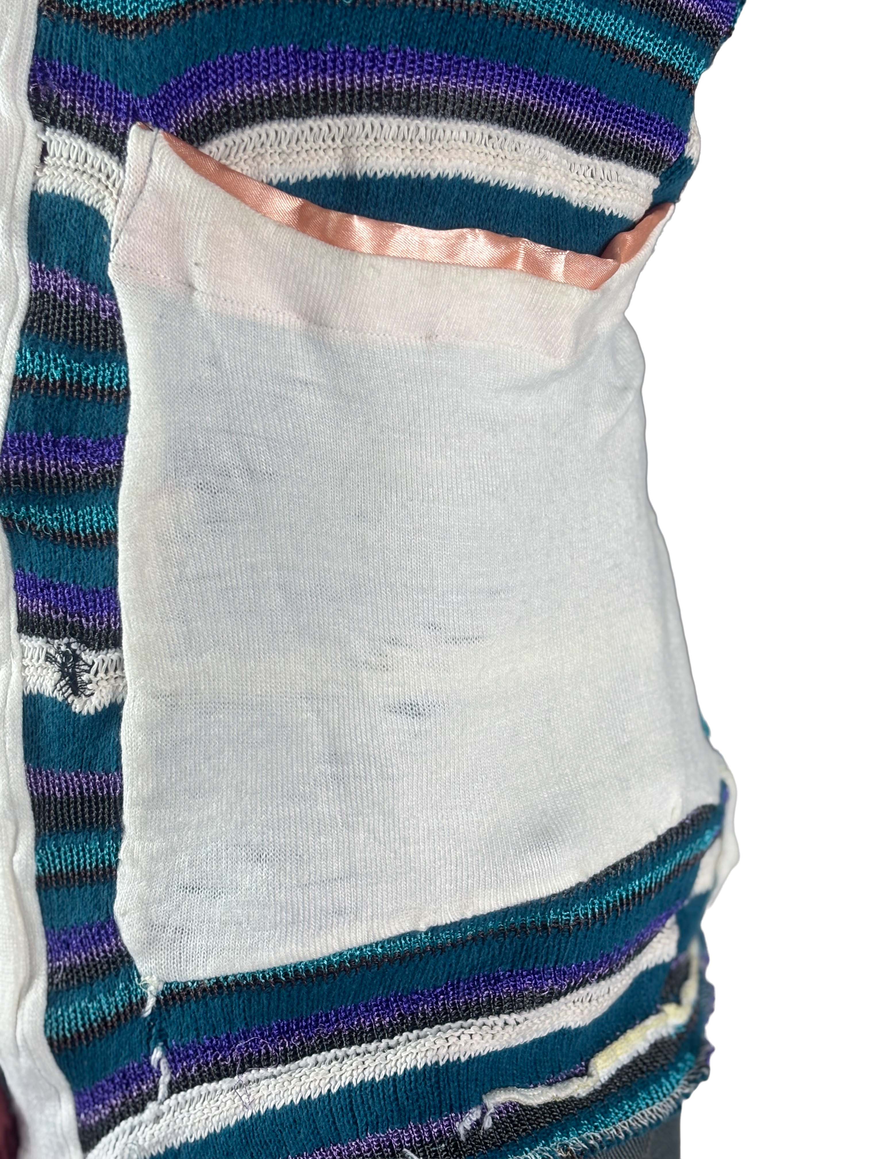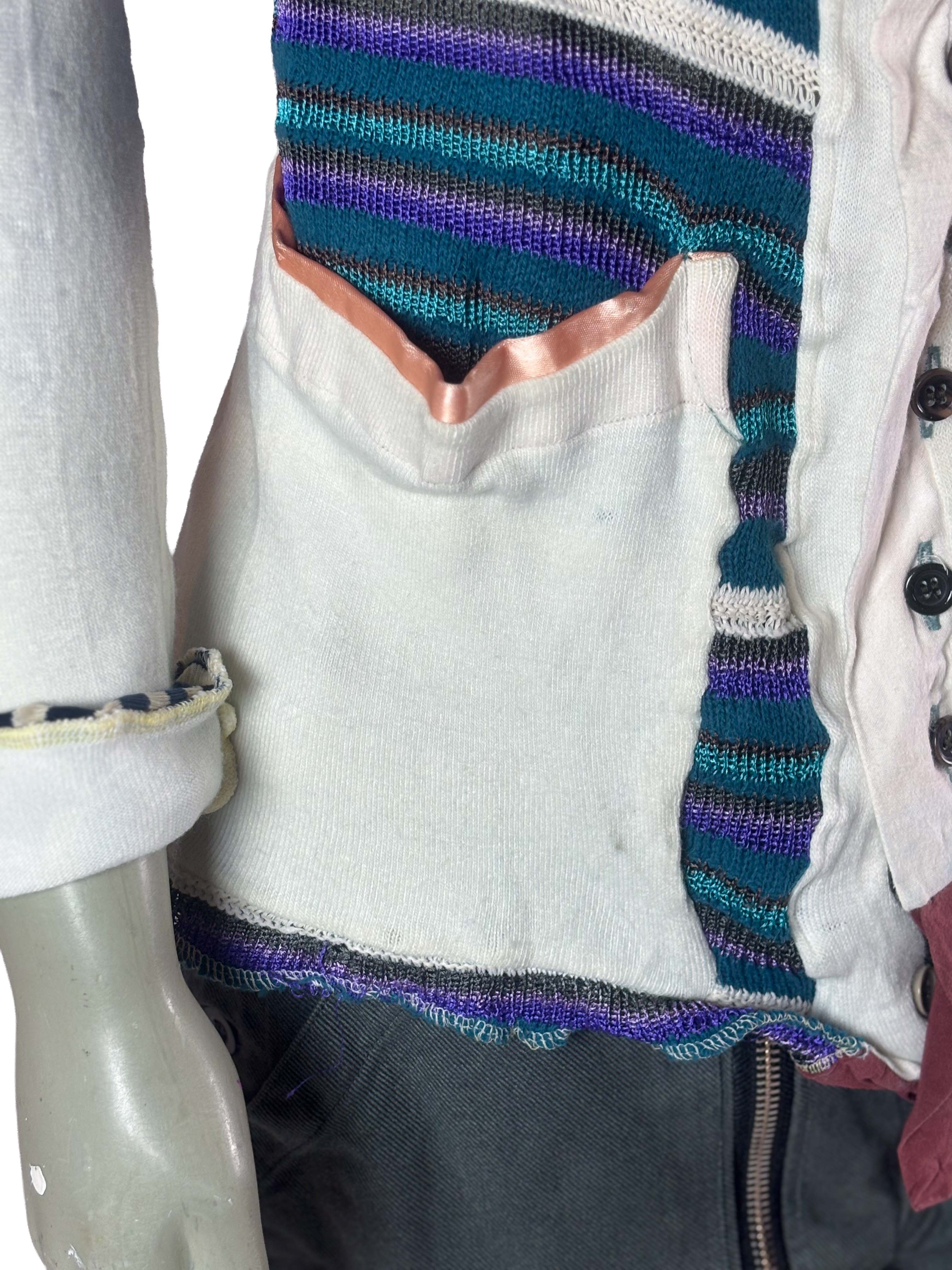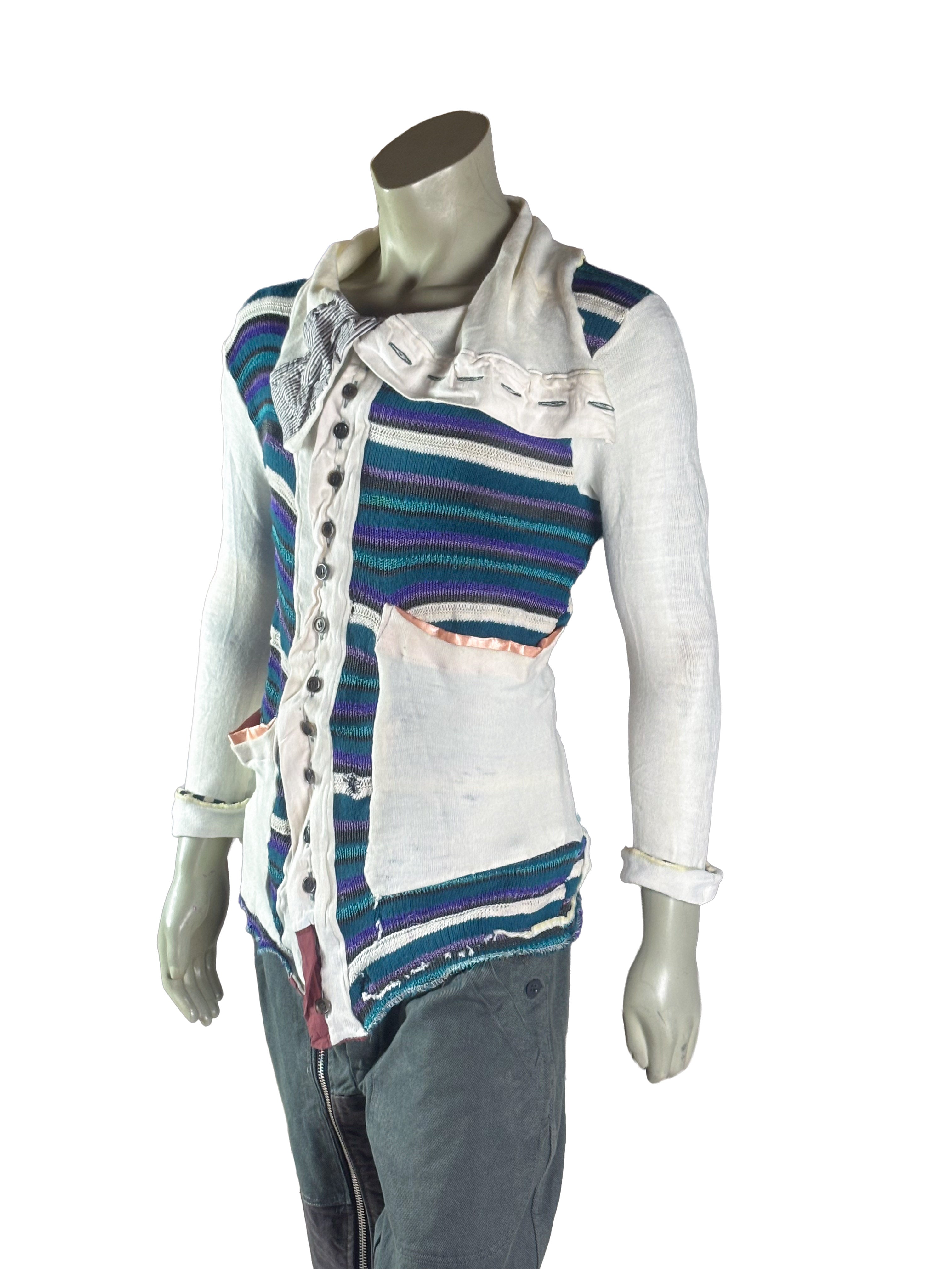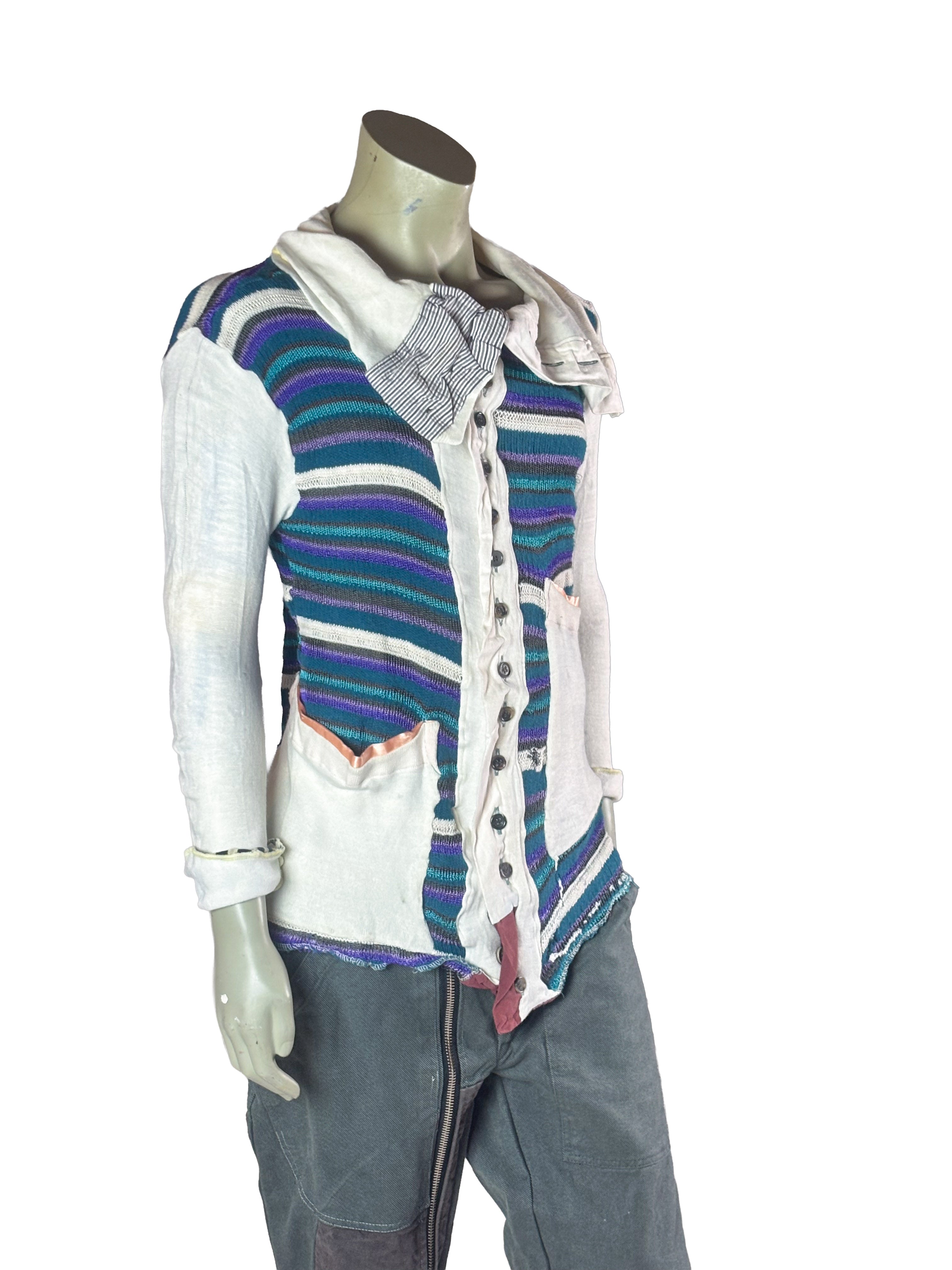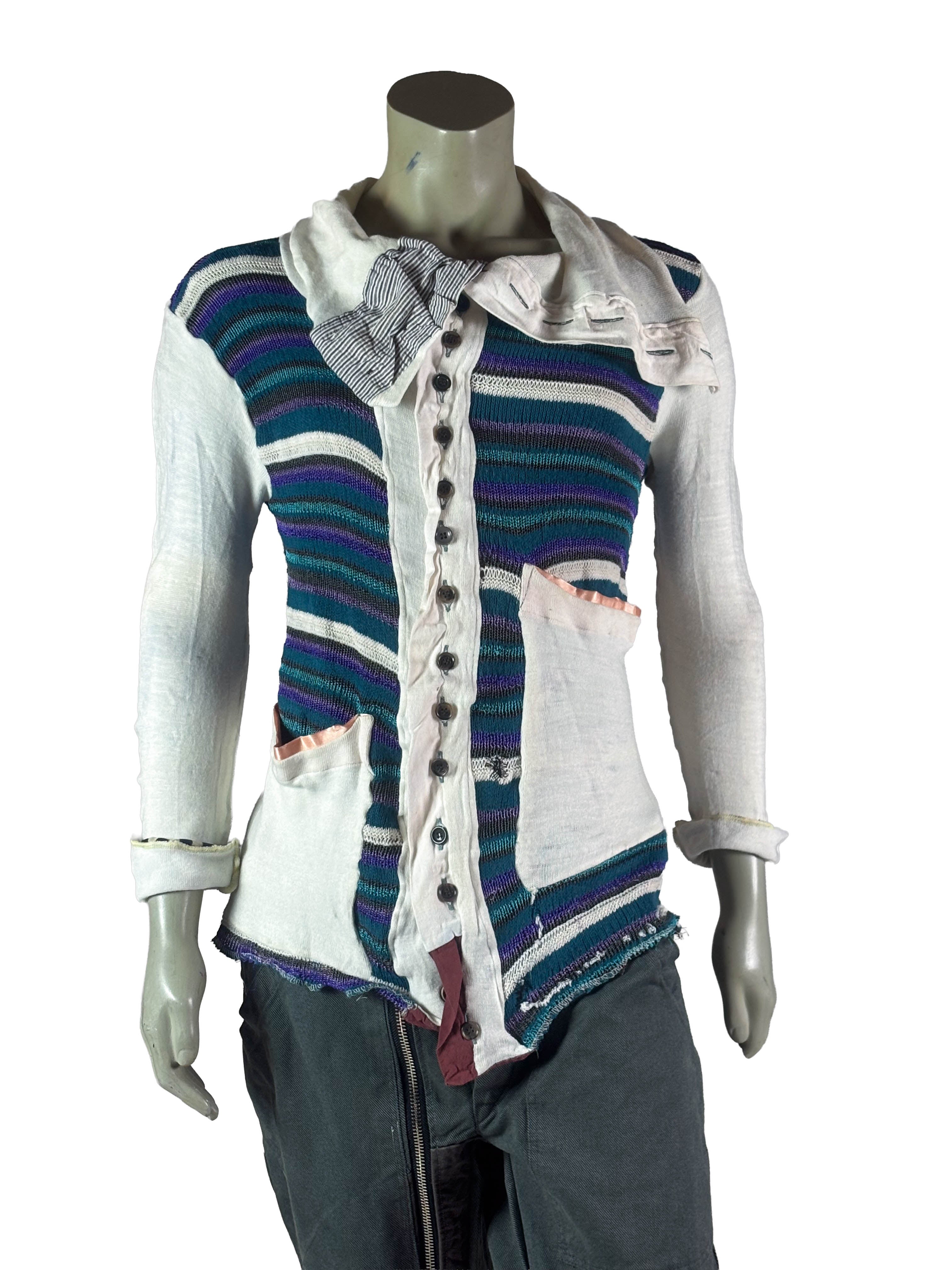 Each shirt in this series is built from a deliberate composition of contrasting fabrics, tones and surface structures. Different materials are combined into a single architectural garment, where visible seams, layered panels and raw edges reveal the construction process rather than hiding it.