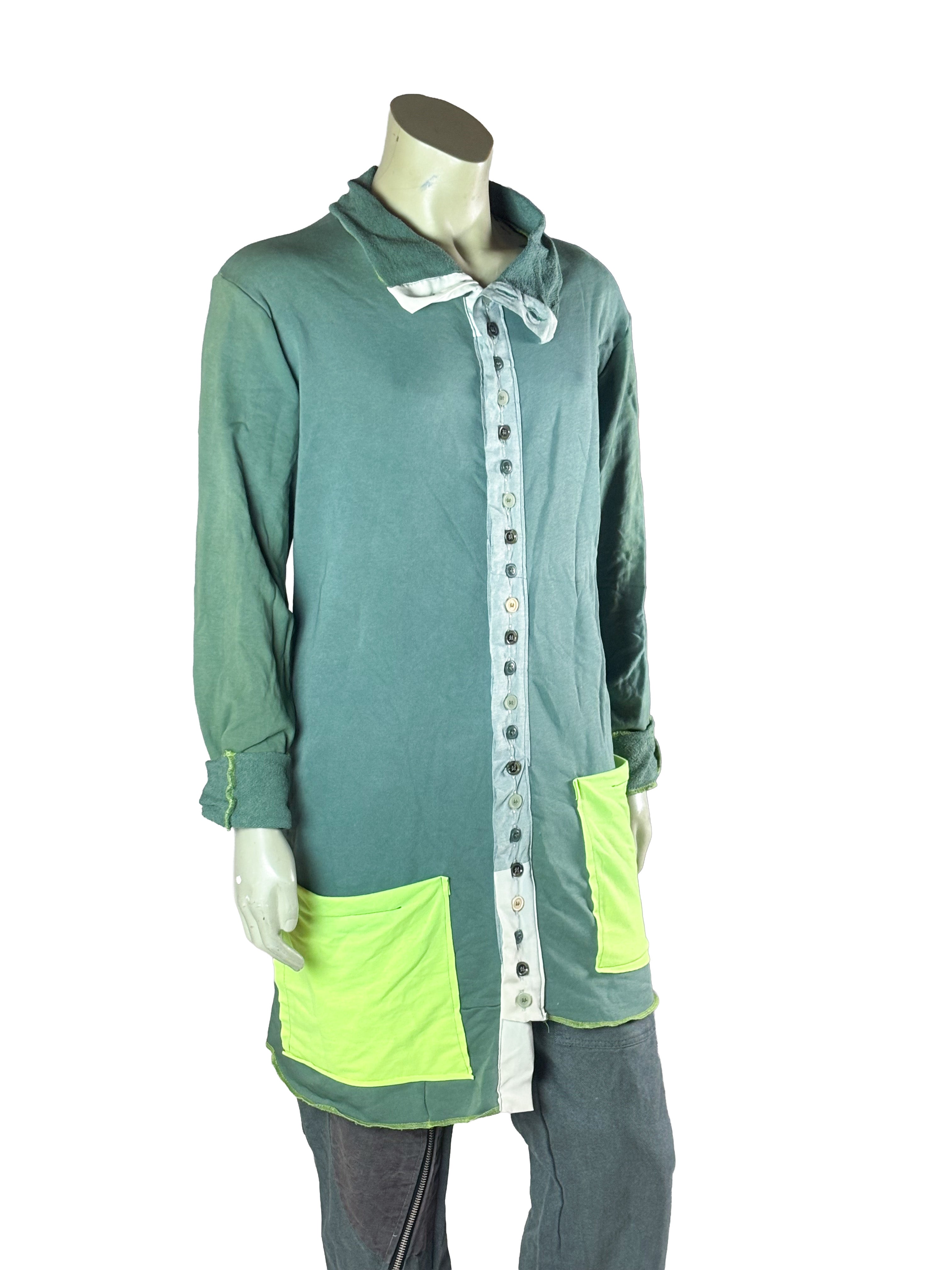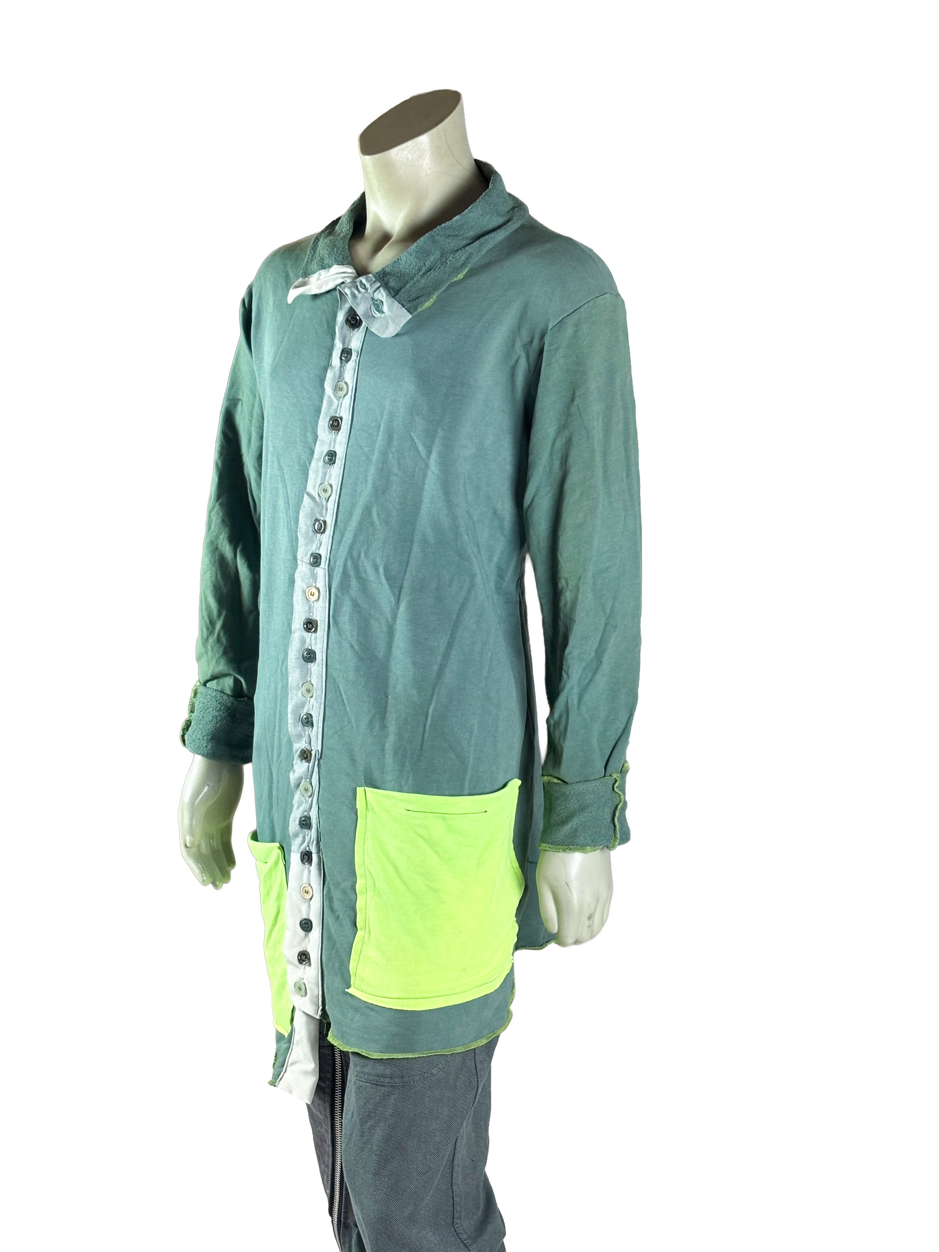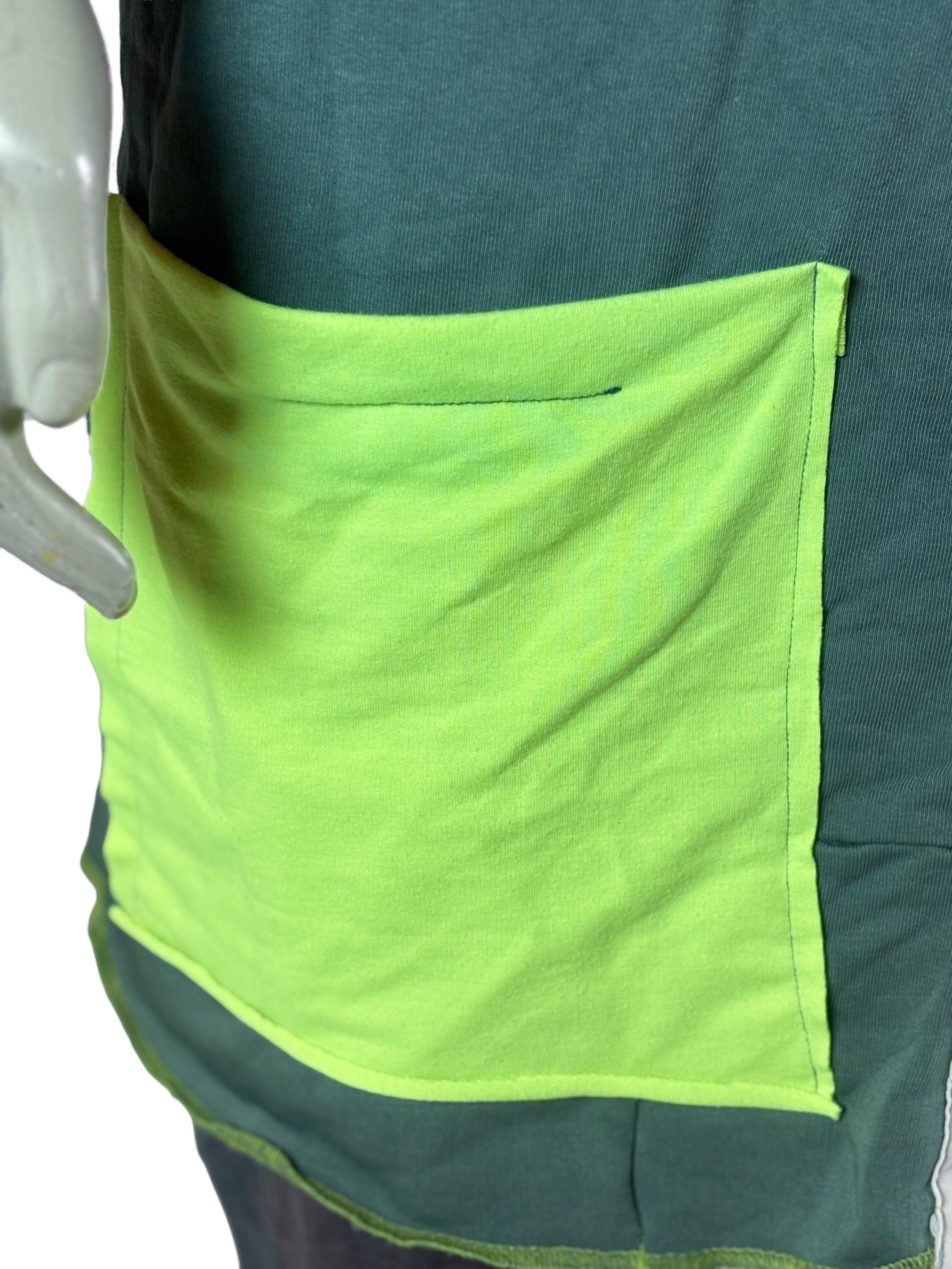Construct Shirt 8 of 10 features a green base with contrasting yellow-green pockets and an extended length silhouette. The elongated cut adds a strong architectural presence to this handcrafted unisex designer shirt.
