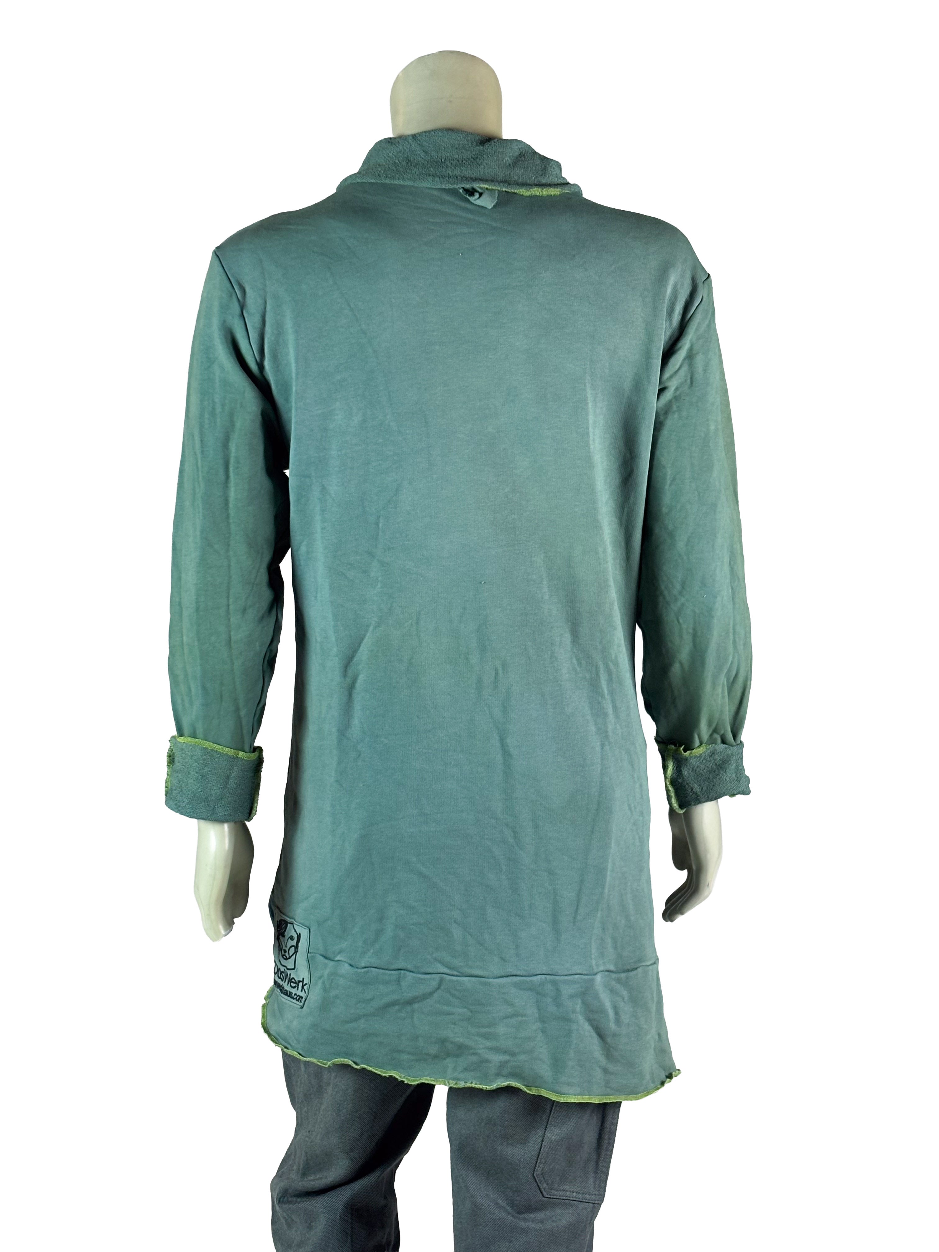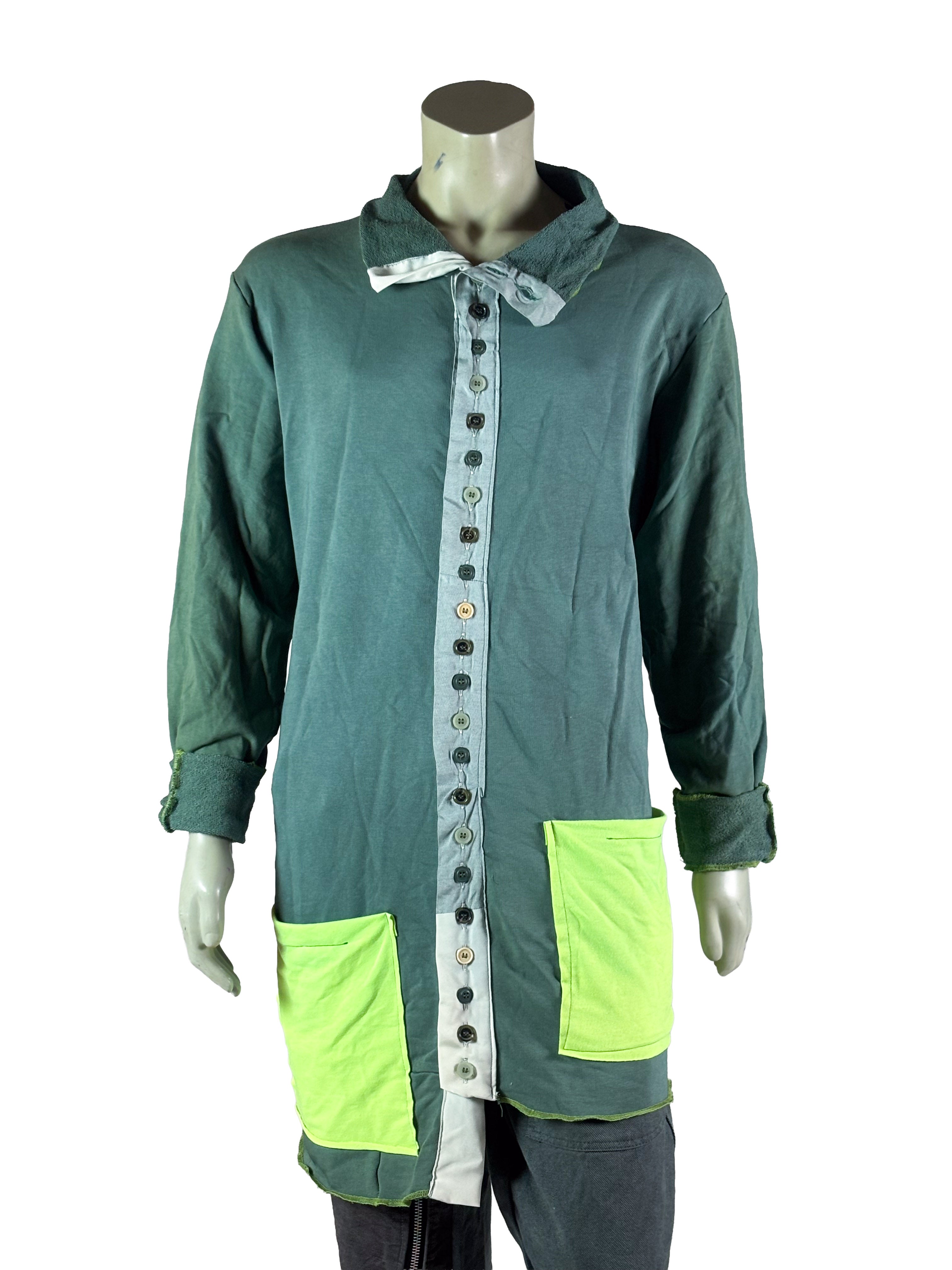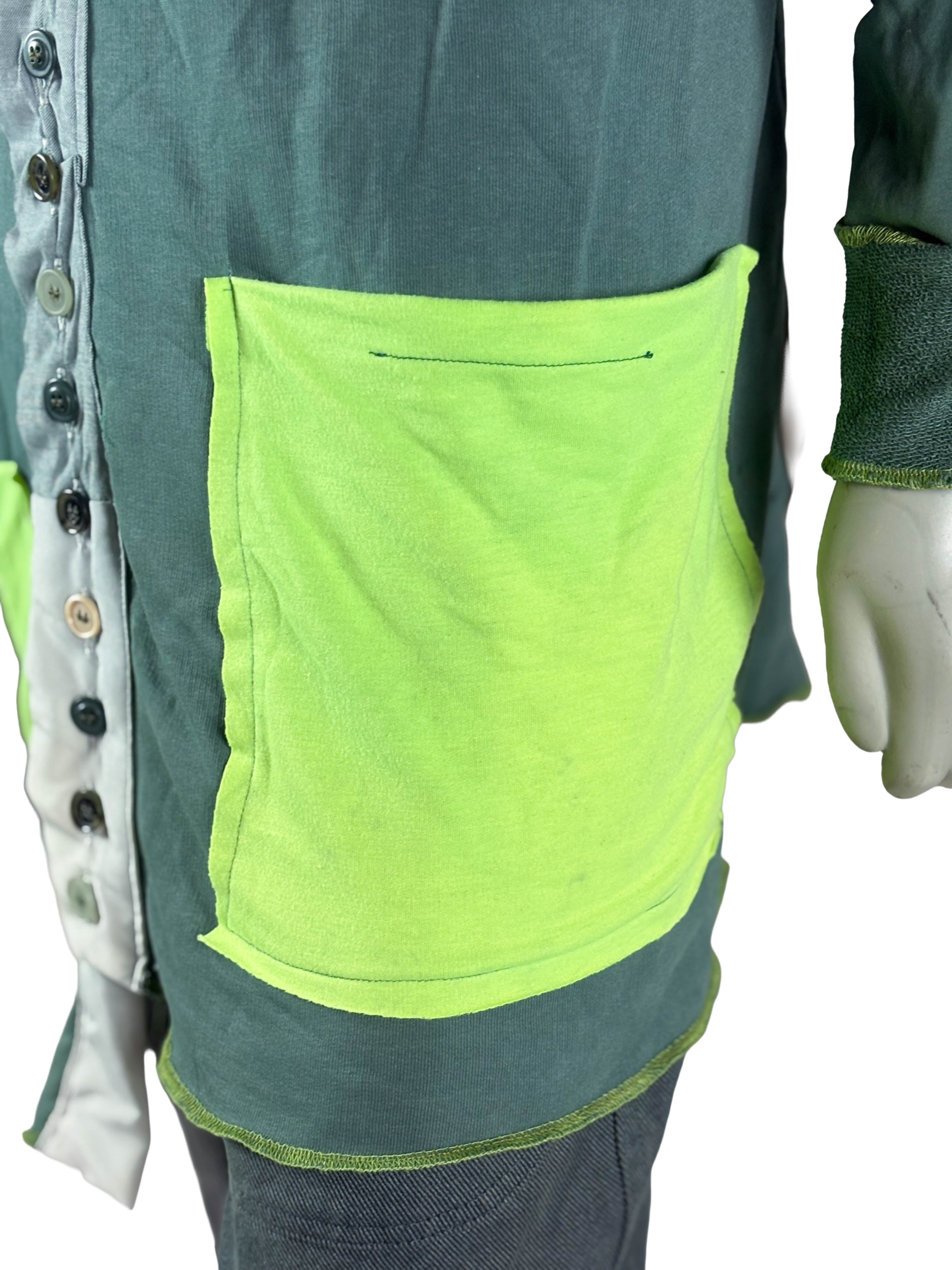 Construct Shirt 8 of 10 features a green base with contrasting yellow-green pockets and an extended length silhouette. The elongated cut adds a strong architectural presence to this handcrafted unisex designer shirt.