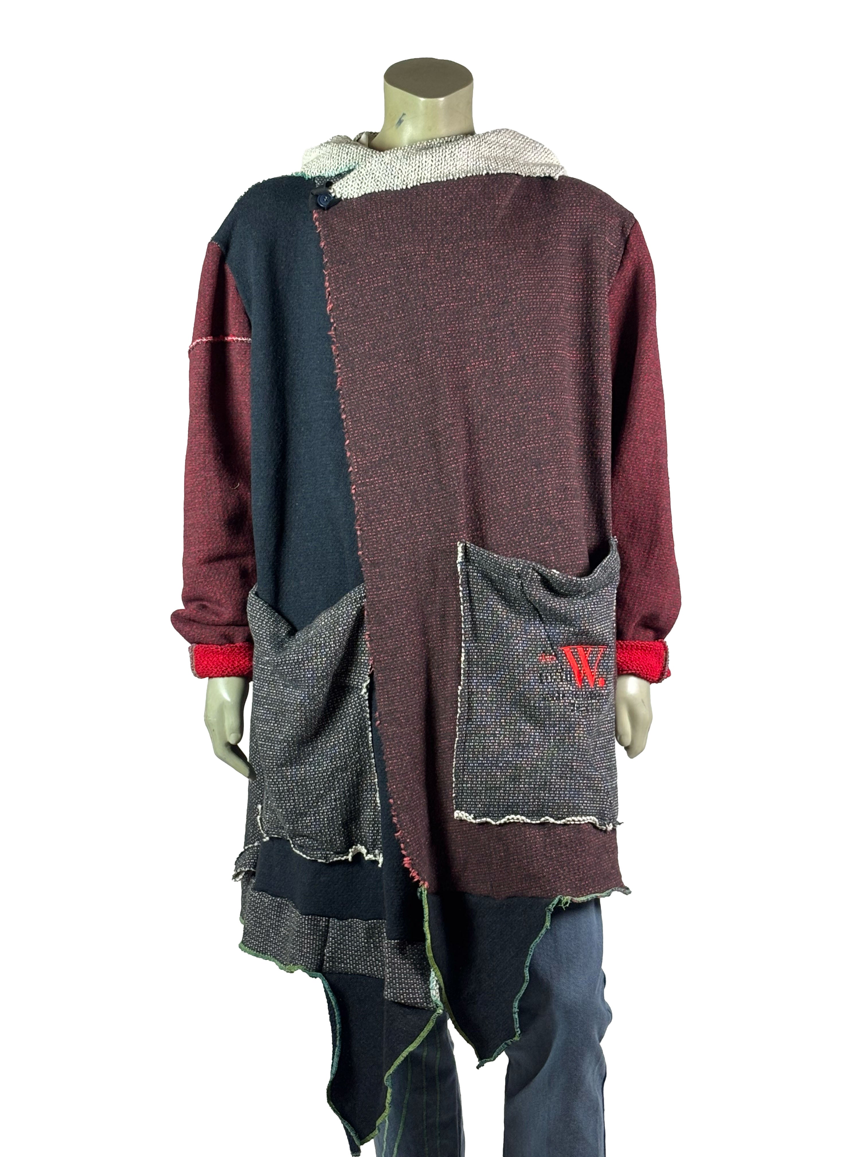 Relaxed cut with adjustable front and naturally draping length. Designed to be worn loosely and open. Features an integrated hood.