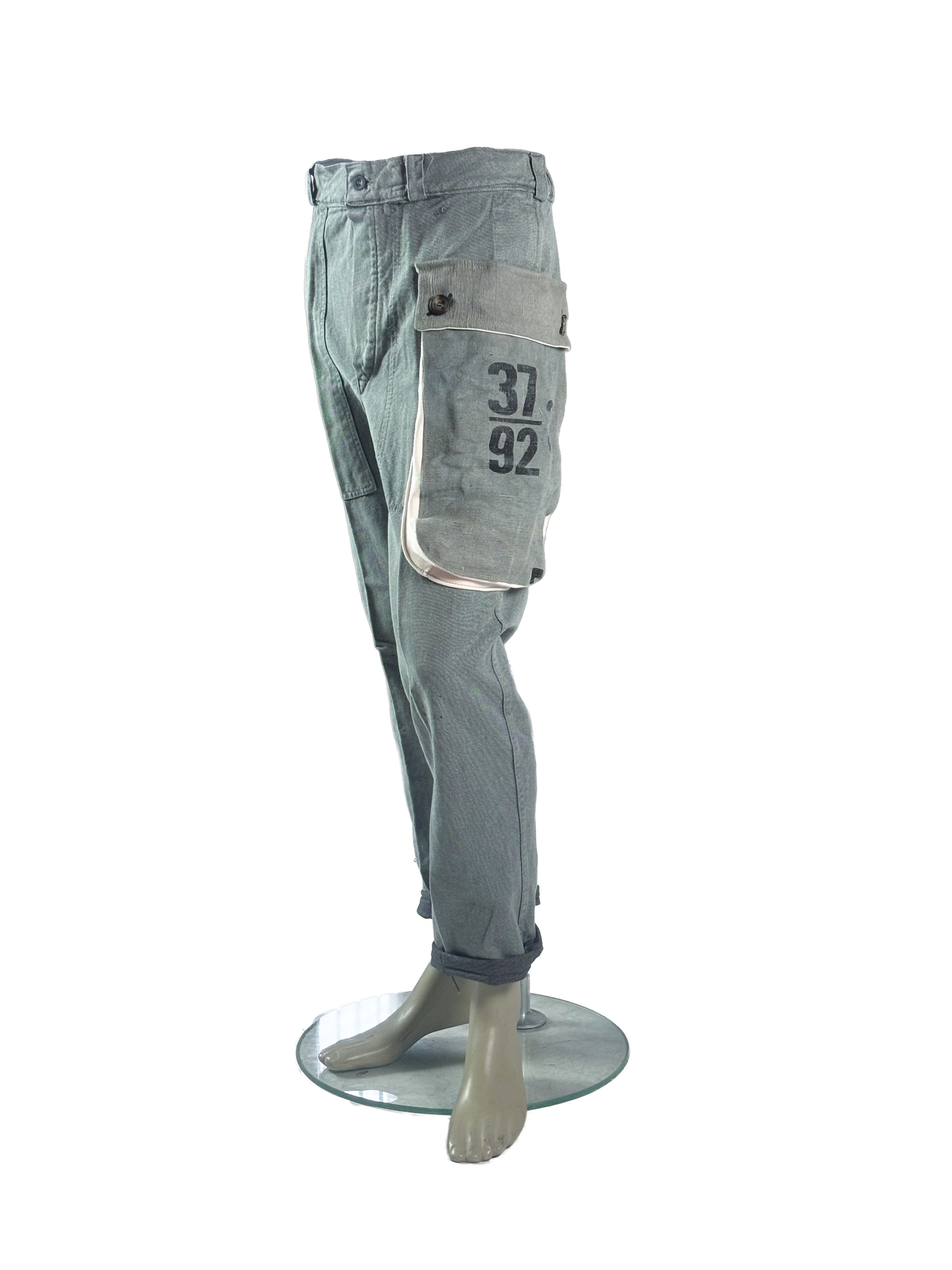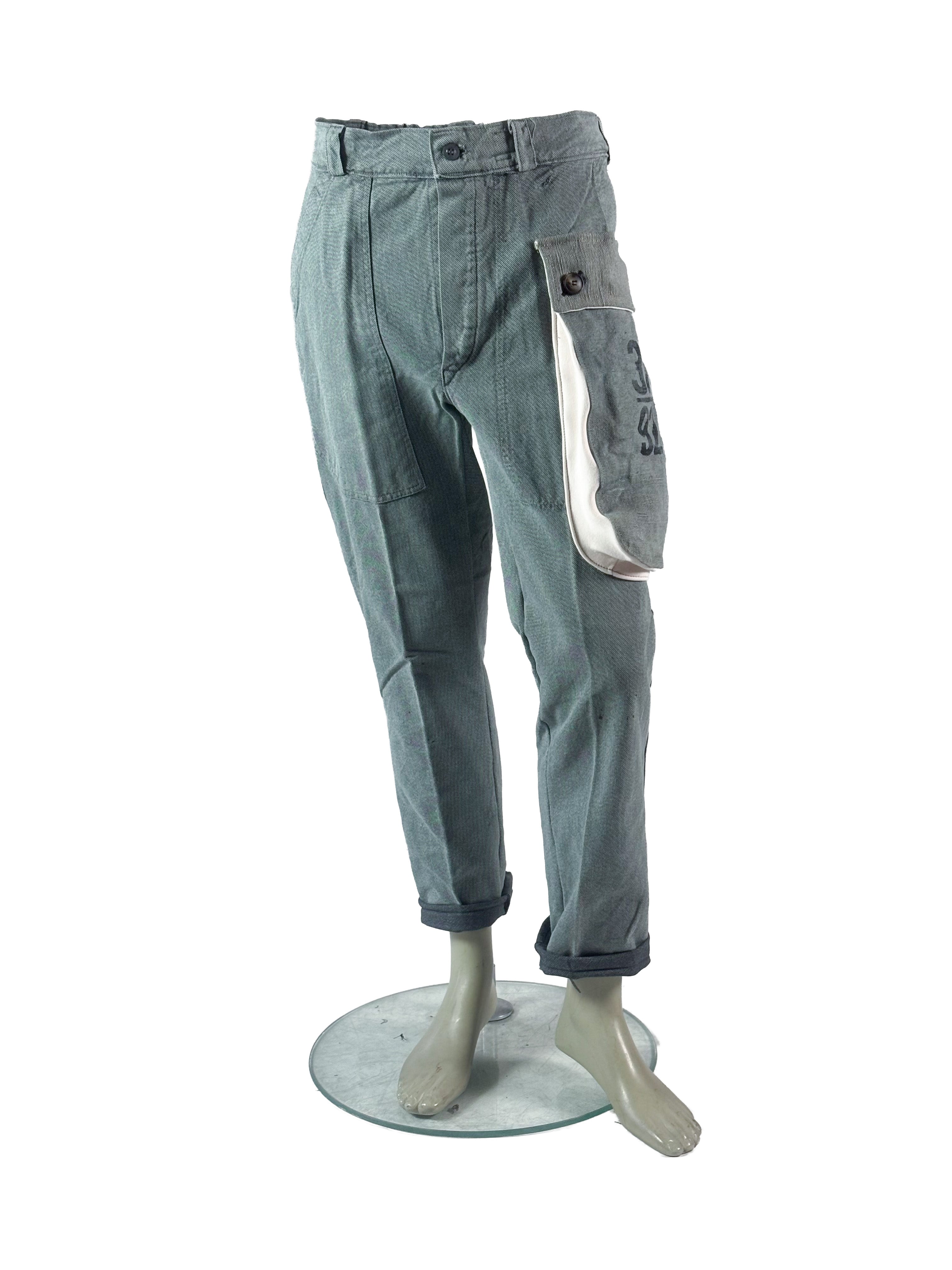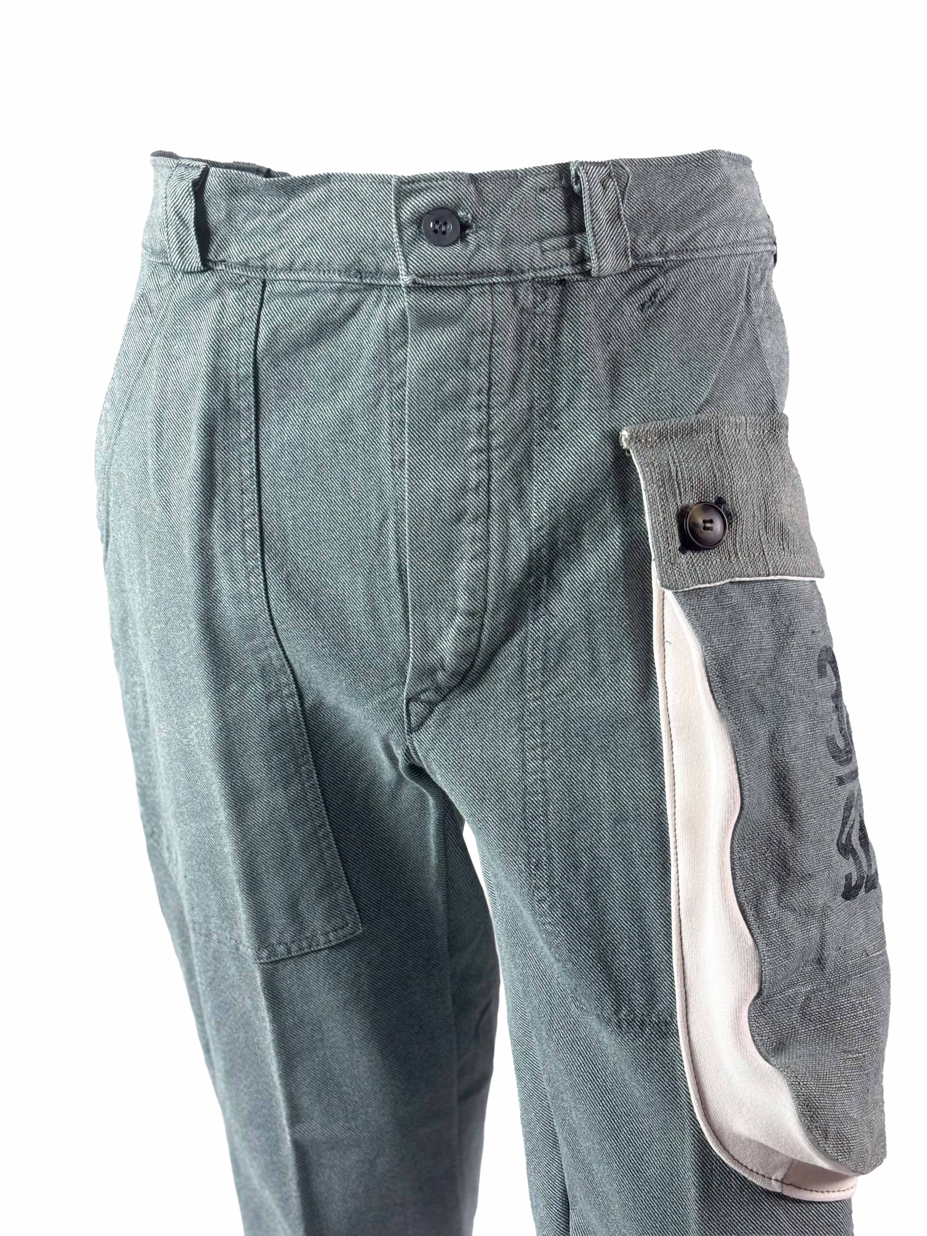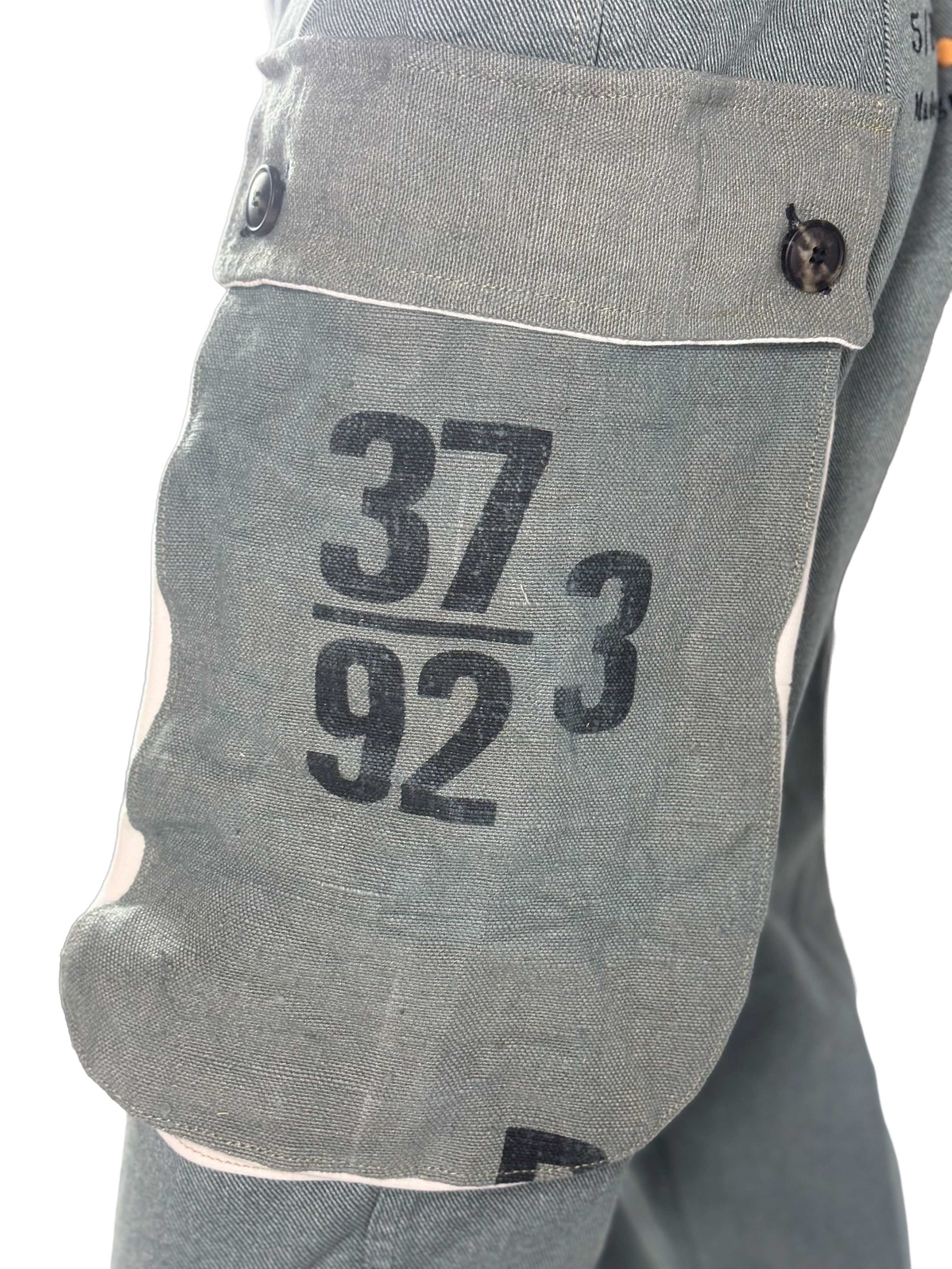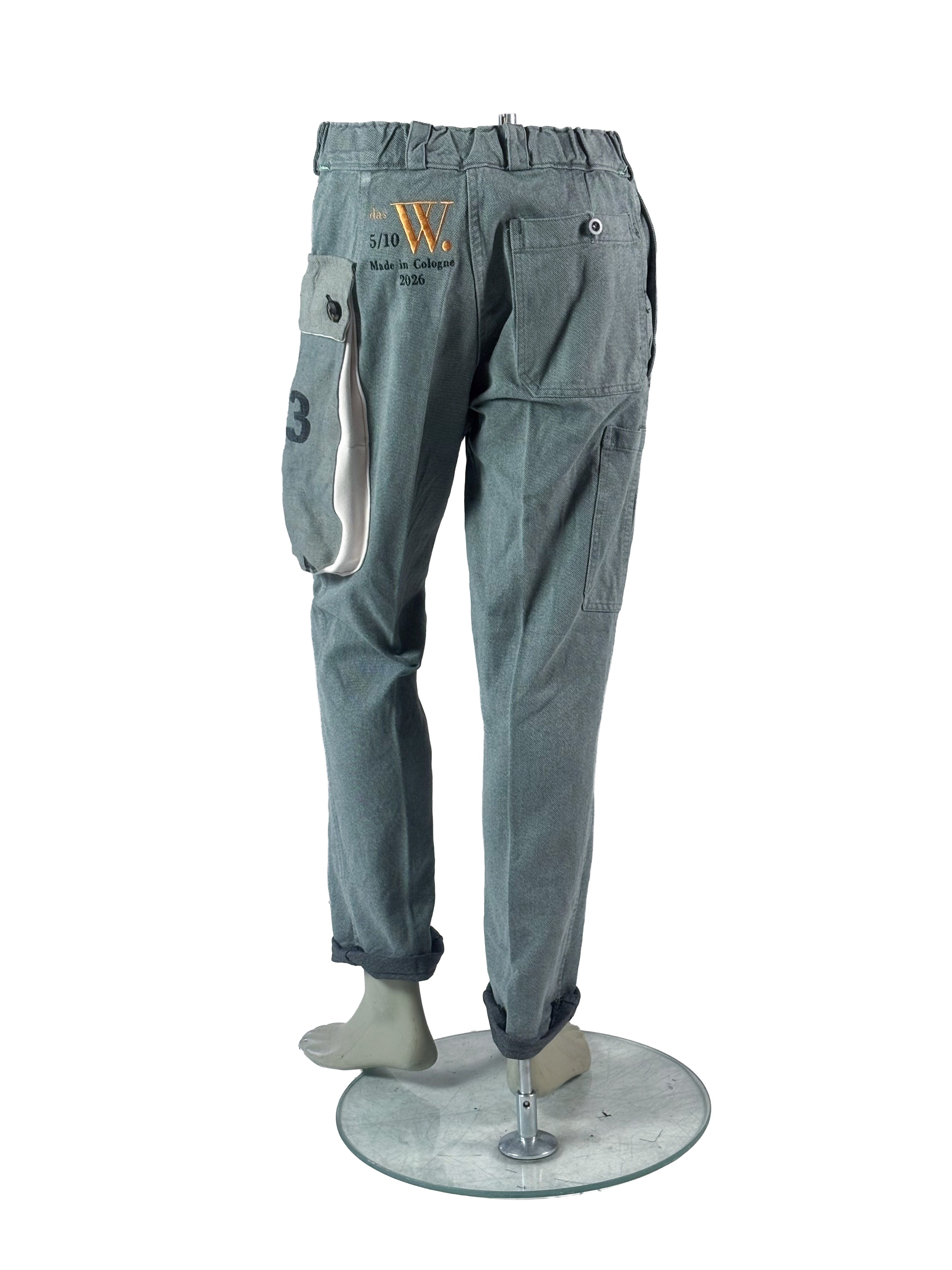 A central design element is the cargo pocket construction. The large applied pockets are made either from vintage post sack fabrics from before the fall of the Berlin Wall or from sturdy linen. Depending on the individual piece, the pockets appear on one side or on both legs, subtly changing the balance and character of each trouser.