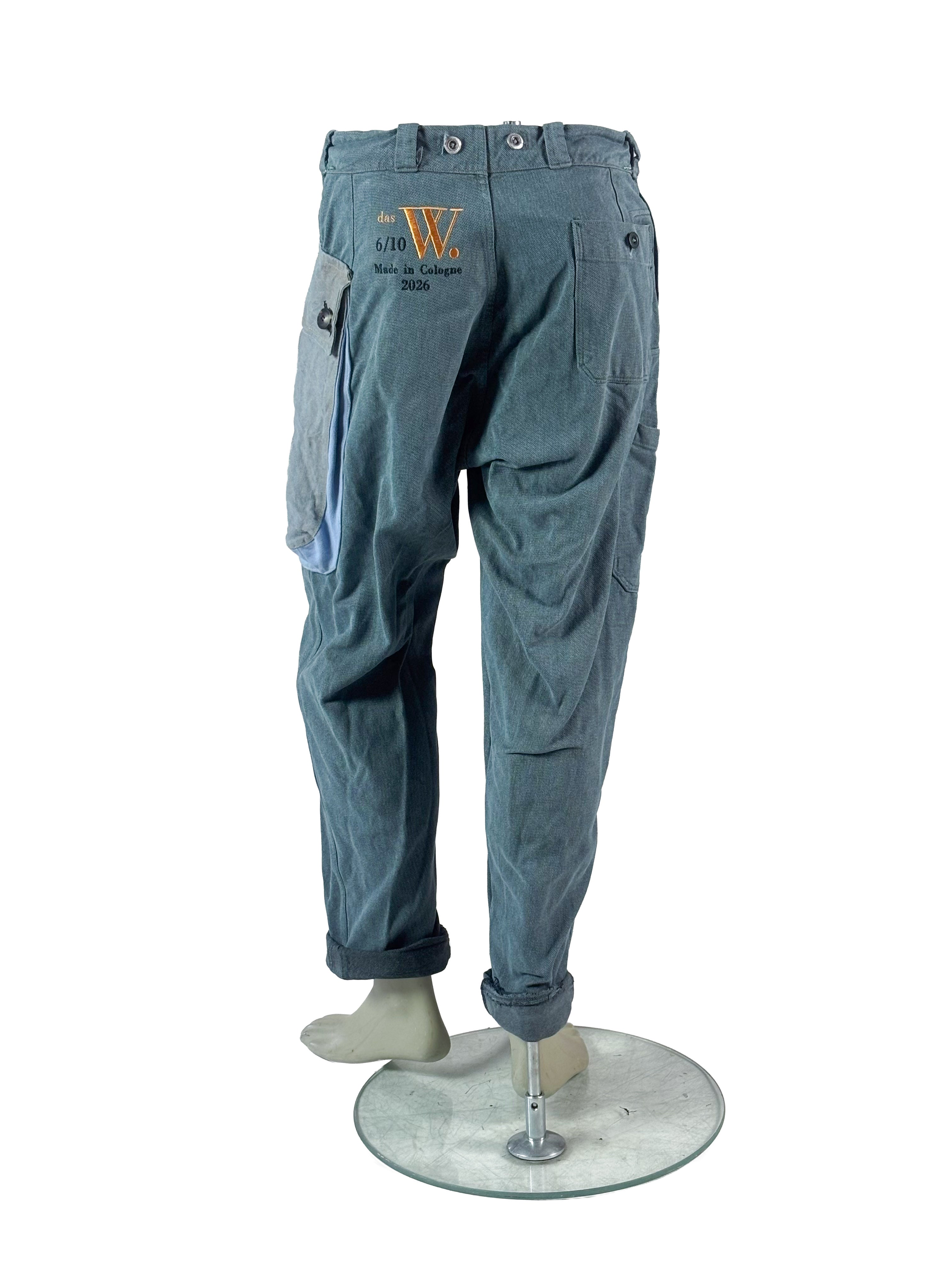 A central design element is the cargo pocket construction. The large applied pockets are made either from vintage post sack fabrics from before the fall of the Berlin Wall or from sturdy linen. Depending on the individual piece, the pockets appear on one side or on both legs, subtly changing the balance and character of each trouser.
