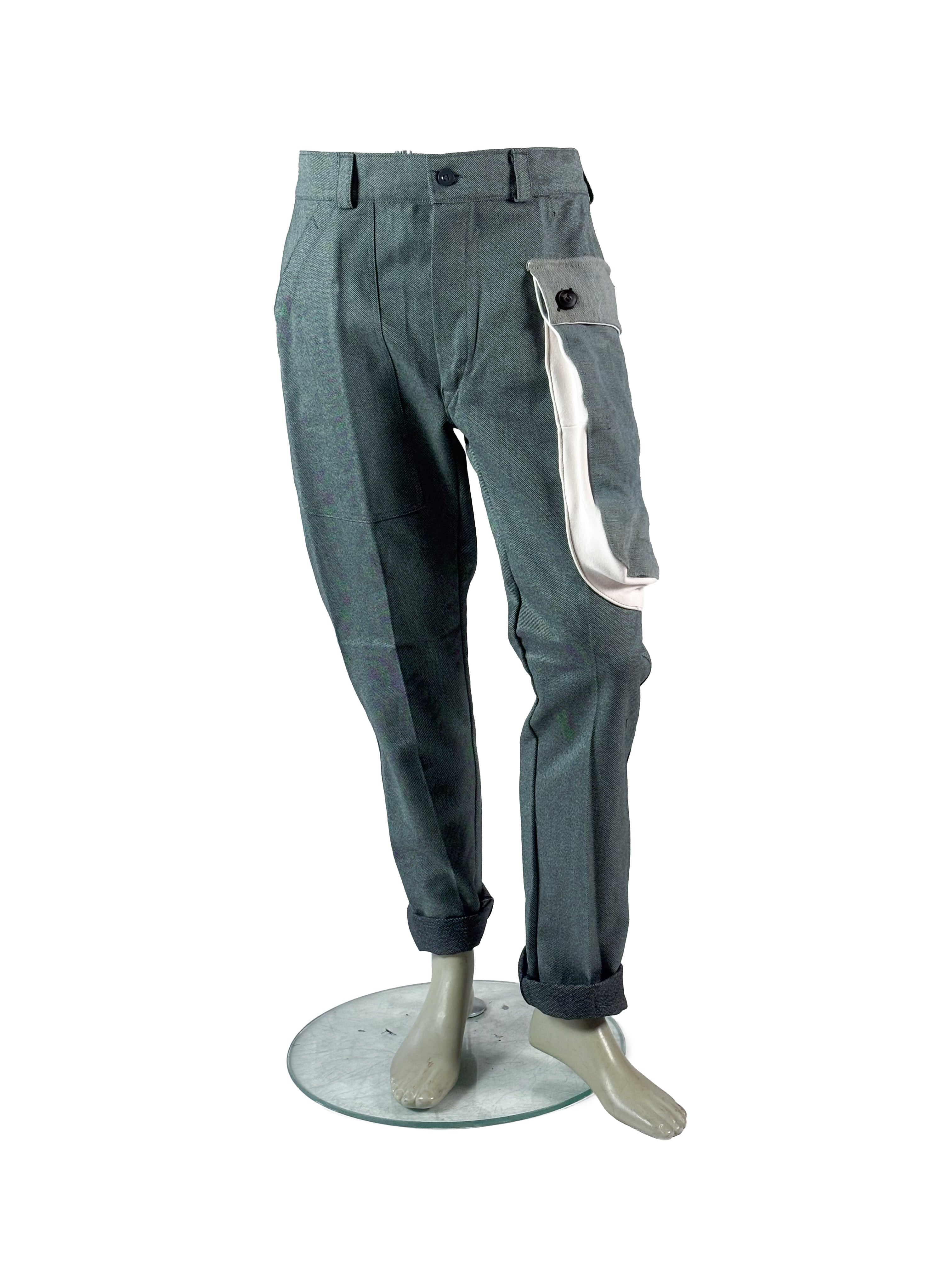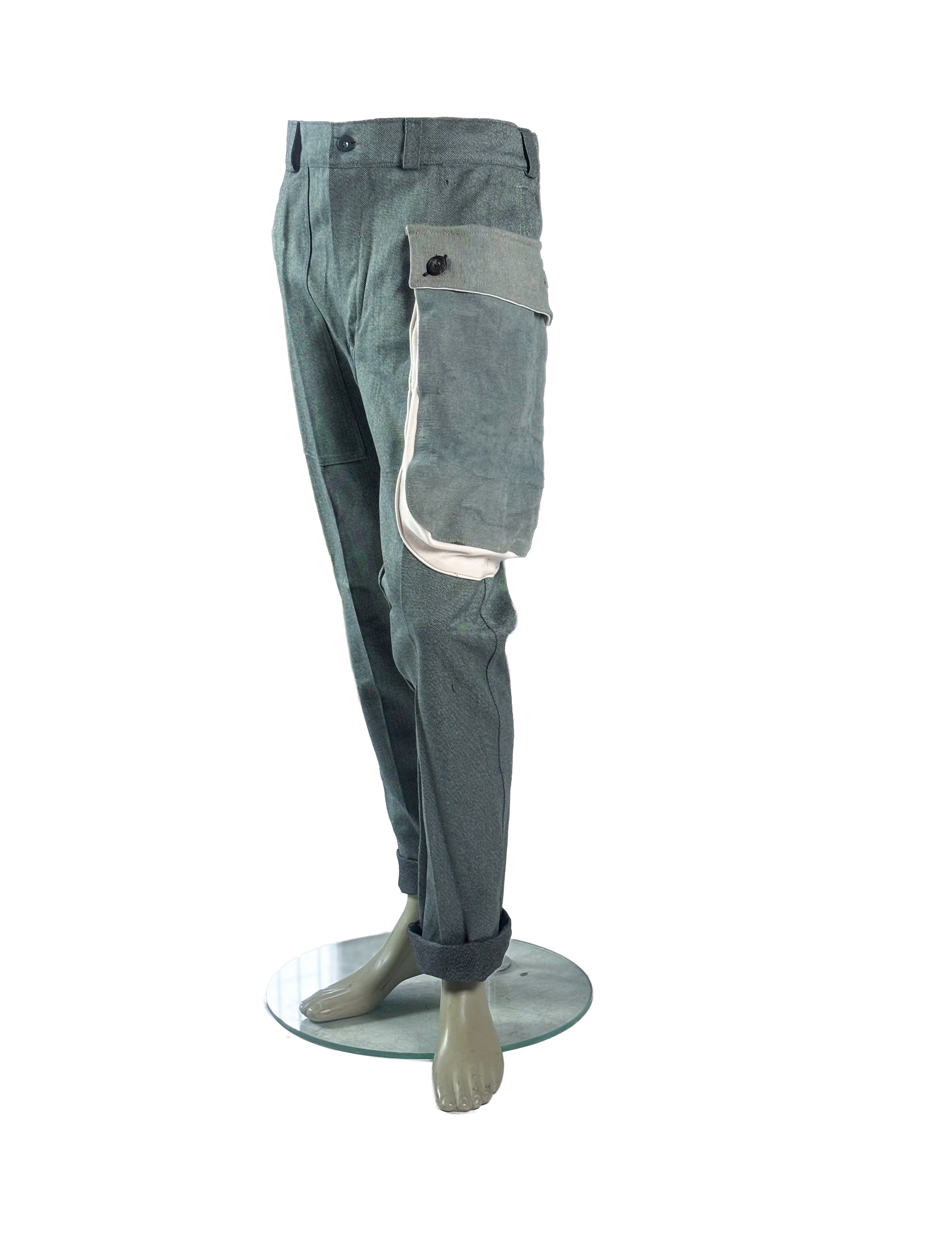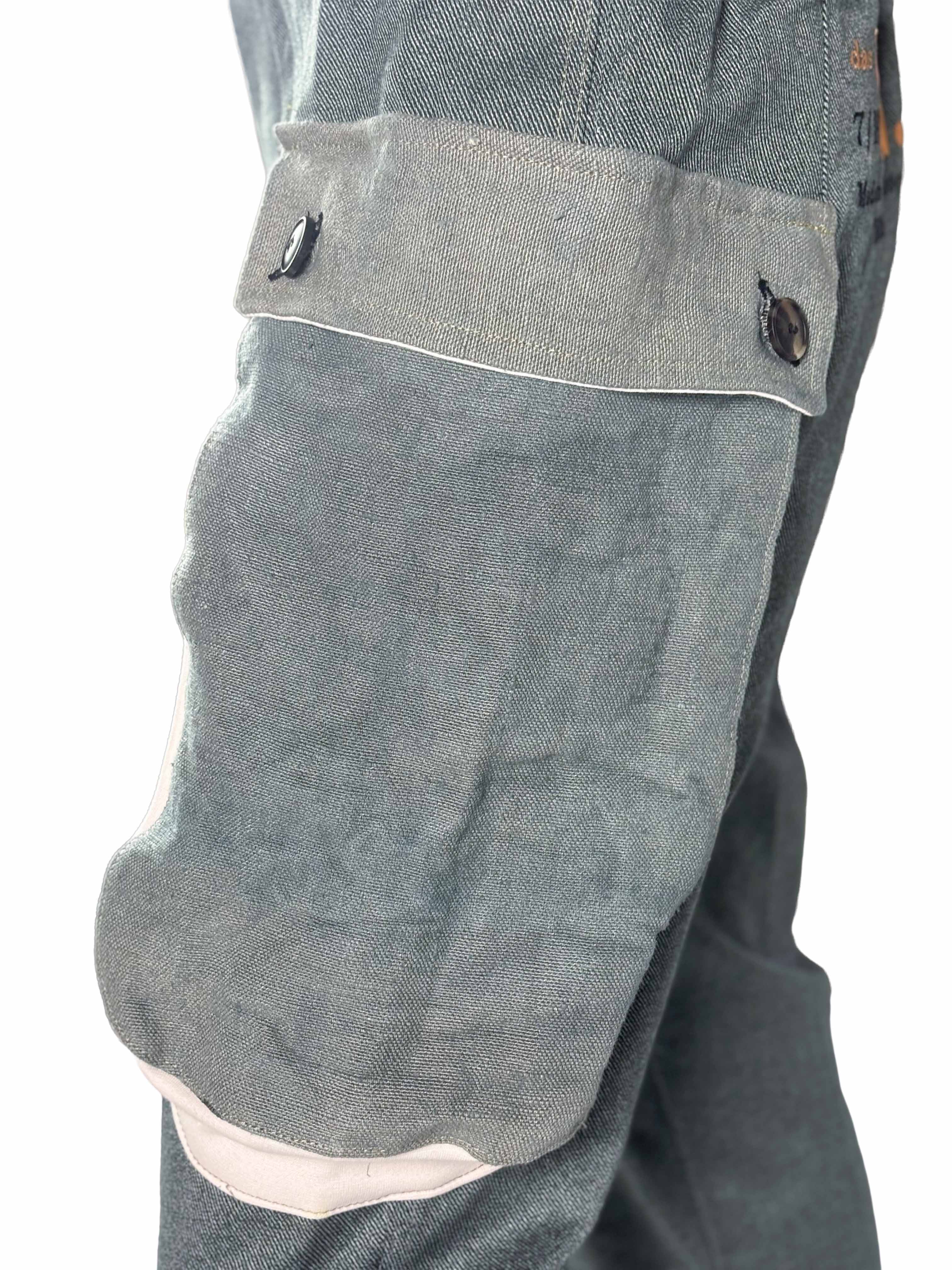 A central design element is the cargo pocket construction. The large applied pockets are made either from vintage post sack fabrics from before the fall of the Berlin Wall or from sturdy linen. Depending on the individual piece, the pockets appear on one side or on both legs, subtly changing the balance and character of each trouser.