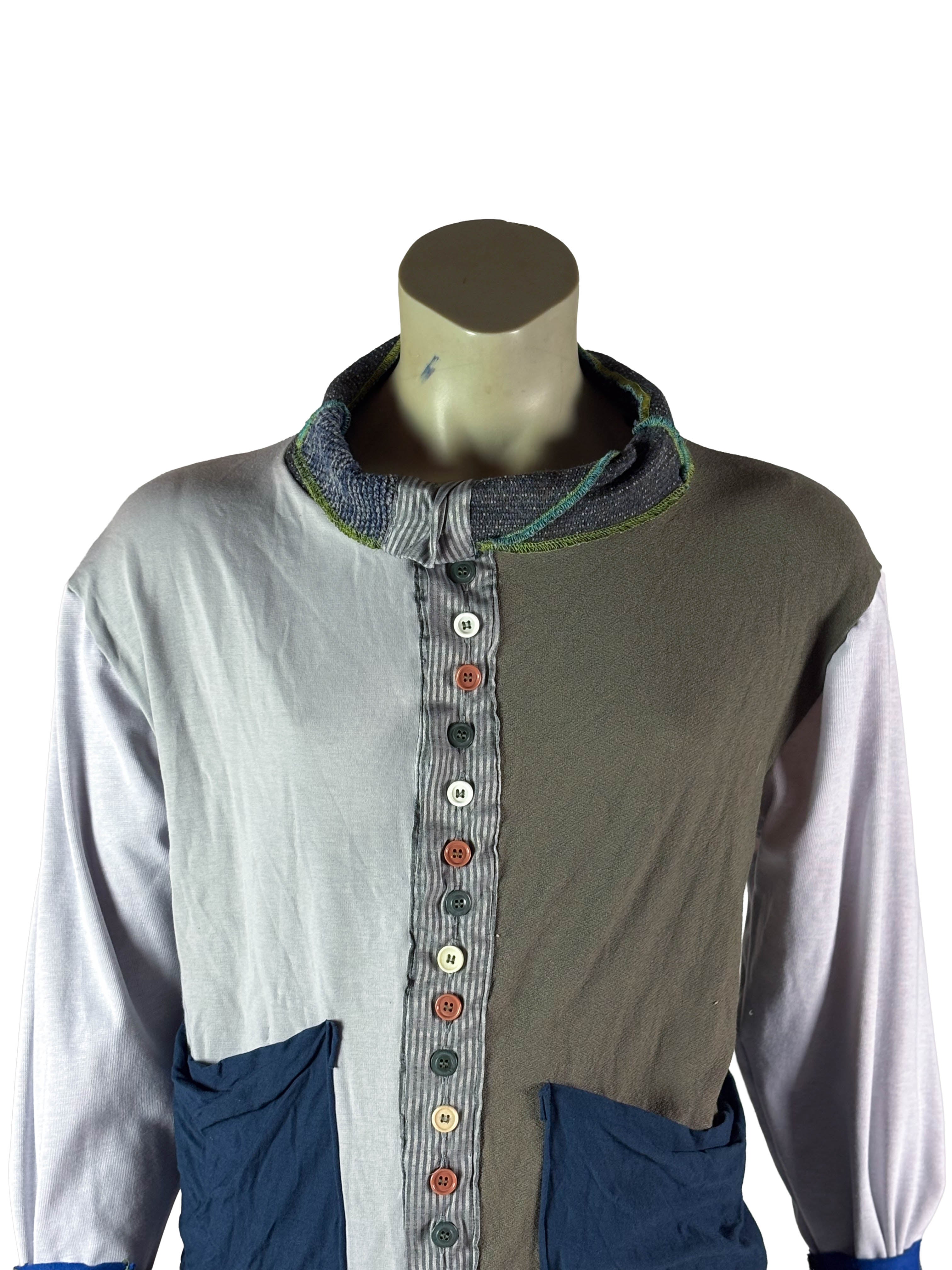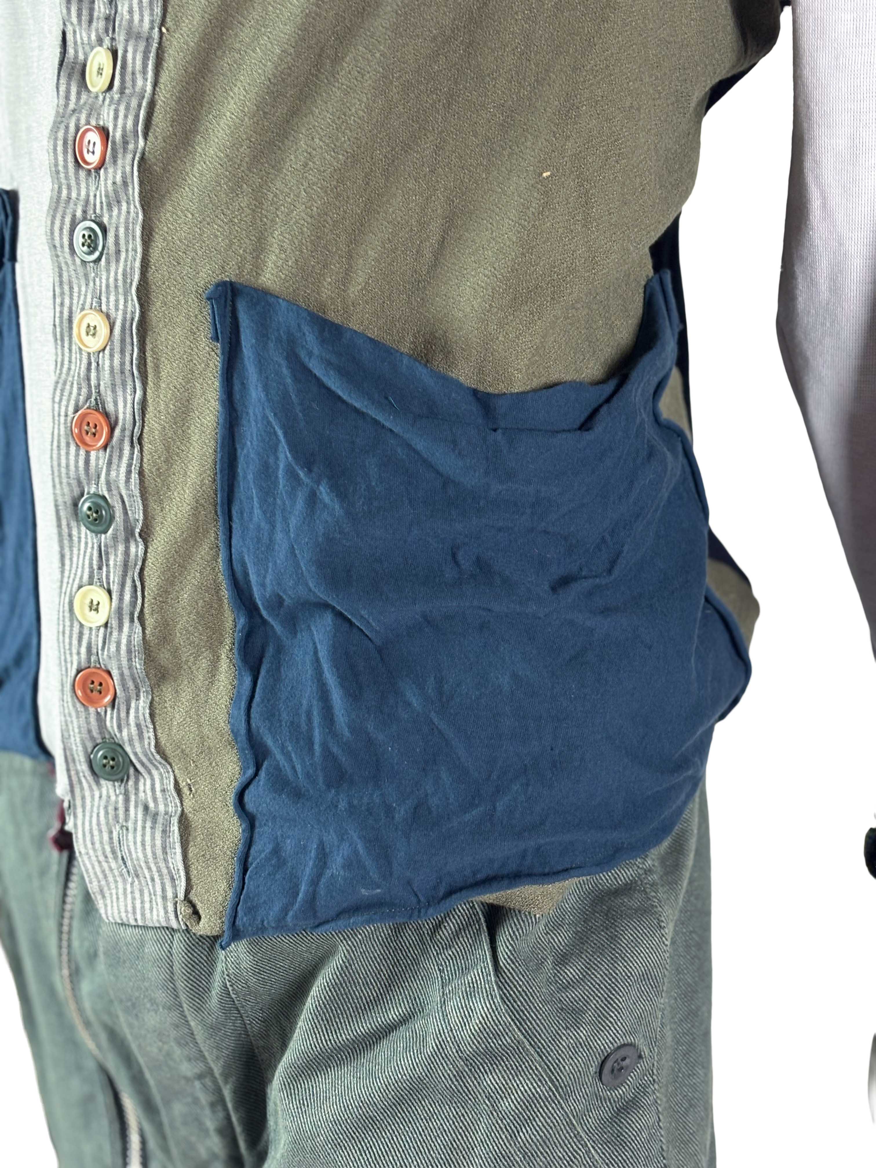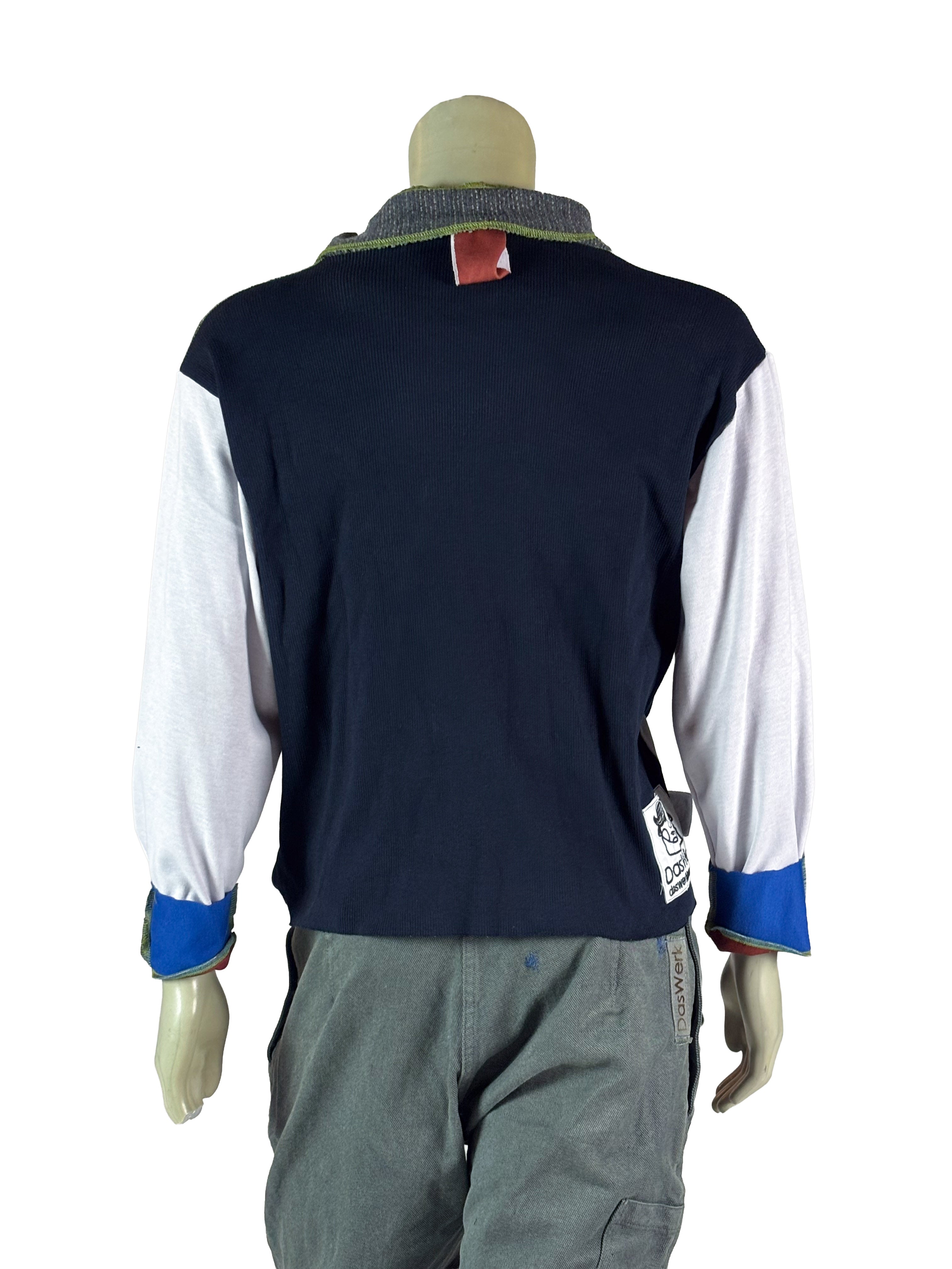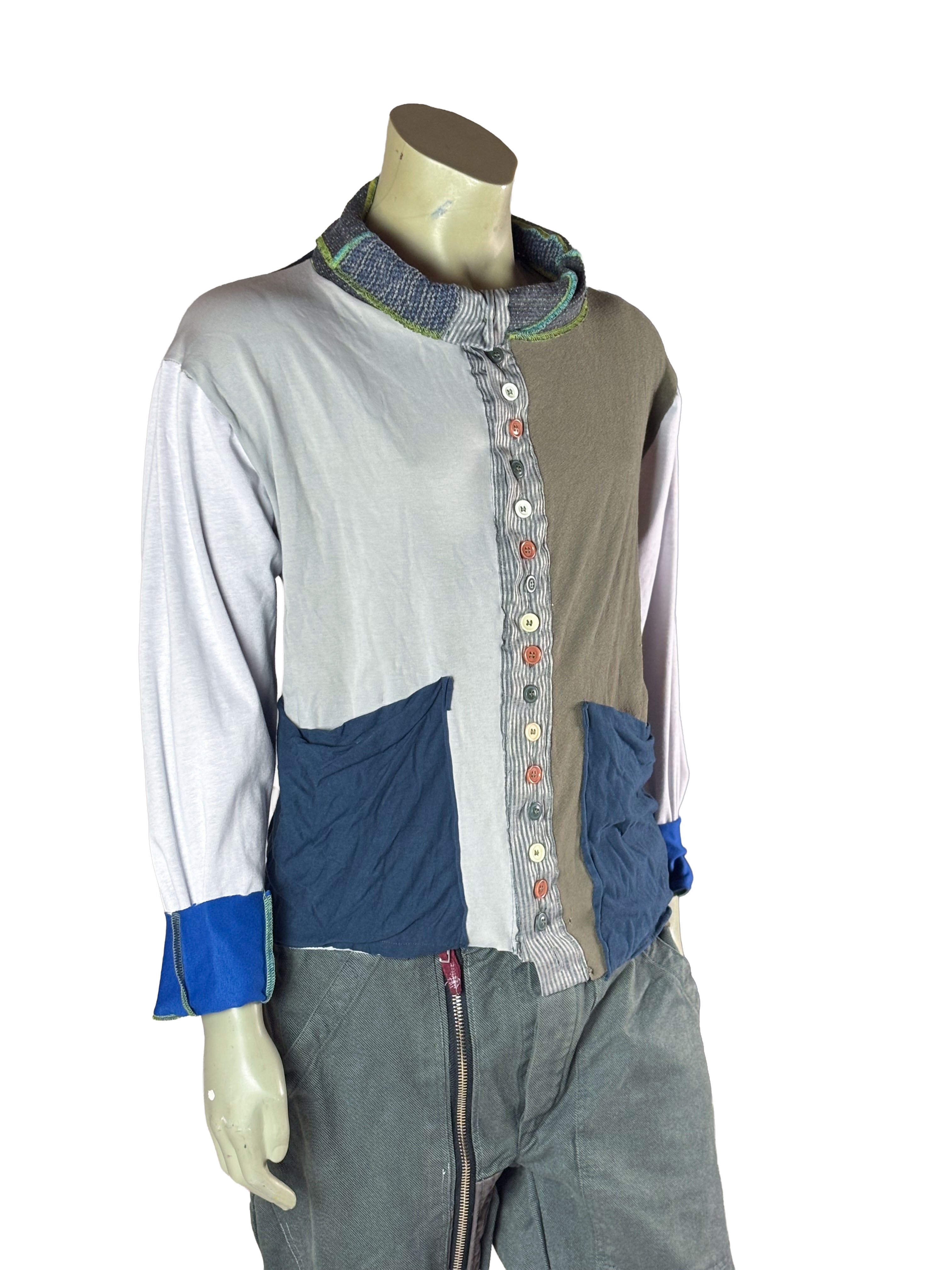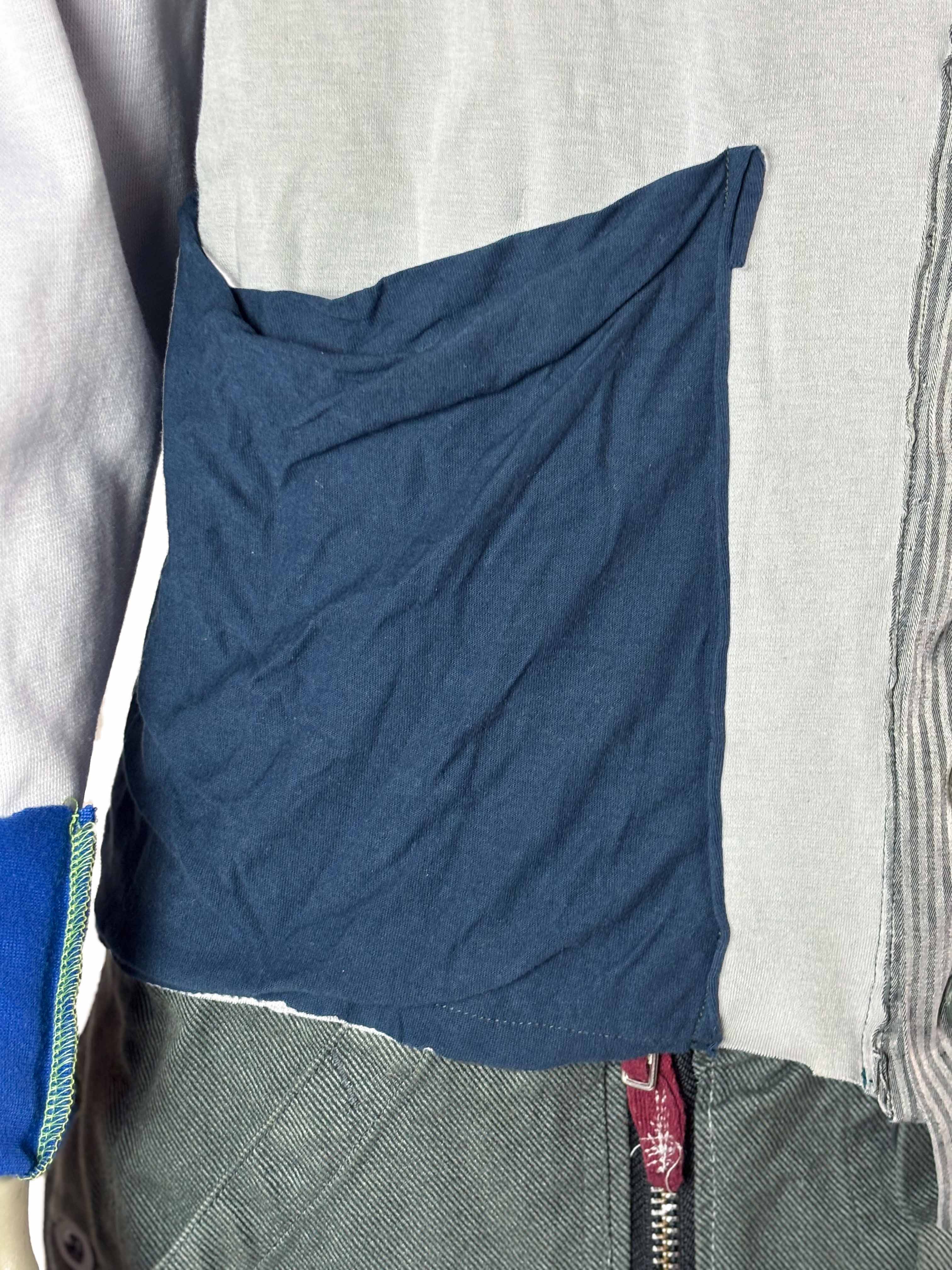 Each shirt in this series is built from a deliberate composition of contrasting fabrics, tones and surface structures. Different materials are combined into a single architectural garment, where visible seams, layered panels and raw edges reveal the construction process rather than hiding it.