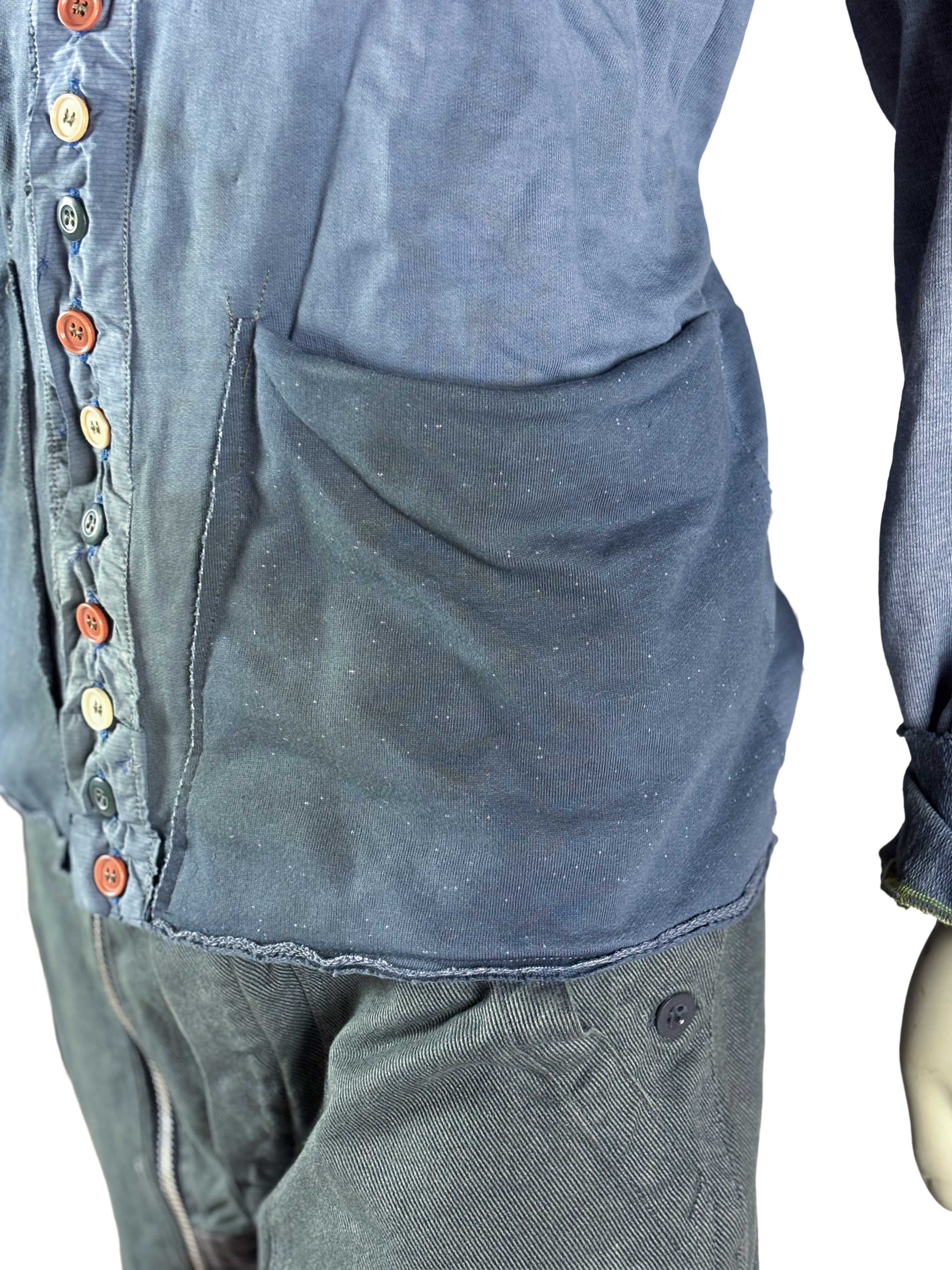 Each shirt in this series is built from a deliberate composition of contrasting fabrics, tones and surface structures. Different materials are combined into a single architectural garment, where visible seams, layered panels and raw edges reveal the construction process rather than hiding it.