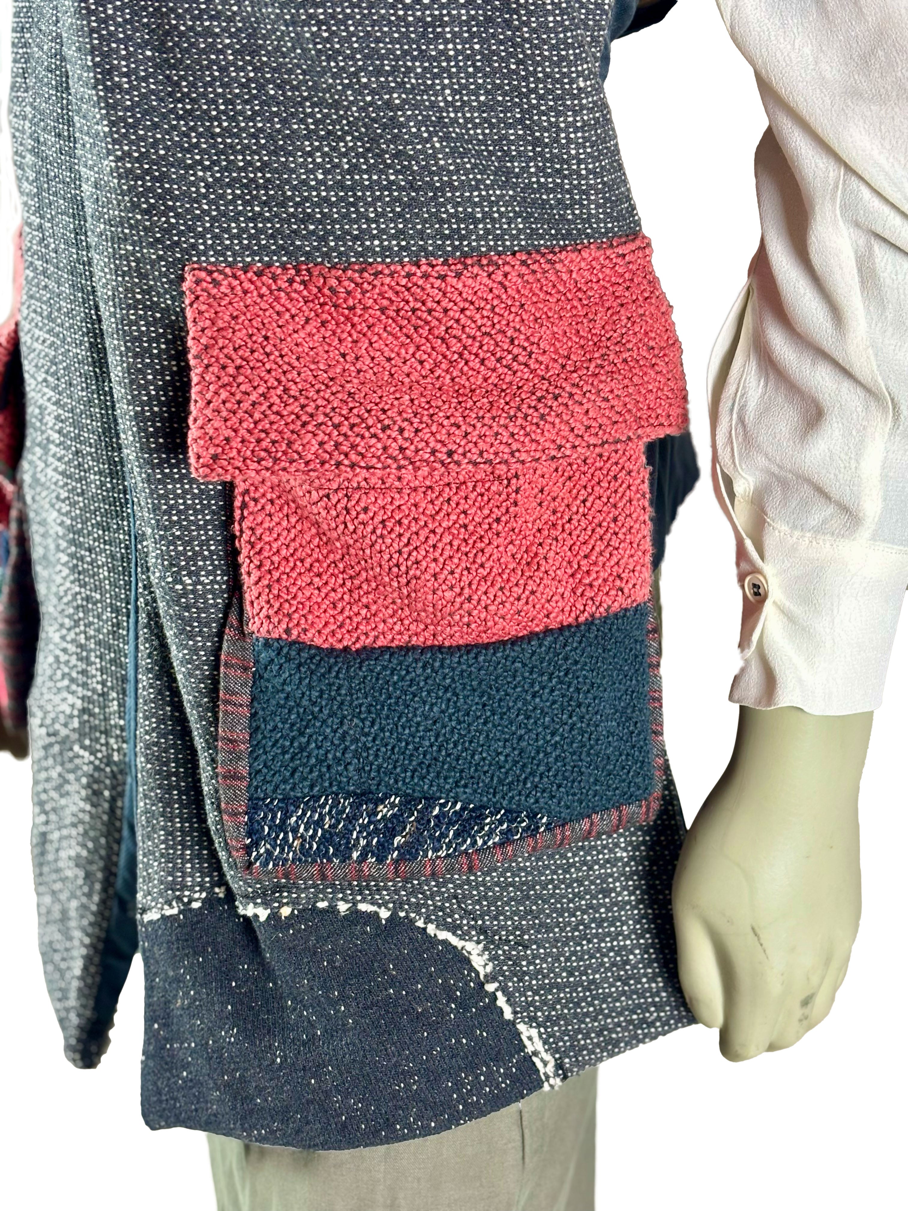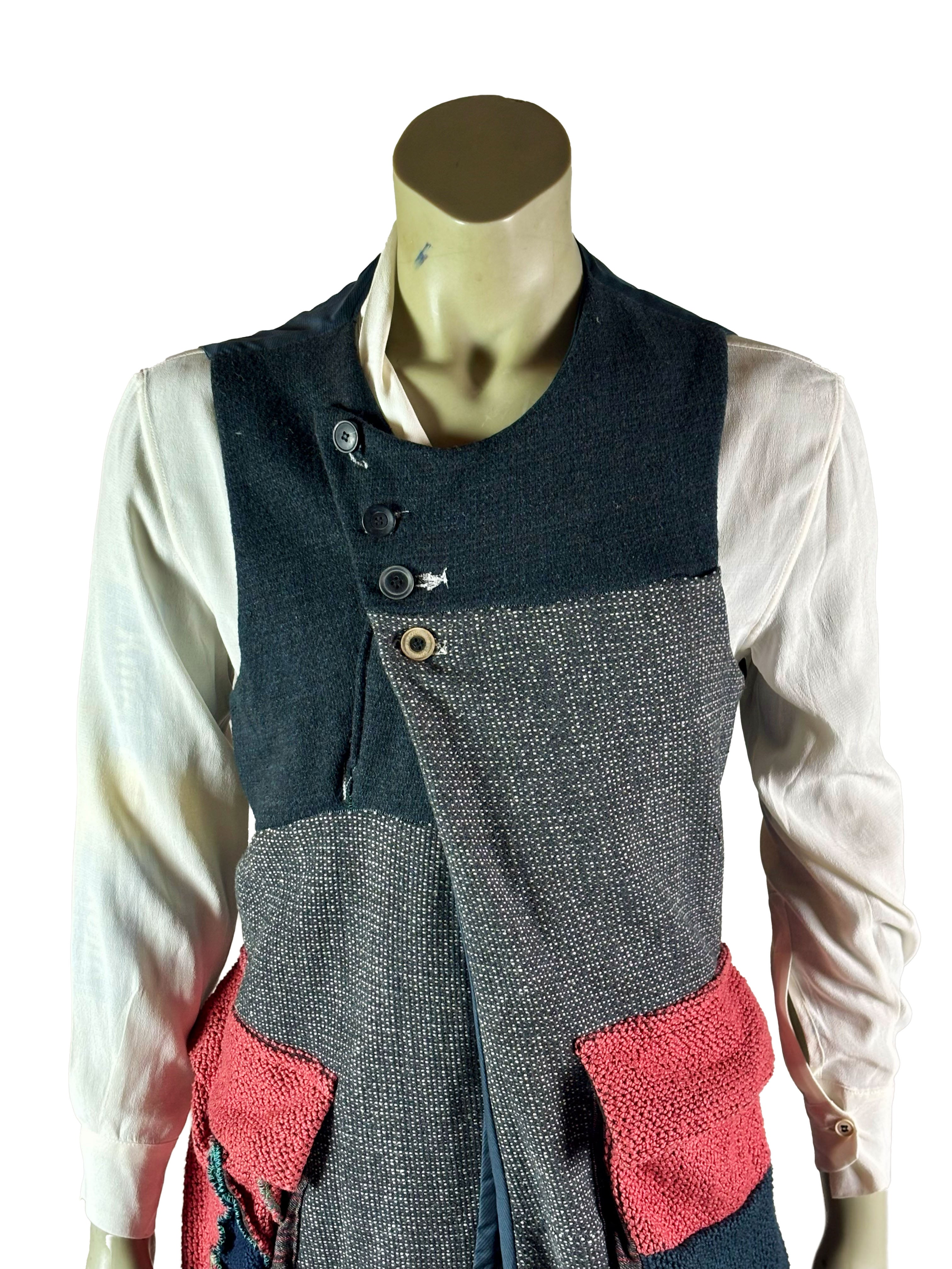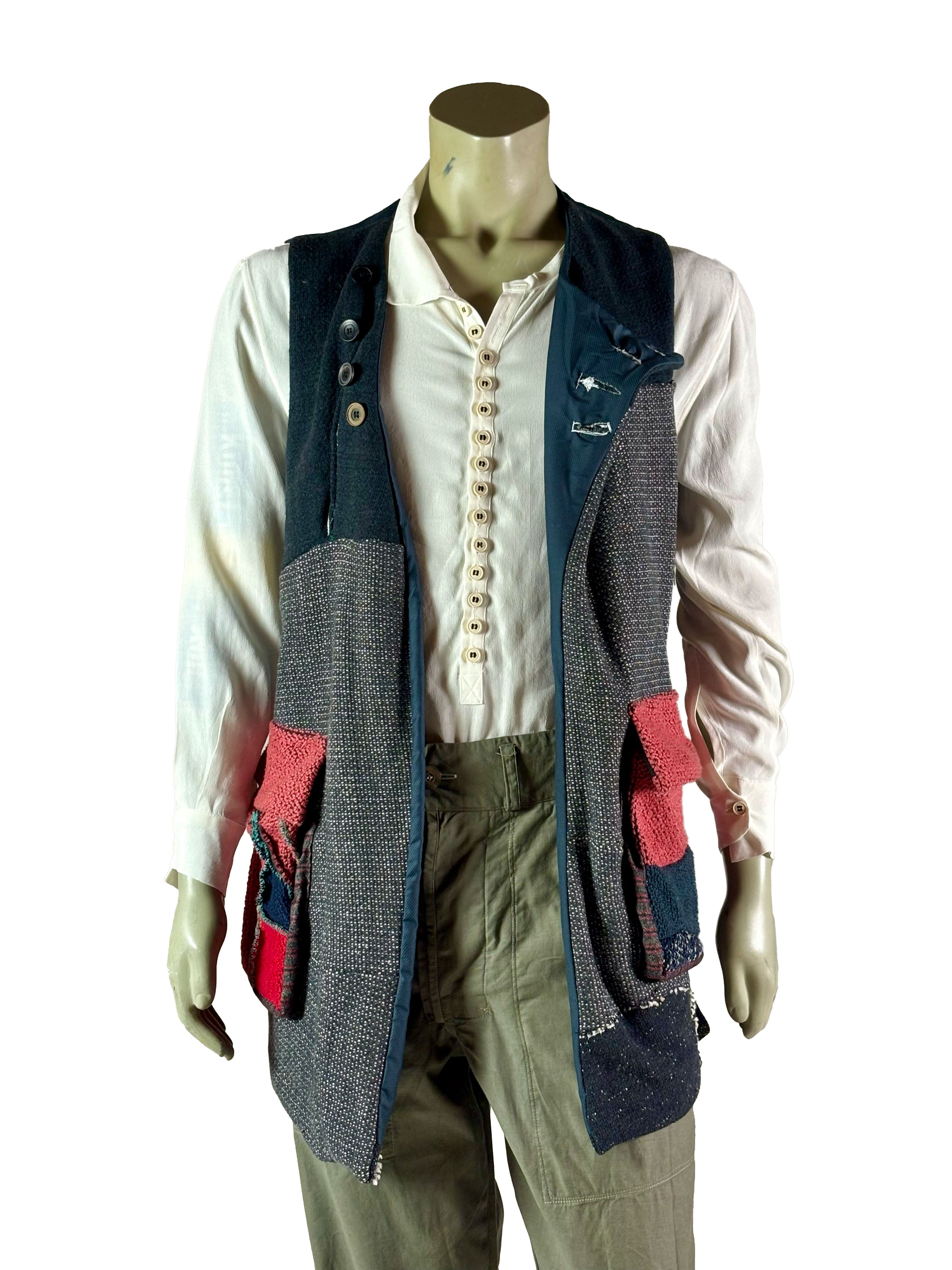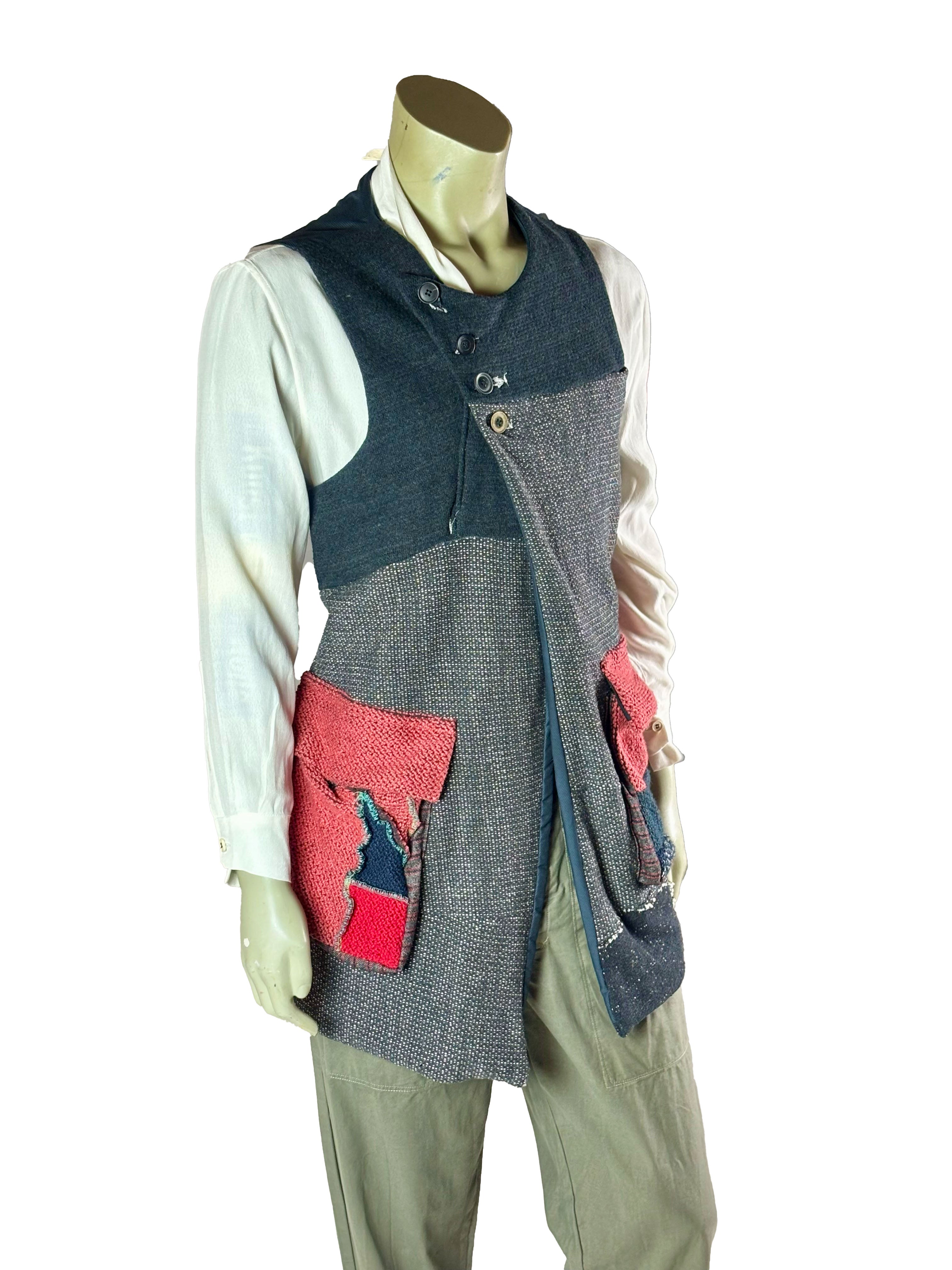 This long vest is crafted from a heavy, structured knitted fabric and is designed as an independent layering piece. The material adds depth and substance, while the calm, open construction emphasizes the handcrafted character of the garment.