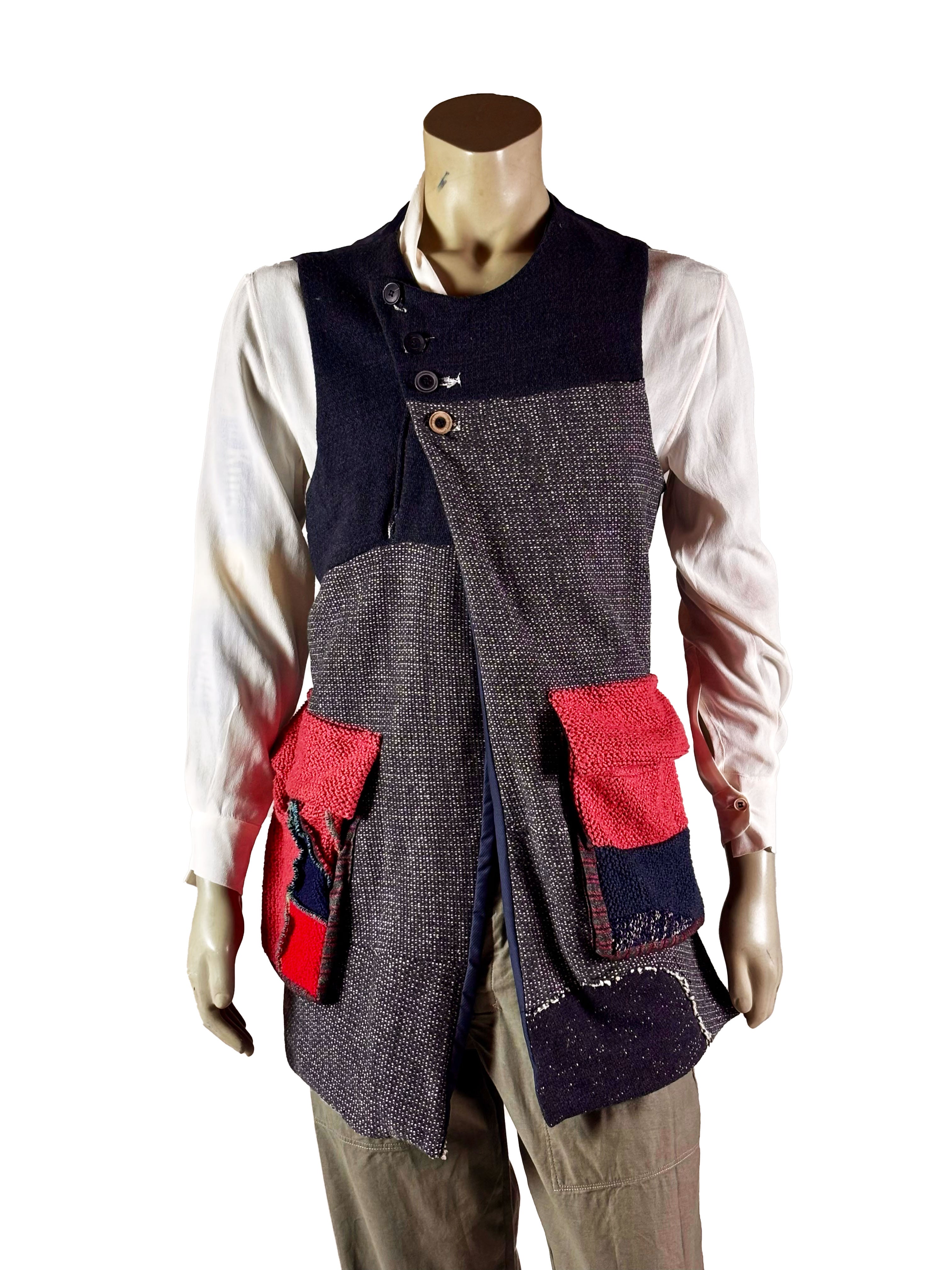 The silhouette is asymmetrical: extended in the front and deliberately shorter in the back. This contrast creates a clear line and allows the vest to move naturally with the body. Two front pockets are integrated as functional elements and also serve as defining visual details.