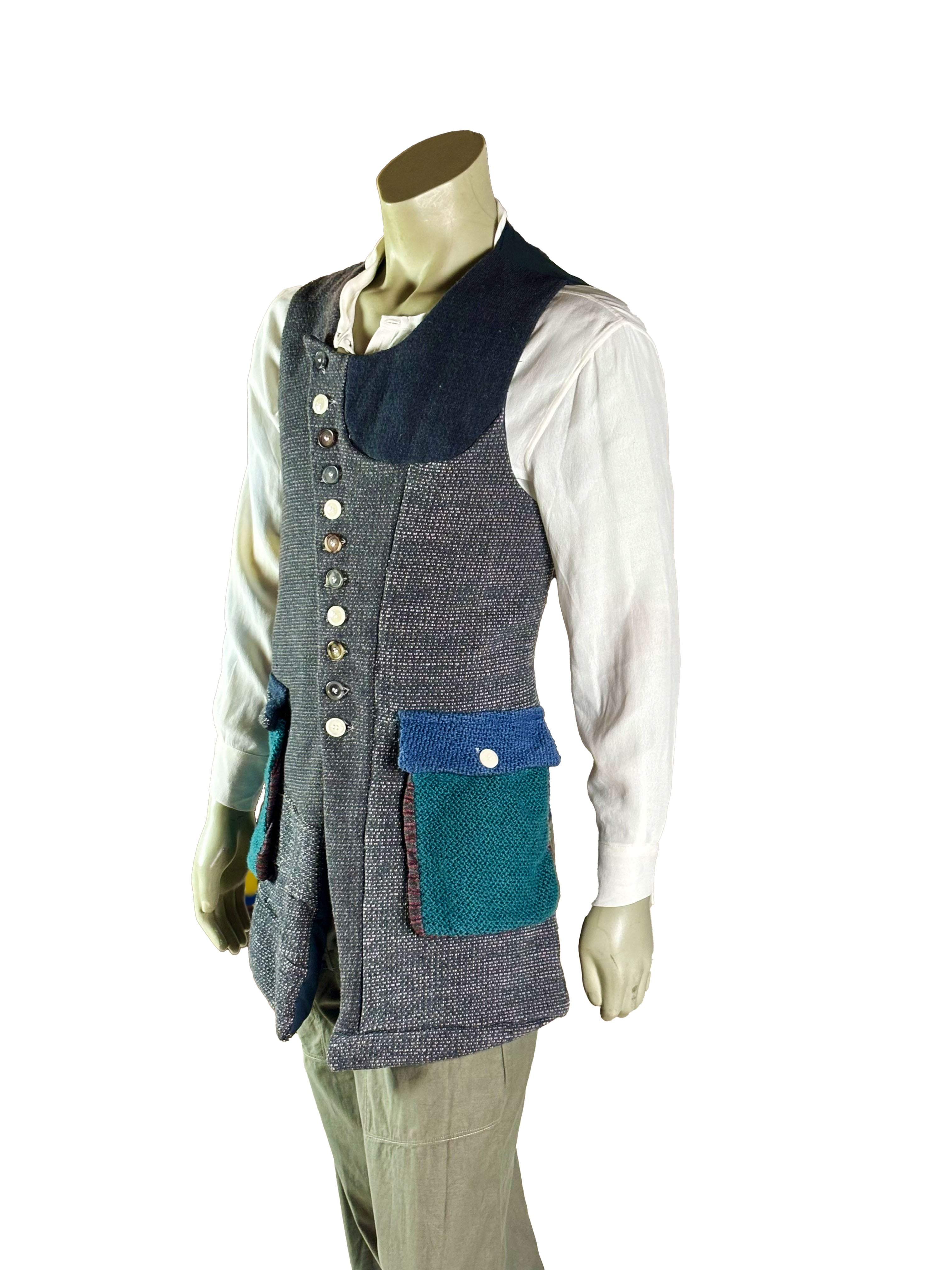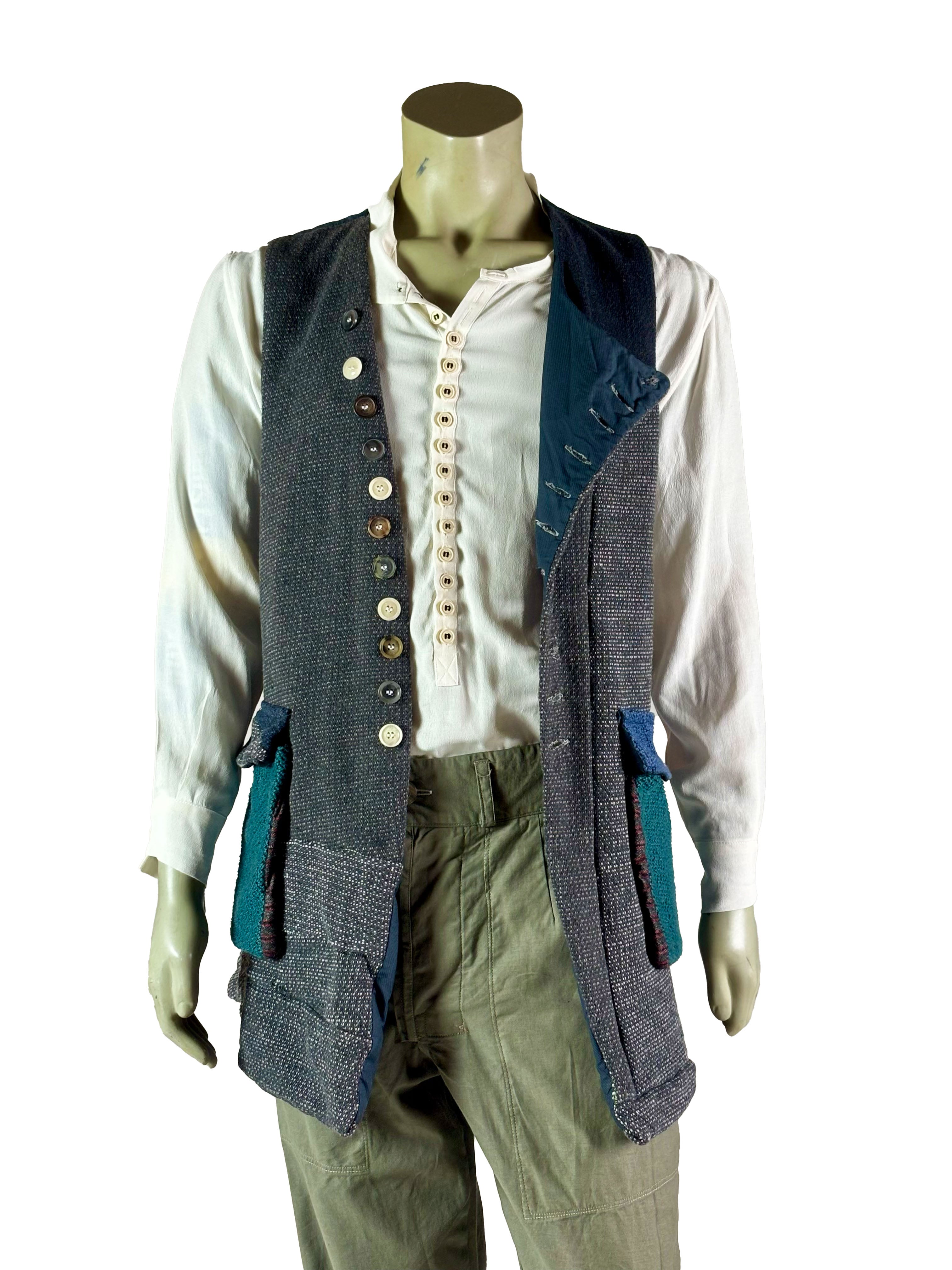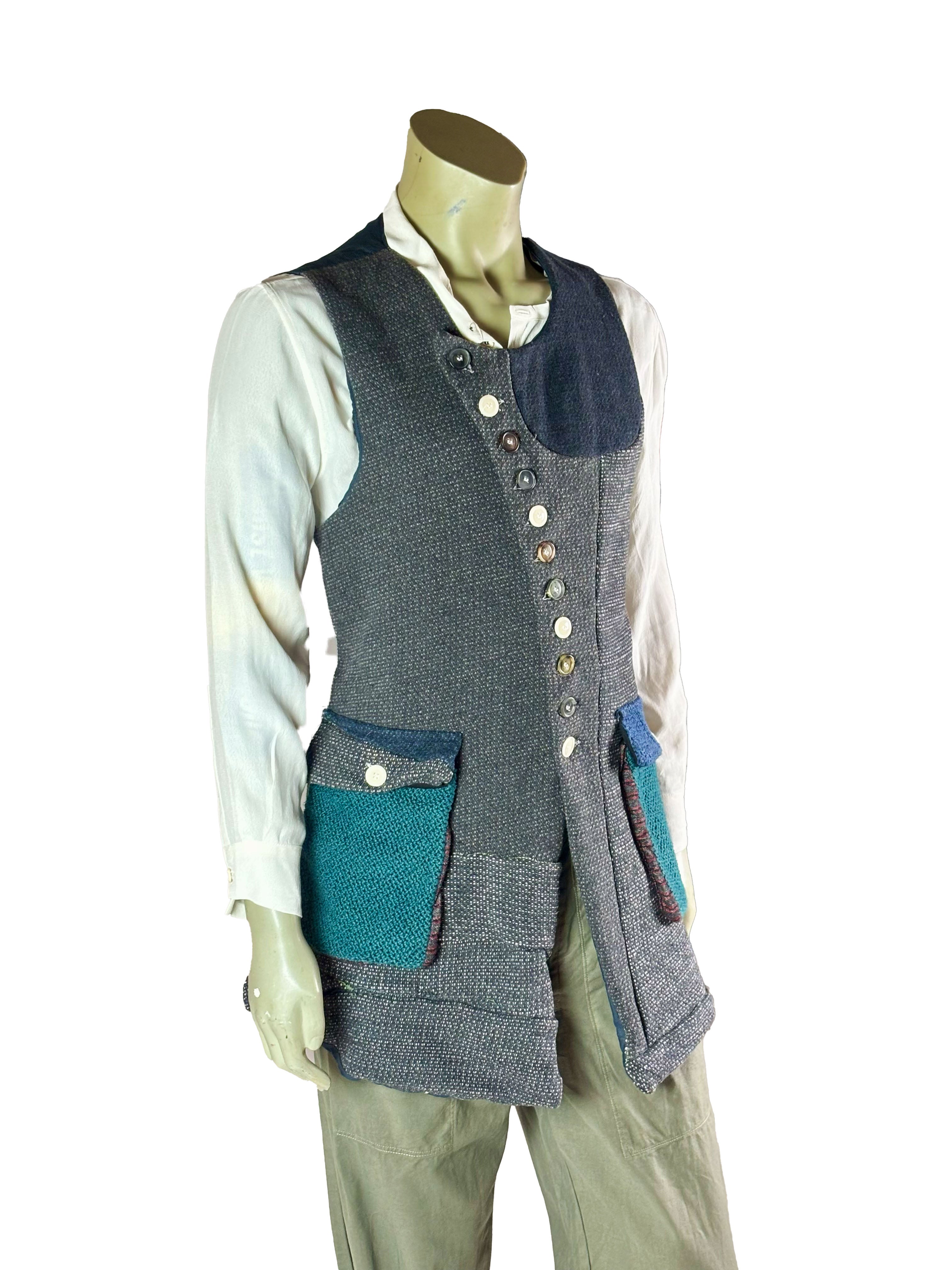 The vest features a button closure at the front, with each button contributing to the unique, one-of-a-kind character of the piece. Subtle variations in texture and tone highlight the artisanal construction and make each vest entirely individual.