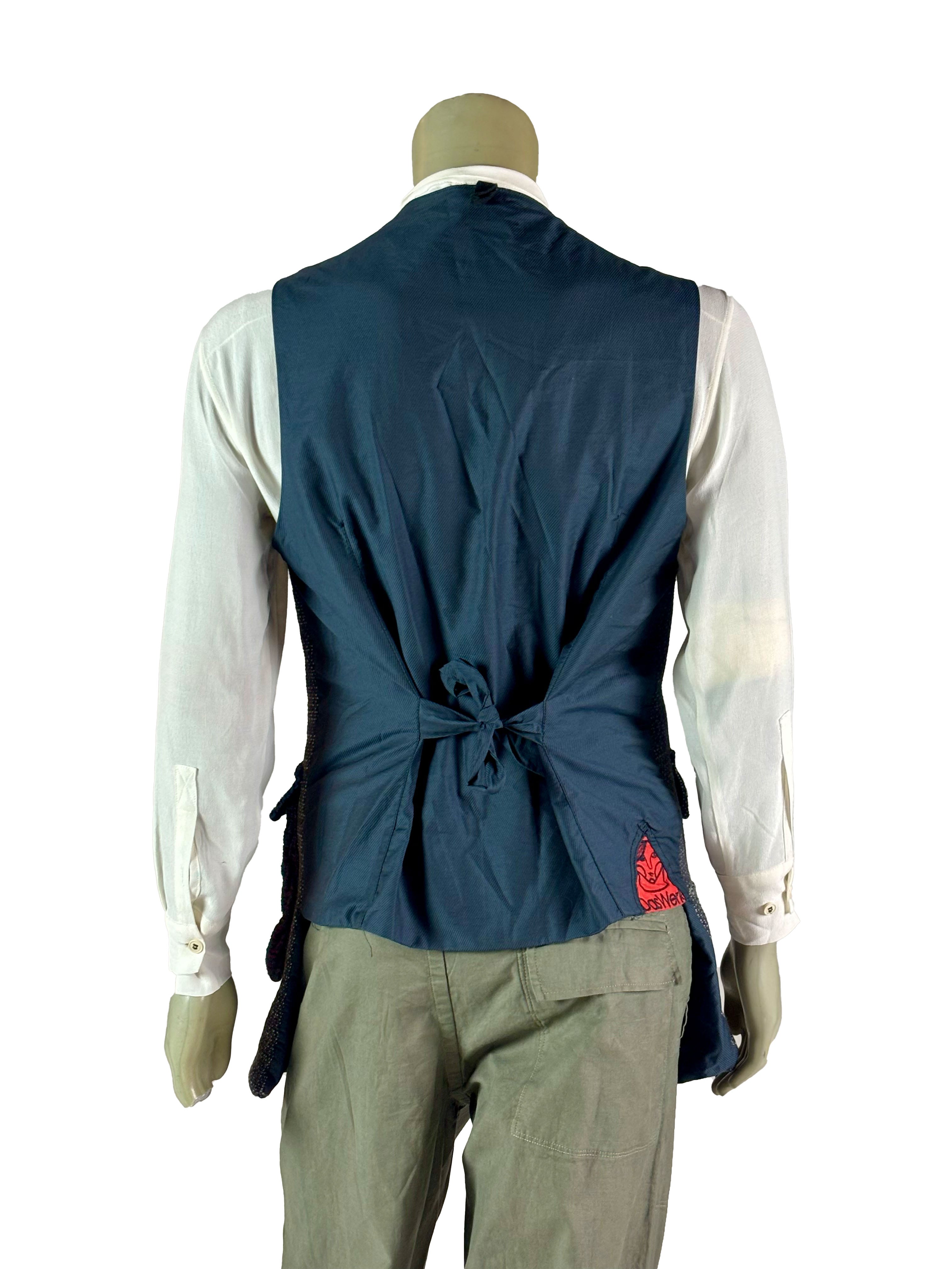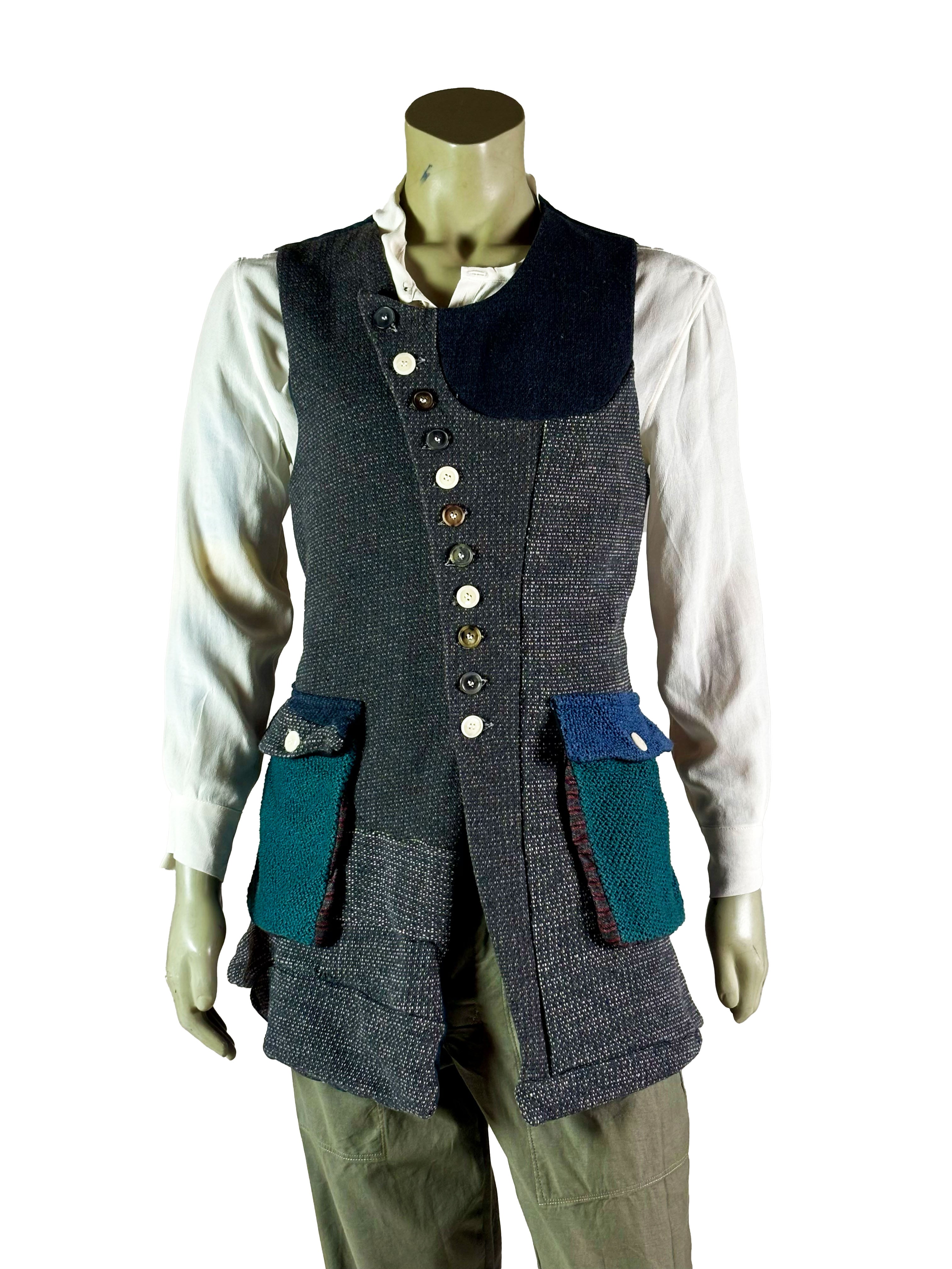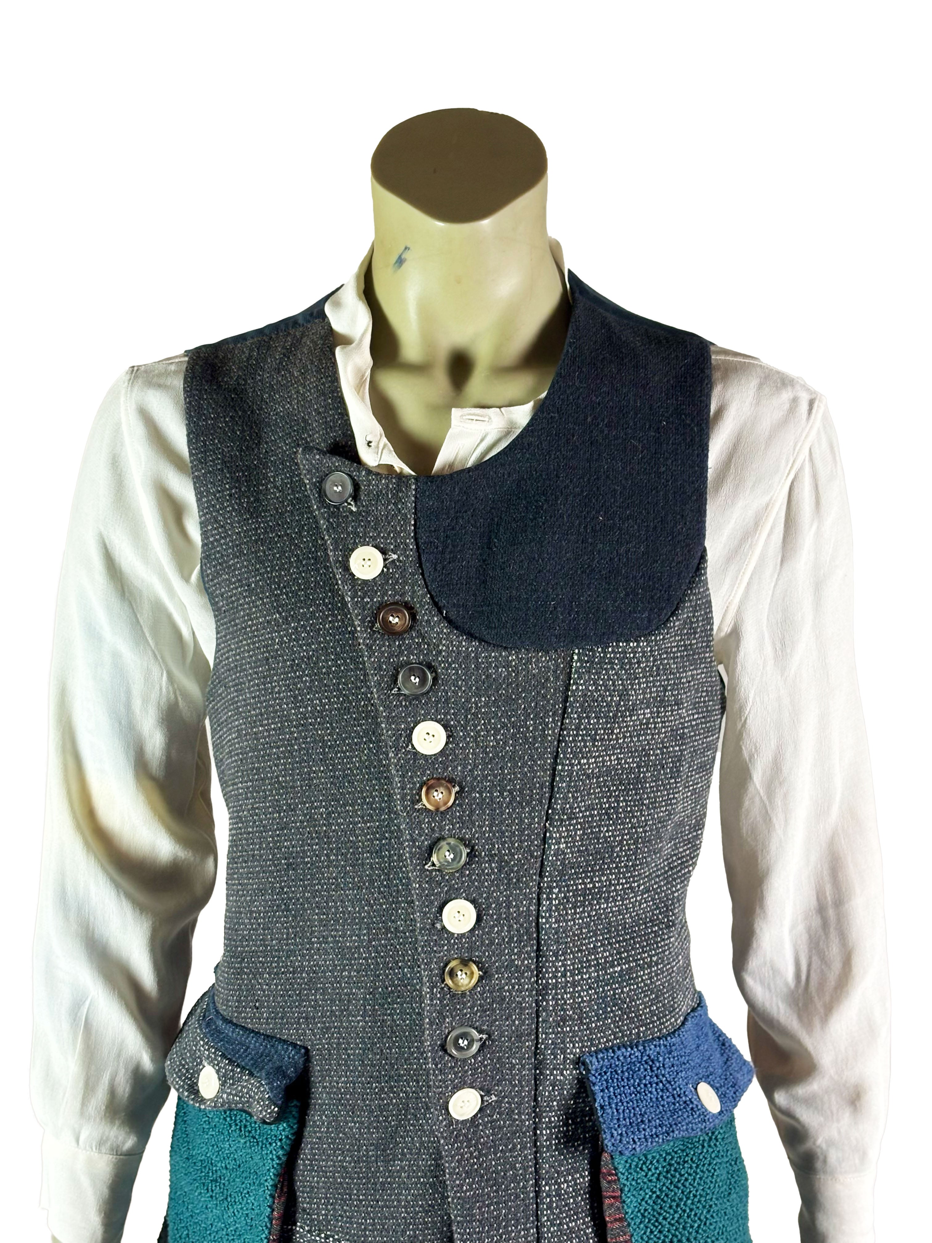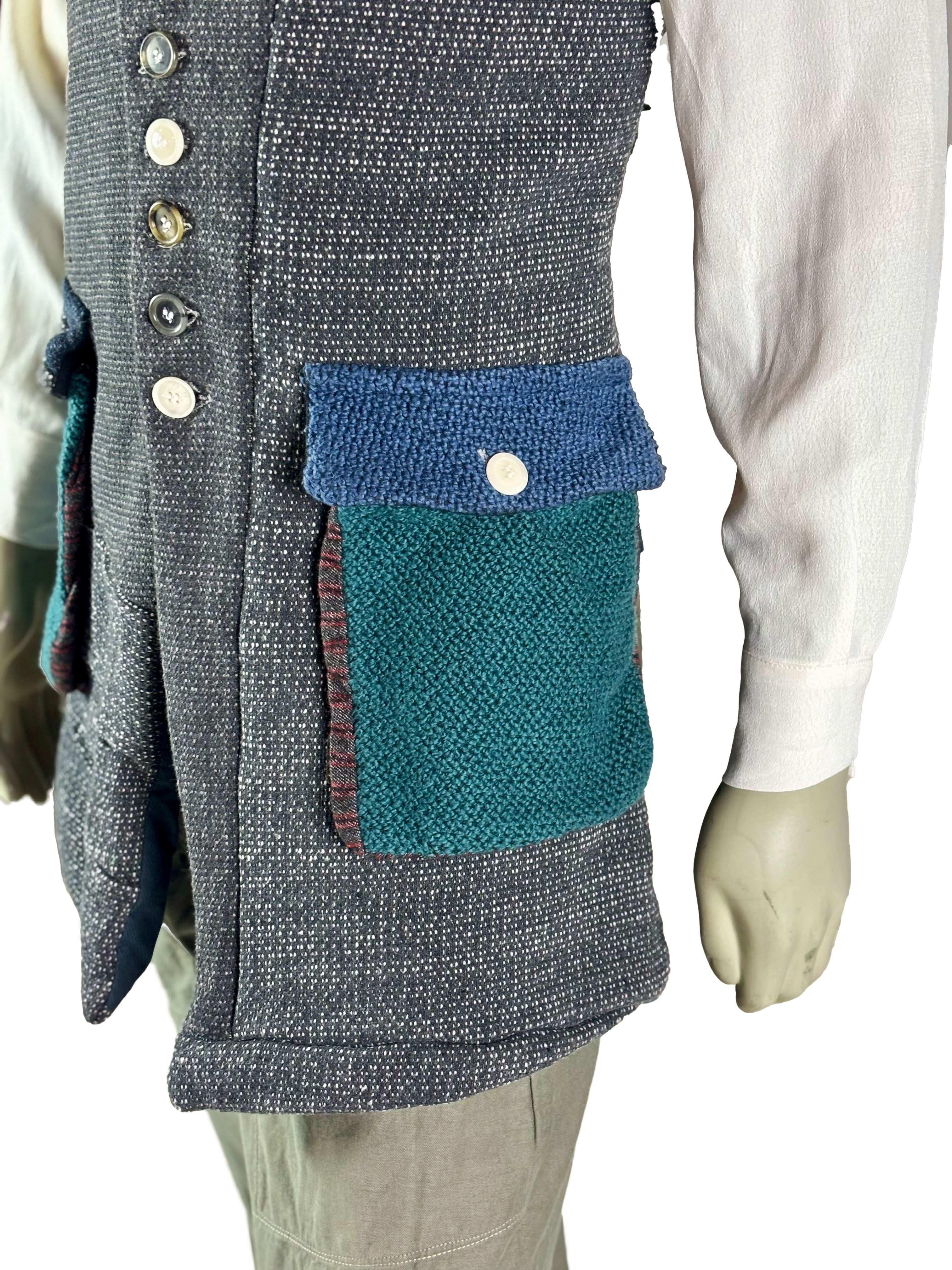 The vest features a button closure at the front, with each button contributing to the unique, one-of-a-kind character of the piece. Subtle variations in texture and tone highlight the artisanal construction and make each vest entirely individual.