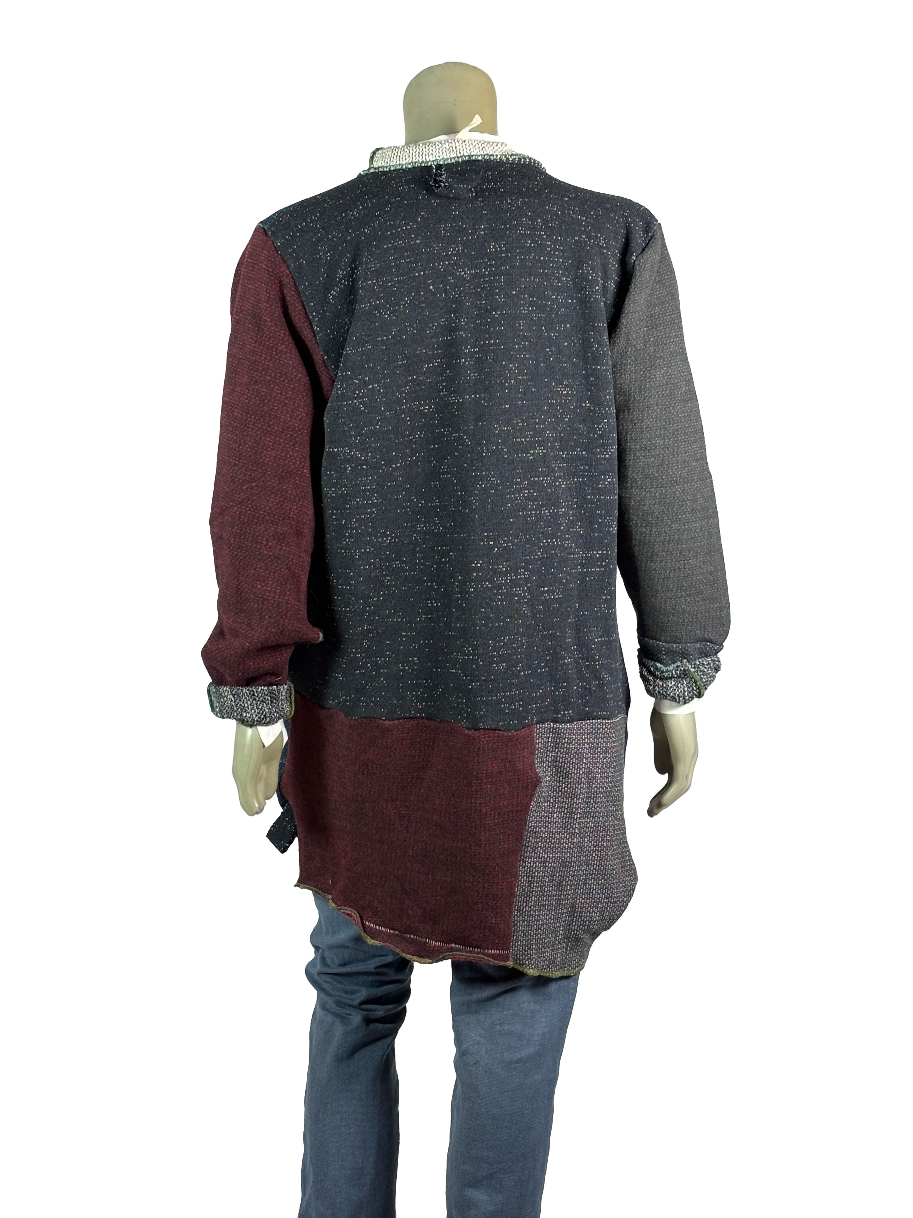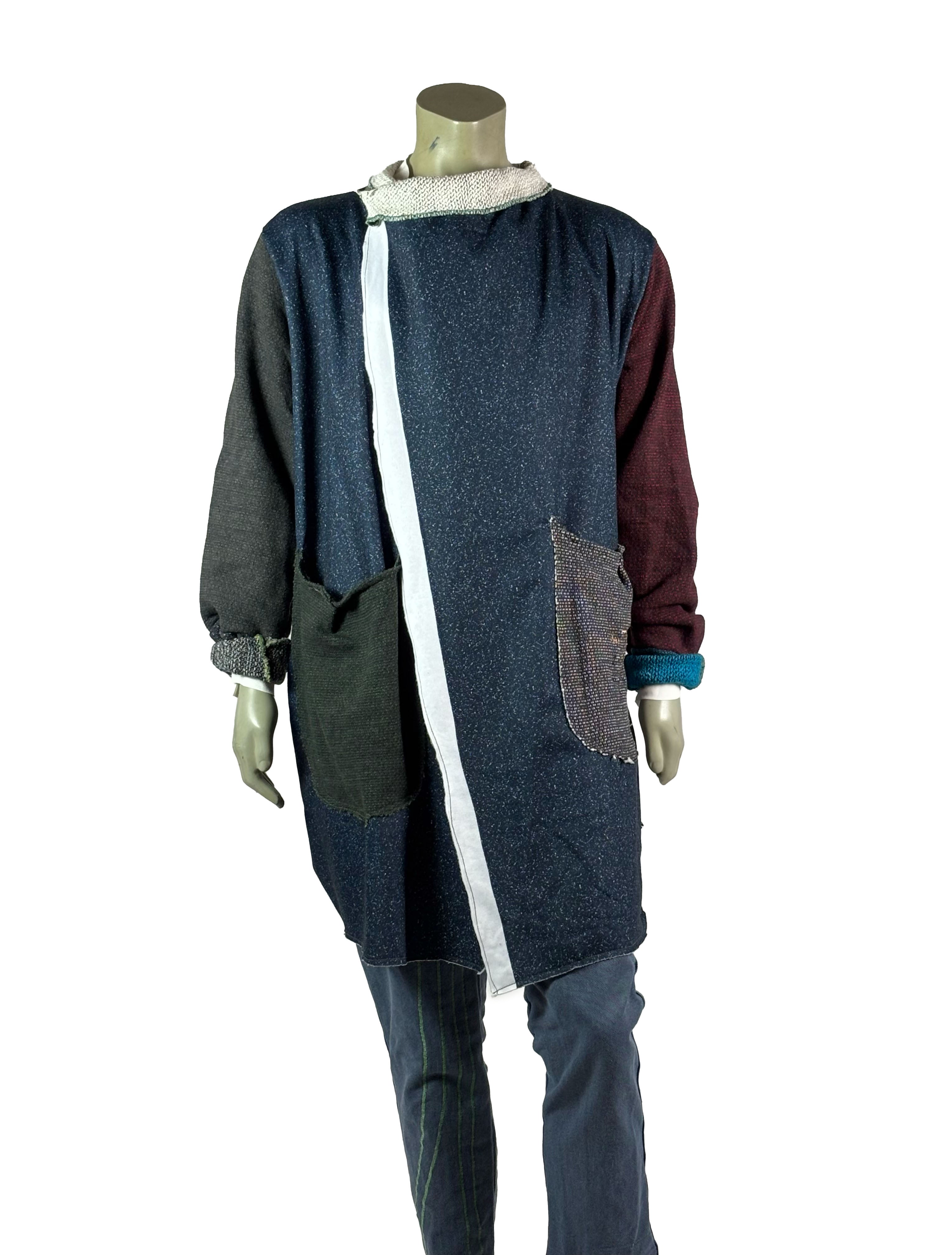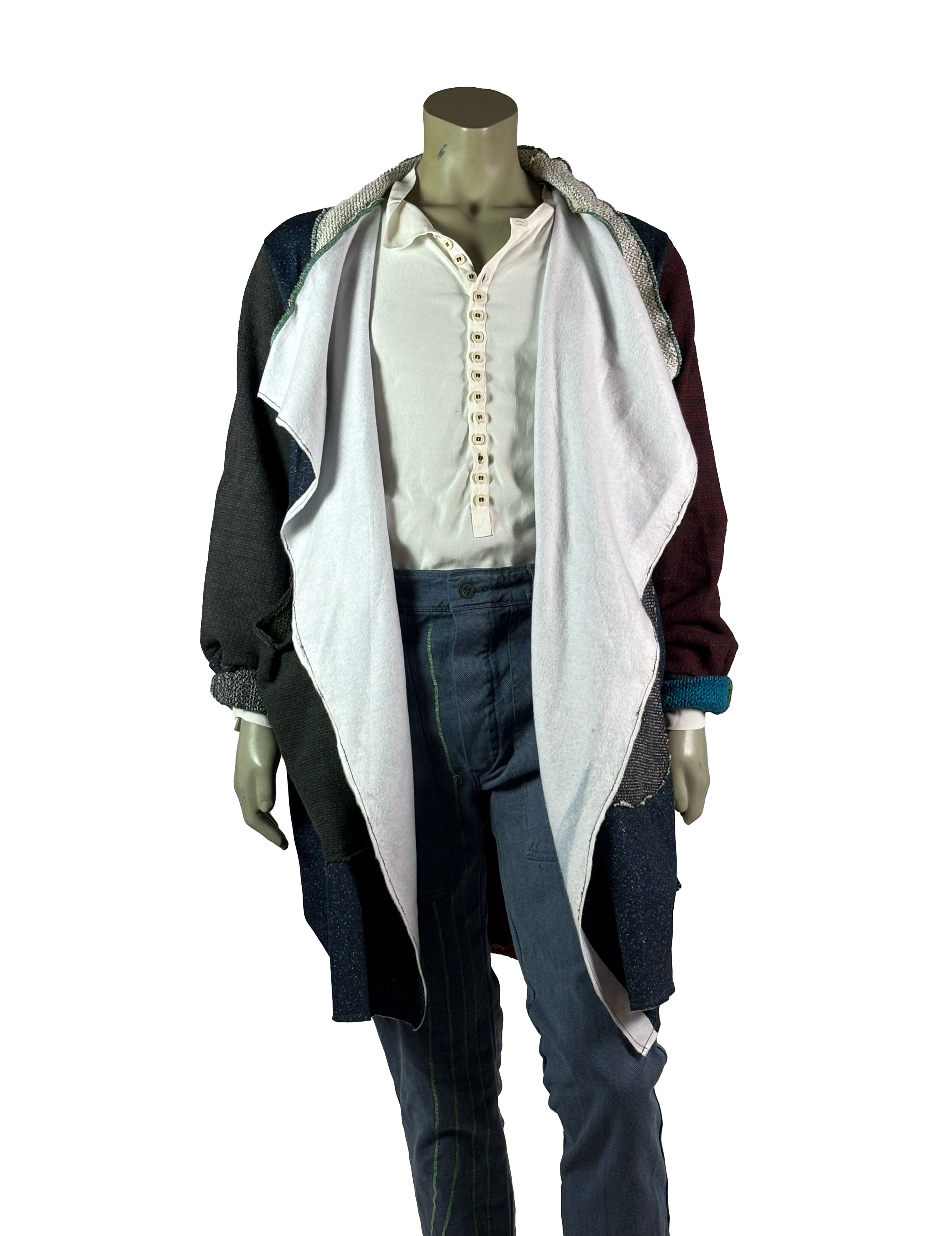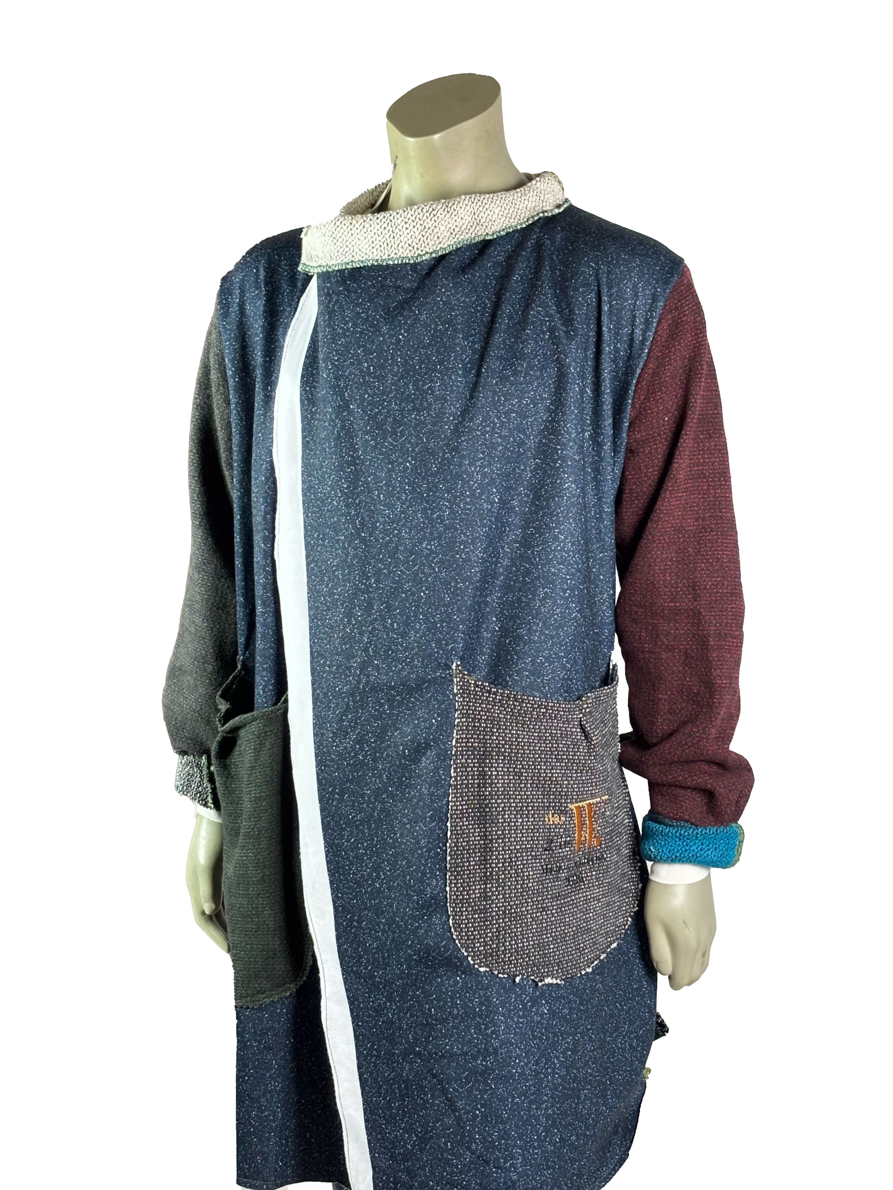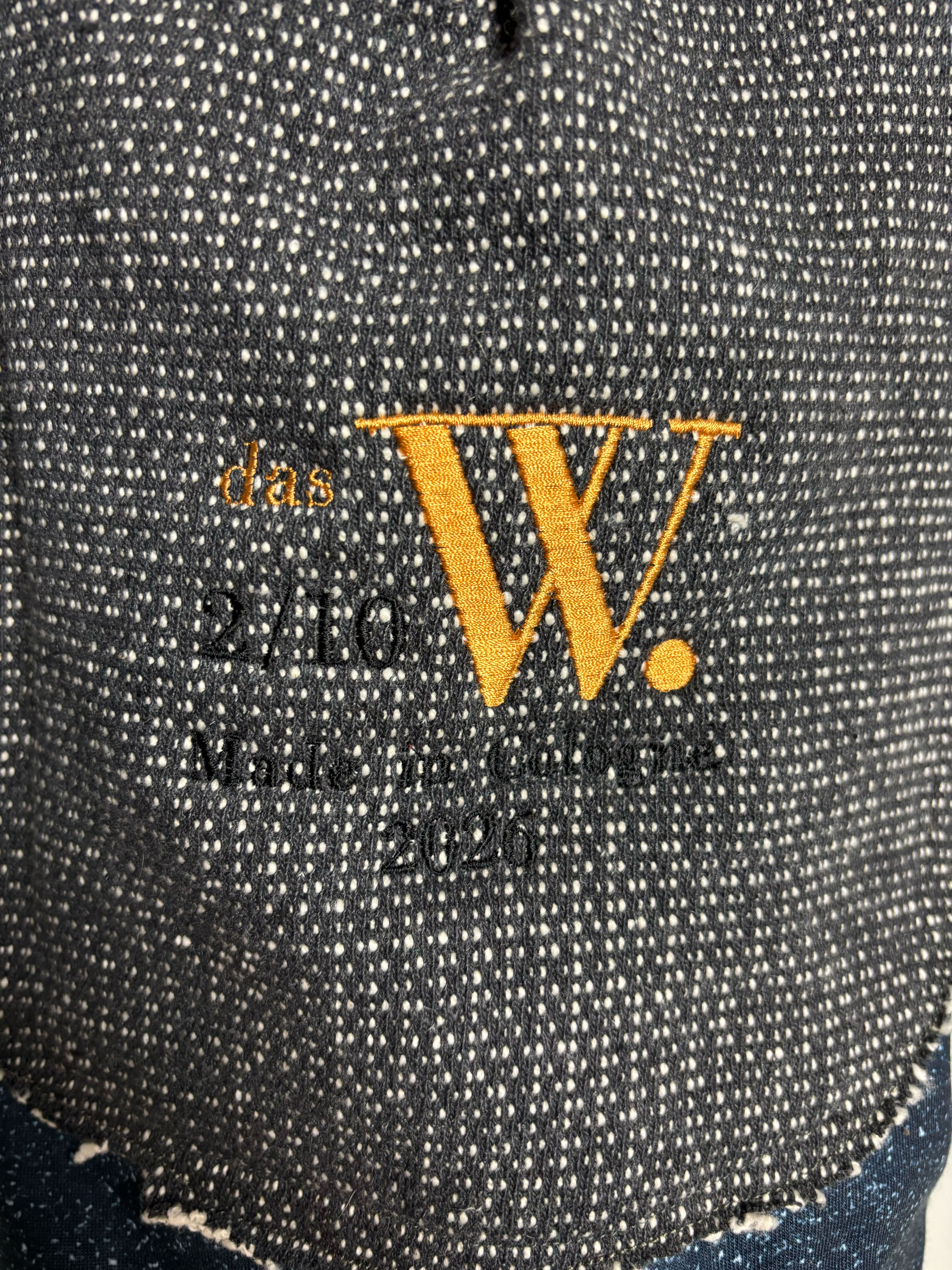 This handcrafted unisex cape from Cologne, Germany is part of a limited 1-of-10 series. Each piece is created through a carefully assembled mix of different fabrics, brought together in a handcrafted process that emphasizes material contrast and construction. Variations in texture, weight and surface are intentionally preserved, resulting in a one-of-a-kind garment with a sculptural, oversized silhouette and a cohesive visual language across the collection.